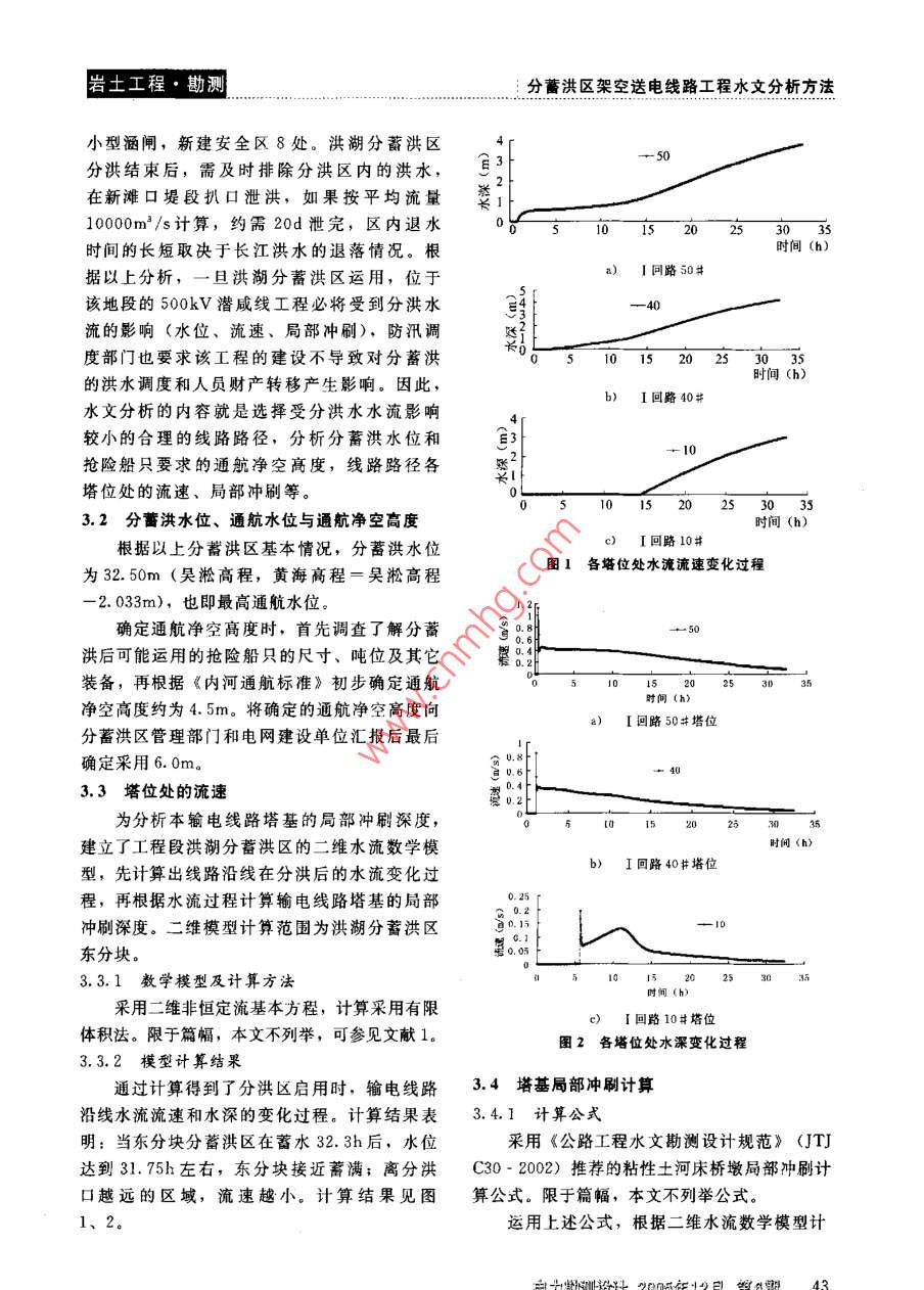 巖土工程·勘測分蓄洪區(qū)架空送電線路工程水文分析方法分蓄洪區(qū)架空送電線路工程水女分析方法劉德平(中南電力設(shè)計(jì)院,湖北武漢430071)摘要:當(dāng)架空送電線路T程位于分蓄洪區(qū)時(shí),一方面需要分析分蓄洪運(yùn)用對架空送電線路工程安全的影響,另一方面需要分析由于建設(shè)架空送電線路工程可能對分蓄洪區(qū)的調(diào)度運(yùn)用所產(chǎn)生的影響。本文以潛江一咸寧Ⅰ、Ⅱ回500kV送電線路丁程跨越洪湖東分塊分蓄洪區(qū)為例,對有關(guān)水文分析的內(nèi)容與方法進(jìn)行了介紹。關(guān)鍵詞:架空送電線路;分蓄洪區(qū);水文分析中圖分類號:TV12文獻(xiàn)標(biāo)識碼:B文章編號:1671-9913(2005)06-004104The Hydrological Analysis Method ofthe aerial Transmission Line in the Store Floodwater AreasLIU De ping(Central southern Electric Power Design Institute, Wuhan 430071, China)Abstract: When the transmit electric wire lie in the store floodwater areas, it is need to analyse the safefluence of the electric wire projects for using the store floodwater to divide floodwater, on the another handit is need to analyses the influence to use the flood storage areas becausc of the fact that build the electric wireproject. This text go back the 500kV Qianjiang- Xianning I, II transmit electric wire project to cross overthe east divide pieces of the Honghu flood storage areas as the example, the content and method analysed a-bout relevant hydrology have made an introduction.Key words the transmit electric wire: the store floodwater areas: the hydrological analysis method1問題的提出淹沒和調(diào)蓄的場所。由于人口的增長、蓄洪墾殖,逐漸開發(fā)利用成為蓄滯洪區(qū)。蓄滯洪區(qū)在歷《中華人民共和國防洪法》第三十三條規(guī)定次防洪調(diào)度中對保障廣大地區(qū)的安全和國民經(jīng)濟(jì)“在洪泛區(qū)、蓄滯洪區(qū)內(nèi)建設(shè)非防洪建設(shè)項(xiàng)目,建設(shè)發(fā)揮了十分重要的作用。為了合理和有效地應(yīng)當(dāng)就洪水對建設(shè)項(xiàng)目可能產(chǎn)生的影響和建設(shè)運(yùn)用蓄滯洪區(qū),使區(qū)內(nèi)居民的生活和經(jīng)濟(jì)活動(dòng)適項(xiàng)目對防洪可能產(chǎn)生的影響作出評價(jià)”。應(yīng)防洪要求,并得到安全保障,各級人民政府應(yīng)蓄滯洪區(qū)主要是指河堤外洪水臨時(shí)貯存的低對薔滯洪區(qū)的安全與建設(shè)進(jìn)行必要的指導(dǎo)與幫洼地區(qū)及湖泊等。其中多數(shù)歷史上就是江河洪水助,并制定分蓄洪區(qū)調(diào)度運(yùn)用的有關(guān)程序。《蓄著收稿日期:2005-09-16作者簡介:劉德平(1966-),男,湖北仙桃人,髙級工程師,主要從事工程水文氣象研究,曾發(fā)表論文10余篇,專著1本電力測設(shè)計(jì)2005年12月猬期41分蓄洪區(qū)架空送電線路工程水文分析方法巖土工程·勘滯洪區(qū)安全與建設(shè)指導(dǎo)綱要》(國發(fā)[1988]74分蓄洪區(qū)。號批轉(zhuǎn))對此問題做出了明確規(guī)定通航凈空高度影響線路桿塔高度。分蓄洪在大江大河的中下游地區(qū),由于河流的安區(qū)運(yùn)行時(shí),要考慮搶險(xiǎn)船只在高壓線路下安全全泄量有限,因此在河流兩岸規(guī)劃了相應(yīng)的分通過。搶險(xiǎn)船只的大小(噸位),以及搶險(xiǎn)船只蓄洪區(qū),如長江、漢江、淮河兩岸的分蓄洪區(qū)。上配備的搶險(xiǎn)工具(如竹竿)等的長短是確定隨著國民經(jīng)濟(jì)的發(fā)展,國家電網(wǎng)建設(shè)的步伐加通航凈空高度的依據(jù),通航凈空高度可根據(jù)這快,越來越多的電力線路必需經(jīng)過分蓄洪區(qū),些因素按照《內(nèi)河通航標(biāo)準(zhǔn)》中的有關(guān)規(guī)定選為保障防汛調(diào)度的正常進(jìn)行和分蓄洪區(qū)內(nèi)電網(wǎng)定,同時(shí)通航凈空高度的確定也應(yīng)征求水利防的安全可靠運(yùn)行,就需要水文專業(yè)人員在勘測汛主管部門的意見。一般情況下,分蓄洪區(qū)通設(shè)計(jì)階段論證二者的關(guān)系,科學(xué)合理地提出線航凈空高度不應(yīng)超過6m。路路徑和相應(yīng)的水文設(shè)計(jì)成果。23塔位處的流速、局部沖刷計(jì)算本文結(jié)合潛江一咸寧Ⅰ、Ⅱ回500kV送電分薔洪對線路塔位安全的影響主要是由于線路工程跨越洪湖分蓄洪區(qū)東分塊所做的水文分洪水流造成塔位周圍的局部沖刷。由于分蓄分析工作對分蓄洪區(qū)架空送電線路工程水文分洪區(qū)面積一般較大,水流從分蓄洪口門飛流而析的內(nèi)容與方法進(jìn)行介紹。下后很快散射開,因此計(jì)算塔位處的流速采用2分薔洪區(qū)架空送電線路工程水文分析維水流分析計(jì)算已不合適,目前應(yīng)用較多的的內(nèi)容與方法是采用二維非恒定流方程求解塔位處的流速。求得塔位處的流速后,可根據(jù)局部沖刷公2.1選擇受分洪水流影響較小的合理路徑式計(jì)算塔位處的沖刷深度,結(jié)構(gòu)設(shè)計(jì)專業(yè)根據(jù)當(dāng)架空送電線路工程位于分蓄洪區(qū)時(shí),要盡沖刷深度進(jìn)行結(jié)構(gòu)設(shè)計(jì),并確定是否需要對塔量減少因分蓄洪運(yùn)用對架空送電線路工程安全造基進(jìn)行專門的防沖刷設(shè)計(jì)。成的影響,為此線路路徑(塔位)應(yīng)盡量遠(yuǎn)離分洪口門,且最好位于分洪口門的上游,以避免塔3算例位直接受到分洪水流的沖刷。但在有些情況下,3.1洪湖分蓄洪區(qū)基本情
