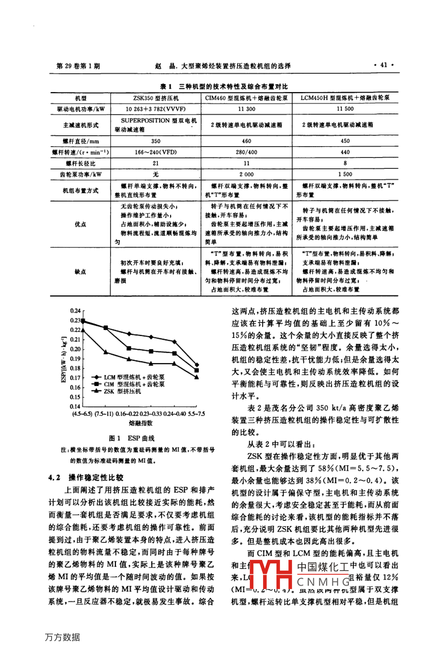 動(dòng)設(shè)備石油化工設(shè)備技術(shù),2008,29(1)●39.Petro Chemical Equipment Technology大型聚烯烴裝置擠壓造粒機(jī)組的選擇趙晶(中國石化工程建設(shè)公司,北京100101)攮要:結(jié)合茂名分公司 350 kt/a高密度聚乙烯裝置擠壓造粒機(jī)組的選擇工作,通過對擠壓造粒機(jī)組技術(shù)方案、主機(jī)結(jié)構(gòu)、綜合能耗、操作穩(wěn)定性、物料停留時(shí)間等關(guān)鍵問題的討論,將國際上幾個(gè)主要的擠壓造粒機(jī)組進(jìn)行了對比,并得出了結(jié)論. .近年我國引進(jìn)的擠壓造粒機(jī)組的生產(chǎn)能力日益向大型化、超大型化發(fā)展,系統(tǒng)地總結(jié)了巳經(jīng)完成的項(xiàng)目中擠壓造粒機(jī)組選擇時(shí)的經(jīng)驗(yàn),有利于從科學(xué)定量分析的角度出發(fā),更加理性地引進(jìn)設(shè)備。關(guān)鍵詞:擠壓造粒機(jī)組;綜合能耗;操作穩(wěn)定性中團(tuán)分類號:TE969文獻(xiàn)標(biāo)識碼:B 文章縞 號:1006-8805(2008)01-0039-04擠壓造粒機(jī)組是聚烯烴樹脂原料生產(chǎn)中的重較少,現(xiàn)場噪音較小,車間衛(wèi)生條件好。要機(jī)械設(shè)備,投資大、安裝復(fù)雜、設(shè)計(jì)及供貨周期(4)主要受力部件、易損件的壽命長,備件比長,而且對聚烯烴裝置的最終產(chǎn)品一樹 脂顆粒較容易采購。的質(zhì)量有著直接而重要的影響。隨著聚烯烴樹脂(5)控制水平較高,聯(lián)鎖報(bào)警系統(tǒng)合理有效,原料生產(chǎn)規(guī)模的擴(kuò)大對擠壓造粒機(jī)組的技術(shù)要求惡性事故發(fā)生的可能性小。也越來越高。本文以茂名分公司350 kt/a 高密(6)齒輪箱、熔融齒輪泵、水下切粒機(jī)等常見度聚乙烯裝置為例,總結(jié)了現(xiàn)有聚烯烴樹脂原料檢修部件位置合理,拆裝方便.生產(chǎn)裝置中,擠壓造粒機(jī)組在選擇及引進(jìn)中的經(jīng)(7)對樹脂新品開發(fā)、專用料試產(chǎn)切換的適驗(yàn),以期在今后的工作中有所借鑒。應(yīng)能力較強(qiáng)、過渡時(shí)間較短過渡料少,對樹脂熔1擠壓造粒機(jī)組融指數(shù)(MI)的適應(yīng)范圍廣。在聚烯烴生產(chǎn)裝置中使用擠壓造粒機(jī)組的目(8)操作穩(wěn)定度較高,不會(huì)因?yàn)榧恿狭髁康牡?是要將聚合反應(yīng)器聚合出來的聚烯烴粉末狀變化而出現(xiàn)故障。的聚合物,變成幾何形狀相對規(guī)則的顆粒,以便運(yùn)(9)螺桿輸送能力和熔融齒輪泵增壓能力較輸和進(jìn)-一步加工。同時(shí)要使工藝要求的各種功能強(qiáng),樹脂濾網(wǎng)通過能力較大。添加劑,如抗氧化劑、防紫外線劑和薄膜開口劑等各聚烯烴生產(chǎn)廠根據(jù)國內(nèi)市場對樹脂粒料的均勻分散。還要負(fù)責(zé)將聚合物中的低分子揮發(fā)物要求,會(huì)開發(fā)出一些特殊牌號的聚烯烴樹脂,如電脫除。經(jīng)過螺桿或齒輪泵加壓后由水下切粒機(jī)加線、電纜料、家庭用品料等,這些牌號的產(chǎn)品對純凈度要求比較高,希望有盡可能少的雜質(zhì)(如鐵屑工為最后的樹脂顆粒成品。大型裝置中所使用的擠壓造粒機(jī)組的生產(chǎn)能等)進(jìn)入產(chǎn)品,這樣就要求擠壓造粒機(jī)組的樹脂濾力一般為37.5~44 t/h,最大在50~60 t/h。目網(wǎng)的目數(shù)要加大,能過濾掉更多熔融樹脂中的雜前世界上某些操作比較穩(wěn)定的工廠,可以達(dá)到質(zhì)。在過濾網(wǎng)的目數(shù)加大后,為達(dá)到同等的生產(chǎn)能力,就要求擠壓造粒機(jī)組的螺桿輸送能力和70 t/h. .(或)熔融齒輪泵增壓能力都要增強(qiáng)。而過濾網(wǎng)則2裝置對機(jī)組的要求一般來說,擠壓造粒機(jī)組應(yīng)當(dāng)滿足下列要求:中國煤化工(1)可調(diào)節(jié)手段多且有效,易操作。:HYHCNMHG.1997年畢業(yè)于(2)各部位漏粉、漏膠少,物耗較低。北京工業(yè)大學(xué)機(jī)械設(shè)計(jì)及制造專業(yè)?,F(xiàn)在中國石化工程建(3)水、油、汽等公用工程的“跑、冒、滴、漏”設(shè)公司動(dòng)設(shè)備室,機(jī)械工程師?!?0●石油化工設(shè)備技術(shù)2008年不能因過濾能力增強(qiáng)后通過能力變差,相應(yīng)的解另外還有一種用于高壓聚乙烯(LDPE)生產(chǎn)決方法就是增大過濾網(wǎng)面積等。的單螺桿型擠出機(jī),由于高壓聚乙烯(LDPE)進(jìn)(10)樹脂混煉度調(diào)節(jié)方便,裝置運(yùn)行可靠。.人擠壓機(jī)時(shí)是熔融狀態(tài),擠壓機(jī)主要起添加劑的過去我國各小型裝置中原有的擠壓造粒機(jī)組分散、揮發(fā)物的脫除以及向模板增壓輸送聚合物的混煉度調(diào)節(jié)方式均為固定插板式,即通過更換的功能。機(jī)簡上插板的方式以調(diào)節(jié)插板與螺桿之間的間參與茂名分公司350 kt/a高密度聚乙烯裝隙,由此達(dá)到調(diào)節(jié)混煉度的作用。每次調(diào)節(jié)混煉置擠壓造粒機(jī)組競標(biāo)的有德國CWP公司度時(shí)機(jī)組需要停車更換插板,這種調(diào)節(jié)混煉度的(ZSK350型擠壓機(jī))、日本制鋼所(CIM460型混方法不僅落后、浪費(fèi)大、成本高、混煉度調(diào)節(jié)不連煉機(jī)+熔融齒輪泵)和日本神戶制鋼(LCM450H續(xù),而且不利于生產(chǎn)廠根據(jù)生產(chǎn)情況實(shí)時(shí)調(diào)節(jié)混型混煉機(jī)+熔融齒輪泵)三家。表1中列出了這煉度以保證產(chǎn)品質(zhì)量。對于新牌號產(chǎn)品開發(fā)、試三種機(jī)型的技術(shù)特性及綜合