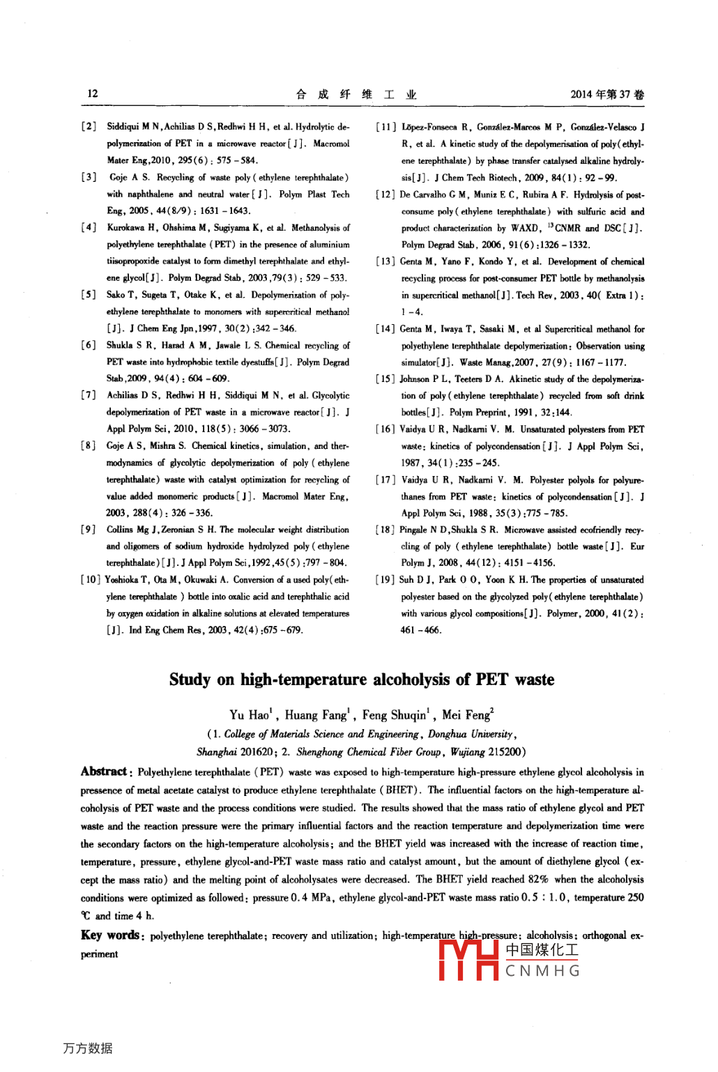 研究與開發(fā)合成纖維工業(yè),2014,37(1):9CHINA SYNTHETIC. FIBER INDUSTRY廢聚對苯二甲酸乙二醇酯的高溫醇解研究俞昊,黃芳,馮淑芹!,梅鋒2(1東華大學材料學院,上海201620;2.江蘇盛虹化纖集團,江蘇吳江215200)摘要;通過高溫高壓醇解法對廢聚對苯二甲酸乙二醇酯(PET)在催化劑金屬醋酸鹽作用下,進行乙二醇醇解得到對苯二甲酸乙二醇酯(BHET),研究了廢PET高溫醇解的影響因素及工藝條件。結(jié)果表明:在高溫醇解反應(yīng)中,乙二醇與廢PET的質(zhì)量比和反應(yīng)壓力為主要影響因素,反應(yīng)溫度和解聚時間為次要影響因素;BHET收率隨反應(yīng)時間的延長溫度與壓力的升高、乙二醇與廢PET的質(zhì)量比加大、催化劑的用量增大而增加,而二甘醇含量(除質(zhì)量比因素)及醇解產(chǎn)物的熔點則隨其相應(yīng)降低;最佳醇解反應(yīng)條件為壓力04MPa、乙二醇與廢PET質(zhì)量比0.5:10、反應(yīng)溫度250℃、反應(yīng)時間4h,BHET收率達82%關(guān)鍵詞:聚對苯二甲酸乙二醇酯回收采用高溫高壓醇解反應(yīng)正交實驗中圖分類號:TQ323.4·1文獻標識碼:A文章編號:1001-0041(2014)01-000-04聚酯(PET)廣泛用于塑料制品,同時其廢棄虹集團中鱸科技發(fā)展股份有限公司產(chǎn);乙二醇、苯物帶來了環(huán)境污染,PET的回收日益受到各界重酚、四氯乙烷、四甘醇二甲醚、活性炭:分析純,國視。但是,再生料由于其純度以及結(jié)構(gòu)性能的改藥集團化學試劑有限公司產(chǎn);醋酸鋅:分析純,上變,目前主要是短纖維的開發(fā),導致其應(yīng)用受到限海達瑞精細化工有限公司產(chǎn);乙二醇銻:分析純制每年回收的PET僅占產(chǎn)量的37%。目前江蘇鴻聲化工廠產(chǎn);甲醇:分析純,上海化學試劑PET瓶片的回收工業(yè)化生產(chǎn)方法主要有水公司產(chǎn)。解口2-3]、甲醇醇解3和乙二醇醇解6。其中1.2儀器與設(shè)備PET水解法的主要缺點是高溫、高壓及解聚時間氣相色譜儀: Agilent7890A,安捷倫科技公司較長、對苯二甲酸(TPA)的提純成本高;甲制高溫高壓醇解設(shè)備:PET聚合釜,江蘇盛虹集醇醇解法的產(chǎn)物存在反應(yīng)溫度高壓力大、PET分團中鱸科技發(fā)展股份有限公司制,有效容積為70解不完全成本高等缺點;乙二醇醇解法主L壓力0-0.5MPa,攪拌速率0-100m/mn,溫度要是用乙二醇的降解,二甘醇的醇解6,丙二0-450℃;常壓醇解設(shè)備:自制玻璃釜反應(yīng)裝置。醇的醇解),乙二醇超聲波降解,其降解時間1.3廢PET的乙二醇醇解方法降低,獲得(BHET)產(chǎn)品純度較高,成本相對較低,因此,廣泛用于工業(yè)生產(chǎn)11。廢PET解聚反應(yīng)在高壓反應(yīng)釜中進行。首先干燥廢PET除去水分及其他揮發(fā)性物質(zhì);而后為了引入工業(yè)化的PET降解工藝,擴大其應(yīng)在反應(yīng)釜中加人一定量的乙二醇、廢PET及催化用有必要對各個醇解反應(yīng)條件的影響進行探討,劑;密封后開始加熱控制升溫速率5-10℃以便深人了解和控制醇解程度。PET醇解反應(yīng)所用的催化劑一般有鈦酸酯類、醋酸鹽類和稀土氧min,記錄加熱過程中溫度與壓力的變化情況,當化物等。目前關(guān)于PET醇解反應(yīng)中催化劑的作加熱到設(shè)定溫度時開始記錄時間,在維持恒溫的用機理尚未達成統(tǒng)一的認識。作者研究了金屬醋情況下,使解聚反應(yīng)進行1,2,3,4,5,6h。可中間酸鹽催化劑對醇解產(chǎn)物BHET的收率及產(chǎn)物性質(zhì)取樣反應(yīng)結(jié)束后對解聚產(chǎn)物進行分析。反應(yīng)溫的影響以及壓力、溫度、時間物料配比對乙二醇度為0-270℃,反應(yīng)壓力為0-0.5MPa解聚產(chǎn)物性質(zhì)、BHET收率的影響優(yōu)化PET降解1.4分析與測試工藝。BHE收率(y):在反應(yīng)結(jié)束后,將反應(yīng)產(chǎn)物調(diào)節(jié)溫度至130~140℃,將醇解產(chǎn)物快速熱過1實驗收稿日期中國煤化工1312271.1原料作者簡介CNMH事材料改性及廢PET:特性黏數(shù)([η])0.65dL/g,江蘇盛成型功能高分子等領(lǐng)域的研究。E-mail:yuhno@dhu.edu.cn。10合成纖維工業(yè)2014年第37卷濾得到有色不溶物試樣A。然后對濾液進行減受能力能源消耗、連續(xù)工業(yè)化生產(chǎn)的可能性及經(jīng)壓蒸餾回收乙二醇。將減壓蒸餾后的液體(常溫濟性等原因,有必要對各個因子對PET乙二醇解下為固體)溶入溶劑中,加熱后熱過濾,得到不溶的影響再進行探討物B。再向濾液中加入一定量的活性炭脫色,熱表2廢PET的乙二醇解正交實驗結(jié)果過濾得無色透明濾液,自然冷卻結(jié)晶,過濾,得晶Tab 2 Orthogonal experimental results of體C,在60℃下干燥ethylene glycol alcoholysis of PET waste序號壓力/MPa溫度℃時間/hmEc:mpry,%y/m;×100%式中:m。為晶體C質(zhì)量;m為BHET理論值。0.3:10.8:1[η]:采用烏氏黏度計法(GBT14190.3:12008)進行測試。77二甘醇(DEG)含量:用氣相色譜法測定PET0.21.3:1乙二醇醇解產(chǎn)物的二甘醇含量。端羧基:采用0.1mo/L的KOH乙醇標準溶80.20.8:164液,10g/L的酚酞指示液PEr醇解物溶于二甲苯0.3230l.8:1077與乙醇的混合溶液(體積比為2:1),用堿式滴定10.325010.8:12管進行端羧基測定。0.3:1130.80.3:1672結(jié)果與討論0.8:12.1催化劑對廢PET醇解反應(yīng)的影響從表1可知,在反應(yīng)3h內(nèi),醇解物可形成透M50.7561.7560.2549.75M64.0065.2564.2564.5明均勻溶液催化劑含量增加,BHET的y增加,M173.2568.0069.251.00當用量達1000μeg/g時,BHET的y可達86%M476.7569.7571.0079.50表1催化劑用量對醇解產(chǎn)物性質(zhì)