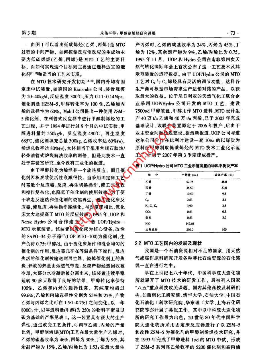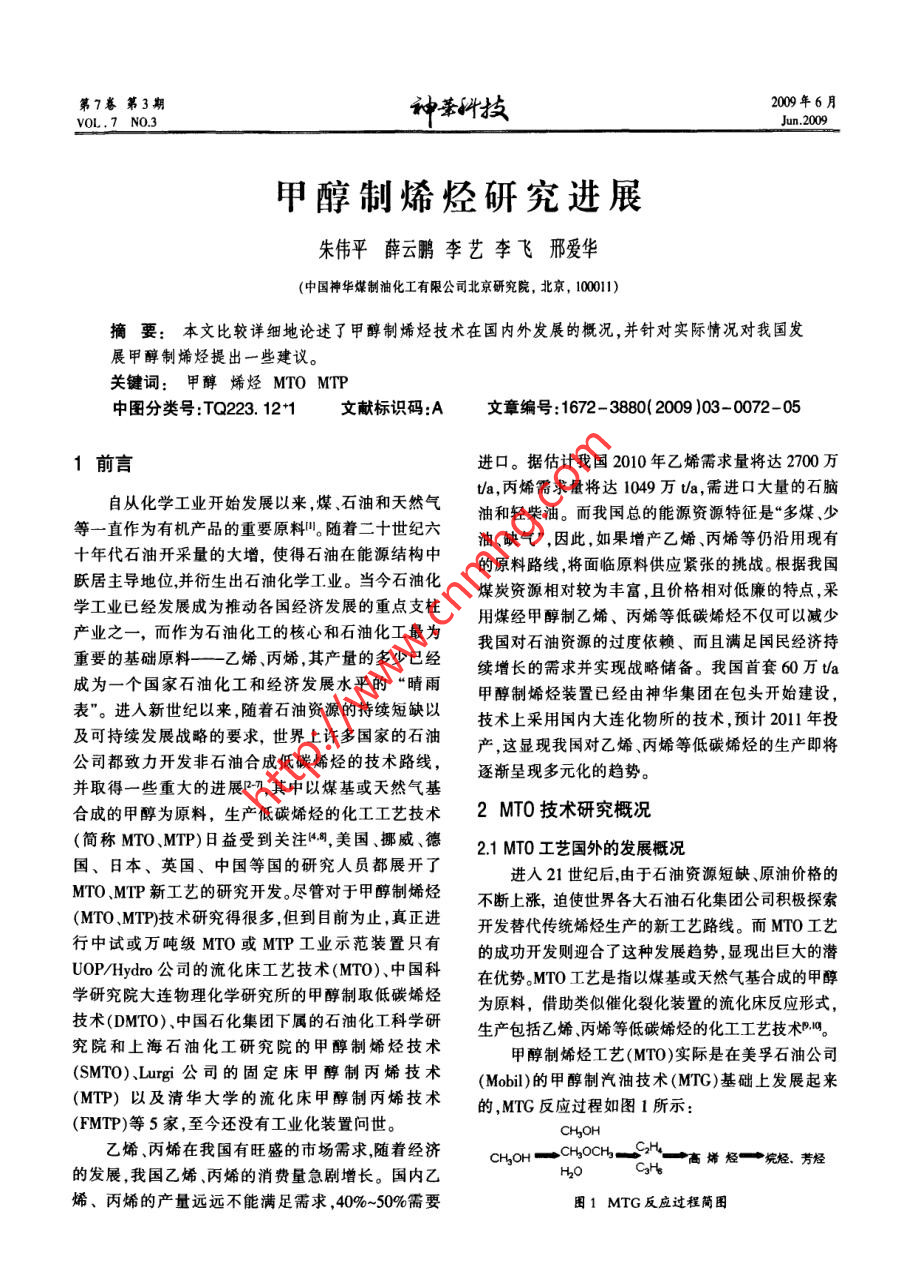 2009年6月第7卷第3期神苯科技Jun.2009VOL.7 NO.3甲醇制烯烴研究進(jìn)展朱偉平薛云鵬李藝?yán)铒w邢愛(ài)華(中國(guó)神華媒制油化工有限公司北京研究院,北京,10010摘要, 本文比較詳細(xì)地論述了甲 醇制烯烴技術(shù)在國(guó)內(nèi)外發(fā)展的概況,并針對(duì)實(shí)際情況對(duì)我國(guó)發(fā)展甲醇制烯烴提出一些建議。關(guān)鍵詞:甲醇烯烴MTO MITP中圖分類號(hào):TQ223.121文獻(xiàn)標(biāo)識(shí)碼:A文章編號(hào):1672-3880( 2009 )03-0072-05進(jìn)口。據(jù)估計(jì)我國(guó)2010年乙烯需求量將達(dá)2700萬(wàn)1前言ta,丙烯需求量將達(dá)1049 萬(wàn)Ua,需進(jìn)口大量的石腦自從化學(xué)工業(yè)開(kāi)始發(fā)展以來(lái),煤、石油和天然氣油和輕柴油。而我國(guó)總的能源資源特征是“多煤、少等一直作為有機(jī)產(chǎn)品的重要原料"。隨著二十世紀(jì)六油、缺氣",因此,如果增產(chǎn)乙烯、丙烯等仍沿用現(xiàn)有十年代石油開(kāi)采量的大增,使得石油在能源結(jié)構(gòu)中的原料路線,將面臨原料供應(yīng)緊張的挑戰(zhàn)。根據(jù)我國(guó)躍居主導(dǎo)地位,并衍生出石油化學(xué)工業(yè)。當(dāng)今石油化煤炭資源相對(duì)較為豐富,且價(jià)格相對(duì)低廉的特點(diǎn),采學(xué)工業(yè)已經(jīng)發(fā)展成為推動(dòng)各國(guó)經(jīng)濟(jì)發(fā)展的重點(diǎn)支柱用煤經(jīng)甲醇制乙烯、丙烯等低碳烯烴不僅可以減少產(chǎn)業(yè)之一,而作為石油化工的核心和石油化工最為我國(guó)對(duì)石油資源的過(guò)度依賴、而且滿足國(guó)民經(jīng)濟(jì)持重要的基礎(chǔ)原料一-乙烯 、丙烯,其產(chǎn)量的多少已經(jīng)續(xù)增長(zhǎng)的需求并實(shí)現(xiàn)戰(zhàn)略儲(chǔ)備。我國(guó)首套60萬(wàn)ta成為一個(gè)國(guó)家石油化工和經(jīng)濟(jì)發(fā)展水平的“晴雨甲醇制烯烴裝置已經(jīng)由神華集團(tuán)在包頭開(kāi)始建設(shè),表"。進(jìn)入新世紀(jì)以來(lái),隨著石油資源的持續(xù)短缺以技術(shù)上采用國(guó)內(nèi)大連化物所的技術(shù),預(yù)計(jì)2011年投及可持續(xù)發(fā)展戰(zhàn)略的要求,世界上許多國(guó)家的石油產(chǎn),這顯現(xiàn)我國(guó)對(duì)乙烯、丙烯等低碳烯烴的生產(chǎn)即將公司都致力開(kāi)發(fā)非石油合成低碳烯烴的技術(shù)路線,逐漸呈現(xiàn)多元化的趨勢(shì)。并取得一些重大的進(jìn)展叨,其中以煤基或天然氣基2 MTO 技術(shù)研究概況,合成的甲醇為原料,生產(chǎn)低碳烯烴的化工工藝技術(shù)(簡(jiǎn)稱MTO、MTP)日益受到關(guān)注網(wǎng),美國(guó)、挪威、德2.1 MTO工藝國(guó)外的發(fā)展概況國(guó)、日本、英國(guó)、中國(guó)等國(guó)的研究人員都展開(kāi)了進(jìn)入21世紀(jì)后,由于石油資源短缺、原油價(jià)格的MTO .MTP 新工藝的研究開(kāi)發(fā)。盡管對(duì)于甲醇制烯烴不斷上漲,迫使世界各大石油石化集團(tuán)公司積極探索(MTO .MTP)技術(shù)研究得很多,但到目前為止,真正進(jìn)開(kāi)發(fā)替代傳統(tǒng)烯烴生產(chǎn)的新工藝路線。而MTO工藝行中試或萬(wàn)噸級(jí)MTO或MTP工業(yè)示范裝置只有的成功開(kāi)發(fā)則迎合了這種發(fā)展趨勢(shì),顯現(xiàn)出巨大的潛UOP/Hydro公司的流化床工藝技術(shù)(MTO)、中國(guó)科在優(yōu)勢(shì)。MTO工藝是指以煤基或天然氣基合成的甲醇學(xué)研究院大連物理化學(xué)研兗所的甲醇制取低碳烯烴為原料,借助類似催化裂化裝置的流化床反應(yīng)形式,技術(shù)(DMTO).中國(guó)石化集團(tuán)下屬的石油化工科學(xué)研生產(chǎn)包括乙烯.丙烯等低碳烯烴的化工工藝技術(shù)的。究院和上海石油化工研究院的甲醇制烯烴技術(shù)甲醇制烯烴工藝(MT0)實(shí)際是在美孚石油公司(SMTO)、Lurgi公司的固定床甲醇制丙烯技術(shù).(Mobil)的甲醇制汽油技術(shù)(MTG)基礎(chǔ)上發(fā)展起來(lái)(MTP)以及清華大學(xué)的流化床甲醇制丙烯技術(shù)的,MTG反應(yīng)過(guò)程如圖1所示:(FMTP)等5家,至今還沒(méi)有工業(yè)化裝置問(wèn)世。CHyOH乙烯、丙烯在我國(guó)有旺盛的市場(chǎng)需求,隨著經(jīng)濟(jì)CH,OH一.CHyOCH-一高烯 烴一烷經(jīng).芳烴H2OCgH的發(fā)展,我國(guó)乙烯、丙烯的消費(fèi)量急劇增長(zhǎng)。國(guó)內(nèi)乙烯、丙烯的產(chǎn)量遠(yuǎn)遠(yuǎn)不能滿足需求,.40%~-50%需要團(tuán)1 MTG反應(yīng)過(guò)程簡(jiǎn)圖第3期朱偉平等:甲醇制烯烴研究進(jìn)展73.由圖1可以看出低碳烯烴(乙烯、丙烯)是MTG.產(chǎn)丙烯時(shí),乙烯的碳基收率為34%、丙烯為45%、丁過(guò)程的中間產(chǎn)物,如何控制反應(yīng)使反應(yīng)的生成物主烯為12%、其余副產(chǎn)物為9%,乙烯/丙烯比為0.75。要為低碳烯烴(乙烯、丙烯)是MTO工藝的主要目1995年11月,UOP和Hydro公司在南非第四次天標(biāo),而如何實(shí)現(xiàn)這個(gè)目標(biāo)則主要通過(guò)選擇適宜的催然氣轉(zhuǎn)化國(guó)際年會(huì)上首次公布了這一工藝技術(shù)及其化劑1.2和適當(dāng)?shù)墓に噥?lái)實(shí)現(xiàn)。示范裝置的運(yùn)行數(shù)據(jù)。由于UOP/Hydro公司的MTO在MTO技術(shù)研究開(kāi)發(fā)初期13-16,國(guó)內(nèi)外均有固工藝對(duì)C2與Cz烯烴具有靈活的調(diào)節(jié)功能,這樣各定床中試裝置,如德國(guó)的Karisruhe公司,裝置規(guī)模生產(chǎn)商可根據(j