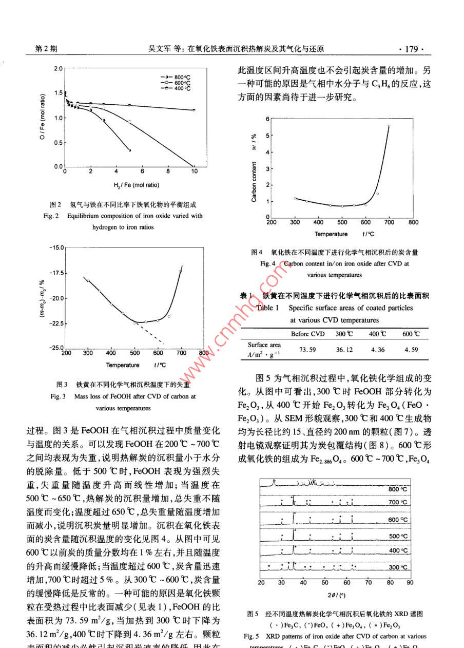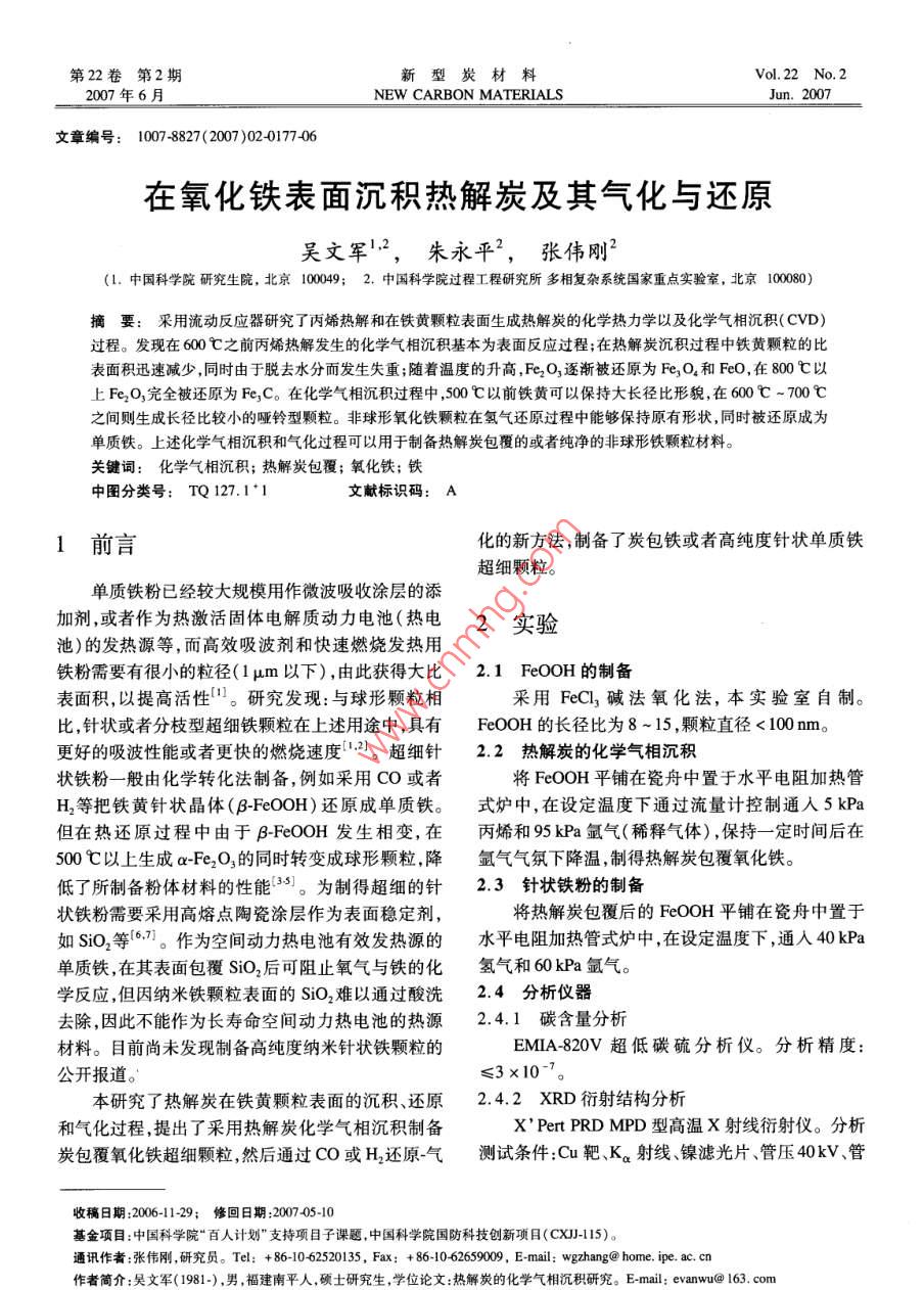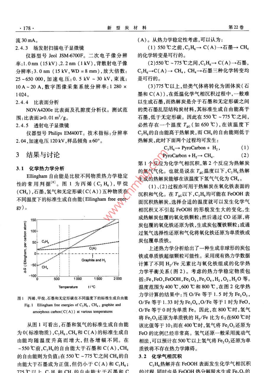 第22卷第2期新型炭材料Vol.22 No.22007年6月.NEW CARBON MATERIALSJun. 2007文章編號: 1007-8827(2007 )02-0177-06在氧化鐵表面沉積熱解炭及其氣化與還原吳文軍',朱永平”,張偉 剛2(1.中國科學(xué)院研究生院,北京10049;: 2. 中國科學(xué)院過程工程研究所多相復(fù)雜系統(tǒng)國家重點(diǎn)實(shí)驗(yàn)室,北京10080)摘要:采用流動(dòng)反應(yīng)器研究了丙烯熱解和在鐵黃顆粒表面生成熱解炭的化學(xué)熱力學(xué)以及化學(xué)氣相沉積( CVD)過程。發(fā)現(xiàn)在600C之前丙烯熱解發(fā)生的化學(xué)氣相沉積基本為表面反應(yīng)過程;在熱解炭沉積過程中鐵黃顆粒的比表面積迅速減少,同時(shí)由于脫去水分而發(fā)生失重;隨著溫度的升高,Fe2O,逐漸被還原為Fe,O,和FeO,在800C以上Fe2O,完全被還原為Fe,C。在化學(xué)氣相沉積過程中,500 C以前鐵黃可以保持大長徑比形貌,在600C ~700C之間則生成長徑比較小的啞鈴型顆粒。非球形氧化鐵顆粒在氫氣還原過程中能夠保持原有形狀,同時(shí)被還原成為單質(zhì)鐵。上述化學(xué)氣相沉積和氣化過程可以用于制備熱解炭包覆的或者純凈的非球形鐵顆粒材料。關(guān)鍵詞:化學(xué)氣相沉積; 熱解炭包覆;氧化鐵;鐵中圖分類號: TQ 127.1*1文獻(xiàn)標(biāo)識碼: A1前言化的新方法,制備了炭包鐵或者高純度針狀單質(zhì)鐵超細(xì)顆粒。單質(zhì)鐵粉已經(jīng)較大規(guī)模用作微波吸收涂層的添加劑,或者作為熱激活固體電解質(zhì)動(dòng)力電池(熱電2實(shí)驗(yàn)池)的發(fā)熱源等,而高效吸波劑和快速燃燒發(fā)熱用鐵粉需要有很小的粒徑(1 μm以下),由此獲得大比2.1 FeOOH 的制備表面積,以提高活性。研究發(fā)現(xiàn):與球形顆粒相采用FeCl, 堿法氧化法,本實(shí)驗(yàn)室自制。比,針狀或者分枝型超細(xì)鐵顆粒在上述用途中,具有FeOOH的長徑比為8 ~15 ,顆粒直徑< 100 nm。更好的吸波性能或者更快的燃燒速度[.2)。超細(xì)針2.2熱解炭的化學(xué)氣相沉積狀鐵粉- -般由化學(xué)轉(zhuǎn)化法制備,例如采用CO或者將FeOOH平鋪在瓷舟中置于水平電阻加熱管H2等把鐵黃針狀晶體(β-FeO0H)還原成單質(zhì)鐵。式爐中,在設(shè)定溫度下通過流量計(jì)控制通人5kPa但在熱還原過程中由于β-FeOOH發(fā)生相變,在丙烯和95 kPa氬氣(稀釋氣體) ,保持- -定時(shí)間后在500 C以上生成a-Fe2O,的同時(shí)轉(zhuǎn)變成球形顆粒,降氬氣氣氛下降溫,制得熱解炭包覆氧化鐵。低了所制備粉體材料的性能[38]。為制得超細(xì)的針2.3針狀鐵粉的制 備狀鐵粉需要采用高熔點(diǎn)陶瓷涂層作為表面穩(wěn)定劑,將熱解炭包覆后的FeOOH平鋪在瓷舟中置于如SiO2等(6.,)。作為空間動(dòng)力熱電池有效發(fā)熱源的水平電阻加熱管式爐中,在設(shè)定溫度下,通入40 kPa單質(zhì)鐵,在其表面包覆SiO2后可阻止氧氣與鐵的化氫氣和60kPa氬氣。.學(xué)反應(yīng),但因納米鐵顆粒表面的SiO2難以通過酸洗2.4分析儀器去除,因此不能作為長壽命空間動(dòng)力熱電池的熱源2.4.1碳含 量分析材料。目前尚未發(fā)現(xiàn)制備高純度納米針狀鐵顆粒的EMIA-820V超低碳硫分析儀。分析精度:公開報(bào)道。≤3x10~°。本研究了熱解炭在鐵黃顆粒表面的沉積、還原2.4.2 XRD 衍射結(jié)構(gòu)分析和氣化過程,提出了采用熱解炭化學(xué)氣相沉積制備X' Pert PRD MPD型高溫X射線衍射儀。分析炭包覆氧化鐵超細(xì)顆粒,然后通過CO或H,還原氣測試條件:Cu靶、Ka射線、鎳濾光片、管壓40kV、管收稿日期206-1129;修回日期200705-10基金項(xiàng)目:中國科學(xué)院“百人計(jì)劃"支持項(xiàng)目子課題,中國科學(xué)院國防科技創(chuàng)新項(xiàng)目(CXJ-115)。通訊作者:張偉剛,研究員。Tel: + 86-1062520135, Fax: + 86-10-62659009. E-mail: wgzhang@ home. ipe. ac. cn作者簡介:昊文軍(1981-),男,福建南平人,碩士研究生,學(xué)位論文:熱觶炭的化學(xué)氣相沉積研究。E-mail: evanwu@ 163. com●178●新型炭材料第22卷.流30 mA。(A)。從熱力學(xué)穩(wěn)定性考慮,可以認(rèn)為:2.4.3場發(fā)射掃描電子 顯微鏡(1) 550C之前,C,H6→C(A)- +石墨-→CH,儀器型號Jeol JSM_6700F。二次電子像分辨的化學(xué)轉(zhuǎn)變是可行的。率:1. 0nm (15kV) 2.2nm (1kV) ,背散射電子像(2)550C ~775C之間,C,H。- +C(A)-→石墨,分辨率:3. 0nm (15kV, WD =8 mm),放大倍數(shù):CH6-→C(A)-→CH,, CH, +石墨三種化學(xué)轉(zhuǎn)變均25~650000,加速電壓:0.5kV~30kV,束流:是可行的。10A~20 A,數(shù)字圖像采集系統(tǒng)分辨率:1280 x(3)775 C以上,烴類氣體將轉(zhuǎn)化為固體炭(石1024。墨和C(A)) ,在低溫化學(xué)氣相沉積過程中,- -般難2.4.4比表面分析以生成石墨,而熱解炭是介于石墨和無定形碳之間NOVA4200e比表面及孔隙度分析儀。測試范的類石墨亂層結(jié)構(gòu)炭材料,其標(biāo)準(zhǔn)生成自由能高于圍:比表面≥0.01 m2/g。石墨,低于無定形碳。因此在550C ~775 C之間,2.4.5透射電子顯 微鏡必然存在一個(gè)溫度Tsc( 如650 C),在該溫度下儀器型號Philips EM400T。技術(shù)指標(biāo):分辨率CH。的自由能高于熱解炭,而CH,的自由能則低于2. 04 ,加速電壓120kV ,樣品傾角土60°。熱解炭,此時(shí)下面兩個(gè)過程均可發(fā)生:C,H。- + PyroCarbon+ H2,(1)3結(jié)果與討論:PyroCarbon +H2- + CH。(2)第1個(gè)反應(yīng)為化學(xué)氣相沉積,第2個(gè)反應(yīng)為熱解炭3.1化學(xué)熱力學(xué)分析Ellingham自由能是比較不同物質(zhì)熱力學(xué)穩(wěn)定的氫