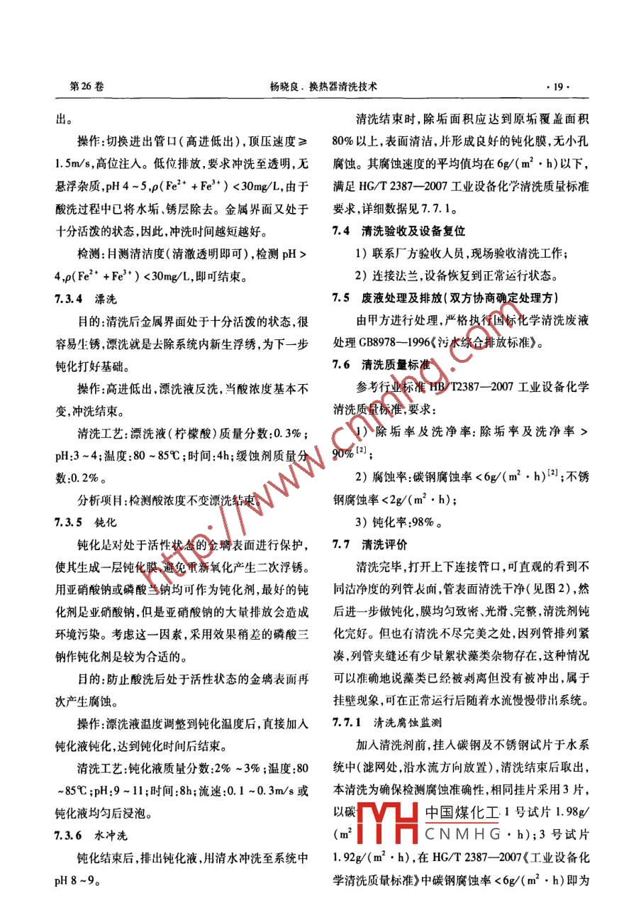 清洗世界第26卷第8期實(shí)用掖術(shù)Cleaning World2010年8月文章編號(hào):1671 - 8909(2010)08 -0014 -07換熱器清洗技術(shù).楊曉良(西安邦沽清潔有限責(zé)任公司,陜西西安710061)鹵要:結(jié)合換熱器清洗工程實(shí)例,詳細(xì)全面的介紹了換熱器清洗工藝流程,主要包括清洗藥劑的選擇及配方、清洗系統(tǒng)方案的建立、清洗的具體步驟、清洗檢測(cè)評(píng)定辦法、清洗效果評(píng)價(jià)。實(shí)踐證明此清洗流程清洗效果好、操作費(fèi)用低,對(duì)從事化學(xué)清洗行業(yè)人員來(lái)說(shuō),具有很好的參考價(jià)值。關(guān)鍵詞:換熱器清洗;氨基磺酸酸洗;水沖洗;漂洗;鈍化中圖分類號(hào):TQ051.5文獻(xiàn)標(biāo)識(shí)碼:BHeat exchanger cleaning technologyYANG Xiaoliang(Xi'an Bangjie Clean Co., Ltd, Xi' an ,Shaanxi 710061 , China)Abstract :Combination of heat exchanger cleaning project example, more detailed and comprehensive in-troduction to the heat exchanger cleaning process, including the choice of cleaning agents and formula-tions , cleaning the establishment of system solutions , cleaning of concrete steps, cleaning examination andevaluation methods, evaluation of cleaning efect. Practice shows that this cleaning process cleaningeffect, operating cost and low in chemical cleaning industy, 1 have a very good reference value.Key words :heat exchanger cleaning; amino acid pickling; water rinse ; rinse; passivation備的安全。因此,換熱器應(yīng)定期進(jìn)行清洗,除掉污1概述垢,以保證換熱器的高效換熱和生產(chǎn)的正常進(jìn)行。換熱器是- -種結(jié)構(gòu)緊湊、高效的換熱設(shè)備,被廣在結(jié)垢嚴(yán)重、成分復(fù)雜的情況下,一般普通的物理方泛應(yīng)用于冶金石油、制藥、船舶、紡織化工、醫(yī)藥、食法不易清洗,且拆洗過(guò)程費(fèi)時(shí)費(fèi)力,本文針對(duì)換熱器品等行業(yè),足實(shí)現(xiàn)加熱、冷卻、熱回收、快速滅菌等用著重研究了化學(xué)清洗的工藝,此工藝簡(jiǎn)單,費(fèi)用相對(duì)途的優(yōu)良設(shè)備。但是,由于換熱器長(zhǎng)期運(yùn)行,用來(lái)冷物理清洗可能較高,但省時(shí)省力,處理效果相對(duì)較卻或加熱側(cè)純凈程度的不同以及工藝介質(zhì)本身性質(zhì)好,應(yīng)用很多。的差異導(dǎo)致?lián)Q熱器結(jié)垢已成必然,同時(shí)因換熱器本身結(jié)構(gòu)特點(diǎn)及規(guī)格型號(hào)的不同,導(dǎo)致結(jié)垢程度也不2換熱器結(jié)垢分析及清洗-樣,結(jié)垢后使內(nèi)部通道截面變小其至堵騫,造成換2.1結(jié)垢原因熱器換熱效率降低,從而影響生產(chǎn)的正常進(jìn)行和設(shè)中國(guó)煤化工)因?yàn)槌S脫Q熱器MYHCNMHG收稿日期:2010-05-11作者簡(jiǎn)介:楊曉良(1975 - ),男,陜西西安人,化學(xué)工程師,主要從事化學(xué)工藝、化工研發(fā)及工業(yè)清洗工程。第26卷?xiàng)顣粤?換熱器清洗技術(shù)●15.換熱器大多是以水為載熱體的換熱系統(tǒng),由于某些都對(duì)污垢的形成有一定的影響,從應(yīng)用角度考慮,我鹽類在溫度升高及濃度鉸高時(shí)從水中析出,附著于們只有 找出主要因素才能使結(jié)垢問(wèn)題得到有效解換熱符表面,形成水垢,隨著使用時(shí)間及頻率的增加決。對(duì)于某一流體而言,影響換熱器結(jié)垢的主要因積垢層逐漸變厚、變硬,緊緊地附著于換熱管表面素有以下幾個(gè)方面:上;2)如同水垢- -樣,換熱器的另一側(cè)流體由于物質(zhì)(1)流體的流動(dòng)速度:在換熱器中,流速對(duì)污垢本身的性質(zhì)可能出現(xiàn)非水垢類固體析出物,長(zhǎng)期不的影響應(yīng)該同時(shí)考慮其對(duì)污垢沉積和污垢剝蝕的影處理會(huì)越來(lái)越多積累在換熱管面;3)當(dāng)流體所含的響,對(duì)于各類污垢,由于流速增大引起剝蝕率的增大機(jī)械朵質(zhì)有機(jī)物較多而流體的流速又較小時(shí),部分較污垢沉積的速率更為顯著,所以污垢增長(zhǎng)率隨著機(jī)械雜質(zhì)或有機(jī)物也會(huì)在換熱器內(nèi)沉積,形成疏松、流速 的增大而減小。但是在換熱器的實(shí)際運(yùn)行中,多孔或膠狀污垢。流速的增加將增大能耗,所以,流速也不是越高越2.2結(jié)垢種類好,應(yīng)就能耗和污垢兩個(gè)方面來(lái)綜合考慮。對(duì)于常用的換熱器而言。根據(jù)結(jié)垢機(jī)理,我們(2)傳熱壁面的溫度:溫度對(duì)于化學(xué)反應(yīng)結(jié)垢-般將結(jié)垢分為以下幾類: .和鹽類析晶結(jié)垢有著重要的作用,流體溫度的增(1)類析晶結(jié)垢:如水冷卻系統(tǒng),由于水中過(guò)飽加一般會(huì)導(dǎo)致化學(xué)反應(yīng)速度和結(jié)晶速度的增大,和的鈣、鎂鹽類由于溫度、pH等變化而從水中結(jié)晶從而對(duì)污垢的沉積量產(chǎn)生影響,導(dǎo)致污垢增長(zhǎng)率沉積在換熱器表面,而形成了水垢;升高。.(2)粒結(jié)垢:流體中懸浮的同體顆粒在換熱面(3)換熱面材料和表面質(zhì)量:對(duì)于常用的碳鋼、上的積聚;不銹鋼而言,腐蝕產(chǎn)物的沉積會(huì)影響結(jié)垢;而如果采(3)化學(xué)反應(yīng)結(jié)垢:由于化學(xué)反應(yīng)而造成的同用耐蝕性能良好的石罱或陶瓷箏非金屬材料,則不體沉積;易發(fā)生結(jié)垢。換熱面材料的表面質(zhì)量會(huì)影響污垢的(4)腐蝕結(jié)垢:換熱介質(zhì)腐蝕換熱面,產(chǎn)生腐蝕形成和沉積,表面粗糙度越大,越有利于污垢的形成產(chǎn)物沉積