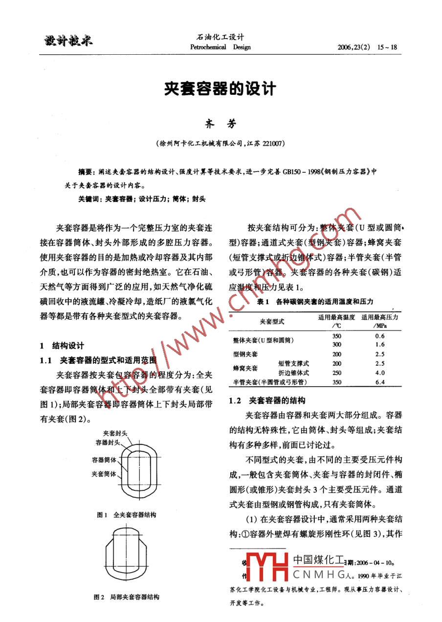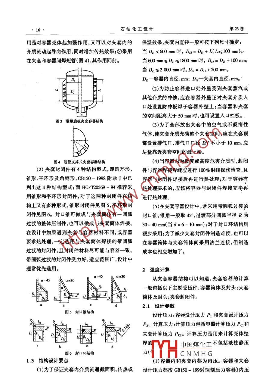 潑計(jì)拔術(shù)石油化工設(shè)計(jì)Petrochemical Design2006,23(2) 15~ 18.夾套容器的設(shè)計(jì)齊芳(徐州阿卡化工機(jī)械有限公司,江蘇221007)摘要:闡述夾套容器的結(jié)構(gòu)設(shè)計(jì)、強(qiáng)度計(jì)算等技術(shù)要求,進(jìn)一步完善GB150- 1998《鋼制壓力容器》中關(guān)于夾套容器的設(shè)計(jì)內(nèi)容。關(guān)鍵詞:夾套容器;設(shè)計(jì)壓力;簡體;封頭夾套容器是將作為一個(gè)完整壓力室的夾套連按夾套結(jié)構(gòu)可分為:整體夾套(U型或圓簡.接在容器筒體、封頭外部形成的多腔壓力容器。型)容器;通道式夾套(型鋼夾套)容器;蜂窩夾套使用夾套容器的目的是加熱或冷卻容器及其內(nèi)部(短管支撐式或折邊錐體式)容器;半管夾套(半管介質(zhì),也可以作為容器的密封絕熱室。它在石油、或弓形管)容器。夾套容器的各種夾套(碳鋼)適天然氣等方面得到廣泛的應(yīng)用,如天然氣凈化硫應(yīng)溫度和壓力見表1?;腔厥罩械囊毫鞴?、冷凝冷卻,造紙廠的液氯氣化表1各種碳鋼夾套的適用溫度和壓力器等都是帶有各種夾套型式的夾套容器。夾套型式適用最高溫度適用最高壓力/9/MPa0.6整體夾套(U型和園簡)1結(jié)構(gòu)設(shè)計(jì)301.型鋼夾套202.51.1夾套容器的型式和適用范圍蜂窩夾套短管支撐式.夾套容器按夾套包容容器的程度分為:全夾折邊錐體式254.套容器即容器筒體和上下封頭全部帶有夾套(見半管夾套(半圓管或弓形管)6.4圖1);局部夾套容器即容器筒體上下封頭局部帶1.2夾套容器的結(jié)構(gòu)夾套容器由容器和夾套兩大部分組成。容器有夾套(圖2)。夾套封頭的結(jié)構(gòu)無特殊性,它由筒體、封頭等組成;夾套結(jié)容器封頭構(gòu)有多種多樣,前面已討論過。容器簡體、不同型式的夾套,由不同的主要受壓元件構(gòu)夾套簡體、成,一般包含夾套簡體、夾套與容器的封閉件、橢圓形(或錐形)夾套封頭3個(gè)主要受壓元件。通道式夾套由型鋼或鋼管構(gòu)成,只有夾套簡體。圖1全夾套容器結(jié)構(gòu) .(1)在夾套容器設(shè)計(jì)中,通常采用兩種夾套結(jié)構(gòu):①容器外壁焊有螺旋形剛性環(huán)(見圖3),其作中國煤化工:2006-04-10:YHC N M H G人。190年畢業(yè)于江蘇化工學(xué)院化工設(shè)備與機(jī)械專業(yè),工程師?,F(xiàn)從事壓力容暴設(shè)計(jì)、圖2局部夾套容器結(jié)構(gòu)開發(fā)等工作。6●石油化工設(shè)計(jì)第23卷用是對(duì)容器殼體起加強(qiáng)作用,又可以對(duì)夾套內(nèi)的保溫效果 ,夾套內(nèi)直徑一般可按下列尺寸確定:介質(zhì)流動(dòng)起導(dǎo)向作用,同時(shí)增加傳熱效果;②采用當(dāng)Da<600 mm時(shí),D2= Da1+ L(L≤100 mm);在夾套和容器間焊短管(圖4) ,其作用同前。當(dāng)600 mm≤Da≤1800 mm時(shí), D2= D; + 100 mm;當(dāng)Du≥2000mm時(shí),D:2=Da+200mm。.D;-容器內(nèi)直徑,mm; Dz-夾套內(nèi)直徑, mmo(2)為防止容器進(jìn)口處外壁受到夾套蒸汽或其他介質(zhì)的沖蝕,應(yīng)在容器外壁正對(duì)夾套介質(zhì)人口處設(shè)置防沖板焊于容器外壁上;當(dāng)容器和夾套E1的空間距離大于50 mm時(shí),也可設(shè)置人口檔板。圖3帶螺旋板夾套容器結(jié)構(gòu)(3)為了全部放出夾套中的空氣或不凝惰性氣體,使夾套介質(zhì)充滿整個(gè)夾套空間,應(yīng)在夾套頂部設(shè)置排氣口,排氣口口徑DN不小于10 mm,應(yīng)盡量靠近夾套空間的最上端。圖4短管支撐式夾套容器結(jié)構(gòu)(4)當(dāng)容器內(nèi)為極度或高度危害介質(zhì)時(shí),封閉(2)夾套封閉件有4種結(jié)構(gòu)型式,即圓環(huán)形、件 與容器焊接焊縫應(yīng)進(jìn)行100%射線探傷檢查,且錐形、平環(huán)形及角鋼形,GCB150 - 1998 附錄J中已容 器與封閉件焊接后再進(jìn)行熱處理;對(duì)于容器有列出這4種結(jié)構(gòu)型式;而HC/T20569 - 94推薦采熱處理要求 的,應(yīng)該將容器與封閉件焊接完畢再用錐形和平環(huán)形封閉件,對(duì)于這兩種封閉件在結(jié)進(jìn)行熱處理。構(gòu)上又有多種形式,錐形封閉件見圖5,平環(huán)形封(5)在夾套容器設(shè)計(jì)中,常采用帶圓弧過渡的閉件見圖6。封口錐可做成與夾套簡體有一圓弧封口錐,錐角一般取45°,過渡部分圓弧半徑R為過渡的整體壓制件,也可以做成與夾套筒體焊接。30~ 40 mm(當(dāng)8 =6 ~ 10 mm);對(duì)于封口環(huán)結(jié)構(gòu)則在設(shè)計(jì)中如果遇到夾套與容器材料不同,或容器很少采用;為了減少夾套封閉件制造難度,也可以要求熱處理,一定選用與夾套簡體焊接的帶圓弧在容器簡體與夾套簡體間采用法蘭連接,但制造過渡的封閉件,且封閉件材料盡可能與容器- -致。 .成本也相應(yīng)增加了。帶圓弧過渡的封閉件受力好,適應(yīng)范圍廣,設(shè)計(jì)中通常優(yōu)先選用。2強(qiáng)度計(jì)算凡a=45a=30a=45從夾套容器結(jié)構(gòu)可以知道,夾套容器的計(jì)算- -般包括以下主要受壓件:容器簡體及封頭;夾套); 8D過D簡體及封頭;夾套封閉件。2.1設(shè)計(jì)參數(shù)圖5封口錐結(jié)構(gòu)設(shè)計(jì)壓力:容器設(shè)計(jì)壓力P和夾套設(shè)計(jì)壓力b.P2。計(jì)算壓力:計(jì)算壓力包括容器計(jì)算壓力Pa和夾套計(jì)算壓力Pa。計(jì)算壓力是用來計(jì)算殼體壁厚的中國煤化工不包括液柱靜壓d圖6封口環(huán)結(jié)構(gòu)MYHCNMHG1.3 結(jié)構(gòu)設(shè)計(jì)要點(diǎn)(1)容器內(nèi)和