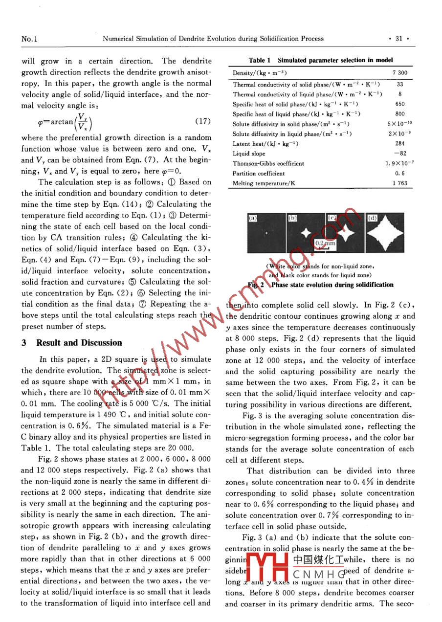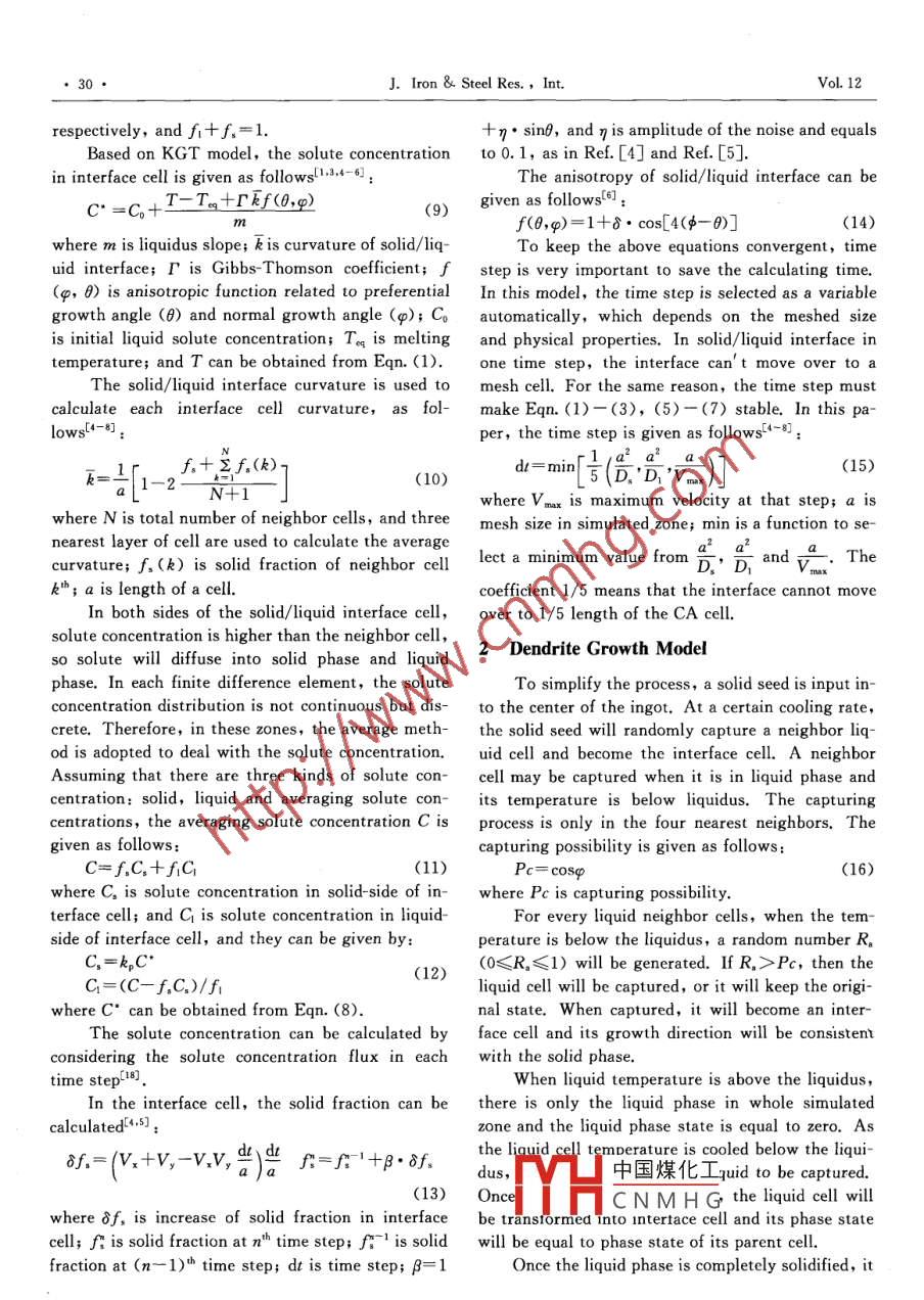 Vol.12 No. 1J. Iron & Steel Res. , Int.Jan, 2005Numerical Simulation of Dendrite Evolution during Solidification ProcessLI Qiang',GUO Qiao-yi?,REN Chuan-fu3(1. Shenyang University of Technology, Shenyang 110023, China;2. Shenyang Ligong University,Shenyang 110168, China; 3. Shenyang University, Shenyang 110044, China)Abstract: In order to precisely describe the dendrite evolution during solidification process, especially in micro-scale, a continuous method is presented to deal with the discontinuous physical properties beside the solid/liquidinterface. In this method, the physical properties are used as averaging physical properties of solid phase and liquidphase in the interface zone, which can smooth the property gap between solid and liquid phases, and make theproperties from liquid phase to solid phase. The simulated results show that the method can represent the side-branches and the solute micro-segregation well.Key words: numerical simulation; continuous method; dendrite evolution; micro segregationSolidification is a very complicated process indifferent values. So some researchers used othercluding heat and solute transfer, phase transitionmethods to deal with the discontinuous properties,and interface migration processes which directly in-Damir JuricCL3] adopted the Front-Tracking methodfluence solidification microstructure. Solidification(FT) using complex expression to define the posi-microstructure is an important index to evaluate me-tion of solid/ liquid interface, which limits the calcu-chanical and other physical properties of the finallating scale. The sharp -interface method (SI), usedproduct. In the past, most of researchers used ex-by Udaykumar H S14, has too much calculation ofperimental and theoretical methods to study the so-the interface temperature by iterating the solute con-lidification theory[1,2].However, experimentalcentration. The phase field (PF) method requiresmethods are expensive and cannot avoid the limita-the mesh size to be smaller than the interface thick-tion caused by the conditions, while the theoreticalnessl1s,16], which also limits the calculation scale.methods cannot describe the solidification micro-As stated by Christof Eck et al[1],these models re-structure preciselyt3. The numerical simulationquire much more details of dendrite in order to ob-method can overcome the problems and predict the tain reasonable results, which are only suitable tosolidification microstructure accurately, so there ismicro-scale. In this paper, Cellular Automatonmuch interest on this method in recent years4- 17] .(CA) method is adopted because this method is notDendrite is one of the most common morpholo-limited by simulated size and CA rules are simple togies of solidification microstructure and has a directunderstand.impact on the final casting mechanical propertiesConsidering the discontinuous properties in in-through the local cooling conditions. Therefore, terface zone, a continuous method is developed, assimulation of the dendrite formation and evolutionillustrated in Fig. 1. In this method, the propertieshas attracted much attention[4- 17].of interface can be treated as a continuous functionWhen liquid transforms into solid phase, heat of solid fraction to smooth property gap between theconductivity, specific heat and density of the liquid solid and liquid phases, so that the unstable heat andmaterial change greatly. In order. to solve these dis-solute transfers can be reflected to precisely describecontinuous problems, some researchers took the sol-the solid fraction, interface velocity and solute con-id and liquid physical properties as a constant and re-centration redistribution in interface zone. Mean-garded their values as equalC4- 12]. However, this apwhile, the averaging solute concentration is adoptedproximate simulation make the results deviate from to keep the total solute concentration conservation.real dendrite morphology because the heat transferand solute diffusing rates in different phases have of th中國(guó)煤化工。-only requires its ve-Bography: LI Qiang(1973-), Male Doctor, Letureship; E mail: qli@imr. acTHCNM H G,No.1Numerical Simulation of Dendrite Evolution during Solidification ProcessIn the interface cell, solute conservation equa-Volume elementLiquid.tion is given[14-6] as:physical,2(0propertyLiquidphysica(1-k,)C*Vx=D.(N).-D(),(3)l propertyIn addition, the chemical potential is assumedSold Liquidas equilibrium beside the solid/liquid interface,x_(0x(0)which causes the redistribution of solute concentra-tion, as follows:hak.f+kxhC,=kpc*(4)f+f=1Boundary conditions:SoldpaC=0aT_(5)an)第=q q=h(T" - Tm)Liquid : Iteiface i0 f(x)→5,T(1=0,x,y)= To(x,y), C(=0,x,y)=Co(x,y)Initial conditions: .(6)Fig. 1 Continuous method to deal withdiscontinuous propertieswhere ρ is density; Cp is specific heat; k is thermalconductivity; Ln is latent heat released by phaselocity and which cell it' s located. Therefore, there istransition from liquid to solid phase; f, is solid frac-no much calculation for tracking and can be extendedtion; T is temperature, t is time; C is solute concen-to macro-scale simulation. Moreover, the stochastictration; D is solute diffusion coefficient, and in solidmethod is used to show the nucleation and growth,and liquid cell, D is equal to D and D, respective-thus the evolution can reflect the random feature ofy; C* is solute concentration in interface cell; Vx issolidification microstructure.normal velocity of solid/ liquid interface; kp is soluteContinuous Method of Heat and Speciespartition coefficient in interface cell, which is as-sumed as a constant and reflects solutal concentra-Transfertion gap between solid and liquid phase beside inter-Dendrite evolution process involves two primaryface; n is normal direction of solid/ liquid interface;aspects: heat and solute transfer model, and nuclea-Tm is temperature of boundary cell; h is heat trans-tion and interface migrating process in undercoolingfer rate on boundary; 