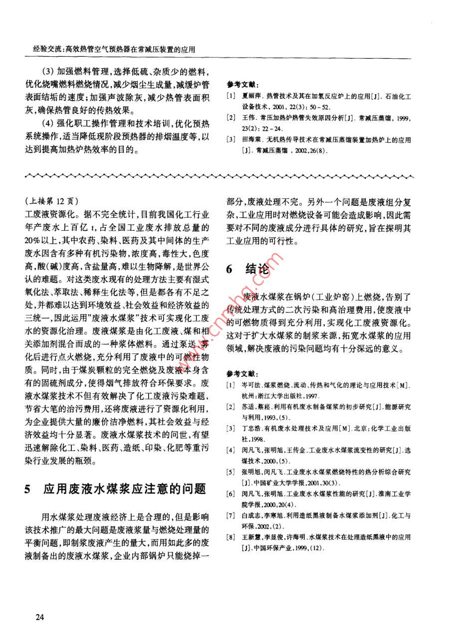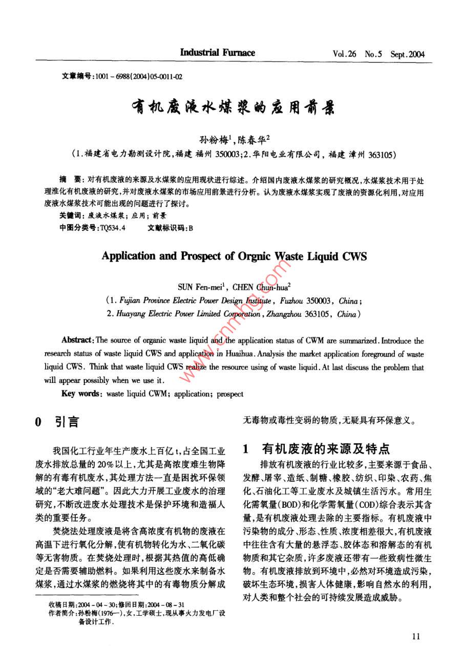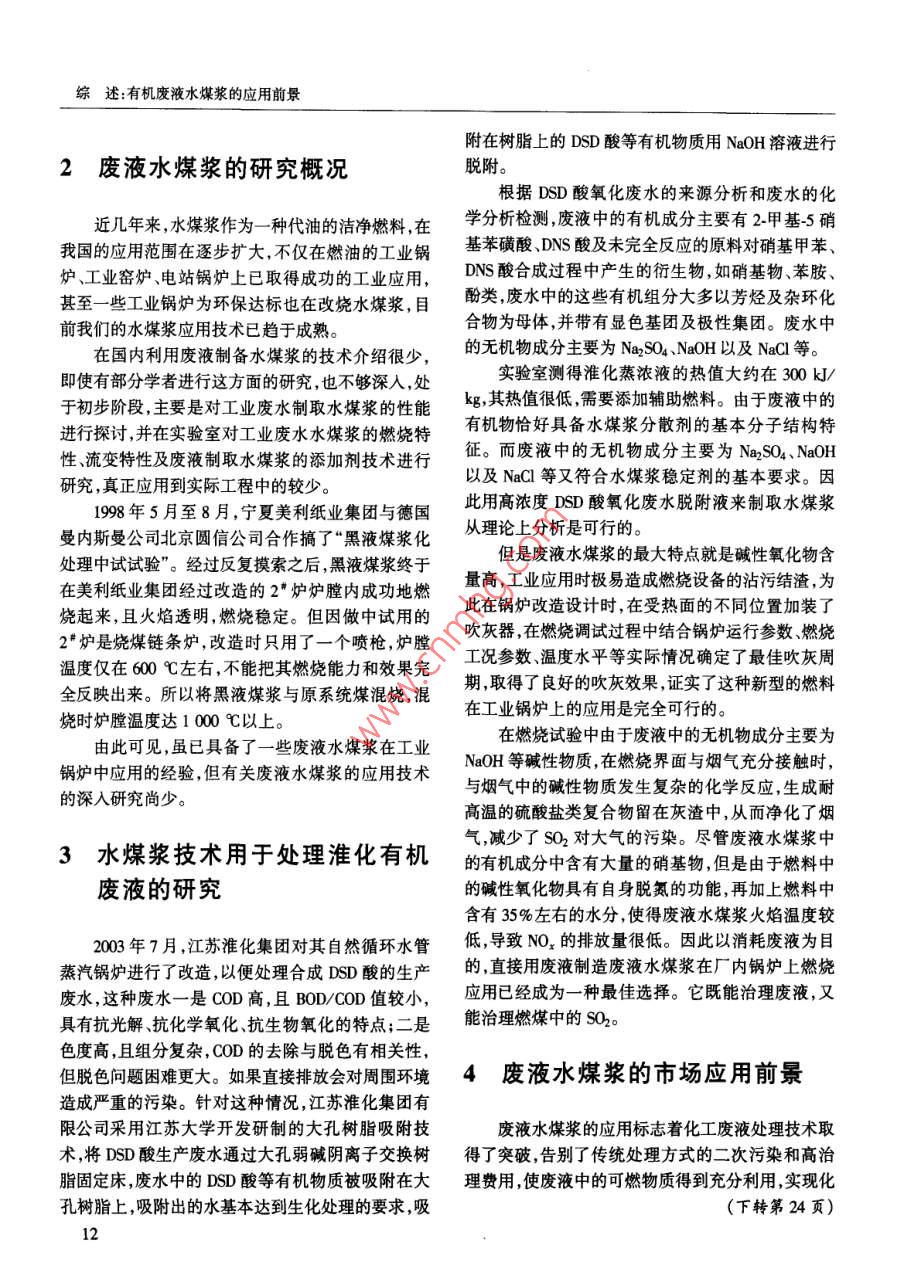 Industrial FurnaceVol 26 No 5 Sept 2004文章編號:10012004)05-0011-02有機廢液水煤漿的發(fā)用前景孫粉梅1,陳春華2(1.福建省電力勘測設(shè)計院,福建福州3500032.華陽電業(yè)有限公司,福建漳州363105)摘要:對有機廢液的來源及水煤漿的應(yīng)用現(xiàn)狀進行綜述。介紹國內(nèi)廢液水煤漿的研究概況,水煤漿技術(shù)用于處理準化有機廢液的研究并對廢液水煤漿的市場應(yīng)用前景進行分析。認為廢液水煤漿實現(xiàn)了廢液的資源化利用,對應(yīng)用廢液水煤漿技術(shù)可能出現(xiàn)的問題進行了探討。關(guān)鍵詞:廢液水煤漿;應(yīng)用;前景中圖分類號:TQ5344文獻標識碼:BApplication and Prospect of Orgnic Waste Liquid CWSSUN Fen-mei CHEN Chun-hua(1. Fujian Province Electric Power Design Institute, Fuzhou 350003, China;2. Huayang Electric Power Limited Corporation, Zhangzhou 363105, China)Abstract: The source of organic waste liquid and the application status of CWM are summarized. Introdresearch status of waste liquid CWS and application in Huaihua. Analysis the market application foreground of wasteliquid CWS. Think that waste liquid CWS realize the resource using of waste liquid. At last discuss the problem thatwill appKey words: waste liquid CWM: application; prospect0引言無毒物或毒性變?nèi)醯奈镔|(zhì),無疑具有環(huán)保意義。我國化工行業(yè)年生產(chǎn)廢水上百億,占全國工業(yè)1有機廢液的來源及特點廢水排放總量的20%以上,尤其是高濃度難生物降排放有機廢液的行業(yè)比較多,主要來源于食品、解的有毒有機廢水,其處理方法一直是困擾環(huán)保領(lǐng)發(fā)酵、屠宰、造紙、制糖、橡膠、紡織、印染、農(nóng)藥、焦域的“老大難問題”。因此大力開展工業(yè)廢水的治理化、石油化工等工業(yè)廢水及城鎮(zhèn)生活污水。常用生研究,不斷改進廢水處理技術(shù)是保護環(huán)境和造福人化需氧量(BOD)和化學(xué)需氧量(COD)綜合表示其含類的重要任務(wù)量,是有機廢液處理去除的主要指標。有機廢液中焚燒法處理廢液是將含高濃度有機物的廢液在污染物的成分、形態(tài)、性質(zhì)濃度相差很大,有機廢液高溫下進行氧化分解,使有機物轉(zhuǎn)化為水、二氧化碳中往往含有大量的懸浮態(tài)膠體態(tài)和溶解態(tài)的有機等無害物質(zhì)。在焚燒處理時,根據(jù)其熱值的髙低確物質(zhì)和其它雜質(zhì),許多廢液還帶有一些致病性微生定是否需要輔助燃料。如果利用這些廢水來制備水物。有機廢液排放到環(huán)境中,必然對環(huán)境造成污染煤漿,通過水煤漿的燃燒將其中的有毒物質(zhì)分解成破壞生態(tài)環(huán)境,損害人體健康影響自然水的利用對人類和整個社會的可持續(xù)發(fā)展造成威脅收稿日期:2004-04-30;修回日期:2004-08-31作者簡介:孫粉梅(1976),女,工學(xué)碩士現(xiàn)從事火力發(fā)電廠設(shè)備設(shè)計工作11綜述:有機廢液水煤漿的應(yīng)用前景附在樹脂上的DSD酸等有機物質(zhì)用NaOH溶液進行2廢液水煤漿的研究概況脫附。根據(jù)DSD酸氧化廢水的來源分析和廢水的化近幾年來水煤漿作為一種代油的潔凈燃料,在學(xué)分析檢測,廢液中的有機成分主要有2甲基5硝我國的應(yīng)用范圍在逐步擴大,不僅在燃油的工業(yè)鍋基苯磺酸、DNS酸及未完全反應(yīng)的原料對硝基甲苯、爐、工業(yè)窯爐、電站鍋爐上已取得成功的工業(yè)應(yīng)用,DNs酸合成過程中產(chǎn)生的衍生物,如硝基物苯胺甚至一些工業(yè)鍋爐為環(huán)保達標也在改燒水煤漿,目酚類,廢水中的這些有機組分大多以芳烴及雜環(huán)化前我們的水煤漿應(yīng)用技術(shù)已趨于成熟。合物為母體并帶有顯色基團及極性集團。廢水中在國內(nèi)利用廢液制備水煤漿的技術(shù)介紹很少,的無機物成分主要為NaSO4、NBOH以及NC等。即使有部分學(xué)者進行這方面的研究,也不夠深入,處實驗室測得淮化蒸濃液的熱值大約在300kJ于初步階段,主要是對工業(yè)廢水制取水煤漿的性能kg,其熱值很低,需要添加輔助燃料。由于廢液中的進行探討,并在實驗室對工業(yè)廢水水煤漿的燃燒特有機物恰好具備水媒漿分散劑的基本分子結(jié)構(gòu)特性、流變特性及廢液制取水煤漿的添加劑技術(shù)進行征。而廢液中的無機物成分主要為N2SO4、NaOH研究,真正應(yīng)用到實際工程中的較少。以及NaC1等又符合水煤漿穩(wěn)定劑的基本要求。因198年5月至8月,寧夏美利紙業(yè)集團與德國此用高濃度DSD酸氧化廢水脫附液來制取水煤漿曼內(nèi)斯曼公司北京圓信公司合作搞了“黑液煤漿化從理論上分析是可行的。處理中試試驗”。經(jīng)過反復(fù)摸索之后,黑液煤漿終于但是廢液水煤漿的最大特點就是堿性氧化物含在美利紙業(yè)集團經(jīng)過改造的2爐爐膛內(nèi)成功地燃量高,工業(yè)應(yīng)用時極易造成燃燒設(shè)備的沾污結(jié)渣,為燒起來,且火焰透明,燃燒穩(wěn)定。但因做中試用的此在鍋爐改造設(shè)計時,在受熱面的不同位置加裝了2“爐是燒煤鏈條爐,改造時只用了一個噴槍,爐膛吹灰器在燃燒調(diào)試過程中結(jié)合鍋爐運行參數(shù)、燃燒溫度僅在600℃左右,不能把其燃燒能力和效果完況參數(shù)、溫度水平等實際情況確定了最佳吹灰周全反映出來。所以將黑液煤漿與原系統(tǒng)煤混燒,混期,取得了良好的吹灰效果,證實了這種新型的燃料燒時爐膛溫度達1000℃以上。在工業(yè)