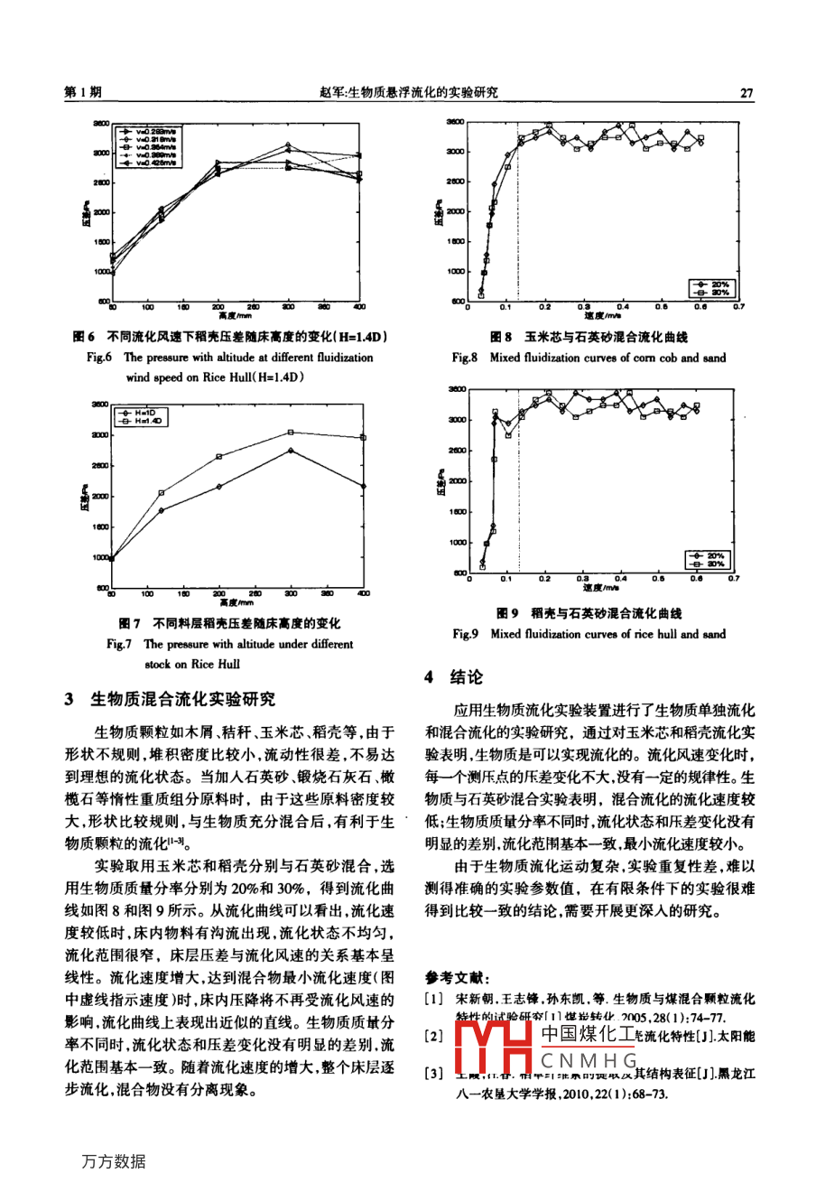 第23卷第1期黑龍江八一農(nóng)墾大學(xué)學(xué)報23(1):25-272011年Joumal of Heilongjiang Bayi Agricultural UniversityFeb. 201文章編號:1002-2090(2011)01-002503生物質(zhì)懸浮流化的實驗研究趙軍黑龍江八一農(nóng)墾大學(xué),大慶163319)摘要:應(yīng)用自行設(shè)計的實驗裝置分別對玉米芯和稻殼進行了單獨流化和混合流化的實驗研究。研究表明,生物質(zhì)是可以實現(xiàn)流化的,生物質(zhì)的混合流化速度低于單獨流化速度。生物質(zhì)混合流化時質(zhì)量分率分別為20%和30%時流化狀態(tài)和壓差變化沒有明顯的差別,流化范圍基本一致。關(guān)鍵詞:生物質(zhì);流化;流化速度中圖分類號:S2162文獻標(biāo)識碼:AExperimental Study on the Fluidization of BiomassZhao JunHeilongjiang Bayi Agricultural University, Daqing 163319)Abstract: In this paper, by using a new experimental device designed by them, it carries out an experimental study of single fluidize-tion and mixed fluidization on com cob and husk. The results show that biomass can achieve fluidization The mixed fluidization velocity is lower than that of mixed fluidization. During the fluidization of the biomass, whenfractions are respectively 20% and0%, the fluidization state and the compression difference changes are not very significant, and their fluidization range is almost condistentKey words: biomass; fluidization; fluidization velocity懸浮流化是指當(dāng)流體向上流過堆積在容器中的石英砂篩分粒度為40-70目,平均粒徑230μm,平固體顆粒層時,使顆粒與顆粒之間脫離接觸消除顆均密度1643kg·m3。粒間的內(nèi)摩擦現(xiàn)象,達到固體顆粒流化的目的,在流實驗流化氣體為空氣,室溫20℃,空氣的密度化過程中,顆粒的均勻懸浮使得顆粒和流體之間有1.205kg·m3,運動粘度15×10。m2·s-,動力粘度充分的接觸和反應(yīng)機會,有利于顆粒物料的傳熱和18.08×1046Pa·s傳質(zhì)的進行。利用懸浮流化進行生物質(zhì)顆粒熱解氣自行設(shè)計的實驗裝置包括空氣壓縮機、轉(zhuǎn)子流化或液化實驗使生物質(zhì)顆粒與流化氣體混合,達到量計圓柱形懸浮床、U型壓力計等,如圖1所示??焖贌峤獾哪康摹A柱形懸浮床由內(nèi)徑為100mm、高為1000mm1實驗裝置與原料的有機玻璃制成,床底部和上部開有測壓孔,讀取物料床層壓降。實驗過程中流化介質(zhì)由空氣壓縮機提實驗生物質(zhì)原料為玉米芯和稻殼,為寬篩分分供,壓縮空氣通過底部布氣孔使氣體均勻分布,在氣布。玉米芯的篩分粒度為40-60目,平均粒徑流作用下,床內(nèi)物料處于流化態(tài),床內(nèi)流量和壓力通315μm,平均密度146kg·m3;稻殼篩分粒度為過轉(zhuǎn)子流量計和U型壓力計讀取。U型壓力計一端40~60目,平均粒徑315μm,平均密度212kgm3;接風(fēng)室,另一端接布氣孔上部1中國煤化工收稿日期:201006-17CNMHG基金項目:黑龍江八一農(nóng)墾大學(xué)博士啟動基金(校啟2009-8)。作者簡介:趙軍(1969-),男教授東北林業(yè)大學(xué)博士研究生畢業(yè),現(xiàn)主要從事農(nóng)機化工程的教學(xué)和科研工作黑龍江八一農(nóng)墾大學(xué)學(xué)報第23卷圖1實驗裝置示意圖圖3不同流化風(fēng)速下玉米芯壓差隨床高度的變化(H=14D)Fig. 1 The schematic diagram of experimental deviceFig 3 The pressure with altitude at different fluidization1空氣壓縮機2轉(zhuǎn)子流量計3圓柱形懸浮床4U型壓力計wind speed on Com Cob(H=l4D)2生物質(zhì)單獨流化實驗研究圖4表示玉米芯在相同流化風(fēng)速(v=0425m·s)對玉米芯進行單獨流化實驗。觀察實驗過程得不同料層高度下,壓差隨床高度的變化。由圖看出,壓出:流化風(fēng)速較低時,床中頂部有少量玉米芯被流差隨物料量的增大而增大的,由于流化風(fēng)速一定,物化,其它玉米芯沒有移動。隨著流化風(fēng)速增加,床中料量增加,顆粒被流化時的曳力增加,壓差也增大玉米芯的流化量增加,底部的玉米芯也開始移動,但稻殼的流化過程與玉米芯相似,如圖5、圖6、圖移動速度緩慢。流化風(fēng)速繼續(xù)增加,床層底部玉米芯7所示。由于稻殼的密度比玉米芯大,不同的流化風(fēng)快速移動,床層頂部玉米芯流化量顯著增加。速下流化時的壓差也較大。床高度較大時(H=14D),圖2圖3所示玉米芯在不同流化風(fēng)速下壓差隨流化風(fēng)速不同,各測量點的壓差波動較小床高度的變化曲線,其中玉米芯料層高度分別為1D(D為床直徑)和14D。由圖可見,壓差隨床高度的增加而增大,達到某一高度后,壓差基本保持不變,說明床層下部濃相顆粒的壓差變化較小;床層頂部稀相壓差變化較大顆粒處于流化狀態(tài)。當(dāng)流化風(fēng)速變化時,每一個測壓點的壓差變化不大,沒有一定的規(guī)律性,床層高度較大時(14D),不同的流化風(fēng)速下床層壓差變化較小。因此,流化風(fēng)速對床內(nèi)壓差影響較小。圖4不同料層玉米芯壓差隨床高度的變化Fig 4 The pressure with altitude under different stock on Corm Cob中國煤化工圖2不同流化風(fēng)速下玉米芯壓差隨床高度的變化(H=1D)CNMHG高度的變化(H=1DFig.2 The pressure with altitude at different fluidizationwind speed on Com Cob(H=ID)peed on Rice hull( H=lD)趙軍生物質(zhì)懸浮流化的實驗研究2日6不同流化風(fēng)速下稻殼壓差隨床高度的變化H=14D圖8玉米芯與石英砂混合流化曲線Fig 6 The pressure with altitude at different FluidizationFig 8 Mixed fluidization curves of com cob and sandwind speed on Rice Hull(H=l 4D)合圖7不同料層稻殼壓差隨床高度的變化圖9稻殼與石英矽混合流