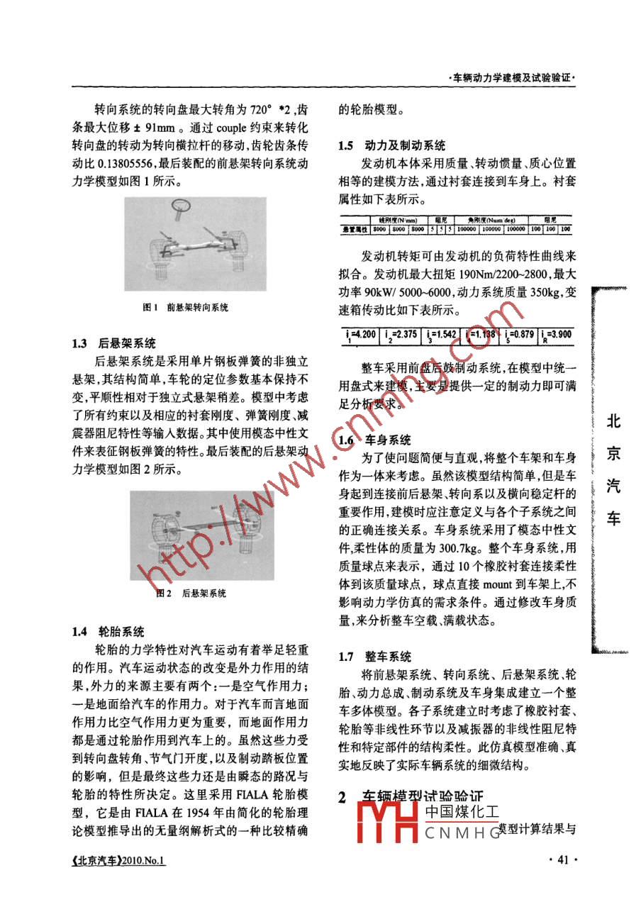 車輛動力學(xué)建模及試驗(yàn)驗(yàn)證文章編號:10024581(2010)01-004004車輛動力學(xué)建模及試驗(yàn)驗(yàn)證殷梅,王成龍Yin Mei, Wang Chenglong(上海匯眾汽車制造有限公司,上海200122摘要:為實(shí)現(xiàn)對某商用車輛的性能評估、參數(shù)優(yōu)化設(shè)計(jì),利用 MSC ADAMS/CAR軟件建立了整車動力學(xué)模型在多體動力學(xué)的理論基礎(chǔ)上,充分考慮減震器橡膠村套等元件的非線性特性。通過對整車動力學(xué)模型進(jìn)行仿真分析將懸架特性曲線與利用K&C試驗(yàn)臺得到的相應(yīng)特性曲線進(jìn)行比較分析證明該多體動力學(xué)模型的合理性和適用性。關(guān)鍵詞:車輛動力學(xué);仿真;K&C試驗(yàn);模型驗(yàn)證中圖分類號:U461.1文獻(xiàn)標(biāo)識碼:A北0引言系統(tǒng)。一般在較為復(fù)雜的汽車動力學(xué)模型中,不但京動力學(xué)分析與仿真隨著計(jì)算機(jī)技術(shù)的發(fā)展需要各運(yùn)動部件之間連接點(diǎn)的空間坐標(biāo)、零部件的質(zhì)量特性參數(shù)(質(zhì)量、質(zhì)心位置、轉(zhuǎn)動慣量等),汽而不斷成熟:系統(tǒng)動力學(xué)理論的完善和虛報(bào)樣機(jī)而且還需要模型中彈性體的力學(xué)特性參數(shù)(剛度、技術(shù)的發(fā)展,尤其是機(jī)械系統(tǒng)建模和仿真商業(yè)軟阻尼)等,如橡膠元件的非線性剛度、減振器的非車{件的出現(xiàn)使得動力學(xué)分析與仿真技術(shù)在汽車行業(yè)得到越來越廣泛的應(yīng)用?;跀?shù)字化的虛擬樣線性阻尼特性等。仿真計(jì)算中的數(shù)據(jù)主要來自圖紙查閱、CAD數(shù)模及整車技術(shù)參數(shù)表。零部件的幾機(jī)仿真技術(shù)可以簡化產(chǎn)品的設(shè)計(jì)開發(fā)過程,大幅度縮短產(chǎn)品開發(fā)周期,大量減少產(chǎn)品開發(fā)費(fèi)用和何尺寸、材料屬性及力學(xué)特性等參數(shù)主要來自圖紙資料和技術(shù)文獻(xiàn),質(zhì)量、慣量及質(zhì)心位置等參數(shù)成本,明顯提高產(chǎn)品質(zhì)量,提高產(chǎn)品的系統(tǒng)級性根據(jù)零部件的三維實(shí)體模型取得。能,獲得最優(yōu)化和創(chuàng)新的設(shè)計(jì)產(chǎn)品,是當(dāng)今車研發(fā)領(lǐng)域的一項(xiàng)關(guān)鍵核心技術(shù)。12前懸架轉(zhuǎn)向系統(tǒng)1車輛動力學(xué)模型前懸架系統(tǒng)為雙橫臂式獨(dú)立懸架,包含上下橫臂、轉(zhuǎn)向節(jié)、轉(zhuǎn)向拉桿、橫向穩(wěn)定桿、扭桿彈11模型概述簧等部件。橫向穩(wěn)定桿常用來提高懸架的側(cè)傾角隨著一些車輛多體系統(tǒng)動力學(xué)分析軟件的剛度或是調(diào)整前后懸架的側(cè)傾剛度的比值,在這紛紛問世,為車輛動力學(xué)研究提供了一個方便里橫向穩(wěn)定桿采用模態(tài)中性文件來表達(dá)。扭桿彈快捷的手段。選擇 MSC ADAMS/CAR作為建?;傻慕K悸窞?在扭桿中間部分截?cái)?前端部工具,該工具是進(jìn)行車輛建模的理想工具,用戶分通過 fix joint接到車架,后端部件直接和控制可以根據(jù)實(shí)際情況選擇子系統(tǒng)型式和修改模型臂作為一體,對中間斷開部分添加圓柱副參數(shù),方便地創(chuàng)建車輛的三維動力學(xué)模型。文中( cylin增加卻桂籌根據(jù)零件圖紙調(diào)用了 ADAMS/CAR的前懸子系統(tǒng)、后懸子系計(jì)算中國煤化rad.,扭桿預(yù)統(tǒng)、轉(zhuǎn)向子系統(tǒng)、輪胎系統(tǒng)以及動力系統(tǒng)和制動載荷CNMHG《北京汽車)2010N01車輛動力學(xué)建模及試驗(yàn)驗(yàn)證轉(zhuǎn)向系統(tǒng)的轉(zhuǎn)向盤最大轉(zhuǎn)角為720°*2,齒的輪胎模型。條最大位移±9mm。通過 couple約束來轉(zhuǎn)化轉(zhuǎn)向盤的轉(zhuǎn)動為轉(zhuǎn)向橫拉桿的移動,齒輪齒條傳15動力及制動系統(tǒng)動比01380555,最后裝配的前懸架轉(zhuǎn)向系統(tǒng)動發(fā)動機(jī)本體采用質(zhì)量、轉(zhuǎn)動慣量、質(zhì)心位置力學(xué)模型如圖1所示。相等的建模方法,通過襯套連接到車身上。襯套屬性如下表所示。發(fā)動機(jī)轉(zhuǎn)矩可由發(fā)動機(jī)的負(fù)荷特性曲線來擬合。發(fā)動機(jī)最大扭矩190Nm/22002800,最大功率90kW/5000600,動力系統(tǒng)質(zhì)量350kg,變圖1前懸架轉(zhuǎn)向系統(tǒng)速箱傳動比如下表所示。13后懸架系統(tǒng)40[312[=1【4區(qū)39后懸架系統(tǒng)是采用單片鋼板彈簧的非獨(dú)立整車釆用前盤后鼓制動系統(tǒng),在模型中統(tǒng)懸架,其結(jié)構(gòu)簡單,車輪的定位參數(shù)基本保持不用盤式來建模,主要是提供一定的制動力即可滿變,平順性相對于獨(dú)立式懸架稍差。模型中考慮足分析要求。了所有約束以及相應(yīng)的襯套剛度、彈簧剛度、減震器阻尼特性等輸入數(shù)據(jù)。其中使用模態(tài)中性文北16車身系統(tǒng)件來表征鋼板彈簧的特性。最后裝配的后懸架動力學(xué)模型如圖2所示。為了使問題簡便與直觀,將整個車架和車身作為一體來考慮。雖然該模型結(jié)構(gòu)簡單,但是車身起到連接前后懸架轉(zhuǎn)向系以及橫向穩(wěn)定桿的}汽重要作用,建模時應(yīng)注意定義與各個子系統(tǒng)之間車的正確連接關(guān)系。車身系統(tǒng)采用了模態(tài)中性文件柔性體的質(zhì)量為300kg。整個車身系統(tǒng),用質(zhì)量球點(diǎn)來表示,通過10個橡膠襯套連接柔性體到該質(zhì)量球點(diǎn),球點(diǎn)直接 mount到車架上不圖2后懸架系