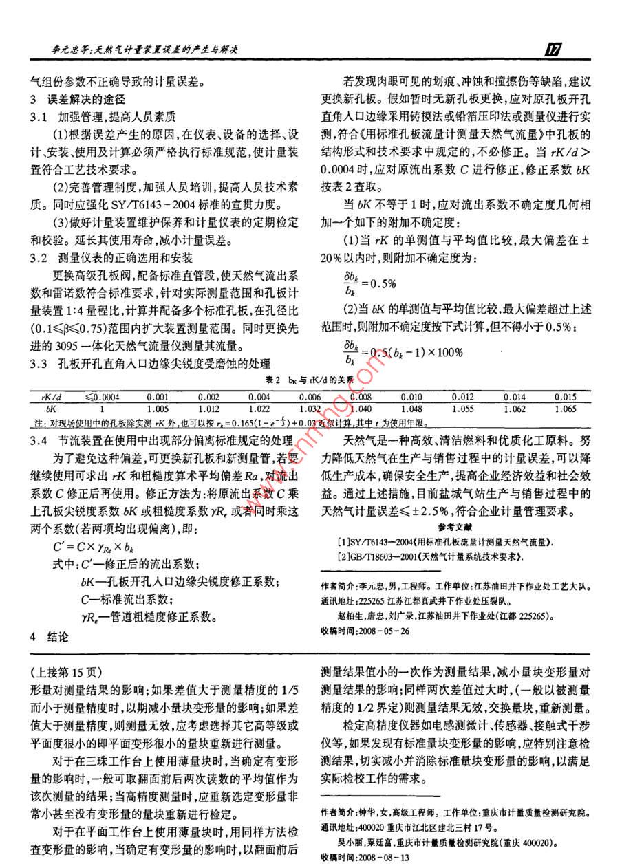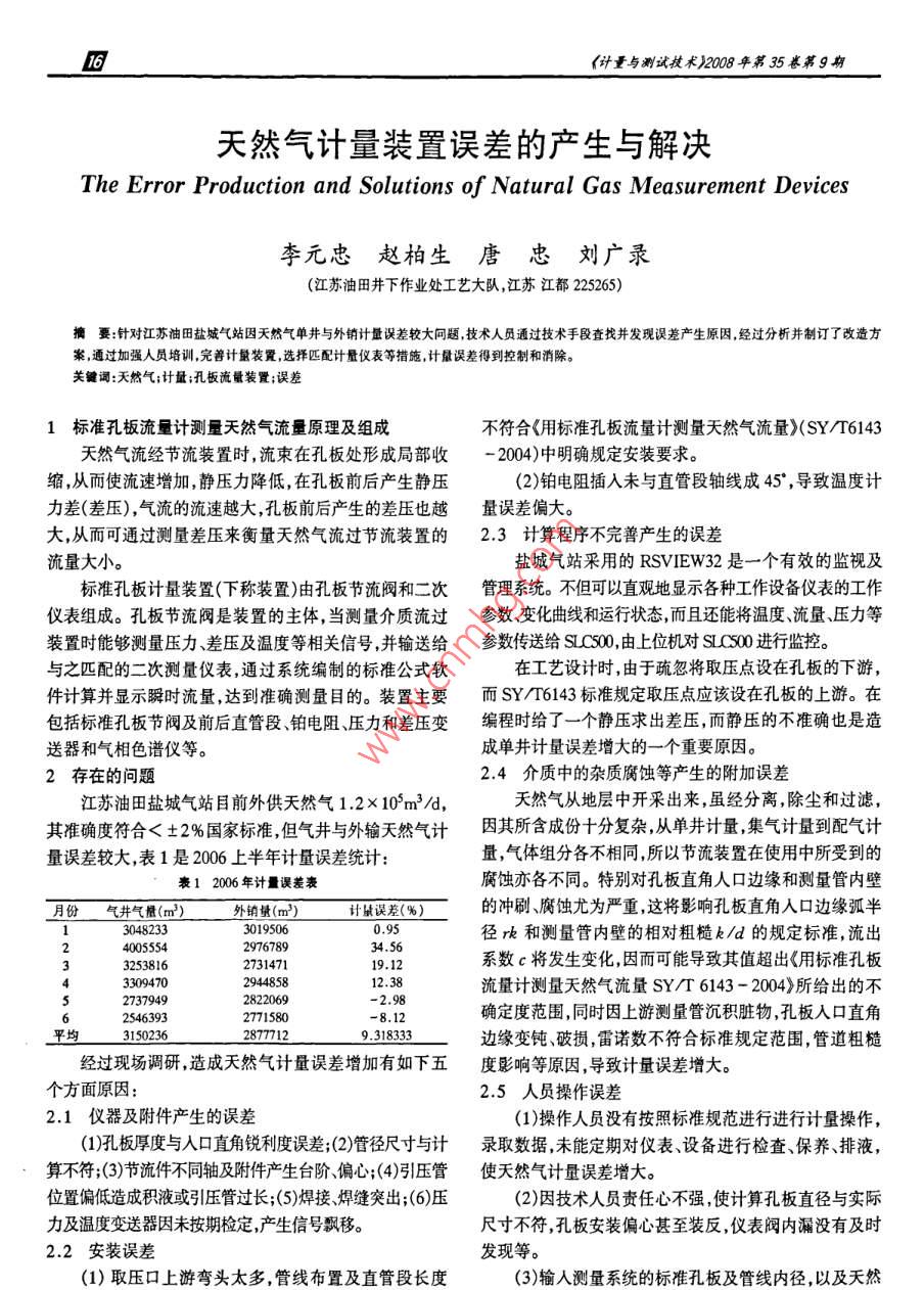 《計量與測試技術(shù))2008年第35卷第9期天然氣計量裝置誤差的產(chǎn)生與解決The Error Production and Solutions of Natural Gas Measurement Devices李元忠趙柏生唐忠劉廣錄(江蘇油田井下作業(yè)處工藝大隊,江蘇江都225265)摘要:針對江蘇油田鹽城氣站因天然氣單井與外銷計量誤差較大問題,技術(shù)人員通過技術(shù)手段查找并發(fā)現(xiàn)誤差產(chǎn)生原因,經(jīng)過分析并制訂了改造方案,通過加強人員培訓(xùn),完善計量裝置,選擇匹配計量儀表等措施,計量誤差得到控制和消除。關(guān)鍵詞:天然氣;計量;孔板流量裝置;誤差1標(biāo)準(zhǔn)孔板流 量計測量天然氣流量原理及組成不符合《用標(biāo)準(zhǔn)孔板流量計測量天然氣流量>(SY/T6143天然氣流經(jīng)節(jié)流裝置時,流束在孔板處形成局部收- 2004)中明確規(guī)定安裝要求??s,從而使流速增加,靜壓力降低,在孔板前后產(chǎn)生靜壓(2)鉑電阻插入未與直管段軸線成45* ,導(dǎo)致溫度計力差(差壓),氣流的流速越大,孔板前后產(chǎn)生的差壓也越量誤差偏大。大,從而可通過測量差壓來衡量天然氣流過節(jié)流裝置的2.3計算程序不完善 產(chǎn)生的誤差流量大小。鹽城氣站采用的RSVIEW32是一個有效的監(jiān)視及標(biāo)準(zhǔn)孔板計量裝置(下稱裝置)由孔板節(jié)流閥和二次管理系統(tǒng)。不但可以直觀地顯示各種工作設(shè)備儀表的工作儀表組成??装骞?jié)流閥是裝置的主體,當(dāng)測量介質(zhì)流過參數(shù)變化曲線和運行狀態(tài),而且還能將溫度流量、壓力等裝置時能夠測量壓力、差壓及溫度等相關(guān)信號,并輸送給參數(shù)傳送給SLC500,由上位機對SLC500進行監(jiān)控。與之匹配的二次測量儀表,通過系統(tǒng)編制的標(biāo)準(zhǔn)公式軟在工藝設(shè)計時,由于疏忽將取壓點設(shè)在孔板的下游,件計算并顯示瞬時流量,達到準(zhǔn)確測量目的。裝置主要而SY/T6143標(biāo)準(zhǔn)規(guī)定取壓點應(yīng)該設(shè)在孔板的上游。在包括標(biāo)準(zhǔn)孔板節(jié)閥及前后直管段、鉑電阻、壓力和差壓變編程時給了一個靜壓求出差壓,而靜壓的不準(zhǔn)確也是造送器和氣相色譜儀等。成單井計量誤差增大的一個重要原因。2存 在的問題2.4介質(zhì)中的雜質(zhì)腐蝕等產(chǎn)生的附加誤差江蘇油田鹽城氣站目前外供天然氣1.2x 10°m3/d, .天然氣從地層中開采出來,雖經(jīng)分離,除塵和過濾,其準(zhǔn)確度符合< +2%國家標(biāo)準(zhǔn),但氣井與外輸天然氣計因其所含成份十分復(fù)雜,從單井計量,集氣計量到配氣計量誤差較大,表1是2006上半年計量誤差統(tǒng)計:量,氣體組分各不相同,所以節(jié)流裝置在使用中所受到的1 2006年計量誤差表腐蝕亦各不同。特別對孔板直角人口邊緣和測量管內(nèi)壁月份氣井氣量(m) 外銷量(m)計量誤差(%)二的沖刷、腐蝕尤為嚴(yán)重,這將影響孔板直角人口邊緣弧半130482333019506徑rk和測量管內(nèi)壁的相對粗糙k/d的規(guī)定標(biāo)準(zhǔn),流出4005554 .297678934.563253816273147119.12系數(shù)c將發(fā)生變化,因而可能導(dǎo)致其值超出《用標(biāo)準(zhǔn)孔板3309470294485812.38流量計測量天然氣流量SY/T 6143 - 2004》所給出的不27379492822069-2.9825463932771580-8.12確定度范圍,同時因上游測量管沉積臟物,孔板入口直角平均315023628777129.318333 .邊緣變鈍破損,雷諾數(shù)不符合標(biāo)準(zhǔn)規(guī)定范圍,管道粗糙經(jīng)過現(xiàn)場調(diào)研,造成天然氣計量誤差增加有如下五度影響等原因,導(dǎo)致計量誤差增大。個方面原因:2.5 人員操作誤差2.1 儀器及附件產(chǎn)生的誤差(1)操作人員沒有按照標(biāo)準(zhǔn)規(guī)范進行進行計量操作,(1)孔板厚度與人口直角銳利度誤差;(2)管徑尺寸與計錄取數(shù)據(jù),未能定期對儀表設(shè)備進行檢查、保養(yǎng)、排液,算不符;(3)節(jié)流件不同軸及附件產(chǎn)生臺階、偏心;(4)引壓管使天然氣計量誤差增大。位置偏低造成積液或引壓管過長;(5)焊接、焊縫突出;(6)壓(2)因技術(shù)人員責(zé)任心不強,使計算孔板直徑與實際力及溫度變送器因未按期檢定,產(chǎn)生信號飄移。尺寸不符,孔板安裝偏心甚至裝反,儀表閥內(nèi)漏沒有及時2.2安裝誤差 .發(fā)現(xiàn)等。(1)取壓口上游彎頭太多,管線布置及直管段長度(3)輸人測量系統(tǒng)的標(biāo)準(zhǔn)孔板及管線內(nèi)徑,以及天然李元忠等:天然氣計量裝置誤差的產(chǎn)生與解決叼氣組份參數(shù)不正確導(dǎo)致的計量誤差。若發(fā)現(xiàn)肉眼可見的劃痕、沖蝕和撞擦傷等缺陷,建議3誤差解決的途徑更換新孔板。假如暫時無新孔板更換,應(yīng)對原孔板開孔3.1加強管理,提高人員素質(zhì)直角人口邊緣采用鑄模法或鉛箔壓印法或測量儀進行實(1)根據(jù)誤差產(chǎn)生的原因,在儀表、設(shè)備的選擇、設(shè)測,符合《用標(biāo)準(zhǔn)孔板流量計測量天然氣流量》中孔板的計、安裝、使用及計算必須嚴(yán)格執(zhí)行標(biāo)準(zhǔn)規(guī)范,使計量裝結(jié)構(gòu)形式和技術(shù)要求中規(guī)定的,不必修正。當(dāng)rK/d>置符合工藝技術(shù)要求。0.0004時,應(yīng)對原流出系數(shù)C進行修正,修正系數(shù)bK(2)完善管理制度,加強人員培訓(xùn),提高人員技術(shù)素按表2查取。質(zhì)。同時應(yīng)強化SY/T6143 - 2004標(biāo)準(zhǔn)的宣貫力度。當(dāng)bK不等于1時,應(yīng)對流出系數(s