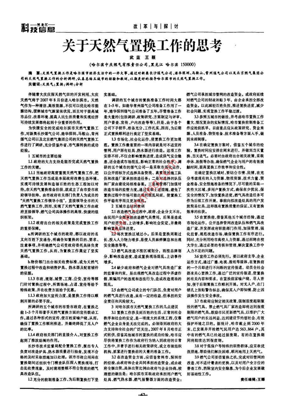 科技信息改|革|與|探|討關(guān)于天然氣置換工作的思考武藍王穎(哈爾濱中慶燃氣有限責任公司,黑龍江哈爾濱10000)摘戛:天然氣置換工作是哈爾濱市經(jīng)濟生活中的一 件大事,通過對新奧長沙煤氣公司、港華深圳、馬鞍山、常州謀氣公司以廈北京燃氣集團公司的天然氣置換工作的分析調(diào)研,認真總蛄五城市的經(jīng)驗和教訓,以期更好的指導哈爾濱市的天然氣置操工作。關(guān)鍵詞:天然氣;置換;調(diào)研;分析伴隨著大慶慶深天然氣田的開發(fā)利用,大慶實基礎(chǔ)。燃氣公司承擔城市管阿的改造資金。或政府延續(xù)天然氣將于2007年8月份進入哈爾濱市。天然調(diào)研的五個城市的置換準備工作時間大都對燃 氣公司的財政補貼3年,由企業(yè)承擔全部改氣作為-種清潔高效能源,不僅可以優(yōu)化哈市能在 1-5年,如港華常州煤氣公司準備工作用了一-造資金。 以此減輕百姓負擔,推進置換進度,減少源結(jié)構(gòu),緩解城市氣源緊張狀況,而且對于提高城年,港華深圳煤氣公司準備了 五年。盡管準備工作社會問題,實現(xiàn)置換工作 平穩(wěn)過渡。市品位改善環(huán)境、提高人民生活質(zhì)量和實現(xiàn)經(jīng)濟是大量 的(包括調(diào)研政策研究方案制定與評審、33參照五城市的做法,并考慮哈市置換工作可持續(xù)發(fā)展都將起到十分重要的作用。用戶普查、宜傳、戶內(nèi)改造等等),但是,由于各個量大、情況復雜的實際情況,哈市置換前期準備工為快捷安全的完成哈爾濱市天然氣置換工公司下手較早 ,準備充分,工作扎實,因而,為后期作應(yīng)搶前抓早, 目前重點應(yīng)從政策研究、資金來作,對新奧長沙煤氣公司、港華深圳、馬鞍山、常州正式置換順利進行奠定 了堅實基礎(chǔ)。源、人員準備、物資準備、技術(shù)準備等方面人手,做煤氣公司以及北京燃氣集團公司的天然氣置換工13市場化、社會化運作,使置換工作更加規(guī)到未雨網(wǎng)繆。作進行了調(diào)研,充分借鑒外省、市氣源轉(zhuǎn)換的成功范。 置換工作最重要的-項內(nèi)容就是對不適宜的3.4在確定置換方案時,借鑒五個城市的經(jīng)經(jīng)驗。管網(wǎng)、用戶原有灶具熱水器進行改造。這項工作驗, 置換時間應(yīng)安排在周末進行,并做到當天置1五城市的主要經(jīng)驗安排不好,不僅會影響置換進度造成供氣安全隱換、當天送氣。 必要時由政府出臺相關(guān)政策,采取11政府的大力支持是能否完成天然氣置換患,還會造 成市場混亂,影響正常的社會秩序。調(diào)串休、放假等辦法,確保燃氣企業(yè) 與用戶的有效接工作的關(guān)鍵。研的五個城市的煤氣公司一是采取市場化運作,觸時間,提高置換 工作效率和安全性。11當?shù)卣叨戎匾曁烊粴庵脫Q工作,把以公開招標方式選擇具備資質(zhì)、 高素質(zhì)的施工隊在確定置換區(qū)域時,要結(jié)合市情、民情,在充天然氣置換工作當成是本屆政府改善生態(tài)環(huán)境、伍和改造廠家承擔改造任務(wù): 二是對選擇的隊伍分考 慮現(xiàn)有的人力資源、物質(zhì)資源、技術(shù)力量、資實現(xiàn)可持續(xù)發(fā)展和造福百姓的生態(tài)工程加以對和廠 家由建設(shè)局核準備案。三是城管部門加強對金準備 安全措施準備的情況下,盡可能的采取-待。在天然氣置換準備階段,就成立了由市委市政改造 市場的監(jiān)管力度。通過采取上述措施,避免了次性大區(qū)域 、多用戶置換方式,確保在少擾民、保府領(lǐng)導掛帥、由市政府有關(guān)部門負責人為成員的置換過程中市場可 能出現(xiàn)的混亂局面,使置換工安全的情況下 ,加快置換進度。燃氣具改造任務(wù)可“天然氣置換工作領(lǐng)導小組",直接領(lǐng)導全市的天作平穩(wěn)有序 而且更加規(guī)范。作為后續(xù)工作開展,事前向擬改造灶具的用戶發(fā)然氣置換工作,因而,實現(xiàn)了天然氣置換工作由政2五城市總結(jié)的教訓放簡易灶具,這樣既有置換質(zhì)量的保證,又有置換府直接領(lǐng)導燃氣公司具體操作的高效、快捷的組21改造燃氣具過程中,政府、企業(yè)分文不出,效率的收獲??椏蚣?。由民用戶全部承擔改造燃氣具費用,后果是造成35在置換前,借鑒其他五個城市經(jīng)驗,通過1.12政府出臺的相關(guān)政策是完成置換工作用戶經(jīng)濟負擔 ,上訪增多,影響社會安定,并最終市 場化運作,公開選擇管網(wǎng)改造隊伍和燃氣具改的重要保障。影響置換總體進度。造廠家,并發(fā)揮政府職能部門作用.加強管理,強a所調(diào)研的五個城市的政府,都以政府的名22每次置換區(qū)域過小。后果是置換周期過化監(jiān)督 ,規(guī)范改造市場,確保置換工作有序進行。義向百姓下發(fā)通告,明確告知置換的目的、要求、長、投人人力物力增多 、易使人員麻痹懈息和出現(xiàn)同時 ,充分利用哈市高校人力資源,通過招聘在校注意事項,并明確燃氣公司曼政府委托具體負責安全隱患等等。大學生,通過必要的考核和管理,解決置換工作中天然氣置換工作,從而,為置換工作奠定了堅實23燃氣具改造不按區(qū)域劃分,而按品牌劃人力不足的問題?;A(chǔ)。+影響改造進度,造成置換現(xiàn)場混亂、上訪事件3.6宜傳工作必須先行。要以政府主導、企業(yè)b.物價部門出臺相關(guān)收費標準,成為天然氣增多。運作方式,通過廣播電視、報紙等