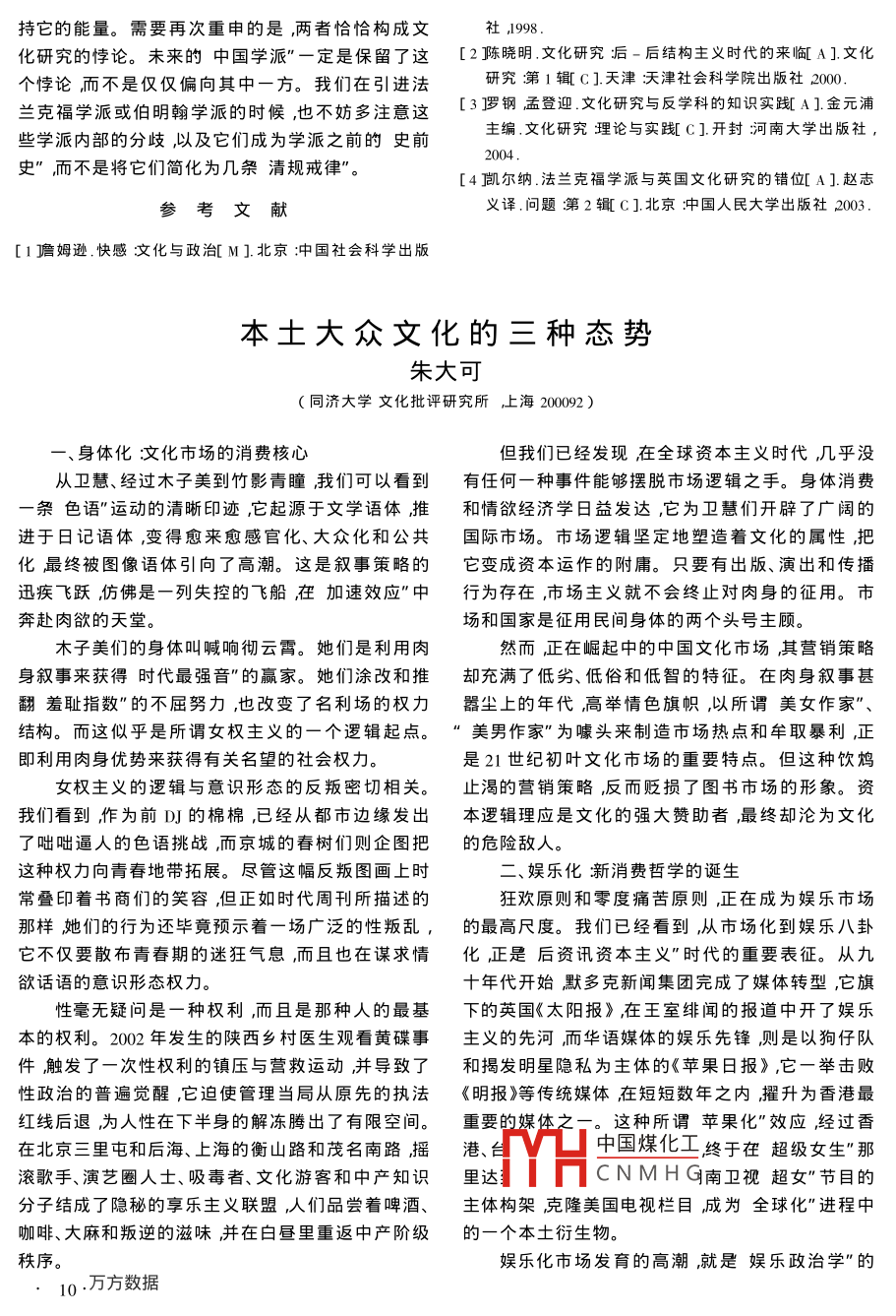 法蘭克福學(xué)派思想家們面對(duì)美國(guó)的大眾文化的情形法蘭克福學(xué)派和福柯的工作中表現(xiàn)得很充分有一點(diǎn)相像。但這一重大的知識(shí)轉(zhuǎn)型并非輕而易舉就能完在人文精神討論″以及此后一段時(shí)間里主流成。在這場(chǎng)學(xué)術(shù)轉(zhuǎn)型過程中”海歸派”學(xué)者扮演了知識(shí)界對(duì)大眾文化現(xiàn)象的觀察和評(píng)價(jià)在總體上流“學(xué)術(shù)掮客"的角色。他們從自己所在的西方大學(xué)課于粗疏和粗暴。知識(shí)成見很容易將繁復(fù)的文化現(xiàn)堂和圖書館里批發(fā)來大量的文化理論,兌上自己的象化約為道德上嚴(yán)肅_粗鄙"的分野和美學(xué)上的口水販給國(guó)內(nèi)的學(xué)院學(xué)者。這一情形跟1980年代雅俗"分野,并為知識(shí)的居高臨下價(jià)值審判提供文學(xué)和美學(xué)新理論大爆炸的情形如岀一轍。當(dāng)年依據(jù)。接下來便是表態(tài)和站隊(duì)。這些學(xué)者們暴飲暴食的文學(xué)和美學(xué)新理論尚未完全然而精英知識(shí)界不得不面對(duì)這樣的事實(shí):大眾消化好如今又來了新的文化理論大餐。依舊還是文化并不愿意在精英文化所指引的通往道德天國(guó)”那幫食客依舊還是那樣暴飲暴食,當(dāng)然,也依舊還的坦途上前進(jìn),相反,它們依舊沉湎于日常的欲求,是那樣消化不良在物質(zhì)化的塵埃中撒歡和歌唱。此情形下,大而無然而即使那些原裝的西方學(xué)院學(xué)者的文化理當(dāng)、似是而非的人文精神”顯得蒼白無力他們開始論也不乏空洞腫脹的貨色。上個(gè)世紀(jì)七十年代以試圖尋找相對(duì)有效應(yīng)對(duì)方案。學(xué)院人文學(xué)者們盡管來西方的人文知識(shí)分子也多半茍安于學(xué)院空間內(nèi)表面上依然擺岀一副誓死捍衛(wèi)精英傳統(tǒng)的莊重表過著養(yǎng)尊處優(yōu)的生活。盡管他們依然還在不斷地翻情暗地里卻與大眾文化市場(chǎng)眉來眼去在半推半就新他們的知識(shí)倉(cāng)庫(kù)制造新的理論但文化的原創(chuàng)性的擁抱中,試圖將大眾文化納入到他們的學(xué)院知識(shí)和現(xiàn)實(shí)批判精神正在嚴(yán)重退化。他們熱衷于將學(xué)院生產(chǎn)流水線當(dāng)中。學(xué)院文化學(xué)者旳這種曖昧表情,變成不斷翻新的知識(shí)生產(chǎn)工場(chǎng)″滿足于制造一套也是當(dāng)下學(xué)院知識(shí)體系尷尬處境的寫照。又一套的新產(chǎn)品"。而這些新產(chǎn)品”更多的是虛擬在今天大眾文化能夠成為知識(shí)生產(chǎn)的對(duì)象,這性的批判性并因缺乏與現(xiàn)實(shí)的短兵相接的搏擊而點(diǎn)已經(jīng)不成為問題。接踵而來的問題是,對(duì)于大在實(shí)踐的意義上喪失了批判的生命力。不可避免地眾文化的關(guān)照究竟是指向知識(shí)的自我繁殖還是指等待他們的也必將是自我萎縮的命運(yùn)。顯赫一時(shí)的向日常生活的批判實(shí)踐或者說這些生活現(xiàn)象究竟“伯明翰學(xué)派"的倒掉就是明證。是一種學(xué)術(shù)研究的材料還是一種文化批判的對(duì)象文化研究"試圖將大眾文化現(xiàn)象納入到陳舊的在這些問題上國(guó)內(nèi)學(xué)術(shù)界存在著明顯的分歧。學(xué)院知識(shí)生產(chǎn)體系當(dāng)中,成為其知識(shí)體系的生產(chǎn)資我在上文中反復(fù)使用文化研究或文化批評(píng)"這料。并且他們往往沿襲其文學(xué)研究的陳規(guī)把文化樣的表達(dá)這表明在我看來這兩個(gè)概念近乎可以等看成是一種靜態(tài)的知識(shí)生產(chǎn),可以在封閉的學(xué)術(shù)實(shí)同或者可以替換使用。然而問題依然沒有解決。驗(yàn)室"里進(jìn)行研究和闡釋。文化批評(píng)則將文化看做既然等同,為什么又要使用兩個(gè)不同的概念。問題是動(dòng)態(tài)的現(xiàn)實(shí)生活是當(dāng)下的、具體的生活實(shí)踐。文的復(fù)雜性乃是因?yàn)檫@一學(xué)科的中西差異所導(dǎo)致的?;u(píng)隨時(shí)關(guān)注當(dāng)下生活,并及時(shí)地對(duì)現(xiàn)實(shí)的文化在當(dāng)代西方人文學(xué)術(shù)領(lǐng)域內(nèi),文化研究在某種程度事件做岀有效的批判性的響應(yīng)。它并非為了學(xué)術(shù)生上就是文化批評(píng)。20世紀(jì)以來的人文學(xué)術(shù)的重要變產(chǎn)的需要而將生活現(xiàn)象處理為靜止的和可供解剖的革即是試圖建立批判性的知識(shí)體系,或者說把現(xiàn)對(duì)象而是要通過現(xiàn)場(chǎng)的話語(yǔ)批判來糾正日常的文代知識(shí)生產(chǎn)作為文化批判的話語(yǔ)實(shí)踐。這一點(diǎn)在化精神的缺損并保持文化本身的創(chuàng)造性活力。文化研究的中國(guó)問題王曉漁同濟(jì)大學(xué)文化批評(píng)研究所上海200092)2002年6月英國(guó)伯明翰大學(xué)關(guān)閉了文化研究與派而中國(guó)煤化工艾時(shí),它在歐洲的重在國(guó)際學(xué)界引起了不小的震動(dòng)因?yàn)樵撓档那盎浖匆奀NMH使我們反思伯明翰學(xué)被視為文化研究重鎮(zhèn)的當(dāng)代文化研究中心( Center for派也促使我們反思以下這些中國(guó)問題″文化研究Contemporary Cultural Studies簡(jiǎn)稱cCS)以伯明翰學(xué)如何面對(duì)自身的悖論?它有沒有可能既獲得學(xué)院體制內(nèi)的生存空間,又不喪類后學(xué)科″或反學(xué)科”