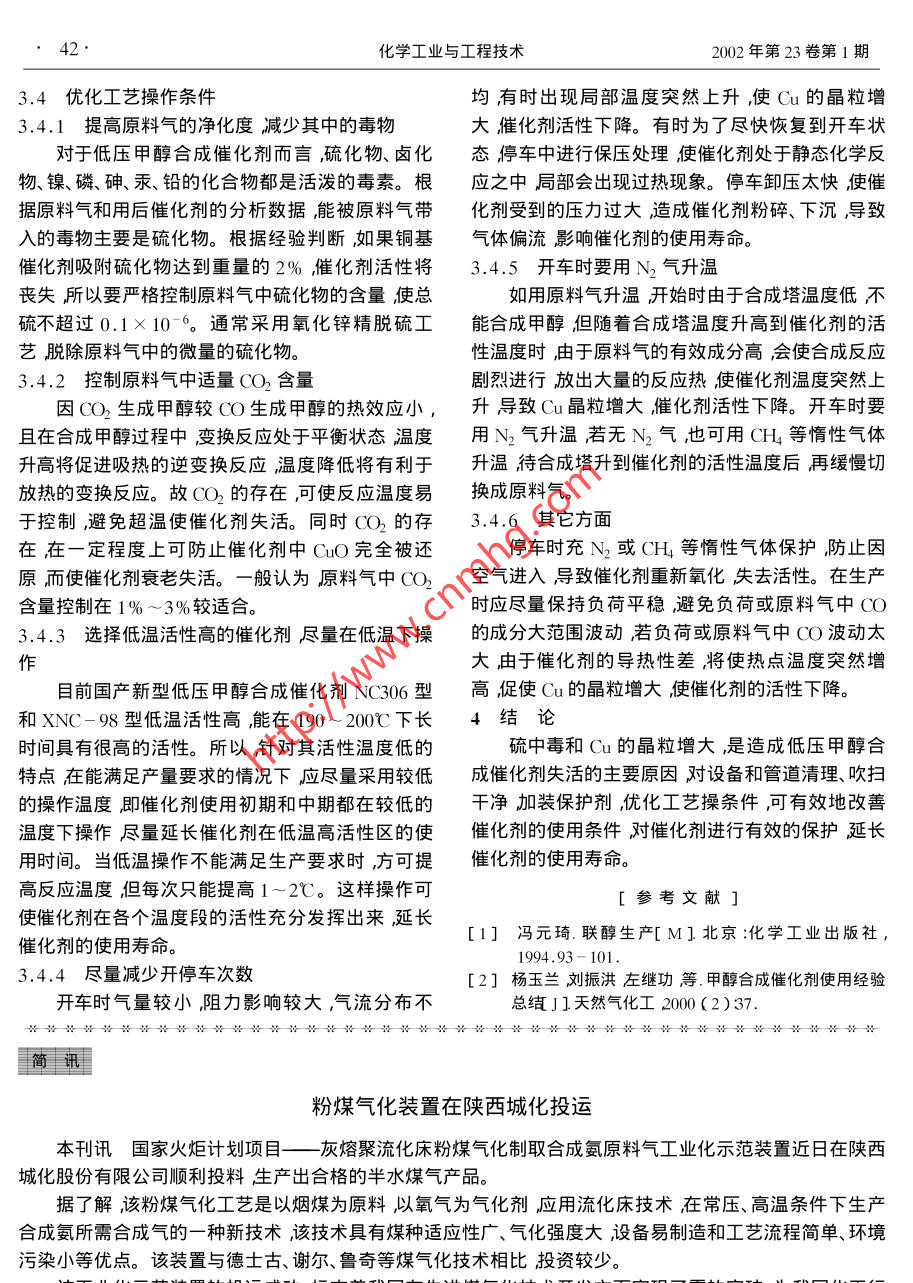 化學(xué)工業(yè)與工程技術(shù)2002年第23卷第1期3.4優(yōu)化工藝操作條件均,有時出現(xiàn)局部溫度突然上升,使Cu的晶粒增3.4.1提高原料氣的凈化度 減少其中的毒物大催化劑活性下降。有時為了盡快恢復(fù)到開車狀對于低壓甲醇合成催化劑而言,硫化物、鹵化態(tài)停車中進行保壓處理使催化劑處于靜態(tài)化學(xué)反物、鎳、磷、砷、汞、鉛的化合物都是活潑的毒素。根應(yīng)之中局部會出現(xiàn)過熱現(xiàn)象。停車卸壓太快使催據(jù)原料氣和用后催化劑的分析數(shù)據(jù)能被原料氣帶化劑受到的壓力過大造成催化劑粉碎、下沉導(dǎo)致入的毒物主要是硫化物。根據(jù)經(jīng)驗判斷,如果銅基氣體偏流影響催化劑的使用壽命。催化劑吸附硫化物達(dá)到重量的2%催化劑活性將3.4.5 開車時要用 N2氣升溫喪失所以要嚴(yán)格控制原料氣中硫化物的含量使總?cè)缬迷蠚馍郎?,開始時由于合成塔溫度低不硫不超過0.1x 10-6。通常采用氧化鋅精脫硫工能合成甲醇,但隨著合成塔溫度升高到催化劑的活藝脫除原料氣中的微量的硫化物。性溫度時,由于原料氣的有效成分高會使合成反應(yīng)3.4.2控制原料氣中適量CO2 含量劇烈進行放出大量的反應(yīng)熱使催化劑溫度突然上因CO2生成甲醇較CO生成甲醇的熱效應(yīng)小,升導(dǎo)致Cu晶粒增大催化劑活性下降。開車時要.且在合成甲醇過程中變換反應(yīng)處于平衡狀態(tài)溫度用N2氣升溫若無N2氣,也可用CH4等惰性氣體升高將促進吸熱的逆變換反應(yīng)溫度降低將有利于升溫待合成塔升到催化劑的活性溫度后再緩慢切放熱的變換反應(yīng)。故CO2的存在,可使反應(yīng)溫度易換成原料氣。于控制,避免超溫使催化劑失活。同時CO2的存3.4.6其它方面在,在一定程度上可防止催化劑中CuO完全被還停車時充N2或CH4等惰性氣體保護,防止因原,而使催化劑衰老失活。一般認(rèn)為 原料氣中CO2空氣進入導(dǎo)致催化劑重新氧化失去活性。在生產(chǎn)含量控制在1% ~ 3%較適合。時應(yīng)盡量保持負(fù)荷平穩(wěn),避免負(fù)荷或原料氣中CO3.4.3選擇低溫活性高的催化劑 盡量在低溫下操的成分大范圍波動若負(fù)荷或原料氣中CO波動太作大,由于催化劑的導(dǎo)熱性差將使熱點溫度突然增目前國產(chǎn)新型低壓甲醇合成催化劑NC306型高,促使Cu的晶粒增大使催化劑的活性下降。和XNC- 98型低溫活性高,能在190 ~ 200C下長4結(jié)論時間具有很高的活性。所以,針對其活性溫度低的硫中毒和Cu的晶粒增大,是造成低壓甲醇合特點在能滿足產(chǎn)量要求的情況下應(yīng)盡量采用較低成催化劑失活的主要原因?qū)υO(shè)備和管道清理、吹掃的操作溫度即催化劑使用初期和中期都在較低的干凈加裝保護劑優(yōu)化工藝操條件,可有效地改善溫度下操作盡量延長催化劑在低溫高活性區(qū)的使催化劑的使用條件對催化劑進行有效的保護延長用時間。當(dāng)?shù)蜏夭僮鞑荒軡M足生產(chǎn)要求時方可提催化劑的使用壽命。高反應(yīng)溫度,但每次只能提高1~2C。這樣操作可[參考文獻(xiàn)]使催化劑在各個溫度段的活性充分發(fā)揮出來,延長[1]馮元琦.聯(lián)醇生產(chǎn)[M]北京:化學(xué)工業(yè)出版社,1994.93- 101.3.4.4盡量 減少開停車次數(shù)[2]楊玉蘭劉振洪左繼功等.甲醇合成催化劑使用經(jīng)驗開車時氣量較小,阻力影響較大,氣流分布不總結(jié)J]天然氣化工2000(2)37.簡訊粉煤氣化裝置在陜西城化投運本刊訊國家火炬計劃項目一灰熔聚流化床粉煤 氣化制取合成氨原料氣工業(yè)化示范裝置近日在陜西城化股份有限公司順利投料生產(chǎn)出合格的半水煤氣產(chǎn)品。據(jù)了解,該粉煤氣化工藝是以煙煤為原料以氧氣為氣化劑應(yīng)用流化床技術(shù)在常壓、高溫條件下生產(chǎn)合成氨所需合成氣的一種新技術(shù),該技術(shù)具有煤種適應(yīng)性廣、氣化強度大設(shè)備易制造和工藝流程簡單、環(huán)境污染小等優(yōu)點。該裝置與德士古、謝爾、魯奇等煤氣化技術(shù)相比投資較少。該工業(yè)化示范裝置的投運成功標(biāo)志著我國在先進煤氣化技術(shù)開發(fā)方面實現(xiàn)了零的突破,為我國化工行業(yè)節(jié)能降耗、降低成本、環(huán)境保護開辟了新的途徑。