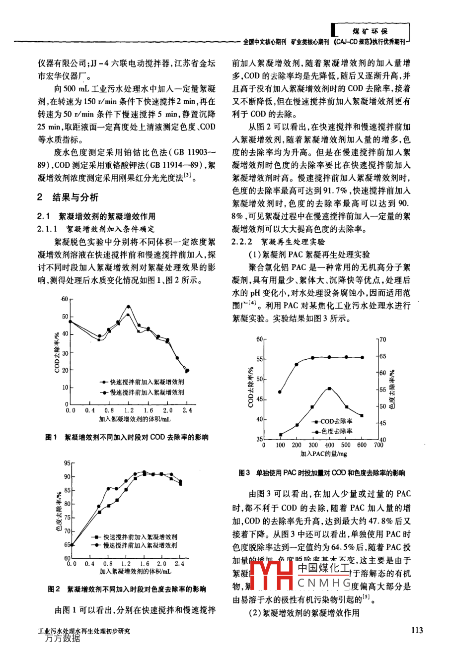 煤礦環(huán)保工業(yè)污水處理水再生處理初步研究吳朝陽,王光華,李文兵,郭勝,陳坤(武漢科技大學化學工程與技術學院,湖北武漢430081)摘要:通過在聚合氯化鋁絮凝處理焦化工業(yè)污水處理水的過程中引入一種精細化學品作絮凝增效劑,對焦化工業(yè)污水處理水進行再生處理。實驗表明,絮凝過程中加入絮凝增效劑能大大提高焦化工業(yè)污水處理水色度和COD去除率;單獨使用聚合氯化鋁絮凝時,色度去除率為64. 3% ,C0D去除率為47.3% ,引入絮凝增效劑后,色度去除率可以提高到90% ,COD去除率可以提高到55.7% ,使焦化工業(yè)污水處理水的COD由200 mg/L降低到88 mg/L, 色度由600度降低到55度。關鍵詞:工業(yè)污水;絮凝;絮凝增效劑;再生處理中圖分類號:X703文獻標識碼:A文章編號:1006-6772(2010)03-0112-04工業(yè)污水處理. -般采用生化處理+物化處理國內(nèi)外的工業(yè)污水再生處理工藝包括生化處的工藝,部分出水水質(zhì)能達到國家相應排入地面水理、絮凝沉降、活性炭深度處理、電解法、膜分離法體的排放標準,但工業(yè)污水經(jīng)二級處理后出水的和濕式催化氧化法等。其中生化處理和絮凝沉降COD和色度仍達不到再生水工業(yè)用水水質(zhì)標準。處理后的出水色度都偏高,而活性炭深度處理、電表1列出中國5大行業(yè)工業(yè)污水處理水出水水質(zhì)以解法膜分離法和濕式催化氧化法則成本太高[2),及再生水回用工業(yè)用水水質(zhì)標準,可見大部分行業(yè)在實際工業(yè)應用中受到極大制約。工業(yè)污水處理水未達到國家再生水回用工業(yè)用水通過在聚合氯化鋁絮凝處理工業(yè)污水處理水水質(zhì)標準要求。的過程中引入一種絮凝增效劑,對焦化工業(yè)污水處隨著中國對企業(yè)再生水利用的重視以及發(fā)展理水進行再生處理,該方法已申請發(fā)明專利(申請循環(huán)經(jīng)濟,實現(xiàn)零排放的要求,工業(yè)污水再生處理號:200910063253.2)。實驗研究了絮凝增效劑對聚的研究對實現(xiàn)水生態(tài)的良性循環(huán)和提高水的循環(huán)合氯化鋁絮凝處理工業(yè)污水處理水色度和COD去利用率有重大意義川。除的增效作用。表1中國不同行業(yè) 工業(yè)污水處理水水質(zhì)及國家再生1實驗部分水回用工業(yè)用水水質(zhì)標準不同行業(yè)工業(yè)污水處理水國家再生水1.1主要實驗材料主要水質(zhì)指標回用工業(yè)用聚合氯化鋁( PAC),河南鞏義;絮凝增效劑,分焦化印染煉油造紙啤酒水水質(zhì)標準 *析純上海源聚生物科技有限公司。COD00~ 140- 100- 150 ~0~實驗用工業(yè)污水處理水水樣取自某焦化廠焦化廢(mg.L~) 200 200 150 250 120水生化處理后二沉池出水,COD。為150 ~200 mg/L,色色度/度500- 600- 300~ 600- 300-30900 1000 600 1100 500度為600度左右。*城市污水再生利用工業(yè)用水水質(zhì)( GB/T 1923- 2005);再生1.2主要 儀器及實驗分析方法水水質(zhì)標準(SL 368- -2006)中國煤化工1東高密彩虹分析MHCNMHG收稿日期:2010-03 -19作者簡介:吳朝陽(984 -),男,湖北黃岡人,碩士研究生,師以王光華教授,主要研究方向為工業(yè)廢水處理技術,Emil:youngwzv@63. com112《潔凈煤技術>2010年第16卷第3期煤礦環(huán)保全國中文核心期刊礦業(yè)類核心期刊(CAJ-CD 規(guī)苑)執(zhí)行優(yōu)秀期刊一儀器有限公司;J] -4六聯(lián)電動攪拌器,江蘇省金壇前加人絮凝增效劑,隨著絮凝增效劑的加入量增市宏華儀器廠。多,COD的去除率均是先降低,隨后又逐漸升高,并向500 mL工業(yè)污水處理水中加入一定量絮凝且高于沒有加入絮凝增效劑時的COD去除率,接著劑,在轉(zhuǎn)速為150 r/min條件下快速攪拌2 min,再在又不斷降低,但在慢速攪拌前加人絮凝增效劑更有轉(zhuǎn)速為50r/min條件下慢速攪拌5min,靜置沉降利于COD的去除。25min,取距液面--定高度處上清液測定色度、COD從圖2可以看出,在快速攪拌和慢速攪拌前加等水質(zhì)指標。人絮凝增效劑,隨著絮凝增效劑加入量的增多,色廢水色度測定采用鉑鈷比色法( GB 11903~度的去除率均為升高。但是在慢速攪拌前加人絮89) ,COD測定采用重鉻酸鉀法( GB 11914- -89),絮.凝增效劑時色度的去除率要比在快速攪拌前加人凝增效劑濃度測定采用剛果紅分光光度法”]。絮凝增效劑時高。慢速攪拌前加人絮凝增效劑時,色度的去除率最高可達到91. 7% ,快速攪拌前加入2結(jié)果與分析絮凝增效劑時,色度的去除率最高可以達到90.2.1 絮凝增效劑的絮凝增效作用.8% ,可見絮凝過程中在慢速攪拌前加入- -定量的絮2.1.1絮凝增效劑加入條件確定凝增效劑可以大大提高色度的去除率。絮凝脫色實驗中分別將不同體積一定濃度絮2.2.2絮凝再生處理 實驗凝增效劑溶液在快速攪拌前和慢速攪拌前加入,探(1)絮凝劑PAC絮凝再生處理實驗討不同時段加人絮凝增效劑對絮凝處理效果的影聚合氯化鋁PAC是一種常用的無機高分子絮響,測得處理后水質(zhì)變化情況如圖1、圖2所示。凝劑,具有用量少、絮體大、沉降快等優(yōu)點,處理后水的pH變化小,對水處理設備腐蝕小,因而適用范60-圍廣[4。利用PAC對某焦化工業(yè)污水處理水進行50絮凝實驗。實驗結(jié)果如圖3所示。史40-703055-65。-60號甘快速攪拌前加入絮凝增效劑50-1055會◆慢速攪拌前加入絮凝增效劑型B 45450電0.0 0.4 0.8 1.2 1.6 2.0 2.4加入絮凝增效劑的體積/mL甘COD去除率45◆色度去除率圖1絮凝增效劑不同加入時段對COD去除率的影響00200300400500