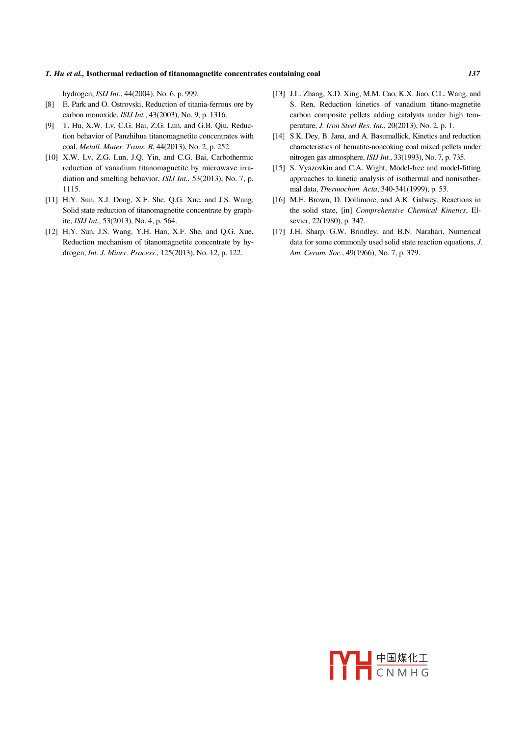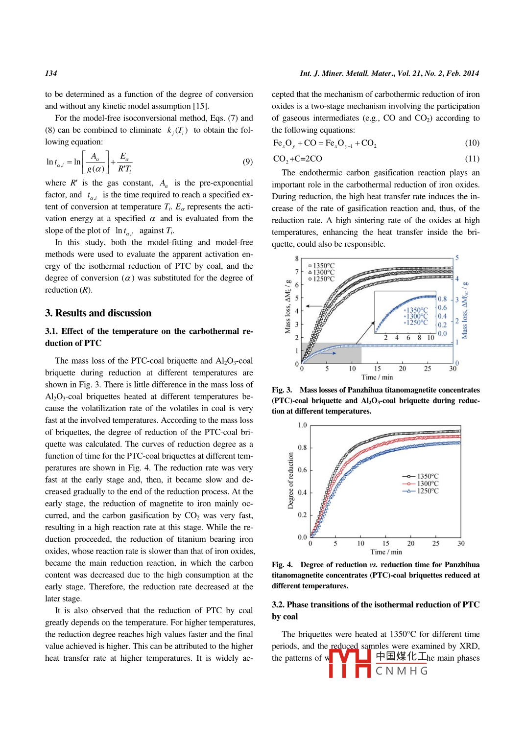 International Journal of Minerals, Metallurgy and MaterialsVolume 21, Number 2, February 2014, Page 131Do:10.1007/s12613-014-0875-zIsothermal reduction of titanomagnetite concentrates containing coalTu Hu.2, Xue-wei Lil, Chen-guang Bai", and Gui-bao Qiu"1)College of Materials Science and Engineering, Chongqing University, Chongqing 400044, China2)Faculty of Metallurgical and Energy Engineering, Kunming University of Science and Technology, Kunming 650093, China(Received: 9 September 2013: revised: 29 October 2013: accepted: 3 November 2013)Abstract: The isothermal reduction of the Panzhihua titanomagnetite concentrates(Prc) briquette containing coal under argon atmospherewas investigated by thermogravimetry in an electric resistance furnace within the temperature range of 1250-1350.C. The samples reduced iargon at 1350C for different time were examined by X-ray diffraction(XRD) analysis. Model-fitting and model-free methods were used toevaluate the apparent activation energy of the reduction reaction. It is found that the reduction rate is very fast at the early stage, and then, at alater stage, the reduction rate becomes slow and decreases gradually to the end of the reduction. It is also observed that the reduction of PTCby coal depends greatly on the temperature. At high temperatures, the reduction degree reaches high values faster and the final valueachieved is higher than at low temperatures. The final phase composition of the reduced PTC-coal briquette consists in iron arof about 68 kJ-mol'and by three-dimensional diffusion for reduction degree greater than 0.7 5 withe d wustite(FeO)are intermediaterous-pseudobrookite(FeTi2O ), while Fe275Ti02504, Fe2sTiosO4, Fe2.25Ti07504, ilmenite(FeTiO3)anproducts. The reaction rate is controlled by the phase boundary reaction for reduction degree less than 0. 2 with an apparent activation energy134 kJ mol. For the reduction degree in the range of 0. 2-0.75, the reaction rate is under mixed control, and the activation energy increaseswith the increase of the reduction degreeKeywords: titanomagnetite; carbothermal reduction; thermogravimetric analysis; kineticsThe direct reduction of Panzhihua titanomagnetite con1 Introductionentrates(PtC) by solid reductants has been widely studiedfor many decades [1-6]. It was found that the reduction ofVanadium-titanium-bearing magnetite of Panzhihua, titanomagnetite was slower than that of magnetite due to theChina, is a complex iron ore composed by the coexistence different crystal structures and the presence of titarof vanadium and titanium that accounts for more than 90% sulting in a higher thermodynamic stability of titanomagnetof the titanium reserves in China. Most of the titanomagnet- ite [7-13]. Here, the kinetics of the carbothermal reductionte concentrates are now used as the main materials for the of PtC was studied by using thermogravimetry. During theblast furnace process in Panzhihua area. Most of the iron heating process of the composite briquette of PTc and coaland, partly, vanadium can be reduced into the hot metal; the mass loss is caused by the release of volatiles from coalhowever, almost all of the titanium remains in the slag, carbon loss, and removal of oxygen by reduction. Aforming a high-titanium slag with contents of TiO2 varying pseudo-kinetic parameter, fraction of reaction () has beenfrom 22wt% to 25wt %. There is no an appropriate and used to measure the reaction rate. It has been observed thateconomic method to deal with such slag [l] so far. Recently, the estimation of the pseudo-kinetic parameter ( is notmost of the studies focused on developing an alternative identical to that of the degree of reduction and can only pro-route to use the titanomagnetite concentrates highlighting vide a rough estimate of the extent and characteristics of thethe rotary hearth furnace(RHF)process, which involves the reduction [141reduction of composite briquette of titanomagnetite concenIn the present work, the isothermal reduction of Prc bytrates with coal, and the smelting of the reduced sample in coal was investigated by thermogravimetry, and the reducan electric arc furnacetion degree was used to analyze the kinetic dataorrespondingauthorTuHuE-mail:hutu1219@@126.comO University of Science and Technology Beijing and Springer-Verlag Berlin Heidelberg 2014中國煤化工 springerCNMHGIntJ. Miner. Metall. Mater., Vol. 21, No. 2, Feb. 20142. Experimentalthe Ptc was mixed homogenously with the coal with a mo-2. 1. Specimen preparation and experimental procedurees lar ratio(Cfixed/O obonded with Fe)of 1.2. Themixture was madeinto spheroid briquettes at 15 MPa with a briquette makerThe chemical compositions and size distributions of the The diameter of the briquette was about 30 mm, and theraw materials were examined and are presented in Tables tal mass of the sample was about 25 g. The other type of1-3. Fig. I shows the X-ray diffraction(XRD) pattern of briquette made of coal and alumina particles, which has thePTC. The mineral compositions were mostly titanomagnet- same amount of coal and the same geometries as the briite, magnetite, and ilmenite. Two types of specimens were quette made of PTC and coal, was made under the sameprepared. One type contained PTC and coal, and the other conditions. All the briquettes were dried at 120 C for 6hcontained alumina particles and coal. For the former type, before the reduction experiTable 1. Chemical composition of Panzhihua titanomagnetite concentrates (tC) and coalwt%oTFe Feo T1O2 V2Os SiO Cao MgO AlO3Volatile526232.0012004.201.302.603.9081.956.9510410.69Table 2. Size distribution of Panzhihua titanomagnetite concentrates (ptc<7474-8080-9696-109109-12020-150Content/wt%3.264.201.810.320.15Table 3. Size distribution of coalDiameter /um<100150-180180-250550-1700Total20.8051.3414.89.871.1argon quickly after the sample was taken out from the fnace. Two types of briquettes were heated under the same150FeTi,O.experimental conditions at each temperature. Three iden