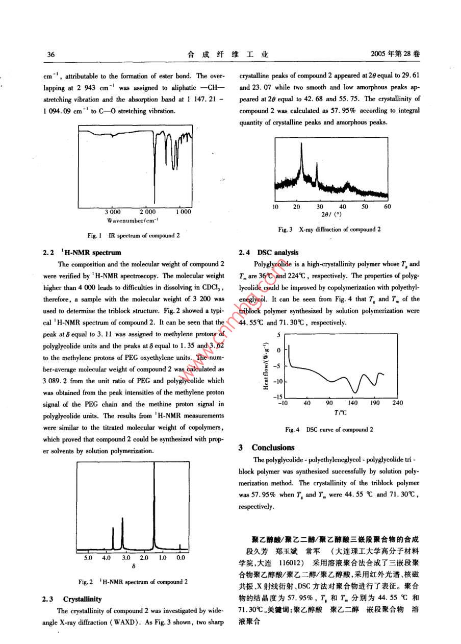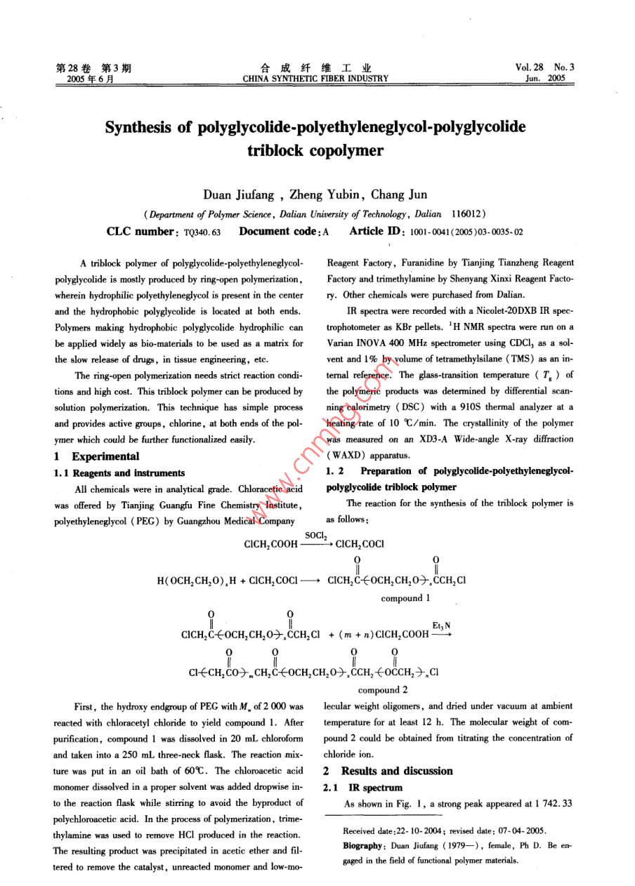 第28卷第3期合成纖維工業(yè)Vol 28 No. 32005年6月CHINA SYNTHETIC FIBER INDUSTRYSynthesis of polyglycolide- polyethyleneglycol-polyglycolidetriblock copolymerDuan Jiufang, Zheng Yubin, Chang JunDepartment of Polymer Science, Dalian University of Technology, Dalian 116012)CLC number: TQ340 63 Document code: A Article ID:1001-0041(2005)03-0035-02A triblock polymer of polyglycolide-polyethyleneglycoI- Reagent Factory, Furanidine by Tianjing Tianzheng Reagentpolyglycolide is mostly produced by ring-open polymerization, Factory and trimethylamine by Shenyang Xinxi Reagent Facto-wherein hydrophilic polyethyleneglycol is present in the center ry. Other chemicals were purchased from Dalianand the hydrophobic polyglycolide is located at both endsIR spectra were recorded with a Nicolet-20DXB IR spec-Polymers making hydrophobic polyglycolide hydrophilic canphotometer as KBr pellets. H NMR spectravent and 1% by volume of tetramethylsilane(TMs)as an in-The ring-open polymerization needs strict reaction condi- temal reference. The glass-transition temperature(T.)ofions and high cost. This triblock polymer can be produced by the polymeric products was determined by differential scan-solution polymerization. This technique has simple process ning calorimetry(DSC)with a 910s thermal analyzer at aand provides active groups, chlorine, at both ends of theheating rate of 10 C/min. The crystallinity of the polymerymer which could be further functionalized easilwas measured on an XD3-A Wide-angle X-ray diffraction1 Experimenta(WAXD)apparatus.1.1 Reagents and instruments1.2 Preparation of polyglycolide-polyethyleneglycol-All chemicals were in analytical grade. Chloracetic acid polyglycolide triblock polymerwas offered by Tianjing Guangfu Fine Chemistry Institute,The reaction for the synthesis of the triblock polymer ispolyethyleneglycol( PEG) by Guangzhou Medical Companyas folleCICH, COOHSOC\, CICH, COCIH(OCH2CH2O),H+C!CH2COCl→→CCH2C∈OCH2CH2O分,CCH2C1Et,NCICH, C-