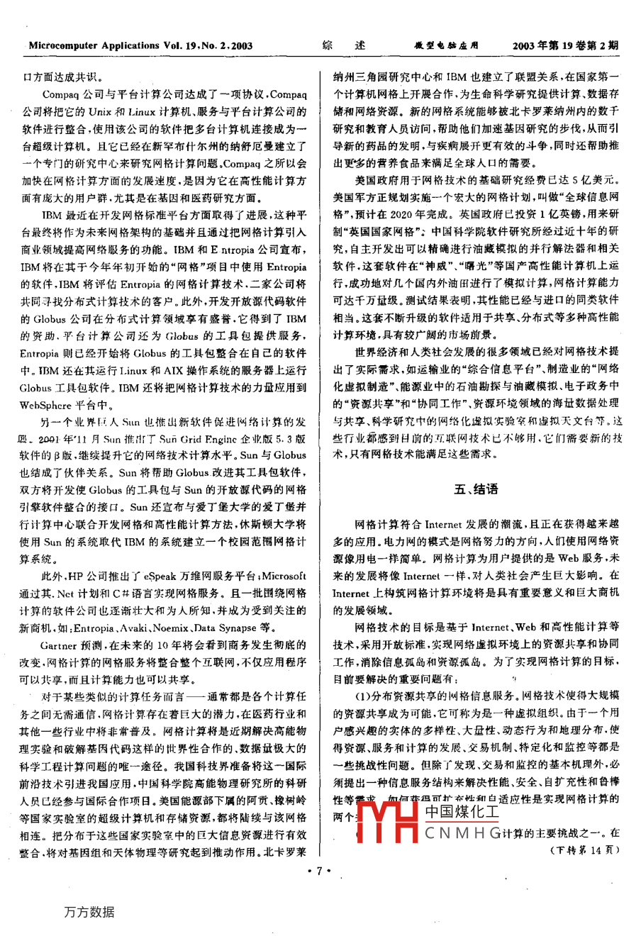 Microcomputer Appllcatlons Vol. 19, No 2, 2003綜述型電腦皮用003年第19卷第2期網(wǎng)格計(jì)算及其應(yīng)用丁永生摘要介紹了網(wǎng)格計(jì)算的一般結(jié)構(gòu)和特點(diǎn),通過(guò)分析|出現(xiàn)一個(gè)高峰推動(dòng)信息產(chǎn)業(yè)市場(chǎng)的持續(xù)高速發(fā)展,在2020幾類(lèi)典型的來(lái)統(tǒng),丁解到網(wǎng)格計(jì)算的惡想、技術(shù)和現(xiàn)狀。闌述|年產(chǎn)生一個(gè)年產(chǎn)值為20萬(wàn)億美元的大工業(yè)。2005年之前是了網(wǎng)格計(jì)算的應(yīng)用前景。最后指出了網(wǎng)樁計(jì)算必頻解決的一|網(wǎng)格浪潮正醞釀?dòng)縿?dòng)的時(shí)刻中國(guó)科技界應(yīng)積極地投入到網(wǎng)些重要問(wèn)題格研究,并爭(zhēng)取參與到以后的國(guó)際科技界中制定網(wǎng)格技術(shù)標(biāo)關(guān)鍵詞網(wǎng)格網(wǎng)格計(jì)網(wǎng)格應(yīng)用準(zhǔn)。為了讓國(guó)內(nèi)科技工作者了解這一領(lǐng)域,本文將介紹網(wǎng)格計(jì)算( Grid Computing)的一般結(jié)構(gòu)和特點(diǎn),通過(guò)分析幾類(lèi)典型引言的系統(tǒng),了解網(wǎng)格計(jì)算的思想、技術(shù)和現(xiàn)狀。最后,闡述網(wǎng)格計(jì)算的應(yīng)用前景,并指出其中要解決的重要問(wèn)題。隨著 Interne和萬(wàn)維網(wǎng)(Web)的普及和成熟,人們認(rèn)為它們即將被更先進(jìn)的網(wǎng)絡(luò)(Grid)技術(shù)取代。網(wǎng)絡(luò)又被稱(chēng)為第二、剛格計(jì)算三代 Internet,是20世紀(jì)90年代出現(xiàn)的新概念,也是當(dāng)前信息產(chǎn)業(yè)領(lǐng)域的一個(gè)熱點(diǎn)。傳統(tǒng) terne實(shí)現(xiàn)了計(jì)算機(jī)硬件的網(wǎng)格計(jì)算是 Internet應(yīng)用的新發(fā)展,又稱(chēng)為虛擬計(jì)算環(huán)連通Wb實(shí)現(xiàn)了網(wǎng)頁(yè)的連通而網(wǎng)格試圖實(shí)現(xiàn)互聯(lián)網(wǎng)上所有境網(wǎng)格計(jì)算可定義為一個(gè)廣域范圍的“無(wú)縫的集成和協(xié)同計(jì)資源的全面連通包括計(jì)算資源存儲(chǔ)資源通信資源軟件資算環(huán)境”,它不僅提供利用強(qiáng)力計(jì)算機(jī)解決巨大挑戰(zhàn)性問(wèn)題的源、信息資源知識(shí)資源等,然后像一臺(tái)超級(jí)計(jì)算機(jī)一樣為用|環(huán)境網(wǎng)格還是一種基礎(chǔ)組織把分布在各地的遠(yuǎn)程資源和設(shè)戶(hù)提供一體化信息服務(wù)用戶(hù)利用網(wǎng)格資源就如同使用電力備組織成統(tǒng)一的整體,它也可理解為一種把廣義的各類(lèi)資觀(guān)資源耦合起來(lái)的超級(jí)機(jī)群,也就是說(shuō),通過(guò)高速網(wǎng)絡(luò)連接分布的、近年來(lái)國(guó)際上從美國(guó)、歐洲、日本等發(fā)達(dá)國(guó)家到印度這異構(gòu)的計(jì)算資漂發(fā)展配置系然軟件、工具和應(yīng)用環(huán)境使之樣的發(fā)展中國(guó)家都啟動(dòng)了大型網(wǎng)格研究計(jì)劃并得到了產(chǎn)業(yè)成為一個(gè)相互協(xié)調(diào)的可看作是單一的超大型計(jì)算環(huán)境或網(wǎng)界的大力支持。月前國(guó)際上已有許多網(wǎng)格研究的組織和項(xiàng)格虛擬超級(jí)計(jì)算機(jī),形成網(wǎng)格狀的高性能計(jì)算網(wǎng),各種計(jì)算資目他們的網(wǎng)格研究主要采用開(kāi)放源碼公開(kāi)合作的模式全源就像是網(wǎng)格狀的結(jié)點(diǎn)球網(wǎng)格論壇( Global gridForum)是目前主要的合作組織個(gè)理想的網(wǎng)格計(jì)算應(yīng)類(lèi)似于當(dāng)前的web服務(wù),它構(gòu)建早期研究國(guó)家和部門(mén)有美國(guó)國(guó)防部能源部字航局學(xué)術(shù)與在當(dāng)前所有硬件和軟件平臺(tái)上為用戶(hù)提供完全透明的計(jì)算科學(xué)團(tuán)體、英國(guó)國(guó)家網(wǎng)格比較有影響的研究計(jì)劃有 Globus、環(huán)境用戶(hù)分享網(wǎng)上資源就如同個(gè)人使用一臺(tái)超級(jí)計(jì)算機(jī)egon、 Information Power Grid、 Eurogrid、 Distributed樣.目前網(wǎng)格技術(shù)總體上還處于研究階段部分技術(shù)已經(jīng)進(jìn)Terascale Facility等,且目前主要是面向科學(xué)計(jì)算。參與有關(guān)入開(kāi)發(fā)階段.與網(wǎng)格技術(shù)的目標(biāo)類(lèi)似或相關(guān)的其它研究開(kāi)發(fā)標(biāo)準(zhǔn)制訂的機(jī)構(gòu)有:全球網(wǎng)格論壇負(fù)責(zé)模型驅(qū)動(dòng)體系結(jié)構(gòu)的工作包括:元計(jì)算( Metacomputing)內(nèi)容分發(fā) Contents對(duì)象管理組織OMG)、負(fù)責(zé)網(wǎng)格服務(wù)的萬(wàn)維網(wǎng)聯(lián)盟(w3C)、 Delivery)、Per- toPeer computing、萬(wàn)維網(wǎng)服務(wù)(Web語(yǔ)義網(wǎng)絡(luò)和 Globus. org等.在國(guó)內(nèi)中國(guó)科學(xué)院計(jì)算技術(shù)研 Service。)等.網(wǎng)格技術(shù)研究工作分為三個(gè)層次)究所對(duì)網(wǎng)格技術(shù)的研究已較為深入,其最大特色是“服務(wù)網(wǎng)(1)計(jì)算網(wǎng)格:計(jì)算網(wǎng)格是網(wǎng)格的系統(tǒng)層.它為應(yīng)用層(如格”的思想;另外國(guó)家科技部于今年通過(guò)863計(jì)劃“高性能計(jì)|信息網(wǎng)格知識(shí)網(wǎng)格等)提供系統(tǒng)基礎(chǔ)設(shè)施,通過(guò)計(jì)算網(wǎng)格,用算”專(zhuān)項(xiàng)的形式在“十五”期間支持網(wǎng)格的研究和應(yīng)用工作。戶(hù)可以使用到無(wú)限制的計(jì)算和數(sh