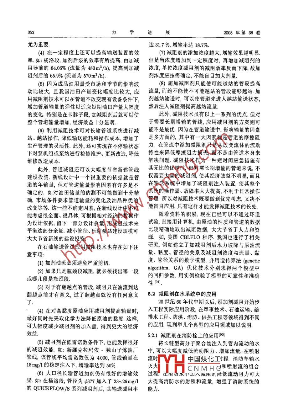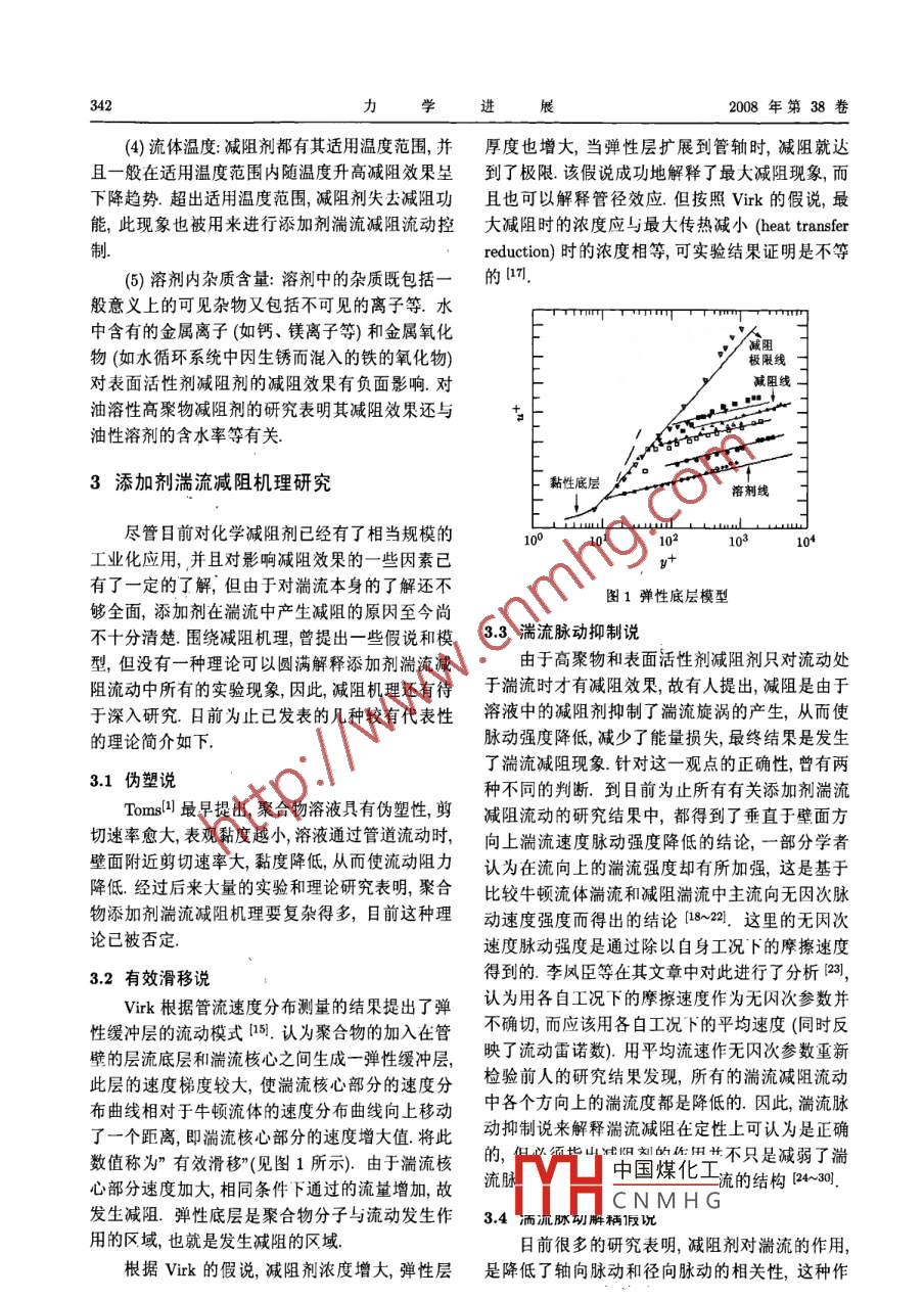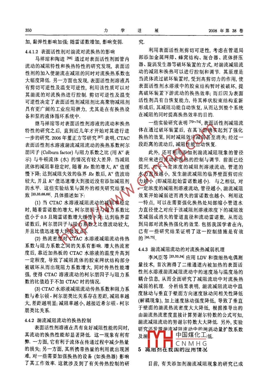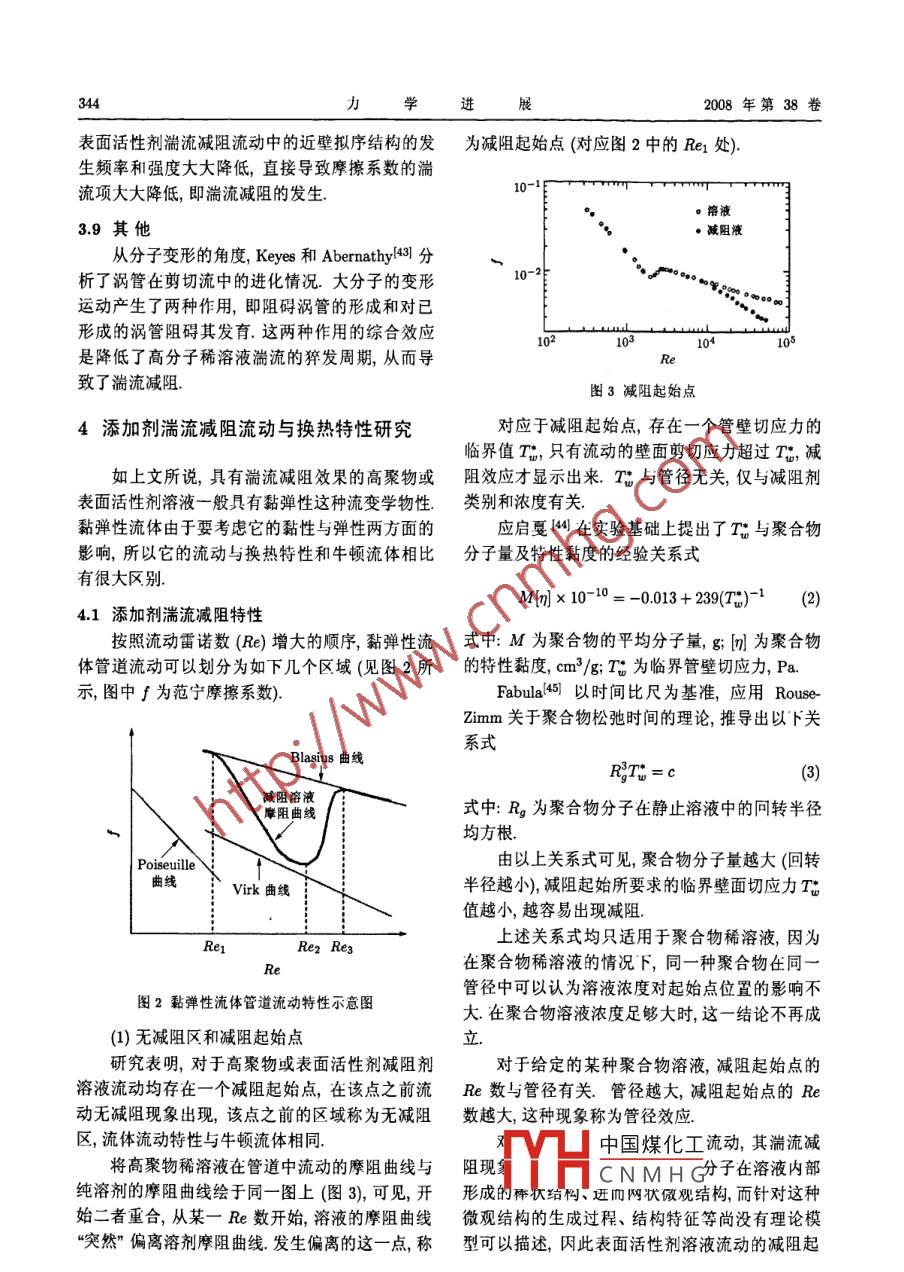 第38卷第3期力.學(xué)進(jìn)展Vol.38 No.32008年5月25日ADVANCES IN MECHANICSMay25,2008添加劑湍流減阻流動(dòng)與換熱研究綜述*焦利芳李鳳臣↑哈爾濱工業(yè)大學(xué)能源科學(xué)與I程學(xué)院,哈爾濱150001摘要添加劑湍流減阻是指在液體的管道湍流中添加少量的高分子聚合物或某種表面活性劑從而使湍流阻力大大降低的現(xiàn)象.從其被發(fā)現(xiàn)至今,經(jīng)過近半個(gè)世紀(jì)的研究(實(shí)驗(yàn)研究、理論分析、數(shù)值模擬和實(shí)際系統(tǒng)的應(yīng)用研究),盡管對(duì)這一現(xiàn)象及其實(shí)際應(yīng)用價(jià)值已有了較為深入的認(rèn)識(shí),但仍有許多方面尚有欠缺,例如對(duì)湍流減阻的機(jī)理仍然在探索中.本文歸納評(píng)述了高分子聚合物或表面活性劑添加劑湍流減阻流動(dòng)與換熱現(xiàn)象的研究現(xiàn)狀,從湍流減阻劑的特性、減阻劑的湍流減阻機(jī)理、湍流減阻發(fā)生時(shí)的換熱機(jī)理、減阻流動(dòng)速度場(chǎng)分布和換熱控制等幾個(gè)方面綜述了添加劑湍流減阻流動(dòng)與換熱特性,并綜述了湍流減阻劑在實(shí)際工業(yè)系統(tǒng)中的應(yīng)用情況,在對(duì)添加劑湍流減阻機(jī)理、有湍流減阻發(fā)生時(shí)的對(duì)流換熱機(jī)理等的理解方面進(jìn)行了新的總結(jié).關(guān)鍵詞高分子聚合物, 表面活性劑,湍流減阻,對(duì)流換熱,節(jié)能1引言湍流減阻的認(rèn)識(shí)日漸豐富,湍流減阻現(xiàn)象在實(shí)際應(yīng)用方面也取得了一-定的進(jìn)展.本文旨在對(duì)添加1948年Tomsl1首次報(bào)道了在液體湍流中添.劑湍流減阻的研究現(xiàn)狀做一綜述,主要從湍流減加少量的高分子聚合物會(huì)使湍流阻力大大降低,阻劑的特性、湍流減阻機(jī)理、湍流減阻流動(dòng)的換該現(xiàn)象后來被稱為"Toms效應(yīng)”.在強(qiáng)剪切力、高熱機(jī)理等幾個(gè)方面闡述.本文的另一個(gè)目的是對(duì)溫等因素作用下,高分子聚合物的柔性分子長(zhǎng)鏈我國在添加劑湍流減阻領(lǐng)域的研究現(xiàn)狀做一調(diào)查,結(jié)構(gòu)被破壞,且破壞后無法自動(dòng)修復(fù),導(dǎo)致其減阻因此-一些共性的方面主要介紹我國學(xué)者的研究成效果的永久性喪失.20世紀(jì)90年代開始某些表面果,在減阻劑的實(shí)際應(yīng)用方面也著重介紹了我國活性劑添加劑也被發(fā)現(xiàn)具有減小湍流阻力的作用,的應(yīng)用研究情況.并且其減阻性能在受到剪切力、溫度等因素影響而暫時(shí)喪失后,待流動(dòng)狀態(tài)恢復(fù)到有效減阻參數(shù)2減阻劑的特性研究范圍內(nèi)時(shí)可自動(dòng)、快速恢復(fù).在實(shí)驗(yàn)室中的直管道理想條件下,對(duì)于水的湍流摩擦阻力在加入表面2.1 減阻劑簡(jiǎn)介活性劑減阻劑后最高甚至可降低90%(2],即推動(dòng)相1948年,Toms首次發(fā)現(xiàn)高分子聚合物的湍流同流量的水流動(dòng)只需要原來泵功率的10%.在實(shí)減阻(drag reduction)現(xiàn)象(1,引起了學(xué)術(shù)界廣泛際應(yīng)用系統(tǒng)中,因管道比較復(fù)雜,如彎管、分支、突注意 1949 年, Mysels注冊(cè)了第1個(gè)減阻劑專擴(kuò)(縮)、換熱器的不規(guī)則形狀等的影響,會(huì)使減阻利問。20世紀(jì)60年代,減阻劑的研究已取得了效果降低,但在合理的流動(dòng)條件下,高分子聚合物很大的進(jìn)展.我國在80年代中期才開始減阻劑減或表面活性劑添加劑湍流減阻率-般仍可達(dá)50%阻的研究,也取得了一定的效果.左右這-減阻效應(yīng)無疑擁有很大的應(yīng)用潛力,可這里所說的減阻劑專指那些只需添加微量即用于降低長(zhǎng)距離液體輸送系統(tǒng)或液體循環(huán)系統(tǒng)的可使流體的湍流摩阻顯著降低的化學(xué)添加劑經(jīng)驅(qū)動(dòng)泵功率,達(dá)到節(jié)能、增輸?shù)男Ч?過過去60多年的研究,已發(fā)現(xiàn)很多有效的減阻劑,經(jīng)過近半個(gè)世紀(jì)的不懈努力,人們對(duì)添加劑可分中國煤化工:些表面活性劑.收稿日期: 2007-07-23,修回H期: 2008-05-15YHCNMHG.●哈爾濱科技創(chuàng)新人才專項(xiàng)基金(2006RFLXS013)資助項(xiàng)目↑E mail: lifch@hit.edu.cn340力學(xué)進(jìn)2008年第38卷其中,高分子聚合物減阻劑可分為油溶性和水溶子型和非離子型3大類.表1中列舉了幾種常見.性兩種;表面活性劑減阻劑可分為陽離子型、陰離的減阻劑表1常見減阻劑舉例序號(hào)減阻劑類型物理性質(zhì)減阻效果實(shí)例備注聚氧化乙烯水溶性Mn =3x 104水中: c= 10mg/l,其減阻液溫度(PEO)41高聚物~4x 104Re=5x 104,越高減阻性能易老化,易降解.DRmx%≈72%.越差.聚丙烯酰胺M=1x 107,水中: c= 20mg/l, .(PAM)(51高聚物.靜置老化不明顯,Re=2.5x 104,易降解.DR%≈73%.Mn≥9x 107,其減阻液減阻(PAM)6]抗剪切性能差.性能幾乎不受溫度影響.4乙丙共聚物油溶性Mn = 0.734 ~ 6.12x 105,0號(hào)柴油中:[m]越大,DR越(EP)7]d=1.39~2.38,易老化,.DR%≈19%大;且DR值與[m] = 1.42 ~ 7.83,易降解.~ 66.8%.碳鏈C3含量有關(guān).辛烯-十無定型結(jié)構(gòu),原油: c= 5mg/,在c= 12 mg/1時(shí),四烯閭共聚物.無結(jié)晶峰.D=25.4mm可達(dá)最大減阻率DR% = 15% ~ 35%.DRmax% = 50%美國CONOCOMw = 3.85x 10%,柴油: c= 5mg/), .裝運(yùn)容積小,.公司生產(chǎn)的共聚物Mn = 2.09 x 10%,Re=14x 10*,存儲(chǔ)運(yùn)輸方便.LP減阻劑間DR% = 33.0%.芬蘭NESTE公Mw =7.08 x 10%,柴油: c= 5mg/L,對(duì)比6和7,共司NE減阻