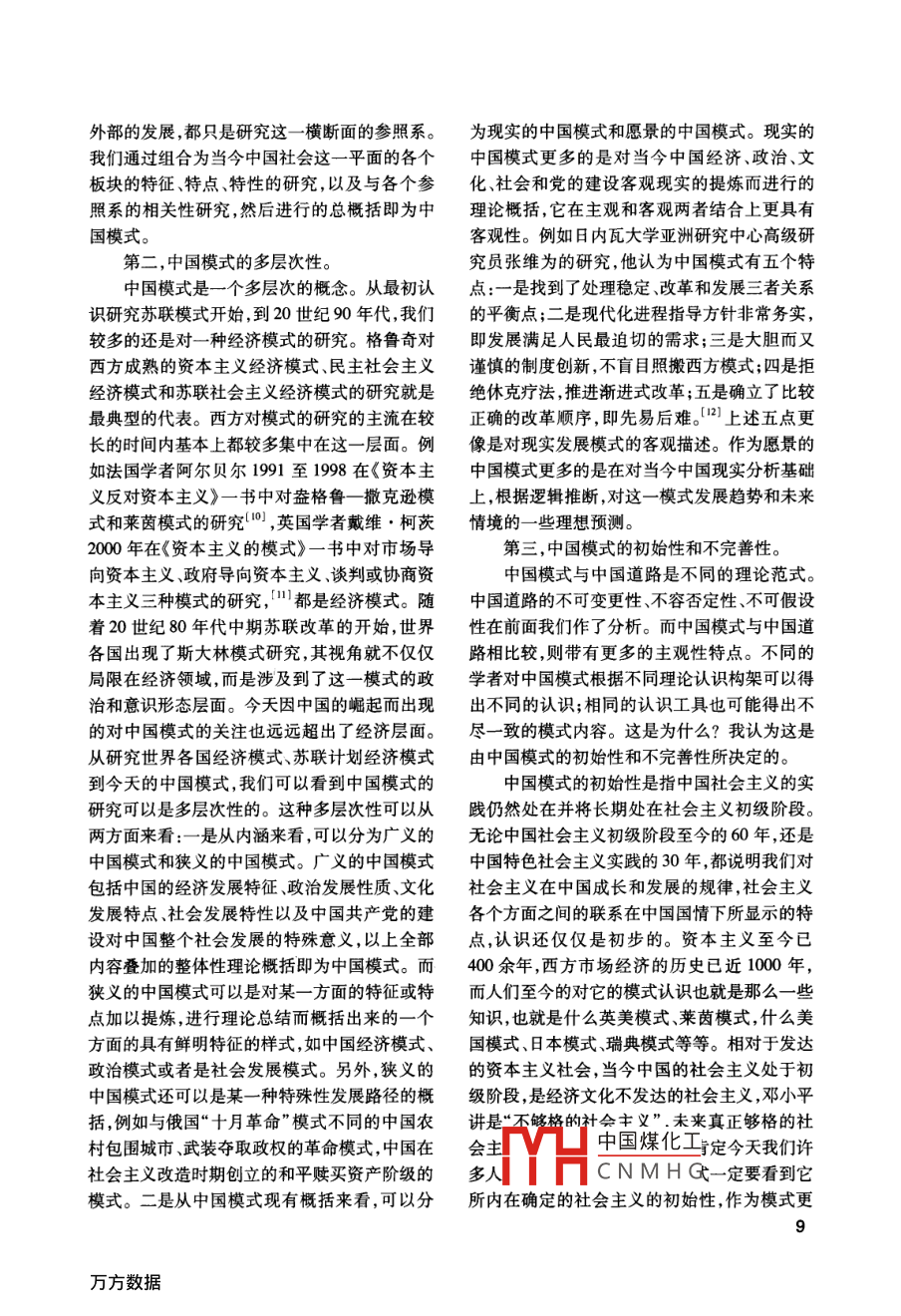 2009年第3期江蘇行政學(xué)院學(xué)報(bào)No.3,2009總第45期Journal of Jiangsu Administration InstituteGeneral No, 45馬克思主義中國(guó)化研究·中國(guó)道路、中國(guó)模式與中國(guó)經(jīng)驗(yàn)王慶五(中共江蘇省委黨校,南京210004)摘要:中國(guó)道路、中國(guó)模式、中國(guó)經(jīng)驗(yàn)不是內(nèi)容相同的概念,它們有著區(qū)別和聯(lián)系。對(duì)中國(guó)道路、中國(guó)模式和中國(guó)經(jīng)驗(yàn)進(jìn)行理論的辨析,對(duì)于科學(xué)認(rèn)識(shí)當(dāng)今中國(guó)在世界的位置,堅(jiān)持走中國(guó)特色的社會(huì)主義道路,不斷總結(jié)和提升中國(guó)經(jīng)驗(yàn),改革和完善中國(guó)模式,都具有重要的意義和價(jià)值。關(guān)鍵詞:中國(guó)道路;中國(guó)模式;中國(guó)經(jīng)驗(yàn)中圖分類號(hào):D67.09文獻(xiàn)標(biāo)識(shí)碼:A文章編號(hào):1009-8860(2009)03-0005-08中國(guó)道路、中國(guó)模式、中國(guó)經(jīng)驗(yàn)在2004國(guó)內(nèi)學(xué)術(shù)界的認(rèn)識(shí)還存在界定不清的問(wèn)題,即將2006年得到國(guó)內(nèi)外學(xué)術(shù)界的關(guān)注。①當(dāng)時(shí),在經(jīng)中國(guó)道路、中國(guó)模式、中國(guó)經(jīng)驗(yàn)混淆在一起,表述歷了20世紀(jì)80年代末90年代初西方根據(jù)蘇東為“中國(guó)道路或中國(guó)模式”,“中國(guó)模式或中國(guó)經(jīng)劇變提出的“中國(guó)崩潰論”,新世紀(jì)初面對(duì)中國(guó)驗(yàn)”,好像道路就是模式,模式就是經(jīng)驗(yàn),經(jīng)驗(yàn)就迎來(lái)新的繁榮而拋出的“中國(guó)威脅論”之后,中是道路。實(shí)際上,這三者不是一個(gè)問(wèn)題,有聯(lián)系國(guó)道路、中國(guó)模式、中國(guó)經(jīng)驗(yàn),成為國(guó)外一些學(xué)者但更有區(qū)別。搞清楚這三個(gè)問(wèn)題,對(duì)于科學(xué)認(rèn)識(shí)研究為什么中國(guó)走了一條與他們完全不同的道當(dāng)今中國(guó)在世界的位置、堅(jiān)持走中國(guó)特色社會(huì)主路而又沒(méi)有出現(xiàn)他們所預(yù)料結(jié)局的內(nèi)容。當(dāng)前,義的道路、不斷總結(jié)和提升中國(guó)經(jīng)驗(yàn)改革和完國(guó)內(nèi)理論界也將中國(guó)道路、中國(guó)模式、中國(guó)經(jīng)驗(yàn)善中國(guó)模式等等,都具有重要的意義和價(jià)值。的研究作為對(duì)中國(guó)特色社會(huì)主義研究的一個(gè)新的組成部分??v觀2004年至今的研究,我認(rèn)為中國(guó)道路”是近代120年來(lái),中國(guó)淪為半收稿日期:2009-02-20作者簡(jiǎn)介:王慶五(1957—),江蘇如東人,中共江蘇省委黨校副校長(zhǎng)、教授,研究方向?yàn)檎螌W(xué)理論和當(dāng)代中國(guó)社會(huì)主義問(wèn)題。2004年5月11日,英國(guó)著名思想庫(kù)“倫敦外交政策中心”發(fā)表喬舒亞·庫(kù)?!だ啄摹侗本┕沧R(shí)》一文,對(duì)中國(guó)的經(jīng)濟(jì)改革擇。這些國(guó)家不僅在設(shè)法喬清如何發(fā)展自已的國(guó)家,而且還想知道如何與國(guó)際接軌問(wèn)時(shí),使他們真正實(shí)現(xiàn)國(guó)家獨(dú)立。這種新動(dòng)向和新的“發(fā)展物理學(xué)"被稱為“北京共識(shí)”或者“中國(guó)模式”。雷默指出:“提出‘中國(guó)模式’的目的是試圖用清楚的語(yǔ)言描述在中所看到的情況并且為如何思考中國(guó)這樣一個(gè)以歷史上前所未有的速度迅速發(fā)展變化的國(guó)家提供一個(gè)框架?!痹诶啄磥?lái)中國(guó)模式有三條定理:一是重視和追求創(chuàng)新;二是努力創(chuàng)造一種有利于持續(xù)與公平發(fā)展的環(huán)境從而體現(xiàn)社會(huì)發(fā)展的清廉性和人文性三是要維護(hù)自主和自尊。其核心思想可以概括為:按照自己的國(guó)情,走內(nèi)學(xué)界的高度關(guān)注。中國(guó)學(xué)者俞可平、田春生趙曜、常修澤、邱耕田等中國(guó)煤化工中國(guó)經(jīng)驗(yàn)”他們根據(jù)自己的認(rèn)識(shí),試圖對(duì)這一問(wèn)題做出更加符合國(guó)情的解釋。參見(jiàn):喬舒亞國(guó)與全球化:華盛頓共識(shí)還是北京共識(shí)》。社會(huì)科學(xué)文獻(xiàn)出版社,2005年CNMH黃平,崔之元:《中北京共識(shí)”》。社會(huì)科學(xué)文獻(xiàn)出版社,2006年11月。殖民地半封建社會(huì)后,歷經(jīng)舊民主主義革命新條西方道路給世界所帶來(lái)的兩個(gè)影響的概括。民主主義革命到社會(huì)主義革命、建設(shè)和改革,探第一個(gè)影響就是“通過(guò)利用更先進(jìn)的科學(xué)技索在一個(gè)十幾億人口的發(fā)展中大國(guó),如何實(shí)現(xiàn)、擴(kuò)大生產(chǎn)規(guī)模和提高資本積累能力等手段民族解放、擺脫貧困,加快實(shí)現(xiàn)現(xiàn)代化,鞏固和發(fā)展了生產(chǎn)力”,另一影響“那就是資本主義的發(fā)展社會(huì)主義的道路全球擴(kuò)展”。1m而資本主義的全球性擴(kuò)張也同時(shí)深深影響了古老而又封閉的中國(guó),1840年中國(guó)道路與中國(guó)模式、中國(guó)經(jīng)驗(yàn)相比,更具資本主義列強(qiáng)中最強(qiáng)大的英國(guó)憑借著現(xiàn)代化的有歷史的縱深性和包容性。首先,它是對(duì)歷史實(shí)力打開(kāi)了中國(guó)的大門(mén),中國(guó)人民從此開(kāi)始了的動(dòng)態(tài)性和縱向性發(fā)展態(tài)勢(shì)的描述,有著十分救亡