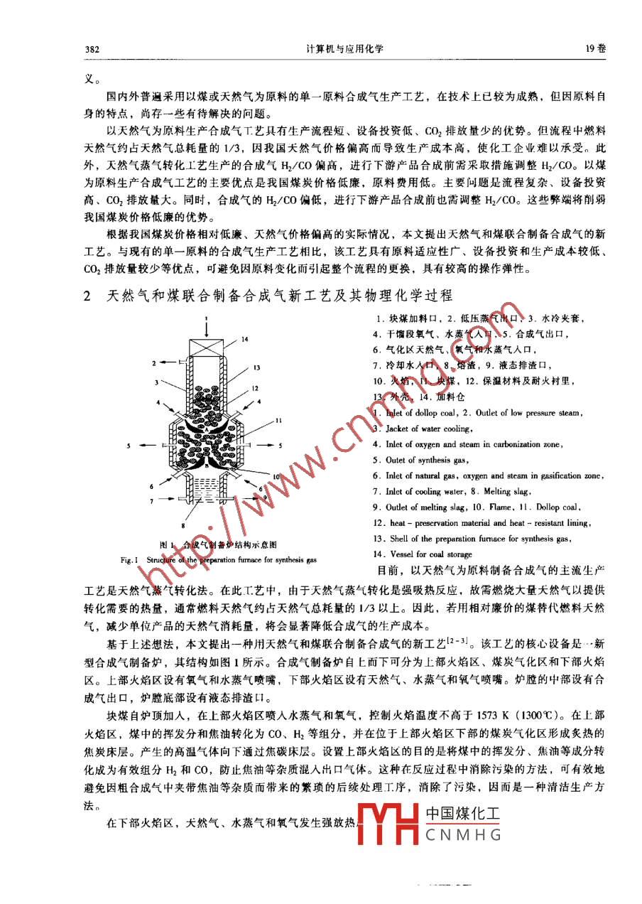 第19卷第4期計(jì)算機(jī)與應(yīng)用化學(xué)Vol 19002年7月28日Computers and Applied Chemistry天然氣和煤聯(lián)合制備廉價(jià)合成氣新工藝及其熱力學(xué)分析李俊嶺,趙月紅,溫浩,許志宏(中國科學(xué)院過程工程研究所,北京100080摘要:20世紀(jì)后期,天然氣勘探開發(fā)技術(shù)進(jìn)步很快。發(fā)達(dá)園家中,天然氣已逐步成為一種占主導(dǎo)地位的清潔能源。目前我國許多天然氣化工企業(yè)面臨天然氣管網(wǎng)價(jià)格偏高、供應(yīng)量不足和開工率下降等問題。新建的天然氣化工廠,應(yīng)考慮進(jìn)入WO后激烈的國際價(jià)格競爭。為解決上述問題,本文提出一種天然氣和煤聯(lián)合潮備廉價(jià)合成氣的新工藝,主要特點(diǎn)為利用廉價(jià)的煤,替代轉(zhuǎn)化工藝中的燃料天然氣,從而減少天然氣的消耗量,降低合成氣的生產(chǎn)成本。為減少煤造氣設(shè)備投資(約占總投資的60%),核心設(shè)備可在退役高爐的基礎(chǔ)上進(jìn)行改造。這種新型合成氣制備工藝對天然氣價(jià)格有較強(qiáng)的彈性和適應(yīng)性。關(guān)鍵詞:高爐;天然氣;媒;合成氣中圖分類號:TE665.3文獻(xiàn)標(biāo)識碼:A文章號:10014160(2002)04-381-384A New Preparation Process of Low-Cost Synthesis Gasfrom Natural Gas and Coal and Its Thermodynamic analysisLI Jun-ling, ZHAO Yue-hong, WEN Hao, XU Zhi-hong(Institute of Process Engineering, Chinese Academy of Sciences, Beijing 100080)Abstract: As a clean energy, natural gas has been widely used in many developed countrics, However, a chemical plant with natural gas as its feed may be often disturbed by the high- cost and insufficient supply of natural gas, which may lead to a decreaseof the operation period. To solve these problems, a new process for the preparation of low- cost symthesis gas from natunal gas andcoal is presented in this paper. Cheaper coal, which serves as a heating material and also a reactant, is fed into the fumace topartially substitute the expensive and largely consumed natural gas, In this way low-cost synthcsis gAs can be produced. To re-luce the investment cost of the gasification unit of coal (about 60% of the total investment), the preparation furace can be recon-structed on a small or medium blast fumace left unused in iron steel factories. This new process provides the flexibility to the pricefluctuation of natural gasKeywords: blast fumace: natural gas; coal; synthesis引言開發(fā)和利用天然氣資源代表著當(dāng)代能源結(jié)構(gòu)的發(fā)展方向,是可持續(xù)發(fā)展的保證。在我國能源消費(fèi)結(jié)構(gòu)中,天然氣和煤炭所占比重分別為1.8%和75%,與世界平均比重的232%和272%相距甚遠(yuǎn)。我國煤炭資源豐富,價(jià)格相對低廉,加之長期受到能源短缺的困擾,故煤炭作為我國主要的消費(fèi)能源和工業(yè)原料是不可避免的。然而,煤炭在使用過程中造成的污染排放較天然氣高出許多倍,使我國的環(huán)境保護(hù)和可持續(xù)發(fā)展戰(zhàn)略面臨嚴(yán)峻的挑戰(zhàn)。近年來,我國西部天然氣儲量呈大面積增長趨勢,西氣東輸工程業(yè)已啟動,為我國天然氣化工的發(fā)展提供了良好的契機(jī)。但目前存在的主要問題是管網(wǎng)天然氣價(jià)格偏高,化工企業(yè)難以承受。因此,迫切需要根據(jù)我國煤炭和天然氣的資源狀況,開發(fā)低成本、對環(huán)境友好、具有全球競爭力的天然氣化工新技術(shù)。從煤、天然氣等非石油資源生產(chǎn)化工產(chǎn)品的工藝一般分為合成氣制備、產(chǎn)品合成和產(chǎn)品精制3個(gè)部分。其中,合成氣制備約占總投資和生產(chǎn)成本的一半以上,因此開發(fā)先進(jìn)的合成氣制備工藝具有重要意收稿日201019:20118作者簡介:李俊嶺(192-),男,博土研究生中國煤化工CNMHG382計(jì)算機(jī)與應(yīng)用化學(xué)國內(nèi)外普遍采用以煤或天然氣為原料的單一原料合成氣生產(chǎn)工藝,在技術(shù)上已較為成熟,但因原料自身的特點(diǎn),尚存一些有待解決的問題。以天然氣為原料生產(chǎn)合成氣τ藝具有生產(chǎn)流程短、設(shè)備投資低、CO2排放量少的優(yōu)勢。但流程屮燃料天然氣約占天然氣總耗量的1/3,因我國天然氣價(jià)格偏高而導(dǎo)致生產(chǎn)成本高,使化工企業(yè)難以承受。此外,天然氣蒸氣轉(zhuǎn)化工藝生產(chǎn)的合成氣H2CO偏高,進(jìn)行下游產(chǎn)品合成前需采取措施調(diào)整H2/CO。以煤為原料生產(chǎn)合成氣工藝的主要優(yōu)點(diǎn)是我國煤炭價(jià)格低廉,原料費(fèi)用低。主要問題是流程復(fù)雜、設(shè)備投資高、CO2排放量大。同時(shí),合成氣的H2/CO偏低,進(jìn)行下游產(chǎn)品合成前也需調(diào)整H2/CO。這些弊端將削弱我國煤炭價(jià)格低廉的優(yōu)勢。根據(jù)我國煤炭價(jià)格相對低廉、天然氣價(jià)格偏高的實(shí)際情況,本文提出天然氣和煤聯(lián)合制備合成氣的新工藝。與現(xiàn)有的單一原料的合成氣生產(chǎn)工藝相比,該工藝具有原料適應(yīng)性廣、設(shè)備投資和生產(chǎn)成本較低CO2排放量較少等優(yōu)點(diǎn),可避免因原料變化而引起整個(gè)流程的更換,具有較高的操作彈性2天然氣和煤聯(lián)合制備合成氣新工藝及其物理化學(xué)過程1.塊煤加料口,2.低壓蒸氣出口,3.水冷夾套,干餾段氧氣、水蒸氣入口,5.合成氣出6.氣化區(qū)天然氣、氧氣和水蒸氣人口卻水人口,8.熔渣,9.液態(tài)排渣口10.火焰,11.塊煤,12.保濕材料及耐火襯里外殼,14.