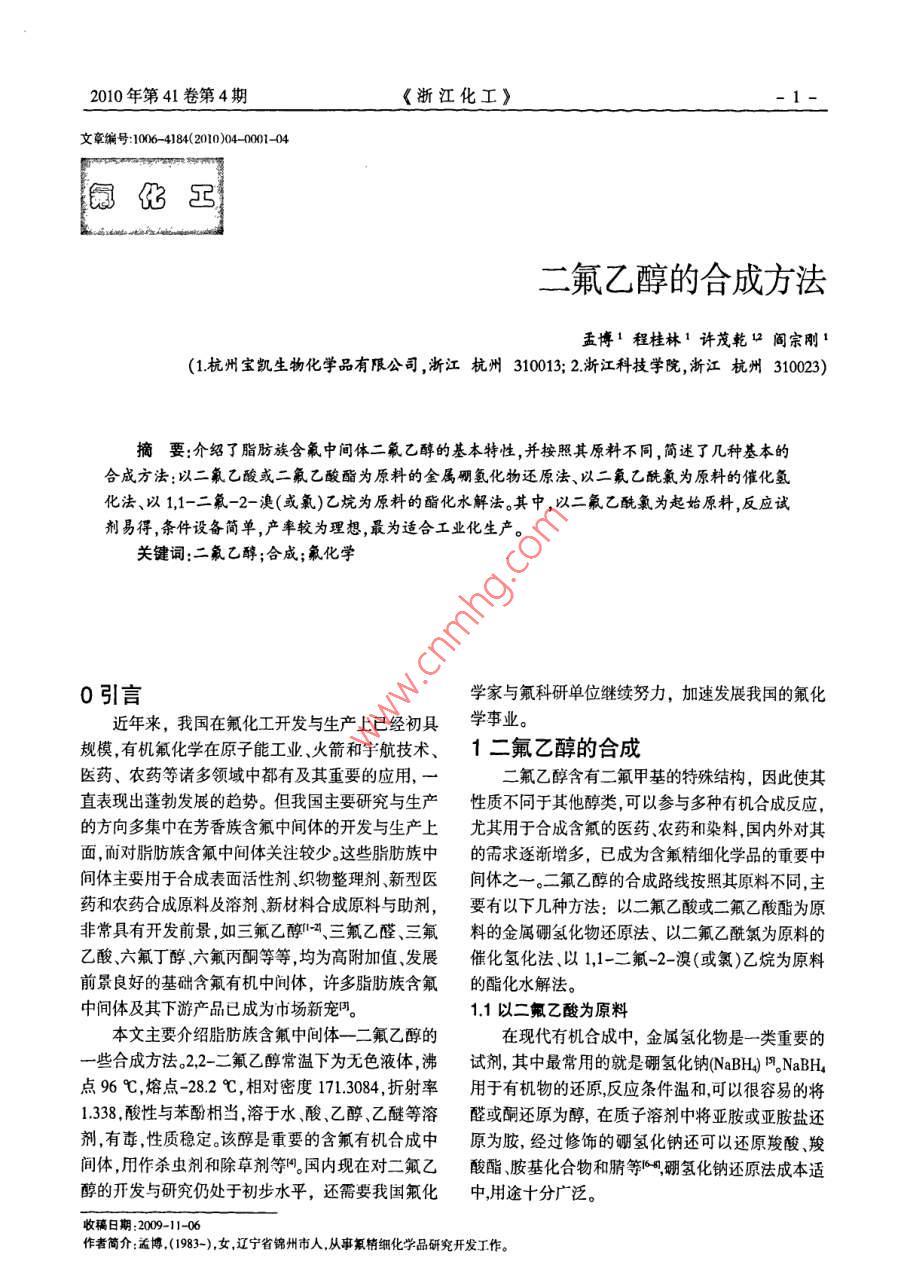2010年第41卷第4期《浙江化工》1-文章編號:064184204-01-04化工二氟乙醇的合成方法孟博1程桂林1許茂乾12閻宗剛1(1杭州寶凱生物化學品有限公司,浙江杭州310013;2浙江科技學院,浙江杭州310023摘要:介紹了脂肪族含氟中間體二氟乙醇的基本特性,并按照其原料不同,簡述了幾種基本的合成方法:以二氟乙酸或二氟乙酸酯為原料的金屬硼氫化物還原法、以二氟乙酰氯為原料的催化氫化法、以1,1-二氟-2-溴(或氯)乙烷為原料的酯化水解法。中,以二氟乙酰氯為起始原料,反應試劑易得,條件設備簡單,產(chǎn)率較為理想,最為適合工業(yè)化生產(chǎn)。關鍵詞:二氟乙醇;合成;氟化學0引言學家與氟科研單位繼續(xù)努力,加速發(fā)展我國的氟化近年來,我國在氟化工開發(fā)與生產(chǎn)上已經(jīng)初具學事業(yè)。規(guī)模,有機氟化學在原子能工業(yè)、火箭和宇航技術、1二氟乙醇的合成醫(yī)藥、農(nóng)藥等諸多領域中都有及其重要的應用,一二氟乙醇含有二氟甲基的特殊結構,因此使其直表現(xiàn)出蓬勃發(fā)展的趨勢。但我國主要研究與生產(chǎn)性質不同于其他醇類可以參與多種有機合成反應,的方向多集中在芳香族含氟中間體的開發(fā)與生產(chǎn)上尤其用于合成含氟的醫(yī)藥、農(nóng)藥和染料,國內外對其面,而對脂肪族含氟中間體關注較少。這些脂肪族中的需求逐漸增多,已成為含氟精細化學品的重要中間體主要用于合成表面活性劑、織物整理劑、新型醫(yī)間體之一。二氟乙醇的合成路線按照其原料不同,主藥和農(nóng)藥合成原料及溶劑、新材料合成原料與助劑,要有以下幾種方法:以二氟乙酸或二氟乙酸酯為原非常具有開發(fā)前景,如三氟乙醇三氟乙醛、三氟料的金屬硼氫化物還原法、以二氟乙酰氯為原料的乙酸、六氟丁醇、六氟丙酮等等,均為高附加值、發(fā)展催化氫化法、以1,1-二氟-2-溴(或氯)乙烷為原料前景良好的基礎含氟有機中間體,許多脂肪族含氟的酯化水解法。中間體及其下游產(chǎn)品已成為市場新寵1.1以二氟乙酸為原料本文主要介紹脂肪族含氟中間體一二氟乙醇的在現(xiàn)代有機合成中,金屬氫化物是一類重要的一些合成方法。2,2-二氟乙醇常溫下為無色液體,沸試劑,其中最常用的就是硼氫化鈉(NaBH NaBH點96℃,熔點-28.2℃,相對密度171.3084,折射率用于有機物的還原反應條件溫和,可以很容易的將1.338,酸性與苯酚相當,溶于水、酸、乙醇、乙醚等溶醛或酮還原為醇,在質子溶劑中將亞胺或亞胺鹽還劑,有毒,性質穩(wěn)定。該醇是重要的含氟有機合成中原為胺,經(jīng)過修飾的硼氫化鈉還可以還原羧酸、羧間體用作殺蟲劑和除草劑等國內現(xiàn)在對二氟乙酸酯胺基化合物和猜等硼氫化鈉還原法成本適醇的開發(fā)與研究仍處于初步水平,還需要我國氟化中用途十分廣泛。011收稿日期:2009-11-0作者簡介:孟博(1983-),女遼寧省錦州市人,從事氟精細化學品研究開發(fā)工作。2- ZHEJIANG CHEMICAL INDUSTRYol.41no.4(2010)硼氫化鈉還原羧酸的機理如下所示還原結束wg.Reifenrath等人,用甲基硼烷硫化物同樣實后水解亦是重要一步?,F(xiàn)了對二氟乙酸的還原在干燥的250mL三口瓶 RCOOH+nabh RCOOBHna+2中放入50mL無水乙醚,安裝恒壓漏斗,回流冷凝 2RCOOBH)Na-(RCOO)BH2Na NaBH器,通氮氣保護反應。用注射筒將11.5mL(114 (RCOO)BH2Na RCOOBH2 +RCOONammol)的硼烷硫化物加到三口瓶里。二氟乙酸10.0g(104mmol)用10mL無水乙醚溶解于恒壓漏斗中, RCH2O-BHRCH;OH緩慢滴加,控制速度于2h滴加完畢。反應混合物在50%室溫下繼續(xù)攪拌反應8h。將10mL水緩慢加入其以NaBH4-ZnCl2體系,在THF中回流狀態(tài)下可中分解反應混合物將反應液過濾,析出物用乙醚以很順利的將酸還原為醇,反應只需要等化學計量洗濾出液繼續(xù)用無水硫酸鈉干燥乙醚溶液在干量的NaBH4與ZnCl2。燥劑下常壓蒸餾,收集92~94℃的餾分,得到4.6g RCOOH NaBH,,OH二氟乙醇產(chǎn)品,產(chǎn)率56%,沸點95.5~96℃。THF回流 HCFCOOH borane-methy sulfide complex HCF,CH,OH以NaBH4-12體系還原酸,以THF為溶劑,在室 ether,8h溫條件下即可得到相應的醇,產(chǎn)率較高實驗的一以二氟乙酸為起始原料,試劑易得,反應較為般操作是把硼氫化鈉的四氫呋喃懸浮液加入到羧簡單;但某些輔助催化劑或溶劑市面價格較高,導酸中,等體系放出氫氣后再加入碘。致其合成成本提高,且二氟乙醇的反應后處理過程 NaBR,H(C2COOHCH(Ch2)aCH2OH較為困難,導致其產(chǎn)率明顯下降,使它們在工業(yè)化THF,室溫生產(chǎn)中不能得到較高的收益,此方法只適用于批量以NaBH4-ACl3體系還原酸, Herbert等發(fā)現(xiàn)較小時的制備。以二甘醇二甲醚作溶劑,NaBH4-ACl3可以快速地1.2以二氟乙酸酯為原料把酯、內酯和羧酸還原為相應的醇。在醇溶劑中,酯被過量的硼氫化鈉還原可得到 RCOOH/RCOOR NaBH-aicl3rch2OH相應的醇酯在叔胺的存在下,也可以很順利的被 DBG還原為相應的醇。可以選用NaBH4-ZnCl2體系和以Nah4-cal2體系還原酸,abh4-CaCl2 NaBH--l2體系但在相同的條件下,無胺存在,則不體系在THF-甲苯混合溶劑中,于95-100℃下反應,能發(fā)生還原反應。能夠將某些羧酸還原為相應的醇。其中起還原作用酯的還原反應還原劑為硼氫化鈉、硼氫化鉀;的是NaBH4和CaCl2在THF中形成還原能力較強溶劑為環(huán)丁砜、二甲基甲酰胺、甲苯、二甲苯、二乙的Ca(BH4)2體系中Ca(BH42的含量越高,則還原反二醇二甲醚用量以1g的酯為基準計算,還原劑用應進