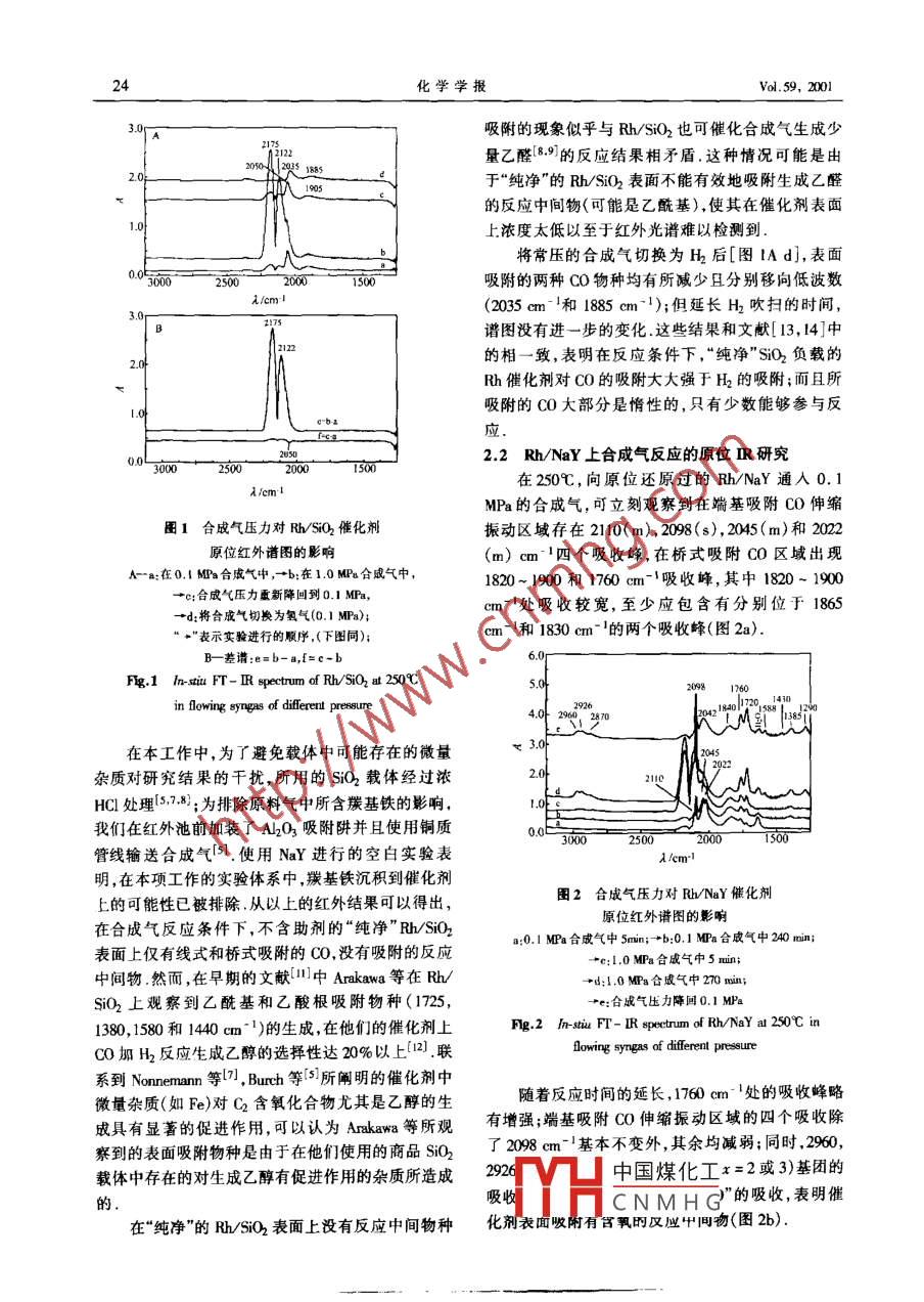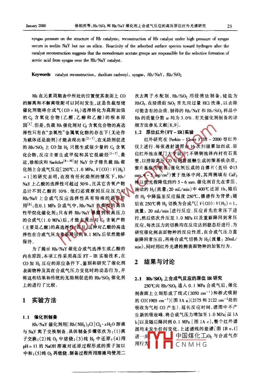 Rh/SiO2和Rh/NaY催化劑上合成氣反應(yīng)的高壓原位紅外光譜研究