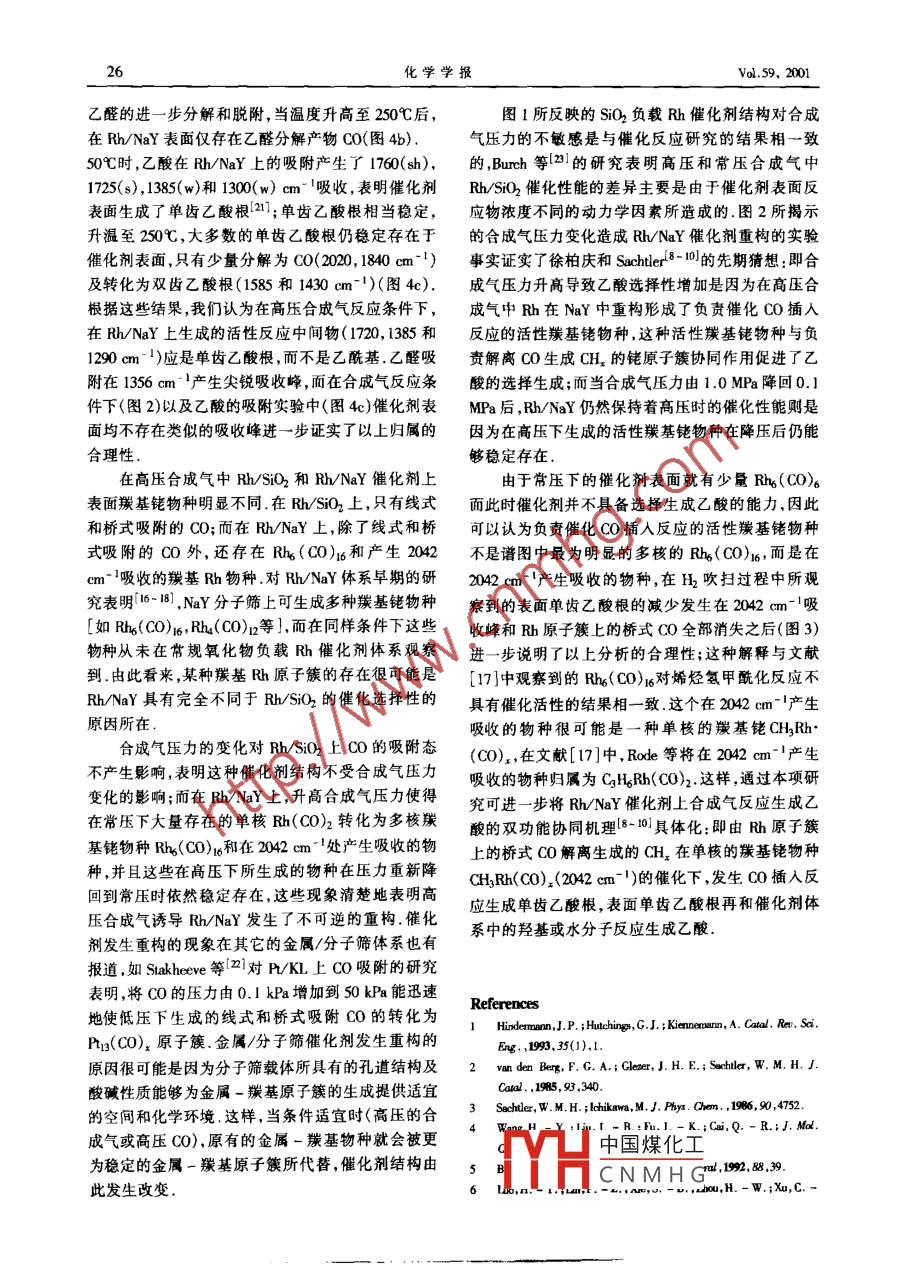 2001年第5卷化學(xué)學(xué)報(bào)V.59,201第1期,22-27ACTA CHIMICA SINICARh/SiO2和Rh/NaY催化劑上合成氣反應(yīng)的高壓原位紅外光譜研究孫科強(qiáng)徐柏慶朱起明(清華大學(xué)化學(xué)系一碳化工國家重點(diǎn)實(shí)驗(yàn)室北京10004)翁維正萬惠霖(廈門大學(xué)固體表面物理化學(xué)國家重點(diǎn)實(shí)驗(yàn)室廈門361005)摘要采用高壓原位FT-IR技術(shù),對(duì)比研究了C0加H反應(yīng)條件下R/SiO2和h/NaY催化劑表面反應(yīng)中間物種在Hh/SHO2表面上,無論在常壓還是在10MPa合成氣中,只觀察到線式和橋式吸附CO而在常壓合成氣中,Rh/NaY上不僅存在上述CO吸附物種,而且還有孿生型的Rh(n)(CO)2和少量Rb4(CO)i6;當(dāng)合成氣壓力升至1.0MPa后Rh(D)(CO)2迅速轉(zhuǎn)化成Rh4(CO)16和在2042cm產(chǎn)生吸收的單核羰基Rh物種,與此同時(shí)催化劑表面還生成了單齒和雙齒乙酸根物種;這些在高壓下生成的物種在合成氣壓力重新降回到常壓時(shí)依然穩(wěn)定存在研究助/NaY上合成氣反應(yīng)表面物種與H2的反應(yīng)行為表明單齒乙酸根很可能是反應(yīng)的活性中間物這些結(jié)果說明RNY催化劑在高壓合成氣中的重構(gòu)是誘發(fā)選擇生成乙酸反應(yīng)的基礎(chǔ)關(guān)鍵詞催化劑重構(gòu),羰基銠物種,合成氣,Rh/NaY,Hh/SiO2In-situ FT-IR Study of High Pressure Syngas Conversionover Rh/SiO, and Rh/ NaY catalystsSUN Ke-Qiang XU Bo-Qing ZHU Qi-MingState Key Laboratory of C: Chemioal Technology, Department of Chemistry, Tsinghua University, Beying, 100084)WENG Wei-Zheng WAN Hui-LinState Key Laboratory of Physical Chemistry of Sufaces, Departmen of Chemistry, Xiamen Universiy, Ximen, 361005)Abstract High pressure syngas[ V(CO):V(H2)=1] conversion over unpromoted Rh catalyst supported onsilica and zeolite Nay were studied at 250%t with an in-situ IR cell that avoided contamination of ironcarbonyls. Change of the syngas pressure produced no effect on the IR spectrum of Rh/SiO; bridged andlinear CO on Rh clusters were the only detectable surface species under 0. 1 to 1.0 MPa of nowing syngas. naddition to the bridged and linear CO species, two types of dicarbonyls [R(I )(CO)2] and a small amount ofRhs(Co) were formed when Rh/Nay was exposed to 0.I MPa syngas. Increasing of the syngas pressure to Io MPa over Rh/NaY resulted in transformation of the dicarbonyls to Rh(CO)1 and probably a mononuclearhodium carbonyl featuring an absorption 2042 cm". The detectable reaction products adsorbed on Rh/Naycatalyst under 1. 0 MPa were monodentate and bidentate acetates. These surface species were maintained evenafter releasing the syngas pressure back to 0. 1 MPa. Thus, a remarkable difference exists in the effect ofE-mail:bomu@mail.tsinghua.chu.cn中國煤化工收稿日期:200-04-20,修回日期:2000-06-20,定稿日期:2000青華大學(xué)基礎(chǔ)研究基金(C9951)和廈門大學(xué)固體表面物理化學(xué)國家重點(diǎn)實(shí)驗(yàn)室開放基金資CNMHG(Received April 20, 2000. Roviaod Jme 20, 2000. Acopted August 3, 2000)January 2000徐柏慶等:Rb/SiO2和h/NaY催化劑上合成氣反應(yīng)的高壓原位紅外光譜研究syngas pressure on the structure of Rh catalysts: reconstruction of Rh catalyst under high pressure of syngasoccurs in zeolite NaY but not on silica. Reactivity of the adsorbed surface species toward hydrogen after thecatalyst reconstruction suggests that the monodentate acetate groups are responsible for the selective formation ofacetic acid from syngas over the Rh/NaY catalystKeywords catalyst reconstruction, rhodium carbonyl, syngas, RI/NaY, Rh/SiO2Rh在元素周期表中所處的位置使其表面上CO次去離子水配制, Rh/SiO2用浸漬法制備,銠鹽為的解離和不解離吸附可以同時(shí)發(fā)生,這是負(fù)載型銠RhCl2,在浸漬前SiO2首先用過量HCl洗滌,以去除催化劑能將合成氣(CO0+H2)選擇轉(zhuǎn)化為高附加值可能含有的雜質(zhì)制得的Hh/NaY和RhSO2樣品中的C2含氧化合物(乙醛、乙醇和乙酸)的根本原Rh的質(zhì)量分?jǐn)?shù)w均為3.0%有關(guān)催化劑制備的詳因們.但是,負(fù)載阽催化劑對(duì)C2含氧化合物的高選細(xì)方法參見文獻(xiàn)[89]擇性只有在“親氧性”金屬氧化物的存在下(無論作12原位紅外(FT-IR)實(shí)驗(yàn)為載體還是助劑)才能表現(xiàn)出來2-71,在無助劑促進(jìn)紅外研究在 Perkin- Elmer fttr-2000型紅外的HhSO2上CO加H2只能生成很少量的C2含氧儀上進(jìn)行每張透射譜圖由16次掃描累加而成原化合物,反應(yīng)主要生成甲烷和其它低碳烴5-71.最位紅外池由廈門大學(xué)設(shè)計(jì)不銹鋼池體內(nèi)村有石英近,徐柏慶和Sher10對(duì)NaY分子篩負(fù)載催管,以排除高壓C0與鋼管接觸生成的基鐵雜質(zhì),化劑上合成氣反應(yīng)[250℃,1.0Man,v(CO):v(H)窗片基座為銅質(zhì);催化劑壓成的自撐片(直徑13=11的研究表明,在沒有任何助劑的情況下,Rhm,4-5mg/cm2)置于池體中間,其兩側(cè)填有Ca2NaY上乙酸的選擇性可超過50%,且其它含氧產(chǎn)物棒以使光程降低到約5~6mm催化劑首先在常壓總計(jì)不到乙酸的10%他們還觀察到反應(yīng)壓力對(duì)流動(dòng)的H2(流量:20mL/min)中400℃還原h(huán),隨后RNaY上合成氣反應(yīng)選擇性具有特殊的調(diào)變作在H2中降溫至反應(yīng)溫度250℃,攝譜作為背景;隨用181:在0.1MPa合成氣中,R/NY為典型的高活后在20℃將H2切換為合成氣v(CO);v(H)=1性甲烷化催化劑;只有將Hh/NaY暴露到較高壓力流量:20mL/mn]進(jìn)行反應(yīng)反應(yīng)首先在常壓下進(jìn)的合成氣(1.0MPa)后,才能表現(xiàn)出對(duì)C2含氧產(chǎn)物行,然后依次升壓至10MPa以及重新降回到常壓(主要是乙