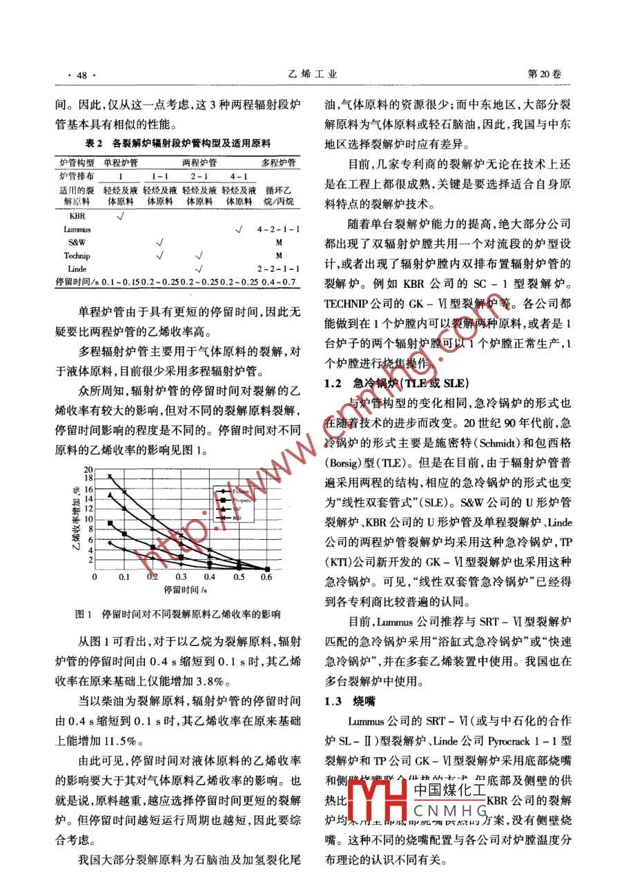 工業(yè)技術(shù).乙烯工業(yè)2008,20(1) 47~52ETHYLENE INDUSTRY典型乙烯技術(shù)特點分析藍春樹,魯衛(wèi)國(中國石油化工股份有限公司茂名分公司化工分部,廣東茂名,525021)摘要: 針對世界典型乙烯技術(shù),從技術(shù)、綜合能耗、裝置操作穩(wěn)定性、長周期運轉(zhuǎn)及工程化經(jīng)驗方面進行了分析。提出了國內(nèi)大型乙烯裝置應(yīng)該選用物耗能耗低、操作穩(wěn)定、有工業(yè)應(yīng)用業(yè)績的清潔生產(chǎn)技術(shù),以保證裝置投產(chǎn)以后技術(shù)指標先進,生產(chǎn)安全穩(wěn)定,效益名列前茅。關(guān)鍵詞:乙烯技術(shù);特點;分析世界著名的乙烯專利技術(shù)公司有S&W公司、可見,裂解爐區(qū)的重要性在乙烯裝置中占據(jù)Linde 公司、KBR公司、JLummus公司、TECHNIP公司.核心的位置。等,在世界范圍內(nèi),他們都建有幾十套甚至上百套1.1輻射爐管的構(gòu)型乙烯裝置。采用Lummus技術(shù)的乙烯裝置,其生產(chǎn)隨著乙烯技術(shù)的發(fā)展,為了不斷追求高溫、短能力約占世界乙烯能力的38% ,采用S&W技術(shù)的停留時間、低烴分壓來獲得目的烯烴的高產(chǎn)率,蒸乙烯裝置,其生產(chǎn)能力約占世界乙烯能力的30%。汽裂 解制乙烯輻射段爐管的構(gòu)型也經(jīng)歷了漸進的發(fā)采用Linde技術(shù)的乙烯裝置,其生產(chǎn)能力約占世界展過程,由多程爐管逐漸發(fā)展為兩程爐管和單程爐乙烯能力的20%。KBR公司是Kellogg 和B&R合管。各專利商輻射段爐管的發(fā)展變化情況見表1。并組成的新公司,TECHNIP公司近年通過并購荷表1各專利商輻射段爐管的發(fā)展情況蘭KTI公司后也擁有了全套乙烯技術(shù)。各家公司TP(KI)爐型CK-I1I CK-CK-IV CK- V,M的技術(shù)都有世界規(guī)模的乙烯裝置在運轉(zhuǎn),應(yīng)該說Lummus爐型SRT-I爐管程數(shù)6SRT-ISRrT-II SRT-IN,V,MI都是成熟可靠的技術(shù)。但在技術(shù)的細節(jié)上,在綜86或4合能耗裝置操作穩(wěn)定性、長周期運轉(zhuǎn)及工程化經(jīng)S&W爐型M型(乙烷爐) W 型U型驗等方面,尚有差別。下面對各家乙烯技術(shù)特點Linde 爐型PyoCnackPyoCackProCnak4-2進行分析介紹。KBR爐型SC-4(W型) SC-2(U型)SC- 1(毫秒爐)1裂解爐裂解爐是乙烯裝置的關(guān)鍵設(shè)備,裂解爐區(qū)是目前,普遍采用的是兩程爐管的裂解爐,KBR單程爐管也在普遍應(yīng)用。但是對乙烷裂解爐來乙烯裝置的核心。因為:(1)裂解爐區(qū)的投資占乙烯裝置投資的說,多程爐管裂解爐還是采用的比較多。各專利商最新工業(yè)化裂解爐的輻射段爐管的構(gòu)型及適用25% ~ 30%;(2)裂解爐出口裂解氣中的烯烴收率決定了原料見表2。裝置的烯烴產(chǎn)量,影響到裝置的能耗和經(jīng)濟效益;.從表2可看出.除單程爐管外,兩程爐管無論(3)裂解爐急冷鍋爐的超高壓蒸汽產(chǎn)量影響中國煤化工有相似的停留時YHCNMHG到裝置的公用工程消耗和能量消耗;收稿日期:2007 -09- 14;修改稿收到日期:2007- 12-12。(4)裂解爐所消耗的燃料占乙烯裝置能耗的作者簡介:藍春樹(1960- ),男,教授級高級工程師,現(xiàn)任中石70% ~ 80% (根據(jù)計算范圍不同而有所區(qū)別)?;止净し植靠偣こ處?。.●48.乙烯工業(yè)第20卷間。因此,僅從這一點考慮,這3種兩程輻射段爐油,氣體原料的資源很少;而中東地區(qū),大部分裂管基本具有相似的性能。解原料為氣體原料或輕石腦油,因此,我國與中東表2各裂解爐輻射段爐管構(gòu)型及 適用原料地區(qū)選擇裂解爐時應(yīng)有差異。爐管構(gòu)型單程爐管兩程爐管多程爐管目前,幾家專利商的裂解爐無論在技術(shù).上還爐管排布11-12-14-1適用的裂輕烴及液輕烴及液輕烴及液輕烴及液循環(huán)乙是在工程上都很成熟,關(guān)鍵是要選擇適合自身原解原料體原料 體原料 體原料 體原料 烷/丙烷料特點的裂解爐技術(shù)。KBR隨著單臺裂解爐能力的提高,絕大部分公司LummusJ 4-2-1-1S&W都出現(xiàn)了雙輻射爐膛共用一個對流段的爐型設(shè)TechnipLinde2-2-1-1計,或者出現(xiàn)了輻射爐膛內(nèi)雙排布置輻射爐管的停留時間/s 0.1-0. 150.2-0.250.2-0.250.2-0.25 0.4-0.7裂解爐。例如KBR公司的SC-1型裂解爐。單程爐管由于具有更短的停留時間,因此無TECHNIP公司的CK- VI 型裂解爐等。各公司都能做到在1個爐膛內(nèi)可以裂解兩種原料,或者是1疑要比兩程爐管的乙烯收率高。多程輻射爐管主要用于氣體原料的裂解,對臺爐子的兩個輻射爐膛可以1個爐膛正常生產(chǎn),1于液體原料,目前很少采用多程輻射爐管。個爐膛進行燒焦操作。眾所周知,輻射爐管的停留時間對裂解的乙1.2急冷鍋爐(TLE 或SLE)烯收率有較大的影響,但對不同的裂解原料裂解,與爐管構(gòu)型的變化相同,急冷鍋爐的形式也停留時間影響的程度是不同的。停留時間對不同在隨著技術(shù)的進步而改變。20 世紀90年代前,急冷鍋爐的形式主要是施密特(Schmidt)和包西格原料的乙烯收率的影響見圖1。(Borsig)型(TLE)。但是在目前,由于輻射爐管普8二遍采用兩程的結(jié)構(gòu),相應(yīng)的急冷鍋爐的形式也變R 16-r Pp為“線性雙套管式"(SLE)。S&W公司的U形爐管號1裂解爐、KBR公司的U形爐管及單程裂解爐、Linde公司的兩程爐管裂解爐均采用這種急冷鍋爐, TP(KTT)公司新開發(fā)的GK-VI型裂解爐也采用這種0.0.2 0.3 0.4).5 0.6急冷鍋爐。可見,“線性雙套管急冷鍋爐”已經(jīng)得.停留時間1s到各專利商比較普遍的認同。圖1停留