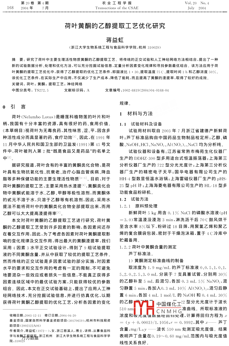 第20卷第4期農(nóng)業(yè)工程學(xué)報Vol 201682004年Transactions of the CSAF荷葉黃酮的乙醇提取工藝優(yōu)化研究蔣益虹(浙江大學(xué)生物系統(tǒng)工程與食品科學(xué)學(xué)院,杭州310029)摘要:研究了荷葉中主要生理活性物質(zhì)黃酮的乙醇提取工藝。將傳統(tǒng)的正交試驗和人工神經(jīng)網(wǎng)絡(luò)方法相結(jié)合,提岀了一種新的試驗數(shù)據(jù)分析、處理和優(yōu)化方法,可以充分挖掘試驗信息,定量分析因素變化規(guī)律和尋找參數(shù)最優(yōu)組合。該方法應(yīng)用于葉黃酮的提取工藝優(yōu)化中,獲得了乙醇提取的優(yōu)化工藝條件,即固液比1:30、提取溫度75C、提取時間1h和乙醇濃度50%該優(yōu)化工藝條件,在實際生產(chǎn)中應(yīng)用,不僅減少了生產(chǎn)成本,降低了能耗,而且提高了黃酮的浸提率,取得了較好的成效。關(guān)鍵詞:荷葉;黃酮;提取工藝;神經(jīng)網(wǎng)絡(luò)中圖分類號:TS272.5文獻(xiàn)標(biāo)識碼:A文章編號:1002-6819(2004)04-0168-04規(guī)律。0引言荷葉( Nelumbo lotus)是睡蓮科植物蓮的葉片和葉材料與方法柄,我國有十分豐富的資源,具有很好的藥、食用價值。1.1試驗材料及設(shè)備《本草綱目》視荷葉為無毒良藥,其性味苦、澀、平,因含多試驗用材料取自2003年7月浙江省建德產(chǎn)新鮮荷種活性成分而具顯著的藥、食療功效η。因此,在1991年葉;蘆丁標(biāo)準(zhǔn)品購自中國藥品生物制品檢定所;乙醇、磷11月中華人民共和國衛(wèi)生部的衛(wèi)監(jiān)發(fā)(1991)第45號文酸、NaOH、HCl、NaNO2、Al(NO3)3、NaCl均為分析純。件中,荷葉被列入第2批“既是食品又是藥品”的名單之試驗儀器和設(shè)備有:江蘇省常熟市梅苑生化儀器廠生產(chǎn)的DDHZ-30型多用途臺式恒溫振蕩器;上海第三據(jù)研究報道,荷葉含有的豐富的黃酮類化合物,是荷分析儀器廠生產(chǎn)的722型分光光度計;上海第三分析儀葉具有生物抗氧化性、抗衰老、治療心腦血管疾病、降血器廠生產(chǎn)的精密電子天平;國華電器有限公司生產(chǎn)的脂等多種保健功能的主要生理活性物質(zhì)3ˉ。目前,對于HH-4型數(shù)顯恒溫水浴鍋;上海雷磁儀器廠生產(chǎn)的pHS荷葉黃酮的提取工藝,主要采用熱水浸提,黃酮類化合25型pH計;上海海菱電器有限公司生產(chǎn)的HL-18型多物中黃酮甙能溶于水、乙醇、甲醇等極性溶劑,而黃酮體功能食品粉碎機(jī)的甙元不溶于水,只溶于乙醇等有機(jī)溶劑因此,采用水1.2試驗方提法不能將荷葉中的黃酮類化合物全部提取出來,而用1.2.1原料預(yù)處理乙醇可以大大提高浸提得率7新鮮荷葉5kg用含0.1%NaCl的磷酸水溶液(pH本文對荷葉黃酮的乙醇提取工藝進(jìn)行研究,荷葉黃3.0)常溫浸沒浸泡3min,淋洗瀝干后70C鼓風(fēng)烘干酮的乙醇提取工藝受到許多因素的影響,各因素間還存至含水率8%以下,粉碎過18目篩,用聚氯乙烯和聚乙在著交互作用,因此,為了考慮各因素對荷葉黃酮提取影烯的復(fù)合膜袋包裝,密封于干燥泡沫箱,置于4C冷庫中響的變化規(guī)律及交互作用,得出最大的黃酮漫提率,我們貯藏備用采用4因素3水平正交試驗設(shè)計,得到了9組試驗提取1.2.2荷葉中黃酮含量的測定液的不同黃酮含量,并從中獲取了較優(yōu)的提取工藝條件蘆丁標(biāo)準(zhǔn)法然而傳統(tǒng)的正交試驗是多因素試驗的部分實施,對因素1)黃酮測定標(biāo)準(zhǔn)曲線的制備水平的要求和交互作用的考慮有一定的限制,不可避免取濃度為1.9mg/mL的蘆丁標(biāo)準(zhǔn)液0、0.5、1.0、1.地要混雜一些效應(yīng)或者損失一些信息,不能真正獲得多5、2.0、2.5、3.0mL分裝于7支具塞試管,分別用30%因素連續(xù)區(qū)域中的最優(yōu)試驗方案,只能獲得較優(yōu)的參數(shù)的乙醇補(bǔ)至5mL后混勻,各加0.3mL5%NaNO2,混組合。因此,本文在正交試驗基礎(chǔ)上,提出了應(yīng)用人工神勻靜置5min,各加入0.3mL10%Al(NO3)3,混勻后靜經(jīng)網(wǎng)絡(luò)技術(shù),充分挖掘試驗信息,并進(jìn)行仿真優(yōu)化,以期置6min,各加4mL1mol/L的NaOH和0.4mL.30%獲得荷葉黃酮乙靜提取的優(yōu)化工藝,分析備因素的變化乙醇7中國煤化工2型分光光度計于波長510nnCNMHG準(zhǔn)曲線。所取標(biāo)準(zhǔn)液的收稿日期:2003-12-11修訂日期:2004-04-20濃度和度恒數(shù)據(jù)砼凹?xì)w處理,計算得回歸方程為x基金項目:國家自然科學(xué)基金資助項目(30170659);杭州市科技局資=(y+0.0003)/1.1056,r=0.9992,其中x蘆丁助項目(2002122A06)作者簡介:蔣益虹(1972-),女,浙江慈溪人,博土,講師,從事食品科含量,mg/L-:y—波長510mm處測定吸光度值。結(jié)果學(xué)與發(fā)藪據(jù)浙江杭州浙江大學(xué)生物系統(tǒng)工程與食品科學(xué)學(xué)表明蘆丁含量在0.19~0.60mg/mL范圍內(nèi)與吸光度值院,31002線性關(guān)系良好第4期蔣益虹:荷葉黃酮的乙醇提取工藝優(yōu)化研究1692)荷葉中黃酮含量的測定BDA3C1,即固液比為1:40,提取溫度為90C,提取時稱取5g荷葉粉末,放入圓底燒瓶中加入一定量一間為1h,乙醇濃度為50%。定濃度的乙醇溶液(乙醇數(shù)量和濃度由正交試驗安排而2.2最優(yōu)黃酮提取工藝的確定定),圓底燒瓶上接40cm冷凝管,在一定溫度下,冷凝回2.2.1人工神經(jīng)網(wǎng)絡(luò)模型的應(yīng)用流浸提后過濾,用測定標(biāo)準(zhǔn)曲線的方法處理樣品,在722人工神經(jīng)網(wǎng)絡(luò)與傳統(tǒng)正交試驗方法相結(jié)合,通過對型分光光