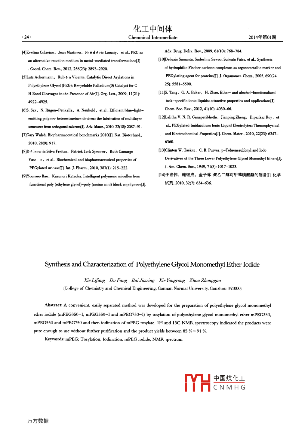 化工中間體20Chenmical Intermediate2014年第01期科研開發(fā)碘代聚乙二醇單甲醚的合成及表征謝莉芳杜帆白家興謝永蒙周中高(贛南師范學(xué)院化學(xué)化工學(xué)院,贛州341000)摘要:碘代聚乙二醇單甲醚(mPEG350-1,mPEG550-1與mPEG750-D是由聚乙二醇單甲醚(mPEG350,mPEG50和mPE750)先后經(jīng)磺酰化、碘化得到,優(yōu)化后合成過程簡單,無須柱層析提純即可得高純度產(chǎn)物,收率85%-91%,結(jié)構(gòu)經(jīng)1H、13CNMR表征關(guān)鍵詞:聚乙二醇單甲醚磺?;饣獯垡叶紗渭酌押舜殴舱裰袌D分類號:06242文獻(xiàn)標(biāo)識碼:A文章編號T1672-8114201401-020-05聚乙二醇(PEG)及聚乙二醇單甲醚(mPEG)類mPEG750)為原料,經(jīng)對甲基苯磺酰化、碘化合成3個化合物因溫和無毒、良好水溶性、生理惰性等,在超聚乙二醇鏈長不同、分子量不同的碘代聚乙二醇單甲分子領(lǐng)域、催化領(lǐng)域·、界面材料領(lǐng)域、有機(jī)光電醚(mPEG350-1,mPEG550-1與mPEG750-1),兩步反器件領(lǐng)域、生物化學(xué)和制藥工業(yè)中得到廣泛應(yīng)用。應(yīng)均不使用煩瑣的柱層析提純,純化后直接進(jìn)行1H將水溶性聚乙二醇鏈引人到主體較難,因?yàn)樗?3CNMR核磁共振表征,結(jié)合文獻(xiàn)數(shù)據(jù)為目標(biāo)產(chǎn)物。反應(yīng)點(diǎn)是端位處的羥基,所以通常有直接法和間接法將聚乙二醇鏈接入到不同領(lǐng)域中。直接法如在PEG或1實(shí)驗(yàn)部分mPEG的羥基上引人氨基、羧基、醛基、鹵素等活性基1.1儀器與試劑團(tuán),但往往需要較激烈的反應(yīng)條件。在實(shí)際反應(yīng)中Bruker aⅤ ANGELl400型核磁共振儀(瑞士 Bruker為了避免副反應(yīng)的發(fā)生,通常采用間接法先將PEG或公司);聚乙二醇單甲醚(Mw=350,Mw=550,Mw=mPEG活化,因?yàn)榛罨蟮腜EG或mPEG能在溫和條750)購于 Alfa aesar公司;無水硫酸鎂、碳酸氫鈉、氯件下引入到主體中叫。其中鹵代的聚乙二醇單甲醚是制化鈉、對甲基苯磺酰氯、三乙胺、碘化鈉、氯仿、丙備多種末端功能化聚乙二醇衍生物的常用中間體,而酮和甲醇等均為國產(chǎn)市售分析純試劑。碘代聚乙二醇單甲醚是其中重要的一種12碘代聚乙二醇單甲醚(mPEG350-1,mPEG550-1本文以聚乙二醇單甲醚(mPEG350,mPEG550與與mPEG750-)的合成1.21聚乙二醇單甲醚對甲苯磺酸酯(6,mPEG750-OTs)的合成2為合成碘代聚乙二醇單甲醚(1,2和3),我們先合成了聚乙二醇單甲醚對甲苯磺酸酯4,5和6,在此以化合物6(mPE作者簡介:周中高,男,1982年11月生,漢族.講師,江西贛州人,有機(jī)化學(xué)在H中國煤化工以說明,化合物4職博士,從事不對稱合成及過渡金屬催化反應(yīng)相關(guān)研究,作為通訊作者、第一作和5的合成者已發(fā)表近二十余篇研究論文,SC收錄十余篇CNMHG第01期碘代聚乙二醇單甲醚的合成及表征OH TsCI MeOTS Nal Men Et2Nn=7 mPEG3504.n=7 mPEG350-OTS1.n=7.mPEG350n=12 mPEG5505. n=12. mPEG550-OTs 2n=12 mPEG550-In=16. mPEG7506.n=16.mPEG750-0Ts3.n=16.mPEG750-1圖1碘代聚乙二醇單甲醚(mPEG350-1,mPEG550-1與mPEG750-1的合成Figure 1 Synthesis of mPEG iodide(mPEG350-1, mPEG550-1 5 mPEG750-I)化合物6(mPEG750-0Ts)的合成:將mPEG750123碘代聚乙二醇單甲醚(2,mPEG550-)的合成(7.5g,10mmo與三乙胺(335mL,24mmo)混合于10鋁箔避光,將碘化鈉(7.5g,50mmo)加入化合物6mL二氯甲烷中,冰鹽浴下,向上述溶液中緩慢滴加15(mPEG550-0Ts)(7.03g,10mmo的20mL干燥丙酮中,mL對甲苯磺酰氯(.g,1lmo的二氯甲烷溶液,反得黃色溶液,劇烈攪拌,回流24小時,恢復(fù)到室溫,應(yīng)2小時,然后室溫下反應(yīng)過夜,向其中加入20mL二在反應(yīng)瓶壁上有黃色固體產(chǎn)生,旋干溶劑,向其中加氯甲烷,攪拌10分鐘,依次用飽和碳酸氫鈉溶液、稀人20mL二氯甲烷和15mL水,室溫下攪拌10分鐘。鹽酸(5%溶液、蒸餾水、飽和食鹽水洗。有機(jī)相用無用硫代硫酸鈉溶液(5%)洗至無色,再依次用飽和碳酸水硫酸鈉干燥,減壓旋干溶劑,得到無色無味粘稠狀氫鈉溶液、水和飽和食鹽水洗。有機(jī)相用無水硫酸鈉液體,72g,產(chǎn)率80%。 1H NMR(400MHz,CDC3,干燥,旋干有機(jī)溶劑。得到淡黃色無味黏稠狀液體8):2.45(s,3H,337(,3H),35-37brm,65H),58g,產(chǎn)率85%。1HNMR(400MHz,CDCl3,8:3.15415(t,J=4.8Hz,2H),734(d,J=82Hz,2H,779(t,J=6.8Hz,2H),3.27(s,3H,344(,J=46Hz,2(d,J=82Hz,2H).13CNMR(100MHz,CDCl,8):H,3.53-3.57(brm,44H,3.64(,J=72Hz,2Hppm21.55,58.90,68.54,69.23,70.39,70.45,70.48,13CNMR(100MHz,CDC3,8):284,58.78,69.95,70.60,71.82,127.86,12978,132.89,144.7470.24,70.31,70.40,71.67,71.69ppmo122碘代聚乙二醇單甲醚(1,mPEG350-的合成124碘代聚乙二醇單甲醚(3,mPEG750-)的合成鋁箔避光,將碘化鈉(7.5g,50mmo)加入化合物6鋁箔避光,將碘化鈉(75g,50mmo)加入化合物mPEG750-OTs)(9.03g,10mmo的20mL干燥丙酮中4(503g,10mmo)的20mL干燥丙酮中,得黃色溶液,得黃色溶液,劇烈攪拌,回流24小時,恢復(fù)到室溫,劇烈攪拌,回流24小時,恢復(fù)到室溫,反應(yīng)瓶壁上有在反應(yīng)瓶壁上有黃色固體產(chǎn)生,旋干溶劑丙酮,向其黃色固體析出,減壓旋干丙酮,向其中加入20mL二中加人20mL二氯甲烷和15mL水,室溫下攪拌10分氯甲烷和15mL蒸餾水,室溫下攪拌10分鐘。用硫鐘。用硫代硫酸鈉溶液(5%)洗至無色,再依次用飽代硫酸鈉溶液(5%洗至無色,再依次用飽和碳酸氫和碳酸氫鈉溶液、水和飽和食鹽水洗。有機(jī)相用無水鈉溶液、蒸餾水、飽和食鹽水洗。有機(jī)相用無水硫酸硫酸鈉干燥,旋干有機(jī)溶劑。得到淡黃色無味黏稠狀鈉干燥,減壓旋干有機(jī)溶劑。得到淡黃色無味黏稠狀液體,80g,產(chǎn)率91%