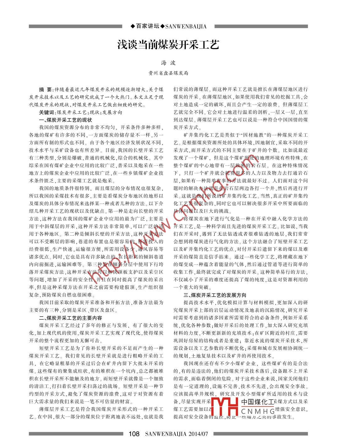 ◆百家講壇◆SANW ENBAIJIA淺談當(dāng)前煤炭開采工藝海波貴州省盤縣煤炭局.摘要:伴隨著最近幾年煤炭開采的規(guī)模逐漸增大,關(guān)于煤們常說的薄煤層。而這種開采工藝就是擅長在薄煤層地區(qū)進(jìn)行炭開采技術(shù)以及工藝的研究就成了一個大熱門。本文立足于現(xiàn)煤 炭的開采。在薄煤層地區(qū),如果使用我們常見的挖掘工具,會代煤炭開采的現(xiàn)狀,對煤炭開采工藝做出細(xì)致的研究。對土地造成一- 定的破壞,而且會產(chǎn)生- -定的浪費(fèi)。但薄煤層工關(guān)鍵詞:煤炭開采工藝;現(xiàn)狀;發(fā)展方向藝就完全不同。它會對土地進(jìn)行溫柔的剖析,- -層又一層,直至一、煤炭開采工藝的現(xiàn)狀到達(dá)煤層。薄煤層開采工藝也可以說是一種符合中國國情的煤我國的煤炭資源分布的非常不均勻,開采條件多種多樣,炭 開采方式。各地的煤礦有許多的不同,一方面煤炭的儲存量不一樣,另一礦井集約化工藝是類似于“因材施教"的-種煤炭開采工方面所有制的形式也不同。由于各個地區(qū)經(jīng)濟(jì)發(fā)展?fàn)顩r不同,藝。是根據(jù)煤炭資源所處的具體環(huán)境,因地制宜,采取不同的開技術(shù)水平與采礦設(shè)備也有所差異。目前,我國的長璧開采工藝采方式, 而開采方式的不同主要在于礦井的個數(shù)。比如說最近有三種類型.分別是爆破,普通的機(jī)械化,綜合的機(jī)械化。其中發(fā)現(xiàn)了一個煤礦,但是這個煤礦所處的地理環(huán)境有些特殊,在綜采在國有煤礦企業(yè)中應(yīng)用的比較廣泛,普采以及炮采在一-些整個煤礦 的中心地帶有一- 層致密的巖石層。在這種特殊情況地方上的煤炭企業(yè)中應(yīng)用的比較廣泛,在--些鄉(xiāng)鎮(zhèn)煤礦企業(yè)技下,只打一個礦井就會耗費(fèi)很多的人力以及物力去打通巖石術(shù)條件匱乏,主要的采煤工藝就是炮采。層,如果有一種簡單省事的方法就最好不過。人們面對這個問我國的地質(zhì)條件很特別,而且煤層的分布情況也很復(fù)雜,題時的解決辦法就是在巖石層兩邊各打一個井,然后再進(jìn)行開所以我國的采煤技術(shù)有很多,主要是看煤炭分布地區(qū)的地形以采。,這就是我們所說的礦井集約化工藝。當(dāng)然,真正的礦井集約及煤炭的具體分布情況來選擇某-種或者幾種的方法。以下介化工藝是很復(fù)雜的,同時它也可以解決很多開采中所要面臨的紹幾種開采工藝的現(xiàn)狀以及優(yōu)缺點(diǎn)。第一種是走向長壁的開采具體問題以及巨大的挑戰(zhàn)。方法,這種方法在我國的煤礦企業(yè)中應(yīng)用的最為廣泛,主要是將煤炭在地下進(jìn)行氣化是一種在開采中融人化學(xué)方法的用于中斜煤層的開采,這種開采方法非常簡單,可以廣泛的適開采工藝 ,是一種科學(xué)而且先進(jìn)的煤炭開采工藝。比如說,當(dāng)我用于各種地區(qū)。第二種是傾斜長壁的開采方法,這種開采方法們在開采時,遇到了無法鉆透或者很難鉆透的地層,我們常??梢圆皇軘鄬拥挠绊?巷道的布置也是很容易的,所需投入的會 想到將煤炭進(jìn)行氣化的方法。這個方法融合了短壁開采工藝經(jīng)費(fèi)很低,生產(chǎn)快速,運(yùn)輸很方便,所需用設(shè)備少,通風(fēng)容易等以及礦 井集約化工藝的優(yōu)點(diǎn),對付開采后遺留下來的煤以及難諸多優(yōu)點(diǎn)。同時,它也是具有許多缺點(diǎn)的,在長距離的傾斜巷道開采的煤簡直是信手拈來。通過一些化學(xué)工藝,將埋藏在地下內(nèi)向前掘進(jìn),運(yùn)輸困難等。第三種是在傾斜分層中使用下行垮的煤變成一 種蘊(yùn) 含著能量的氣體,然后通過管道等進(jìn)行簡單的落開采煤炭方法,這種開采方法可以解決頂板支護(hù)以及采空區(qū)收集工作,最終就完成了對煤炭的開采。這種簡單易行的方法,等問題,增加了開采的安全性,并且在同時提高了煤炭的采出不僅減小了開采的難度還提高了煤的純度,這是對資源利用的率,但是這種采煤方法在開采之前需要構(gòu)建假頂,生產(chǎn)組織很一個重大的突破。復(fù)雜,預(yù)防煤炭自燃也很困難。三、煤炭開采工藝的發(fā)展方向我國目前采取的煤炭開采準(zhǔn)備和開拓方法,準(zhǔn)備方法最為提高技術(shù)水平,優(yōu)化模擬計(jì)算與材料模擬,更加深人的研主要的有三種,分別是采區(qū)、帶區(qū)及盤區(qū)。究煤炭開采上部的巖層運(yùn)動情況及地表的沉陷情況,研究開采二、煤炭開采工藝的主要內(nèi)容時需要考慮到的諸多因素所需要符合的必備條件,例如開采系煤炭開采工藝經(jīng)過了多年的修正與發(fā)展,有了很大的變統(tǒng),優(yōu)化各種參數(shù);做好開采后的處理工作,加大深入研究充填化,加上現(xiàn)代機(jī)的使用,煤炭開采工藝實(shí)現(xiàn)了現(xiàn)代化,使得煤炭材 料的力度,不斷更新新的充填技術(shù);在礦區(qū)附近的村莊,需要開采的整個流程更加的無懈可擊。鞏固好房屋的結(jié)構(gòu)或者是重建;靠近水流的煤炭開采技術(shù),所短壁開采工藝是為了彌補(bǔ)長壁開采的不足而產(chǎn)生的一種需設(shè)備以及工藝參數(shù)的不斷優(yōu)化;采煤和城市發(fā)展相協(xié)調(diào)統(tǒng)一煤炭開采工藝。我們常見的長壁開采就是進(jìn)行粗略開采的工的 規(guī)劃,土地復(fù)墾技術(shù)以及礦井的再使用技術(shù)。