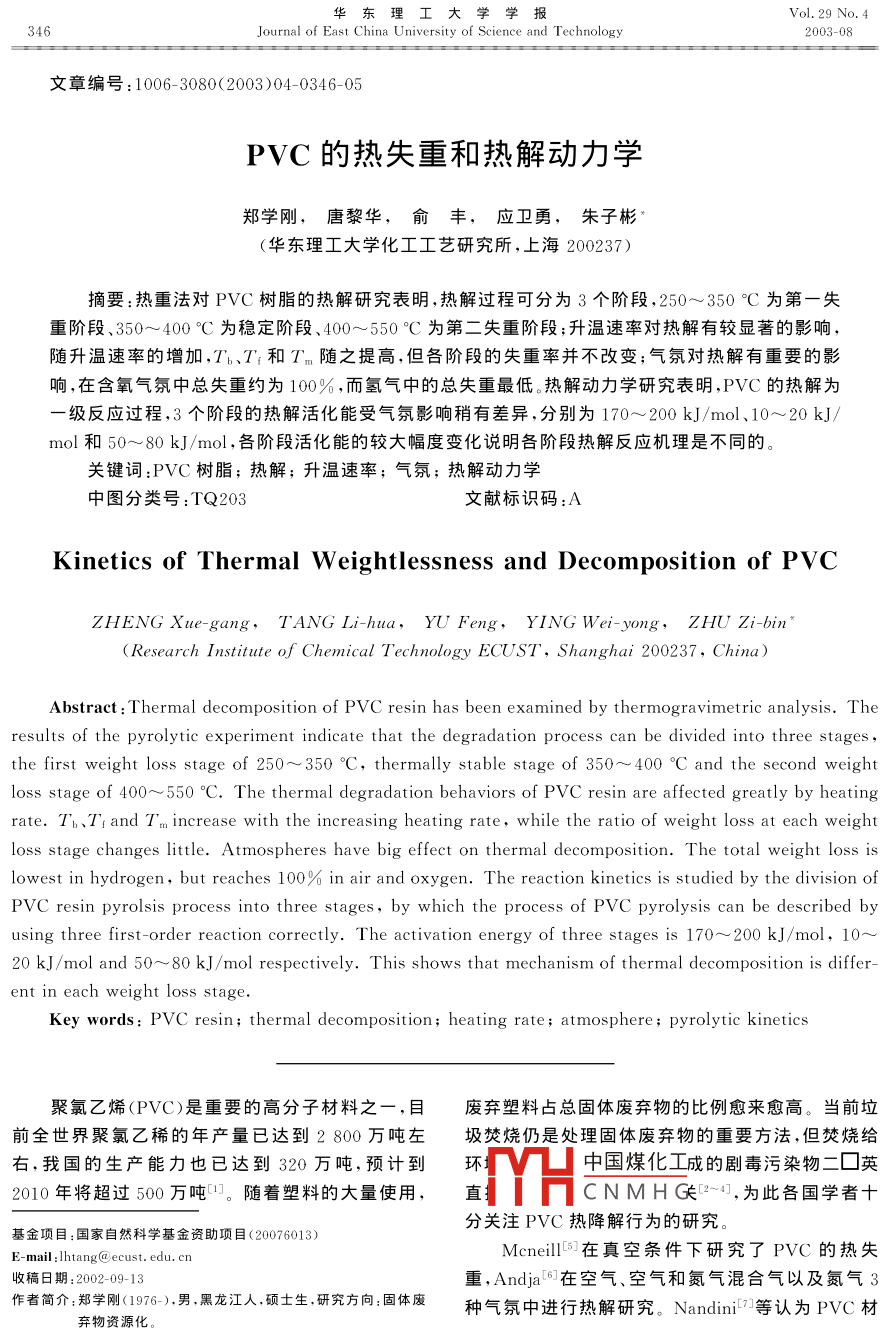 華東理工大學(xué)學(xué)報Vol 29 No 4Journal of East China University of Science and Technology2003-08文章編號:1006-3080(2003)04-0346-05PⅤC的熱失重和熱解動力學(xué)鄭學(xué)剛,唐黎華,俞豐,應(yīng)衛(wèi)勇,朱子彬華東理工大學(xué)化工工藝研究所,上海200237)摘要:熱重法對PⅤC樹脂的熱解研究表明,熱解過程可分為3個階段,250~350°C為第一失重階段、350~400℃為穩(wěn)定階段、400~550℃C為第二失重階段;升溫速率對熱解有較顯著的影響,隨升溫速率的增加,Tb、T'和T~隨之提高,但各階段的失重率并不改變;氣氛對熱解有重要的影響,在含氧氣氛中總失重約為100%,而氫氣中的總失重最低。熱解動力學(xué)研究表明,PVC的熱解為級反應(yīng)過程,3個階段的熱解活化能受氣氛影響稍有差異,分別為170~200kJ/mol、10~20kJ/mol和50~80kJ/mol,各階段活化能的較大幅度變化說明各階段熱解反應(yīng)機(jī)理是不同的關(guān)鍵詞:PVC樹脂;熱解;升溫速率;氣氛;熱解動力學(xué)中圖分類號:TQ203文獻(xiàn)標(biāo)識碼Kinetics of Thermal Weightlessness and Decomposition of PvcZHENG Xue-gang, TANG Li-hua, YU Feng, YING Wei-yong, ZHU Zi-bin(Research Institute of Chemical Technology ECUsT, Shanghai 200237, China)Abstract: Thermal decomposition of Pvc resin has been examined by thermogravimetric analysis. Theresults of the pyrolytic experiment indicate that the degradation process can be divided into three stagesthe first weight loss stage of 250-350C, thermally stable stage of 350-400C and the second weightloss stage of 400-550C. The thermal degradation behaviors of Pvc resin are affected greatly by heatingrate. Tb, TI and T,m increase with the increasing heating rate, while the ratio of weight loss at each weightloss stage changes little. Atmospheres have big effect on thermal decomposition. The total weight loss islowest in hydrogen, but reaches 100% in air and oxygen. The reaction kinetics is studied by the division ofPVC resin pyrolsis process into three stages, by which the process of Pvc pyrolysis can be described byusing three first-order reaction correctly. The activation energy of three stages is 170-200 kJ/mol, 1020 kJ/mol and 50-80 kJ/mol respectively. This shows that mechanism of thermal decomposition is different in each weight loss stageKey words PVC resin; thermal decomposition; heating rate; atmosphere; pyrolytic kinetics聚氯乙烯(PVC)是重要的高分子材料之一,目廢棄塑料占總固體廢棄物的比例愈來愈高。當(dāng)前垃前全世界聚氯乙稀的年產(chǎn)量已達(dá)到2800萬噸左圾焚燒仍是處理固體廢棄物的重要方法,但焚燒給右,我國的生產(chǎn)能力也已達(dá)到320萬噸,預(yù)計到環(huán)H中國煤化工成的劇毒污染物二囗英2010年將超過500萬噸。隨著塑料的大量使用,直CNMHG2-4,為此各國學(xué)者十基金項目:國家自然科學(xué)基金資助項目(20076013)分關(guān)注PⅤC熱降解行為的研究E-mail:litang@ecust.edu.cnMcneill在真空條件下研究了PVC的熱失收稿日期:2002-09-13重,Anda6在空氣、空氣和氮氣混合氣以及氮氣3作者簡介:鄭學(xué)剛(1976-),男黑龍江人碩士生研究方向:固體廢種氣氛中進(jìn)行熱解研究。 Nandinia等認(rèn)為PVC材棄物資源化第4期鄭學(xué)剛等:PⅤC的熱失重和熱解動力學(xué)347料的熱解過程分為4個階段,而 Salovey在氮氣氛應(yīng),隨著大量HCl的生成,在PVC大分子鏈上形成的研究中將其熱解確定為兩個過程,但 Hirschler些相鄰的多烯烴鏈段,從而生成少量的環(huán)烷烴和采用熱重法在氧氣、空氣以及氮氣中研究后,認(rèn)為苯等芳香族化合物3。第二失重階段表現(xiàn)為一些結(jié)PⅤC的熱解經(jīng)歷3個失重階段。由于PVC熱解過構(gòu)的重整,如少量HCl的生成、同分異構(gòu)化、交聯(lián)和程極為復(fù)雜,對熱解階段的劃分各不相同,而氣氛對芳香化等熱失重影響的研究尚不充分。此外對PVC熱解動力學(xué)的研究更少見報道, talaminil報道了第一失重階段PⅤC的熱解動力學(xué)行為,認(rèn)為氮、氧氣氛中的熱解為1.5級反應(yīng),而氨氣中的活化能大于氧氣氛但研究的溫度范圍甚窄。近年馬師白等-研究了氮氣氛中第一階段的脫氯動力學(xué)本研究是在常溫至600℃C的寬溫度范圍內(nèi),采用熱天平考察PVC樹脂的熱失重行為、升溫速率對2.0200300400500600熱失重的影響、氣氛與熱失重的關(guān)系以及熱失重的特征參數(shù)等,同時還對氮、氫、空氣和氧氣等多種氣氛中的熱解進(jìn)行了研究,以及分別對兩個階段PVC圖1PVC樹脂熱失重與溫度的關(guān)系的熱失重動力學(xué)進(jìn)行研究。The relation between temperatureweight loss of Pvc resin1實驗部分2.2升溫速率的影響實驗分別在4種氣氛中考察了5、10、20以及實驗采用程序升溫?zé)崽炱絻x(上海分析儀器廠30"℃/min升溫速率對PVC樹脂熱解的影響。圖RT-2P型)進(jìn)行熱解失重的研究,選用PVC樹脂是在氮氣中不同升溫速率下PVC樹脂熱失重曲線為200目以下粉末(上海氯堿總廠),試樣用量約8圖。由TG、DTG曲線可知,升溫速率對熱失重有較mg,氣體流量為100mL/min,升溫速率分別為5、大的影響,隨著升溫速率的增加,TG曲線移向高溫10、20和3o℃/min,且分別于氮氣、氫氣、空氣和氧區(qū),DTG曲線最高峰的位置也向右偏移,峰高增加氣等氣氛中考察PVC樹脂的熱解行為相應(yīng)最大失重速率也提高。表1是在4種氣氛中熱失重率計算:失重率(X)=(試樣失重(W)/試解的特征參數(shù)值。由表可知隨著升溫速率的提高樣重量(W))×100%第一失重階段和第二失重階段Tn都增大,同時,T和T都相應(yīng)地上升。雖