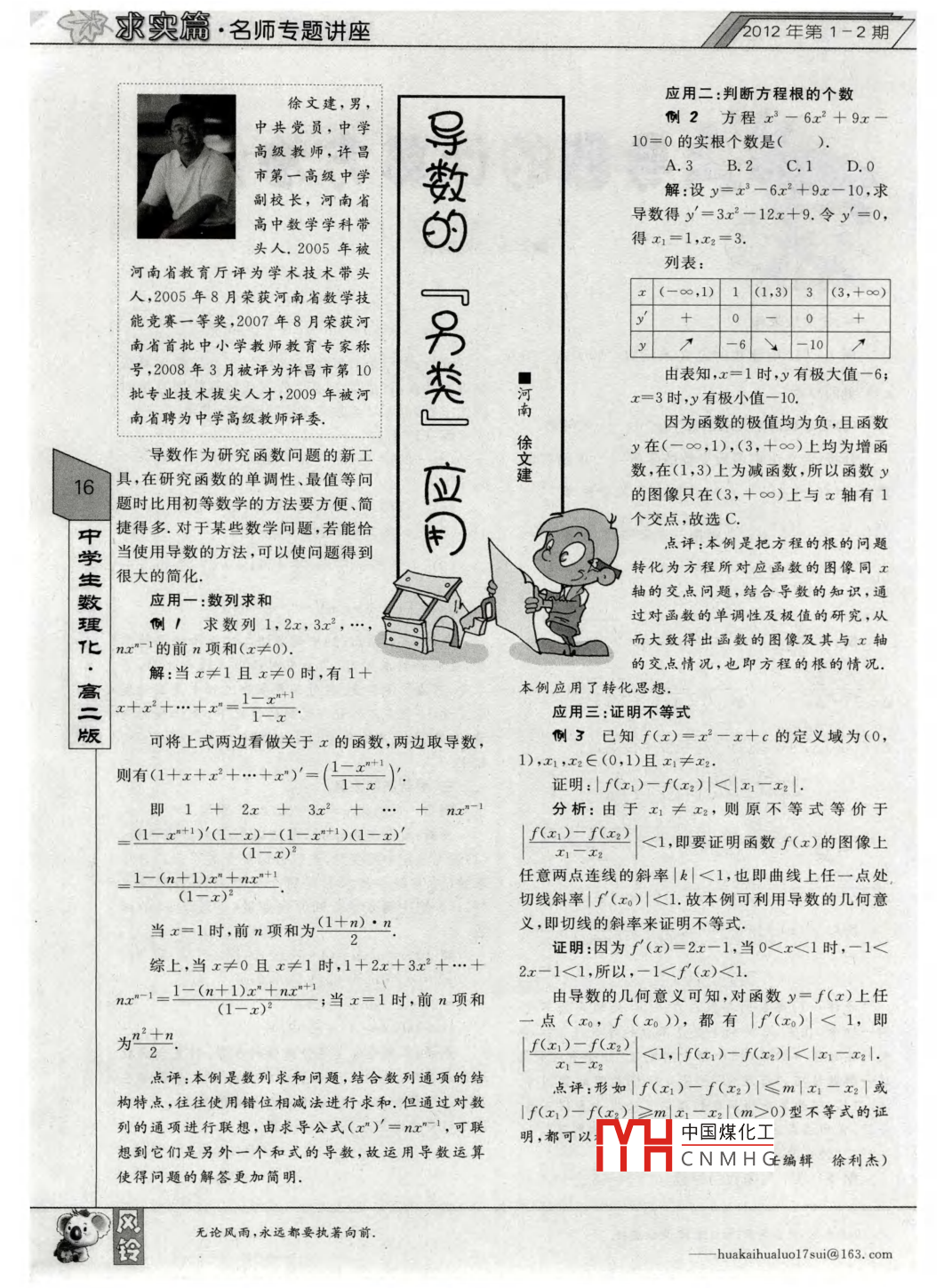游求奧筒·名師專題講座02年第1用徐文建,男應(yīng)用二:判斷方程根的個數(shù)中共黨員,中學例2方程x3-6x2+9x高級教師,許昌市第一高級中學導數(shù)的10=0的實根個數(shù)是()B.2C.D.0副校長,河南省解:設(shè)y=x3-6x2+9x-10,求高中數(shù)學學科帶導數(shù)得y=3x2-12x+9.令y=0,頭人,2005年被得x1=1,x2=3.河南省教育廳評為學術(shù)技術(shù)帶頭列表:人,2005年8月榮獲河南省數(shù)學技x(-∞,1)1(1,3)3(3,+∞能竟賽一等獎,2007年8月榮獲河南省首批中小學教師教育專家稱號,2008年3月被評為許昌市第10另類由表知,x=1時,y有極大值-6;批專業(yè)技術(shù)拔尖人才,2009年被河x=3時,y有極小值-10.南省聘為中學高級教師評委因為函數(shù)的極值均為負,且函數(shù)導數(shù)作為研究函數(shù)問題的新工河南徐文建y在(-∞,1),(3,+∞)上均為增函16具,在研究函數(shù)的單調(diào)性最值等問數(shù),在(1,3)上為減函數(shù),所以函數(shù)題時比用初等數(shù)學的方法要方便、簡的圖像只在(3,+∞)上與x軸有1中捷得多對于某些數(shù)學間題,若能恰個交點,故選C.學|當使用導數(shù)的方法,可以使問題得到作點評;本例是把方程的根的問題生很大的簡化轉(zhuǎn)化為方程所對應(yīng)函數(shù)的圖像同工數(shù)|應(yīng)用一:數(shù)列求和軸的交點問題,結(jié)合導數(shù)的知識,通例求數(shù)列1,2x,3x2,過對函數(shù)的單調(diào)性及極值的研究,從化|nx”1的前n項和(x≠0)而大致得出函數(shù)的圖像及其與x軸解:當x≠1且x≠0時,有1+的交點情況,也即方程的根的情況二x+x2+…+x-=1-x"本例應(yīng)用了轉(zhuǎn)化思想應(yīng)用三:證明不等式版可將上式兩邊看做關(guān)于x的函數(shù),兩邊取導數(shù),例3已知f(x)=x2-x+c的定義域為(0,1),x1,x2∈(0,1)且x1≠x2則有(1+x+x2+…+x")’=證明:f(x1)-f(x2)|<|x1-x2|.即1+2x+分析:由于x1≠x2,則原不等式等價于(1-xn+1)(1-x)-(1-xx+1)(1-x)f(x1)-f(x2)即要證明函數(shù)f(x)的圖像上1-(n+1)x”+nxn+1任意兩點連線的斜率|k<1,也即曲線上任一點處(1-x)切線斜率f(x。)|<1.故本例可利用導數(shù)的幾何意當x=1時,前n項和為+n)·n義,即切線的斜率來證明不等式證明:因為f(x)=2x-1,當0