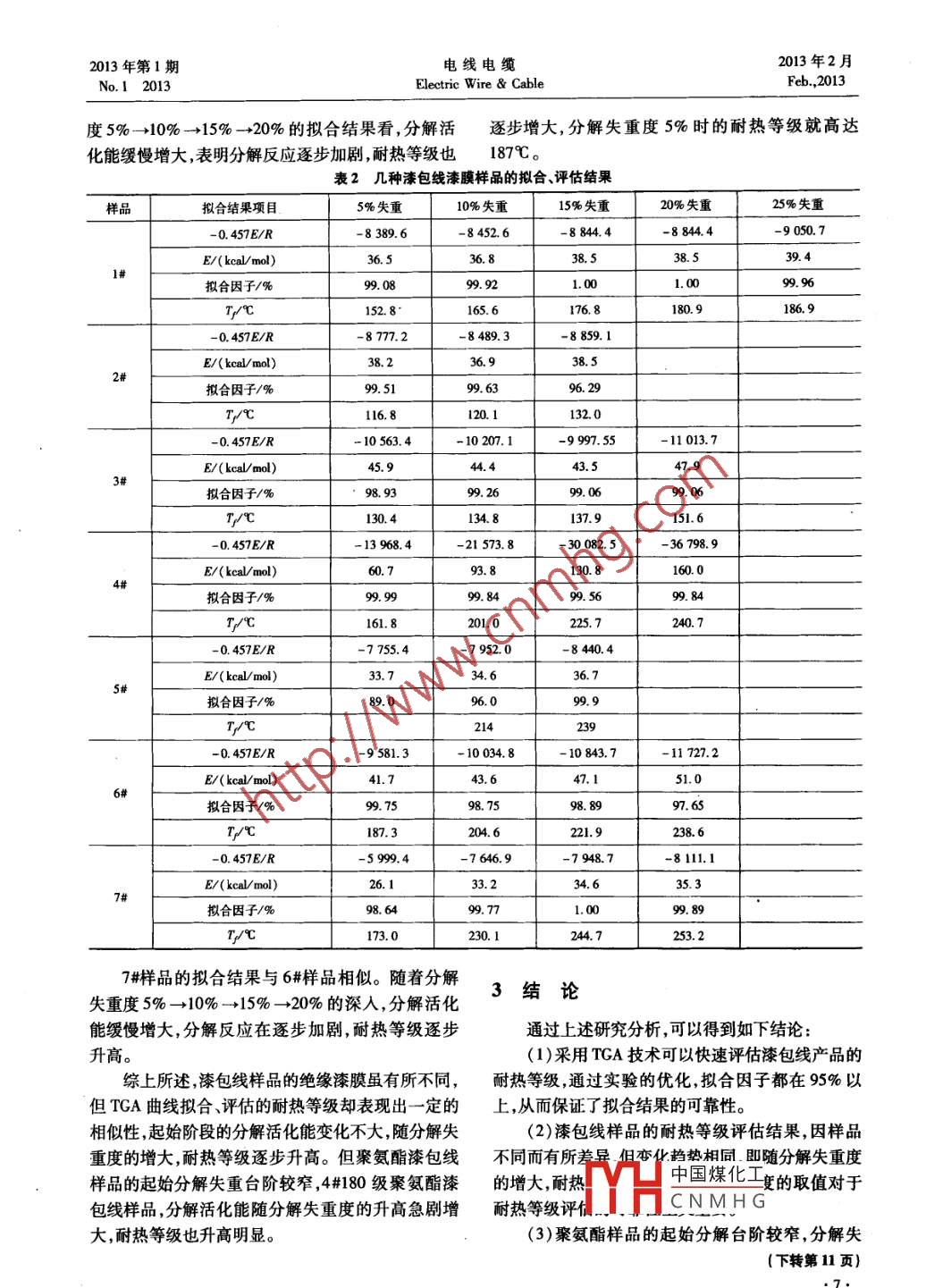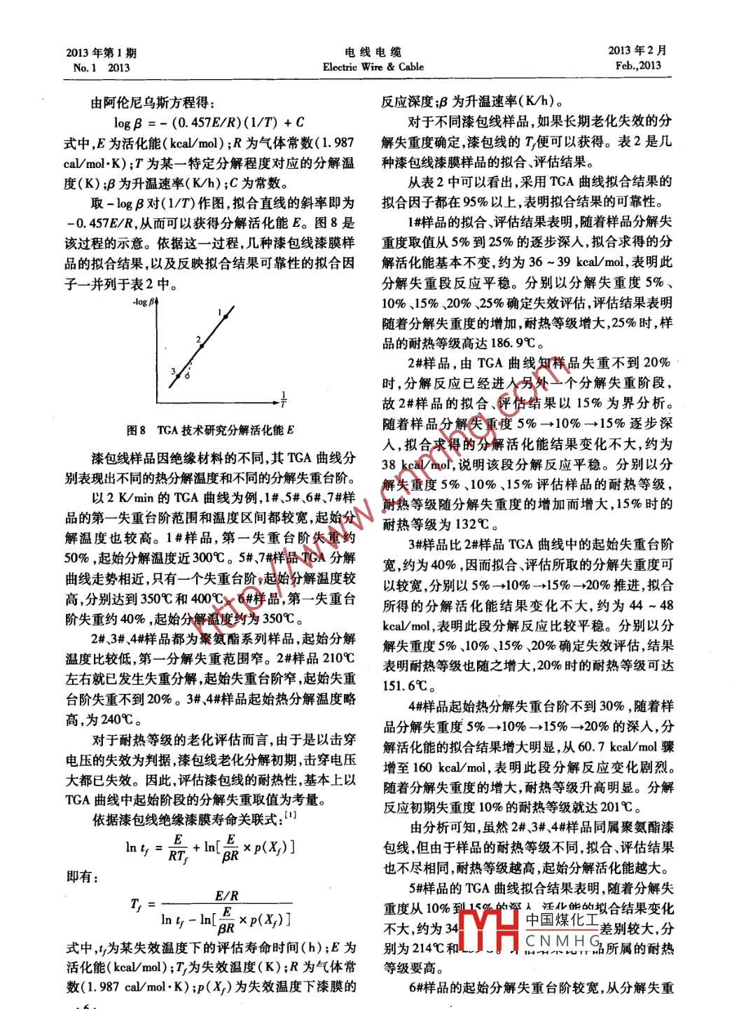 2013年第1期電線電纜2013年2月No.12013Electric Wire CableFeb,2013熱重分析技術評估漆包線耐熱性能的應用探討仲偉霞,郭蓉蓉,諸冉冉,李福(上海電纜研究所,上海200093)摘要:通過熱重分析技術快速評估幾種溱包線產(chǎn)品的耐熱性能,并探討這一技術在漆包線行業(yè)的應用。關鍵詞:漆包線;耐熱性;熱重力分析技術中圖分類號:TM245文獻標識碼:A文章編號:16724601(2013)01400040The application Discussion of the Thermal Resistance of the Enameled wire by tGaZHONG Wei-xia, GUO Rong-rong, ZHU Ran-ran, LI FuShanghai Electric Cable Research Institute, Shanghai 200093, China)Abstract The thermal resistance of some kinds of enameled wires, were quickly evaluated by TGA. Therebyapplication exploration were discussedKey words: enameled wires; the thermal resistance; TGA程確定某特定分解程度下的活化能,再利用此活化0引言能預估材料在某給定溫度或最大運行溫度下的使用漆包線廣泛應用于電力、機電、電氣設備、家用壽命。這一試驗過程盡管需要漆膜樣品至少運行三電器、電子通訊和交通等領域。隨著經(jīng)濟的發(fā)展和個不同升溫程序的TGA實驗還需進行活化能的計人民生活水平的提高,電機、電器都在朝著小型化、算,但整個試驗周期不足兩個工作日。相比于烘箱輕量化、高性能化方向發(fā)展,對漆包線的耐熱等級要老化的試驗方法,單時間優(yōu)勢就不可小覷。求也越來越高。而漆包線因?qū)Ь€外面絕緣漆膜的不1979年上海電纜研究所李傳儒等人,應用同,耐熱等級不同,具體表現(xiàn)為不同的溫度指數(shù)TGA技術及高溫單點老化試驗研究制訂了JB指標2804-1979目前,評估漆包線耐熱性能的標準有 ASTM D本文在前人工作的基礎上,采用TGA技術對不2307、IEC60172以及國標GBT4074.7(等同采用同品種的漆包線樣品進行耐熱等級的快速評估,首IEC60172),這些標準都采用烘箱長期熱老化的方次就熱分解失重度的確定對評估結(jié)果的影響進行了式評估漆包線的耐熱等級,不僅測試周期長(長達分析,進一步探討這一技術在漆包線行業(yè)的應用。不當整個評估試驗就有可能失敗。為此研究評估1試驗部分漆包線耐熱等級更為快速便捷的試驗方法,就顯得(1)試驗樣品。選用幾種漆包線產(chǎn)品進行TGA非常必要。試驗,見表1。對表1中的漆包線樣品進行漆膜剝熱重分析技術(TGA)是通過在設定的升溫程離處理,制取試驗樣品。序下,記錄材料隨溫度升高重量發(fā)生變化的一種技表1幾種漆包線樣品術,可快速評估漆包線耐熱性能。國內(nèi)外相關研究編號型號名稱報道5指出,TGA技術提供了可替代烘箱老化的QZ2/130130級聚酯漆包線試驗方法。通過取漆包線外面的絕緣層樣品采用QA2/130130級聚氨酯漆包線TGA儀器在不同的升溫速率下進行升溫老化試驗,155級聚氨酯漆包線記錄不同升溫速率的熱失重曲線,從TGA曲線上確QA-2/180180級聚氨酯漆包線定特定程度的老化分解溫度。根據(jù)阿倫尼烏斯方中國煤化工亞膠漆包線CNMH漆包線收稿日期:20120616QY(F)-2/240240級聚酰亞胺漆包線作者簡介:仲偉霞(1975-),女,工程師作者地址:上海市軍工路1000號[20003](2)儀器。TGA,TG209F1,德國耐馳公司生產(chǎn)。2013年第1期電線電纜2013年2月No.I2013Electric Wire CableFeb.2013(3)試驗。分別取1#~7#漆包線樣品的漆膜三份,8m左右,質(zhì)量相近。采用TGA分別以2K/min4K/min、6K/min的升溫速率從30℃升至600℃,在空氣氣氛下對各樣品進行熱重分解試驗丑中2結(jié)果分析與討論圖1~圖7分別是幾種漆包線漆膜樣品的TGA失重曲線。設定某一程度的分解失重度,就可以從圖中的TGA曲線上讀出各自不同的分解溫度T1、圖44#樣品的TGA曲線13溫度尸c溫度~c圖11#樣品的TCA曲線圖55#樣品的TGA曲線爾溫度~c溫度C圖22#樣品的TGA曲線圖66群樣品的TGA曲線400中國煤化工050600溫度PCCNMHG圖33#樣品的TGA曲線圖77#砰品IUA田線2013年第1期電線電纜2013年2月No.12013Electric Wire CableFeb.2013由阿倫尼烏斯方程得:反應深度B為升溫速率(K/h)。logB=-(0.457E/R)(/7+C對于不同漆包線樣品,如果長期老化失效的分式中E為活化能(ka/mol);R為氣體常數(shù)(1987解失重度確定,漆包線的T便可以獲得。表2是幾cal/moK);T為某一特定分解程度對應的分解溫種漆包線漆膜樣品的擬合、評估結(jié)果。度(K);B為升溫速率(Kh);C為常數(shù)。從表2中可以看出,采用TGA曲線擬合結(jié)果的取-lgB對(1/T)作圖擬合直線的斜率即為擬合因子都在95%以上,表明擬合結(jié)果的可靠性。0457E/R,從而可以獲得分解活化能E。圖8是1#樣品的擬合、評估結(jié)果表明,隨著樣品分解失該過程的示意。依據(jù)這一過程,幾種漆包線漆膜樣重度取值從5%到25%的逐步深入,擬合求得的分品的擬合結(jié)果,以及反映擬合結(jié)果可靠性的擬合因解活化能基本不變,約為36~39kca/mol,表明此子一并列于表2中。分解失重段反應平穩(wěn)。分別以分解失重度5%og bi10%、15%、20%、25%確定失效評估,評估結(jié)果表明隨著分解失重度的增加,耐熱等級增大,25%時,樣品的耐熱等級高達186.9℃。2#樣品,由TGA曲線知樣品失重不到20%時,分解反應已經(jīng)進入另外一個分解失重階段,故2#樣品的擬合、評估結(jié)果以15%為界分析。圖8TGA技術研究分解活化能E隨著樣品分解失重度5%→10%→15%逐步深漆包線樣品因絕緣材料的不同,其TGA曲線分入,擬合求得的分解活化能結(jié)果變化不大,約為38ka/mol,說明該段分解反應平穩(wěn)。分別以分別表現(xiàn)出不同的熱分解溫度和不同