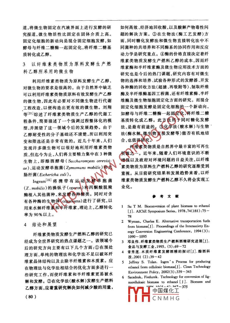 度與數(shù)酵工業(yè) and Fermentation indstries以纖維素類物質(zhì)為原料發(fā)酵生產(chǎn)燃料乙醇的研究進(jìn)展馬曉建趙銀峰祝春進(jìn)吳勇牛青川(鄭州大學(xué)化工學(xué)院,鄭州,450002)摘要燃料乙醇是清潔汽油的主要代替物。其生產(chǎn)方法根據(jù)原料區(qū)分有:糖蜜類、谷物淀粉類和纖維素類。以植物秸稈、木材等纖維素類物質(zhì)為原料生產(chǎn)乙醇是最具挑戰(zhàn)性的課題,目前用纖維素類物質(zhì)制造乙醇的關(guān)鍵問題是纖維素原料的預(yù)處理和高效的發(fā)酵工藝。文中就綜述了纖維素類物質(zhì)的發(fā)酵機(jī)制、發(fā)酵工藝和發(fā)酵方式,對進(jìn)一步實(shí)現(xiàn)工業(yè)化提供一些借鑒關(guān)鍵詞燃料乙醇,纖維素,半纖維素,木質(zhì)素,預(yù)處理目前,美國主要以玉米為原料生產(chǎn)燃料乙半纖維素是一類高度分支的雜多糖糖殘基有醇,巴西以甘蔗、糖蜜、砂糖為主要原料,日本則己糖(如D半乳糖、L半乳糖等)戊糖(D木采用農(nóng)、林產(chǎn)廢物等未利用資源直接發(fā)酵生產(chǎn)糖、L-阿拉伯糖)和糖醛酸。半纖維素的組成乙醇。2001年4月,我國河南天冠集團(tuán)公司和依原料的不同而有所差別。木質(zhì)素不是由碳水黑龍江華潤金玉實(shí)業(yè)有限公司老廠變性燃料乙化合物組成,而是由苯丙烷結(jié)構(gòu)單元組成的近醇改擴(kuò)建項(xiàng)目已相繼投產(chǎn),分別具有20萬t和似球狀的高聚體,對水解纖維素起到屏障作用10萬t生產(chǎn)能力,生產(chǎn)規(guī)模預(yù)計(jì)還會擴(kuò)大,主到目前為止,還未發(fā)現(xiàn)能利用木質(zhì)素的單聚體要以陳糧小麥、玉米等淀粉質(zhì)原料生產(chǎn)燃料乙來生產(chǎn)乙醇的微生物。醇;吉林省60萬t變性燃料乙醇新建項(xiàng)目也已1.2發(fā)酵機(jī)制經(jīng)進(jìn)入投產(chǎn)期,主要以玉米為原料;其他省市的以纖維類物質(zhì)為原料發(fā)酵生產(chǎn)燃料乙醇,燃料乙醇項(xiàng)目也在積極的籌備之中。在其發(fā)酵機(jī)制方面也有不少的研究4-6。在植物的秸桿、枝葉等纖維物質(zhì)是地球上最工業(yè)上,纖維素經(jīng)酸解、堿解或酶解預(yù)處理后,大的可再生資源,以纖維素類物質(zhì)生產(chǎn)燃料乙釋放出的葡萄糖可進(jìn)入乙醇發(fā)酵途徑。產(chǎn)纖維醇的研究越來越受到重視-3)。素酶的微生物有真菌、酵母菌和細(xì)菌。目前,人1纖維素類物質(zhì)生產(chǎn)乙醇的發(fā)酵機(jī)制們研究最多且最有工業(yè)應(yīng)用前景的是木糖發(fā)酵產(chǎn)乙醇的微生物,有管囊酵母( Pachysolen1.1纖維素類物質(zhì)tannophilus)樹干畢赤酵母( Pichia stipitis)、纖維素類物質(zhì)(秸桿、蔗渣、木材等)主要有卡爾酵母(Sac, carlsbergensis)和休哈塔假絲酵3種成分組成:纖維素,大約占干重的45%;半母( Candida shehatae)等。劉健等選育出一纖維素,占干重的30%;木質(zhì)素,占干重的株優(yōu)良的木糖發(fā)酵菌株樹干畢赤酵母菌7124,25%。還有少量的蛋白質(zhì)、灰分、淀粉等組成。利用海藻酸鈉固定化在半纖維素水解液中進(jìn)行纖維素和半纖維素可作為乙醇發(fā)酵的原料。纖了乙醇發(fā)酵的初步研究,基本達(dá)到了純木糖發(fā)維素是一種有1000~10000個(gè)葡萄糖單體以酵的效果。半纖維素組分中木糖的有效利用有β-1,4糖苷鍵連接的直鏈多糖,多個(gè)分子平行緊可能使乙醇燃料的生產(chǎn)成本大大降低。正常情密排列成絲狀不溶性微小纖維,其基本組成單況下,纖維素類物質(zhì)中微量物質(zhì)對發(fā)酵過程影位是纖維二糖,它是地球上最豐富的聚合體。響很小。纖維素類物質(zhì)的發(fā)酵機(jī)制如圖1所第一作者;碩士,教授。河南省重點(diǎn)科技攻關(guān)項(xiàng)目(No0323023000收稿時(shí)間:200429,改回時(shí)間:2004-09-10中國煤化工CNMHG(77)為主8。稀酸水解要求在高溫和高壓下進(jìn)行雄素趙萄著飛反應(yīng)時(shí)間幾秒或幾分鐘,在連續(xù)生產(chǎn)中應(yīng)用較纖維素多;濃酸水解相應(yīng)地要在較低的溫度和壓力下直接發(fā)酵進(jìn)行,反應(yīng)時(shí)間比稀酸水解長得多。由于濃酸異構(gòu)化水解中的酸難以回收,目前主要用的是前者。木糖異構(gòu)酶楊斌等9研究了硫酸和磷酸水解蔗渣的動(dòng)力類物質(zhì)直樓發(fā)酵學(xué),并建立了模型。目前生產(chǎn)中存在的主要問題就是酸解條件苛刻,對設(shè)備有腐蝕作用,需要木質(zhì)素(不能轉(zhuǎn)化為燃料乙醇)耐酸耐壓設(shè)備和解決水解產(chǎn)物對發(fā)酵微生物的圖1纖維素類物質(zhì)發(fā)酵生產(chǎn)乙醇的路線毒性問題”。堿水解也存在著與酸水解同樣的問題。2以纖維素類物質(zhì)為原料發(fā)酵生產(chǎn)燃近年來,對于纖維素酸解產(chǎn)物毒性問題的料乙醇的工藝研究取得了一定的進(jìn)展10?,F(xiàn)在,基本上明確了這種毒性是來源于酸解過程中產(chǎn)生的一些有1預(yù)處理預(yù)處理的主要目的是降低纖維素的分子質(zhì)機(jī)酸、醛類化合物。對于它們的作用機(jī)理也進(jìn)行了深入研究,并在此基礎(chǔ)上研究了相應(yīng)的各量,打開其密集的晶狀結(jié)構(gòu),以利于進(jìn)一步的分種解毒方案。但是,更加經(jīng)濟(jì)適用的解毒方案解和轉(zhuǎn)化。預(yù)處理過程中,半纖維素通常直接還有待于進(jìn)一步研究。被水解成了各種單糖(如木糖,阿拉