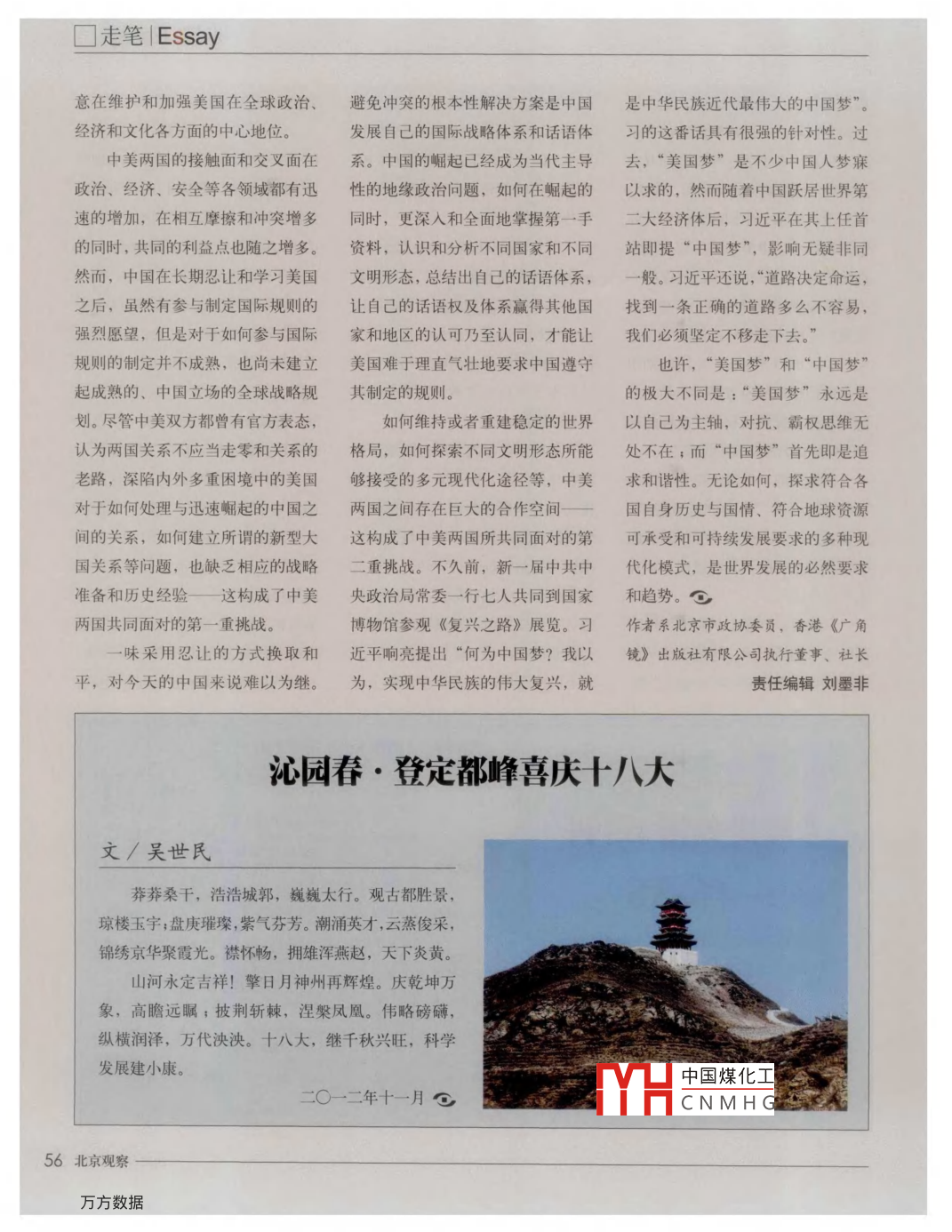 □走筆| Essay復(fù)興之路”展覽在國家博物館展出“美國夢”與“中國夢過去,“美國夢”是不少中國人夢寐以求的,然而隨著中國躍居世界第二大經(jīng)濟體后,習(xí)近平在其上任首站即提“中國夢”影響無疑非同一般文/魯薇美國的經(jīng)濟衰退一直沒有得到有效人的辯論都在向民眾進一步描繪一遏制,居高不下的失業(yè)率使得中國個所謂的事實一中國“奪走”了中美領(lǐng)導(dǎo)人在2012年11月都進議題不再僅僅是政客們?yōu)榱诉x票而美國人的就業(yè)機會;并且,這種“奪行了換屆,在未來的中美關(guān)系之中,進行的“自說自話”,民眾對中國走”的方式是“不遵守游戲規(guī)則”。沖突的可能是否大于合作呢?中美議題也開始有了前所未有的關(guān)注也就是說,中國的“不遵守游戲規(guī)則兩國之間的合作與沖突是否局限于2012年的美國總統(tǒng)大選,中國因素被宣傳為造成美國當下經(jīng)濟危機的經(jīng)貿(mào)關(guān)系呢?在不同文明的背景下,全面卷入,并首次成為總統(tǒng)候選中國煤化工兩國又面臨哪些共同的挑戰(zhàn)呢?辯論的獨立辯題。TYHCNMHG選中針對中國自2008年爆發(fā)金融危機以來,無論是奧巴馬還是羅姆尼,兩的種指貢,中國外交部部長楊潔54北京觀察走筆Essy口篪在中共十八大期間表示,他承認在羅斯福新政的基礎(chǔ)上,美國主導(dǎo)盛頓共識的“普世意義”。中美之間存在一些原則的分歧和矛設(shè)計了二戰(zhàn)后西方國際經(jīng)濟秩序。進入二十一世紀以來,美國主導(dǎo)盾,但是,在中美這樣重要的雙邊軍事上以北大西洋公約組織為依托,的“游戲規(guī)則”受到來自國內(nèi)和國際關(guān)系里,一定要摒棄“零和”概念,建立了美國領(lǐng)導(dǎo)西方世界的軍事霸兩方面的挑戰(zhàn)。中國國力上升和中國摒棄冷戰(zhàn)思維。中國商務(wù)部部長陳權(quán)乃至延續(xù)至今。經(jīng)濟保持高速增長給美國構(gòu)成了巨大德銘也認為,中美如果打貿(mào)易戰(zhàn)誰上個世紀80年代,在二戰(zhàn)后國的壓力和挑戰(zhàn)。面對中國的崛起,美都輸不起。中國對知識產(chǎn)權(quán)保護不際經(jīng)濟秩序的基礎(chǔ)之上,美國以新國難于改變其傳統(tǒng)的零和思維,力主力是美國批評最嚴厲的“不遵守游自由主義的理念和方式,對國際國以“國際游戲規(guī)則”來牽制和遏制中戲規(guī)則”的問題之一。國家知識產(chǎn)內(nèi)經(jīng)濟秩序進行了重構(gòu)。自此,美國的發(fā)展。在美看來,我們已經(jīng)付出權(quán)局局長田力普提出,中國的知識國主導(dǎo)的經(jīng)濟全球化將利伯維爾場了巨大代價來“維護世界秩序”,中產(chǎn)權(quán)保護形象被西方媒體扭曲,中經(jīng)濟奉為推動經(jīng)濟增長和繁榮的唯國在享受這種世界秩序的保護的同國是世界上支付版權(quán)費、商標使用一正確路徑。時,卻沒有履行相應(yīng)的義務(wù),所以美費、特許經(jīng)營費最多的國家之美國不僅再次主導(dǎo)國際政治經(jīng)國有理由要求中國遵守“游戲規(guī)則”。很顯然地,中國政府并不完全濟秩序的重構(gòu),而且著力于向世界為什么美國如此高度重視其所認同美國對其“不遵守游戲規(guī)則”推動建立華盛頓共識,把美國夢所制定和主導(dǎo)的“游戲規(guī)則”是否被的指責(zé)。進一步地說,中國對美國代表的價值觀作為一種普世的行為嚴格遵守?有別于英國的“日不落所宣稱和主張的“游戲規(guī)則”本身淮則與衡量標準進行宣傳,并在這帝國”的舊殖民統(tǒng)治,美國對外一也不完全認同。方面獲得了巨大的成功。自1989年般不采取殖民主義方式,而是以軍二戰(zhàn)后,世界上只剩下美國和的蘇東劇變、前蘇聯(lián)領(lǐng)導(dǎo)的社會主事霸權(quán)為保障,通過更松散的方式蘇聯(lián)兩個超級強國。這是美國從經(jīng)義陣營的崩潰后,美國贏得了意識例如利用規(guī)則制定和秩序設(shè)計等,濟強國變成政治和軍事強國的過程。形態(tài)的全面勝利,進一步增強了華對其他國家或地區(qū)進行間接控制,專題策劃·凝聚改革共識,再造改革動力鄧小平南方談話二十周年歡迎訂閱2013年中國,是否需要一次新的“南方談話”中國站在新的歷史十字路口吳敬璉馬國川當元老派成為改革家之后蕭功秦《同舟共進》刊中國與蘇俄改革戰(zhàn)略的反思再次呼喚敢闖敢冒的小平精神鄢烈山陳開枝:南巡是“老船長”的“最后一搏”郭芙秀獨家訪談葉選基講述粉碎“四人幫”與鄧小平復(fù)出程冠軍郵發(fā)代號:46-56親歷齊奧塞斯庫時代孔寒冰羅馬尼亞前駐華大使羅明夫婦訪談錄公眾話題從“哲學(xué)已死”看當下高教改革劉道玉大學(xué):如何“寧靜”,怎樣“致遠”陳平原可直接匯款到本刊發(fā)行部或到當?shù)剜]局訂閱“美國高考”一文定終身?訂閱價(含郵費)改論壇廣東“烏坎轉(zhuǎn)機”的范本意義不可低估馬立誠往事歷歷“刑場上的婚禮”與刑場外的真相劉統(tǒng)每期10元,全年120元(港澳地區(qū)300元)陳昭禮:不該被遺忘的百色起義領(lǐng)導(dǎo)人鐘兆云以史為鑒中國千年外交的空間問題袁南生地址:廣州市明月二路66號同舟共進雜志社烏龍會的烏龍事聶作平郵編:510600四海之內(nèi)1941年夏蘇軍慘敗的不解之謎述弢電話:(020)38308908肖洛霍夫:“左”“右”逢源的代價陳為人傳真:(020)38308918文化廣角馮