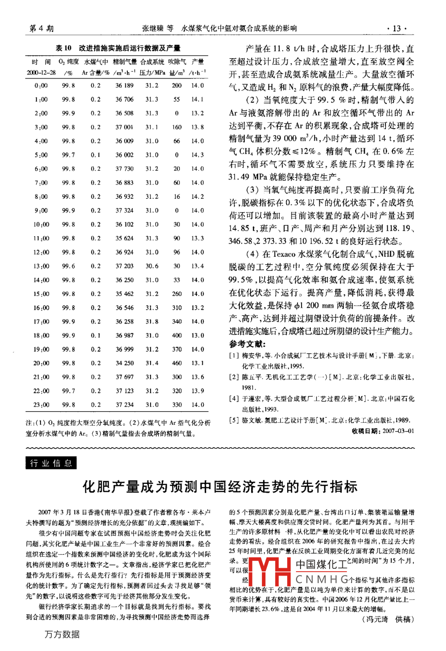 水煤漿氣化中氬對氨合成系統(tǒng)的影響