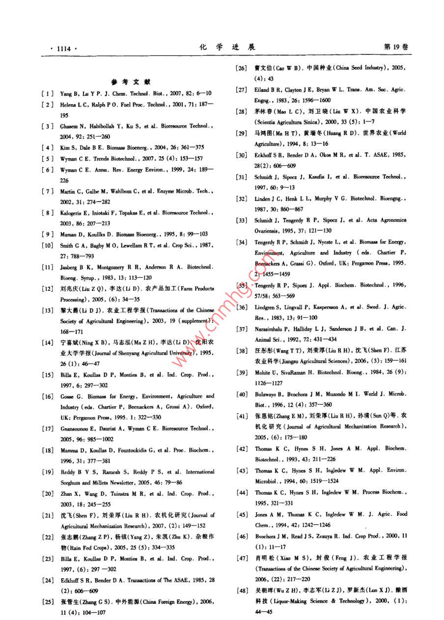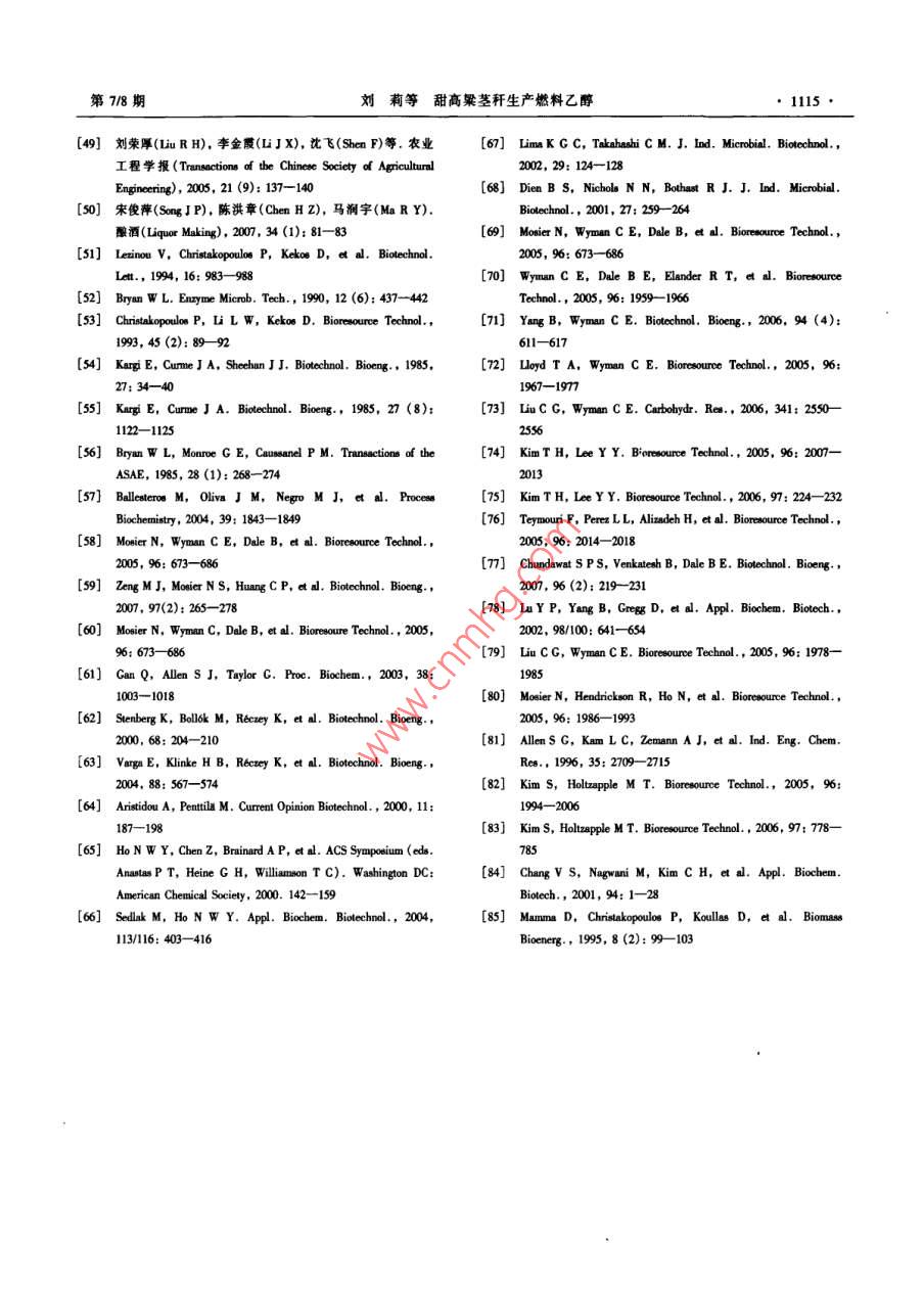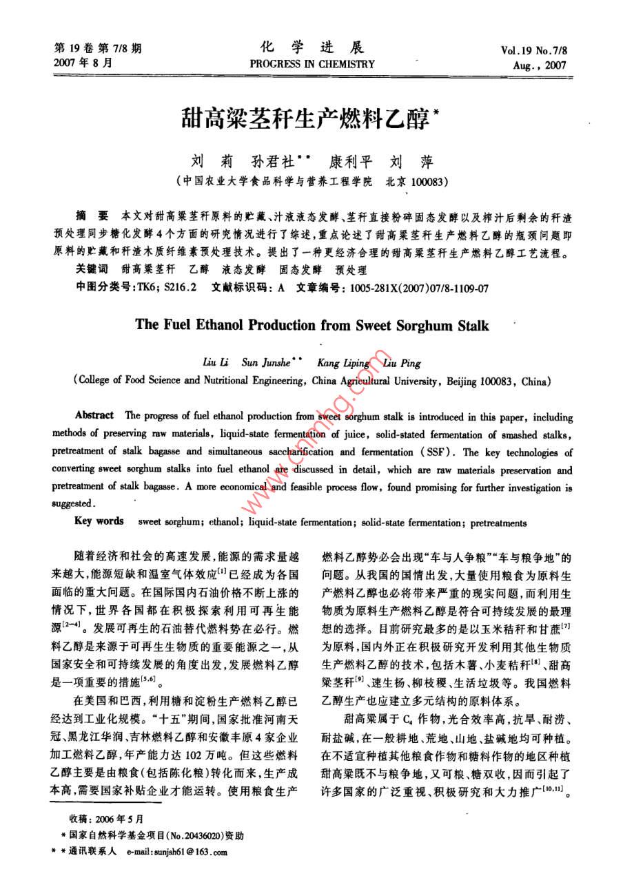 第19卷第78期化學(xué)進(jìn)展 Vol.19 No.7/82007年8月 PROGRESS IN CHEMISTRYAug.,2007甜高粱莖稈生產(chǎn)燃料乙醇劉莉?qū)O君社康利平劉萍(中國(guó)農(nóng)業(yè)大學(xué)食品科學(xué)與營(yíng)養(yǎng)工程學(xué)院北京100083)摘要本文對(duì)甜高粱莖稈原料的貯藏、汁液液態(tài)發(fā)酵、莖稈直接粉碎固態(tài)發(fā)酵以及榨汁后剩余的稈渣預(yù)處理同步糖化發(fā)酵4個(gè)方面的研究情況進(jìn)行了綜述,重點(diǎn)論述了甜高粱莖稈生產(chǎn)燃料乙醇的瓶頸問(wèn)題即原料的貯藏和稈渣木質(zhì)纖維素預(yù)處理技術(shù)。提出了一種更經(jīng)濟(jì)合理的甜高粱莖稈生產(chǎn)燃料乙醇工藝流程。關(guān)鍵詞甜高粱莖稈乙醇液態(tài)發(fā)酵固態(tài)發(fā)酵預(yù)處理中圖分類號(hào):TK6;S216.2文獻(xiàn)標(biāo)識(shí)碼:A文章編號(hào):1005-281X(2007)078-1109-07 The Fuel Ethanol Production from Sweet Sorghum Stalk Liu Li Sun Junshe"' Kang Liping Liu Ping (College of Food Science and Nutritional Engineering, China Agricultural University, Beijing 100083, China) Abstract The progress of fuel ethanol production from sweet sorghum stalk is introduced in this paper, including methods of preserving raw materials, liquid-state fermentation of juice, solid-stated fermentation of smashed stalks, pretreatment of stalk bagasse and simultaneous saccharification and fermentation (SSF). The key technologies of converting sweet sorghum stalks into fuel ethanol are discussed in detail, which are raw materials preservation and pretreatment of stalk bagasse. A more economical and feasible process flow, found promising for further investigation is suggested. Key words sweet sorghum; ethanol; liquid-state fermentation solid-state fermentation; pretreatments隨著經(jīng)濟(jì)和社會(huì)的高速發(fā)展,能源的需求量越燃料乙醇勢(shì)必會(huì)出現(xiàn)“車與人爭(zhēng)糧”“車與糧爭(zhēng)地”的來(lái)越大,能源短缺和溫室氣體效應(yīng)已經(jīng)成為各國(guó)問(wèn)題從我國(guó)的國(guó)情出發(fā),大量使用糧食為原料生面臨的重大問(wèn)題。在國(guó)際國(guó)內(nèi)石油價(jià)格不斷上漲的產(chǎn)燃料乙醇也必將帶來(lái)嚴(yán)重的現(xiàn)實(shí)問(wèn)題,而利用生情況下世界各國(guó)都在積極探索利用可再生能物質(zhì)為原料生產(chǎn)燃料乙醇是符合可持續(xù)發(fā)展的最理源24。發(fā)展可再生的石油替代燃料勢(shì)在必行。燃想的選擇。目前研究最多的是以玉米秸稈和甘蔗料乙醇是來(lái)源于可再生生物質(zhì)的重要能源之一,從為原料,國(guó)內(nèi)外正在積極研究開發(fā)利用其他生物質(zhì)國(guó)家安全和可持續(xù)發(fā)展的角度出發(fā),發(fā)展燃料乙醇生產(chǎn)燃料乙醇的技術(shù),包括木薯、小麥秸稈、甜高是一項(xiàng)重要的措施56粱莖稈、速生楊、柳枝稷、生活垃圾等。我國(guó)燃料在美國(guó)和巴西,利用糖和淀粉生產(chǎn)燃料乙醇已乙醇生產(chǎn)也應(yīng)建立多元結(jié)構(gòu)的原料體系。經(jīng)達(dá)到工業(yè)化規(guī)模。“十五”期間,國(guó)家批準(zhǔn)河南天甜高粱屬于C4作物,光合效率高,抗旱、耐澇、冠、黑龍江華潤(rùn)、吉林燃料乙醇和安徽豐原4家企業(yè)耐鹽堿,在一般耕地、荒地、山地、鹽堿地均可種植。加工燃料乙醇,年產(chǎn)能力達(dá)102萬(wàn)噸。但這些燃料在不適宜種植其他糧食作物和糖料作物的地區(qū)種植乙醇主要是由糧食(包括陳化糧)轉(zhuǎn)化而來(lái),生產(chǎn)成甜高粱既不與糧爭(zhēng)地,又可糧、糖雙收,因而引起了本高,需要國(guó)家補(bǔ)貼企業(yè)才能運(yùn)轉(zhuǎn)。使用糧食生產(chǎn)許多國(guó)家的廣泛重視、積極研究和大力推廣收稿:2006年5月★國(guó)家自然科學(xué)基金項(xiàng)目(No.20436020)資助通訊聯(lián)系人e-mail: e-mail: sunjsh61@163.com61@163.com1110化學(xué)進(jìn)展第19卷甜高粱同普通高粱一樣,每畝地也能產(chǎn)出200一定適合甜高粱莖稈發(fā)酵酒精的方式2500kg的糧食籽粒,但甜高粱的精華在于它畝產(chǎn)40005000g、富含18%24%糖分的莖211甜高粱莖稈貯藏目前甜高粱莖稈發(fā)酵生產(chǎn)乙醇主要是利用莖稈中的甜高粱的收割期約半個(gè)月左右,由于莖稈富含糖分,其糖分組成主要是蔗糖,最高達(dá)79%,其次是糖分,含水量高,收獲后極易受微生物感染,容易發(fā)葡萄糖和果糖,這兩種單糖含量差別不大。不同生霉?fàn)€和干化,影響酒精的后續(xù)發(fā)酵。粉碎的莖品種成分含量有所差別。甜高粱莖稈中各成分含量稈貯藏46天,糖分損失高達(dá)50%。壓榨后的汁液如表1所示。也不能長(zhǎng)時(shí)間貯存,汁液如果貯藏不好,極易酸敗,也會(huì)影響到后續(xù)的酒精發(fā)酵。在甜高粱莖稈生產(chǎn)燃表1甜高粱莖化學(xué)組分(料乙醇過(guò)程中,莖稈的貯藏問(wèn)題并沒(méi)有得到很好的 Table Chemical composition' of sweet sorghum, pith and解決,成為制約該技術(shù)發(fā)展的瓶頸。為了延長(zhǎng)加工 bark [is]周期,采取了各種措施如冷凍、莖稈去葉切成短段冷 whole sorghum pith bark藏、用塑料薄膜覆蓋并充以二氧化硫貯藏24、窖 cellulose12.48.719.2 hemicellulose 10.26.317.5藏、氣調(diào)、干燥等貯藏方法2,然而對(duì)于數(shù)量巨大的 lignin4.80.68.8甜高粱莖稈來(lái)說(shuō),這些方法不僅難以實(shí)施,更主要的 ucrose55.067.432.2g ucose3.2是大大增加了成本和能耗,因而是不可取的。3.72.4