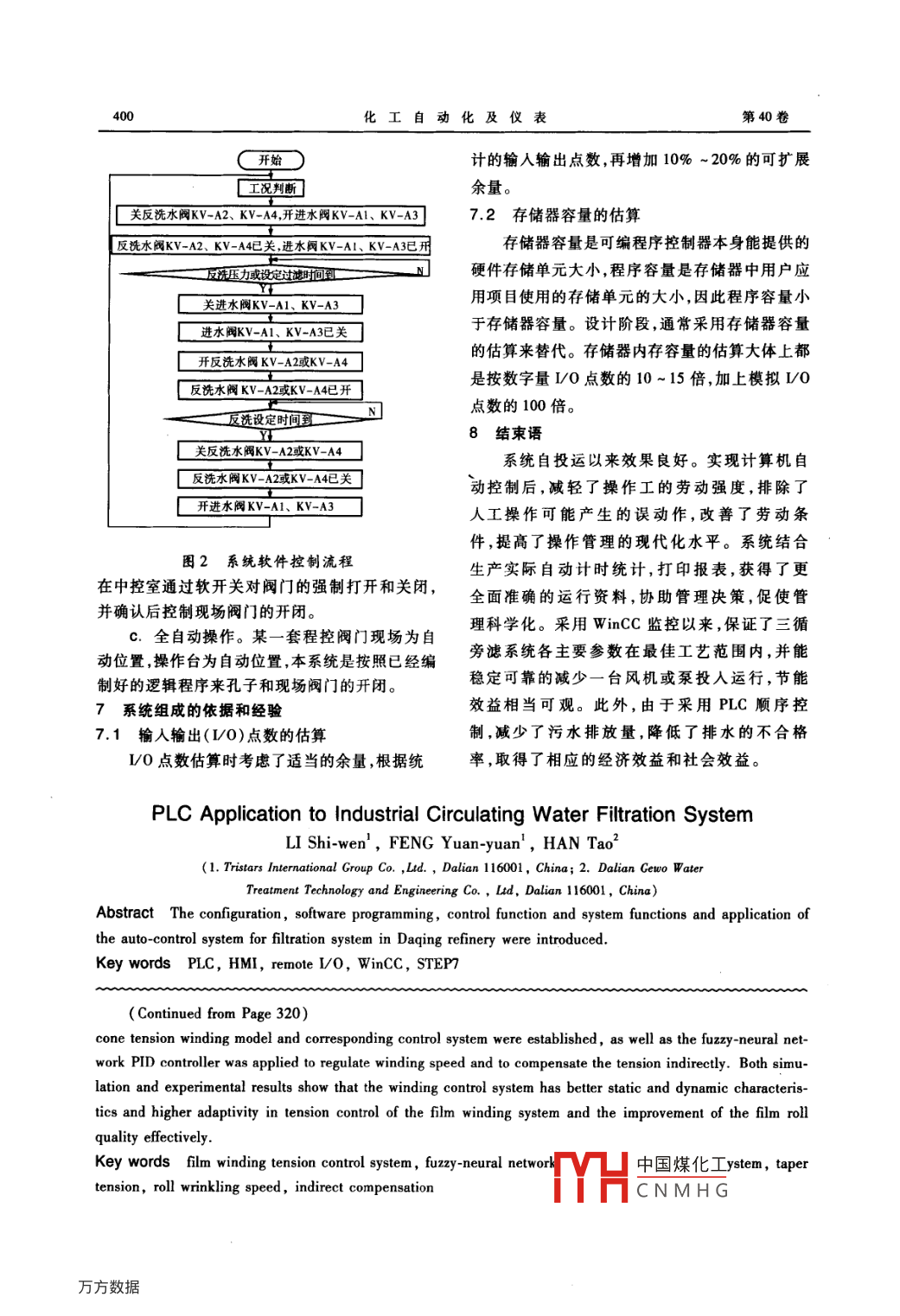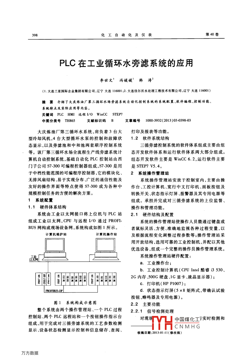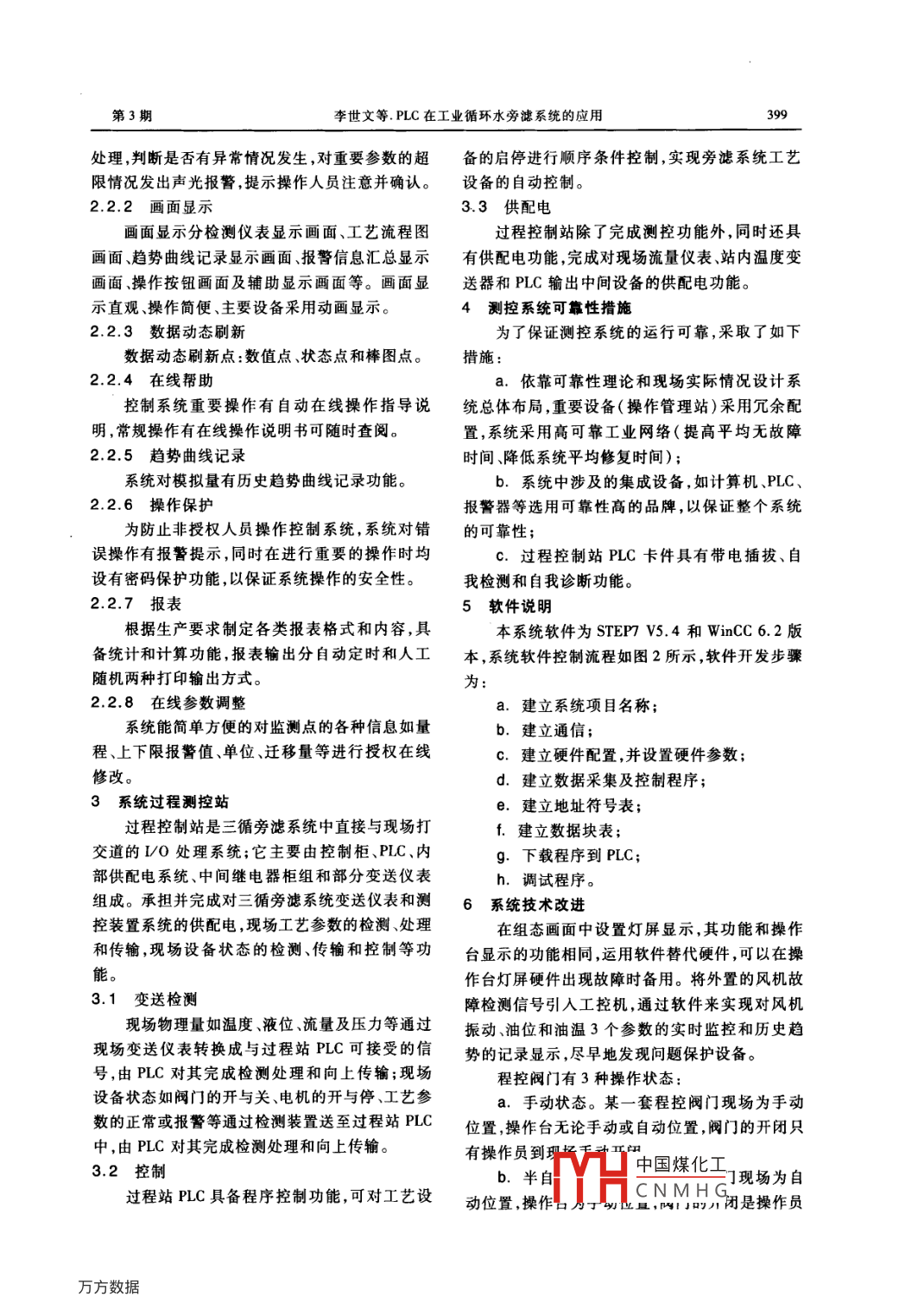 398化工自動(dòng)化及儀表第40卷PLC在工業(yè)循環(huán)水旁濾系統(tǒng)的應(yīng)用李世文馮媛媛'韓濤2(1.大連三星國(guó)際企業(yè)集團(tuán)有限公司,遼寧大連116001;2.大連佳爾沃水處理工程技術(shù)有限公司,遼寧大連116001)摘要介紹了大慶煉油廠第三循環(huán)水場(chǎng)旁濾系統(tǒng)自動(dòng)化控制系統(tǒng)的系統(tǒng)配置、軟件編程、控制功能、系純特點(diǎn)及實(shí)際應(yīng)用等內(nèi)容關(guān)鍵詞 PLC HMⅠ遠(yuǎn)程D0 WinCC STEP中圖分類號(hào)TH865文獻(xiàn)標(biāo)識(shí)碼B文章編號(hào)1000-3932(2013)0340398403大慶煉油廠第三循環(huán)水系統(tǒng),肩負(fù)著3臺(tái)大打印及報(bào)表等功能。型冷卻風(fēng)機(jī),4臺(tái)大型循環(huán)水泵的控制和故障狀12軟件系統(tǒng)結(jié)構(gòu)態(tài)顯示,以及旁濾池和中和池兩套順序控制系統(tǒng)三循旁濾控制系統(tǒng)的軟件體系組成主要由組等。該廠第三循環(huán)水場(chǎng)全流程生產(chǎn)線旁濾系統(tǒng)計(jì)態(tài)開發(fā)軟件體系和運(yùn)行軟件體系兩大部分組成。算機(jī)自動(dòng)控制系統(tǒng),基礎(chǔ)自動(dòng)化PLC控制站由西組態(tài)開發(fā)軟件主要是 Wincc6.2,運(yùn)行軟件主要門子公司S7-300可編程控制器組成,S7-300是用是STEP7V54于中檔性能范圍的可編程序控制器,它的模塊化、2系統(tǒng)操作管理站無排風(fēng)扇結(jié)構(gòu)、易于實(shí)現(xiàn)分布、廣泛的通信性能及系統(tǒng)操作管理站安放于控制室內(nèi),主要由操友好的操作界面等特點(diǎn)使得S7-300成為各種中作臺(tái)、工控計(jì)算機(jī)、寬行中文打印機(jī)、面板按鈕及規(guī)??刂迫蝿?wù)的方便的解決方案。轉(zhuǎn)換開關(guān)、狀態(tài)指示燈屏、報(bào)警器及其專用電源等1系統(tǒng)配置組成。承擔(dān)并完成對(duì)三循旁濾系統(tǒng)的上位監(jiān)督1.1硬件體系結(jié)構(gòu)操作和管理功能。系統(tǒng)由工業(yè)以太網(wǎng)接口將上位機(jī)與PLC站2.1硬件結(jié)構(gòu)及配置組成工業(yè)以太網(wǎng),CPU與遠(yuǎn)程I/0通過 PROFI系統(tǒng)的操作管理站使操作人員能通過鍵盤或BUS網(wǎng)構(gòu)成現(xiàn)場(chǎng)設(shè)備網(wǎng),系統(tǒng)構(gòu)成如圖1所示。者鼠標(biāo)靈活、方便、準(zhǔn)確地監(jiān)視各種過程變量,以計(jì)算機(jī)維護(hù)站計(jì)算機(jī)操作站及根據(jù)流程變化調(diào)整過程參數(shù)等;操作管理站采用開放結(jié)構(gòu),選用可靠的工業(yè)控制機(jī),并配以其他優(yōu)選設(shè)備,組成一個(gè)完整的操作員操作管理系統(tǒng)系統(tǒng)操作管理站硬件配置:a.工業(yè)操作臺(tái);b.工業(yè)控制計(jì)算機(jī)( CPU Intel酷睿i35302G內(nèi)存、500G硬盤、1G顯卡、液晶顯示器);c.打印機(jī)(HPP1007);PROFIBIS-Dd.狀態(tài)指示燈屏(5×8矩陣式,帶確認(rèn)試驗(yàn)按鈕、蜂鳴器及專用電源)。圖1系統(tǒng)構(gòu)成示意圖22主要功能整個(gè)系統(tǒng)由兩個(gè)操作管理站、一個(gè)PC過程2.2.1信號(hào)檢測(cè)處理控制站、兩個(gè)PLC遠(yuǎn)程站和一個(gè)按鈕操作指示臺(tái)對(duì)現(xiàn)組成,用于完成對(duì)三循旁濾系統(tǒng)的工藝參數(shù)檢測(cè)dYH中國(guó)煤化工亍實(shí)時(shí)檢測(cè)和CNMHG顯示、設(shè)備狀態(tài)檢測(cè)顯示控制和信息儲(chǔ)存、查閱、收稿日期:201301-11(修改稿)第3期李世文等.PLC在工業(yè)循環(huán)水旁濾系統(tǒng)的應(yīng)用399處理,判斷是否有異常情況發(fā)生,對(duì)重要參數(shù)的超備的啟停進(jìn)行順序條件控制,實(shí)現(xiàn)旁濾系統(tǒng)工藝限情況發(fā)出聲光報(bào)警,提示操作人員注意并確認(rèn)。設(shè)備的自動(dòng)控制22.2畫面顯示3.3供配電畫面顯示分檢測(cè)儀表顯示畫面、工藝流程圖過程控制站除了完成測(cè)控功能外,同時(shí)還具畫面、趨勢(shì)曲線記錄顯示畫面、報(bào)警信息匯總顯示有供配電功能,完成對(duì)現(xiàn)場(chǎng)流量?jī)x表、站內(nèi)溫度變畫面、操作按鈕畫面及輔助顯示畫面等。畫面顯送器和PLC輸出中間設(shè)備的供配電功能。示直觀操作簡(jiǎn)便、主要設(shè)備采用動(dòng)畫顯示。4測(cè)控系統(tǒng)可靠性措施2.2.3數(shù)據(jù)動(dòng)態(tài)刷新為了保證測(cè)控系統(tǒng)的運(yùn)行可靠,采取了如下數(shù)據(jù)動(dòng)態(tài)刷新點(diǎn):數(shù)值點(diǎn)、狀態(tài)點(diǎn)和棒圖點(diǎn)措施:2.2.4在線幫助a.依靠可靠性理論和現(xiàn)場(chǎng)實(shí)際情況設(shè)計(jì)系控制系統(tǒng)重要操作有自動(dòng)在線操作指導(dǎo)說統(tǒng)總體布局重要設(shè)備(操作管理站)采用冗余配明,常規(guī)操作有在線操作說明書可隨時(shí)查閱。置,系統(tǒng)采用高可靠工業(yè)網(wǎng)絡(luò)(提高平均無故障2.2.5趨勢(shì)曲線記錄時(shí)間、降低系統(tǒng)平均修復(fù)時(shí)間);系統(tǒng)對(duì)模擬量有歷史趨勢(shì)曲線記錄功能。b.系統(tǒng)中涉及的集成設(shè)備,如計(jì)算機(jī)、PLC2.2.6操作保護(hù)報(bào)警器等選用可靠性高的品牌,以保證整個(gè)系統(tǒng)為防止非授權(quán)人員操作控制系統(tǒng),系統(tǒng)對(duì)錯(cuò)的可靠性;誤操作有報(bào)警提示,同時(shí)在進(jìn)行重要的操作時(shí)均C.過程控制站PLC卡件具有帶電插拔、自設(shè)有密碼保護(hù)功能,以保證