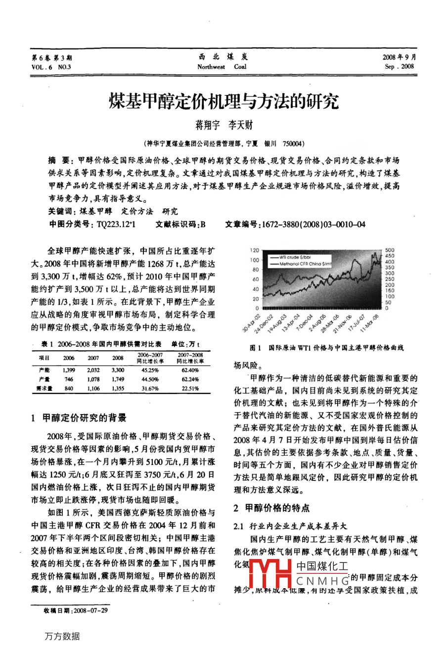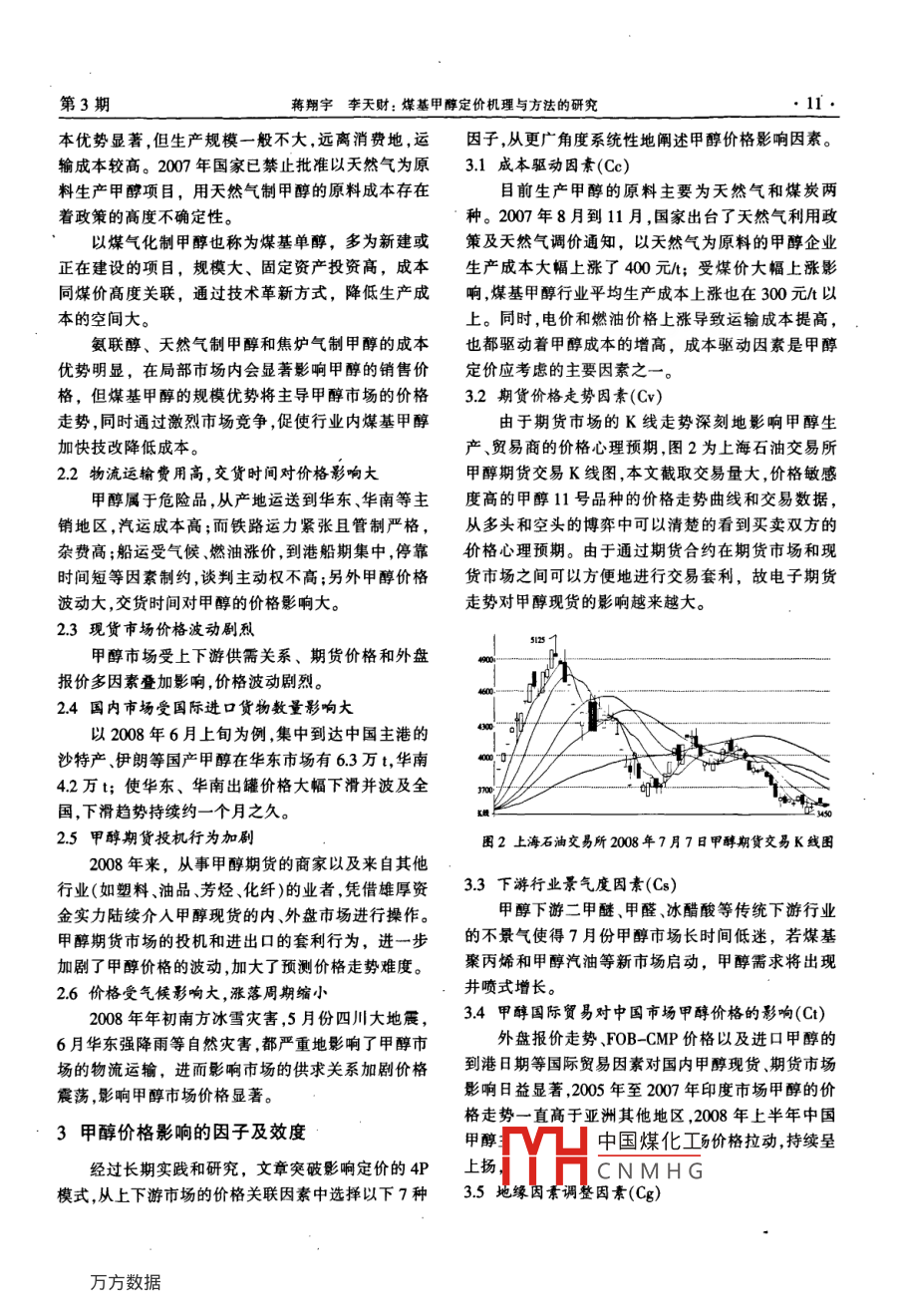 第6卷第3期西北煤炭2008年9月VOL 6 NO.3Northwest Coalsep.2008煤基甲醇定價(jià)機(jī)理與方法的硏究蔣翔宇李天財(cái)(神華寧夏煤業(yè)集團(tuán)公司經(jīng)營(yíng)管理部,寧夏銀川750004)摘要:甲醇價(jià)格受國(guó)際原油價(jià)格、全球甲醇的期貨交易價(jià)格、現(xiàn)貨交易價(jià)格、合同約定條款和市場(chǎng)供求關(guān)系等因素影響,定價(jià)杋理復(fù)雜。文章通過對(duì)我國(guó)煤基甲醇定價(jià)機(jī)理與方法的研究,構(gòu)造了煤基甲醇產(chǎn)品的定價(jià)模型并闡述其應(yīng)用方法,對(duì)于煤基甲醇生產(chǎn)企業(yè)規(guī)避市場(chǎng)價(jià)格風(fēng)險(xiǎn),溢價(jià)增效,提高市場(chǎng)競(jìng)爭(zhēng)力,具有指導(dǎo)意義關(guān)鍵詞:煤基甲醇定價(jià)方法研究中圖分類號(hào):TQ23.121文獻(xiàn)標(biāo)識(shí)碼:B文章編號(hào):1672-3880(200803-001004全球甲醇產(chǎn)能快速擴(kuò)張,中國(guó)所占比重逐年擴(kuò)大。2008年中國(guó)將新增甲醇產(chǎn)能1268萬t,總產(chǎn)能達(dá)ethanol CFR China s/mt到3,300萬t,增幅達(dá)62%,預(yù)計(jì)2010年中國(guó)甲醇產(chǎn)能約擴(kuò)產(chǎn)到3,500萬t以上,總產(chǎn)能將達(dá)到世界同期00000產(chǎn)能的13,如表1所示。在此背景下,甲醇生產(chǎn)企業(yè)應(yīng)從戰(zhàn)略的角度審視甲醇市場(chǎng)布局,制定科學(xué)合理的甲醇定價(jià)模式,爭(zhēng)取市場(chǎng)競(jìng)爭(zhēng)中的主動(dòng)地位。衰12006-2008年國(guó)內(nèi)甲醇供需對(duì)比表單位:萬t圖1國(guó)際原油WTl價(jià)格與中國(guó)主港甲醇價(jià)格曲線項(xiàng)目20062007同比增長(zhǎng)率同比增長(zhǎng)率產(chǎn)能1.39920323.300場(chǎng)風(fēng)險(xiǎn)。45.25%產(chǎn)量4610781,74944.50%62.24%甲醇作為一種清潔的低碳替代新能源和重要的需求量化工基礎(chǔ)產(chǎn)品,國(guó)內(nèi)目前尚未見到系統(tǒng)的研究其定價(jià)機(jī)理的文獻(xiàn);也未見到將甲醇作為一個(gè)特殊的介1甲醇定價(jià)研究的背景于替代汽油的新能源、又不受國(guó)家宏觀價(jià)格控制的產(chǎn)品來研究其定價(jià)方法的文獻(xiàn),在國(guó)外普氏能源從2008年,受國(guó)際原油價(jià)格、甲醇期貨交易價(jià)格、2008年4月7日開始發(fā)布甲醇中國(guó)到岸每日估價(jià)信現(xiàn)貨交易價(jià)格等因素的影響5月份我國(guó)內(nèi)貿(mào)甲醇市息,其估價(jià)的主要依據(jù)參考條款、地點(diǎn)質(zhì)量、貨量場(chǎng)價(jià)格暴漲,在一個(gè)月內(nèi)攀升到5100元/,月累計(jì)漲時(shí)間等五個(gè)方面,國(guó)內(nèi)有不少企業(yè)對(duì)甲醇銷售定價(jià)幅達(dá)1250元/t;6月底又狂瀉至3750元,6月20日方法只是簡(jiǎn)單地跟風(fēng)定價(jià),因此研究甲醇的定價(jià)機(jī)國(guó)內(nèi)燃油價(jià)格上漲,次日狂瀉不止的國(guó)內(nèi)甲醇期貨理和方法意義深遠(yuǎn)。市場(chǎng)立即止跌漲停,現(xiàn)貨市場(chǎng)也隨即回暖。如圖1所示,美國(guó)西德克薩斯輕質(zhì)原油價(jià)格與2甲醇價(jià)格的特點(diǎn)中國(guó)主港甲醇CFR交易價(jià)格在2004年12月前和21行業(yè)內(nèi)企業(yè)生產(chǎn)成本差異大2007年下半年兩個(gè)區(qū)間段密切相關(guān);中國(guó)甲醇主港國(guó)內(nèi)生產(chǎn)甲醇的工藝主要有天然氣制甲醇、煤交易價(jià)格和亞洲地區(qū)印度、臺(tái)灣、韓國(guó)甲醇價(jià)格存在焦化焦?fàn)t煤氣制甲醇、煤氣化制甲醇(單醇)和煤氣較高的相關(guān)度;在各種價(jià)格因素的疊加下國(guó)內(nèi)甲醇化氨現(xiàn)貨價(jià)格震幅加劇震蕩周期縮短。甲醇價(jià)格的劇烈震蕩,給甲醇生產(chǎn)企業(yè)的經(jīng)營(yíng)成果帶來了巨大的市攤少,原和H中國(guó)煤化工CNMHG的甲醇固定成本分康,伺時(shí)旱受國(guó)家政策扶植,成收稿日期:2008-07第3期蔣翔宇李天財(cái):煤基甲醇定價(jià)機(jī)理與方法的研究本優(yōu)勢(shì)顯著,但生產(chǎn)規(guī)模一般不大,遠(yuǎn)離消費(fèi)地,運(yùn)因子,從更廣角度系統(tǒng)性地闡述甲醇價(jià)格影響因素輸成本較高。2007年國(guó)家已禁止批準(zhǔn)以天然氣為原31成本驅(qū)動(dòng)因素(Cc)料生產(chǎn)甲酵項(xiàng)目,用天然氣制甲醇的原料成本存在目前生產(chǎn)甲醇的原料主要為天然氣和煤炭?jī)芍叩母叨炔淮_定性。種。2007年8月到11月,國(guó)家出臺(tái)了天然氣利用政以煤氣化制甲醇也稱為煤基單醇,多為新建或策及天然氣調(diào)價(jià)通知,以天然氣為原料的甲醇企業(yè)正在建設(shè)的項(xiàng)目,規(guī)模大、固定資產(chǎn)投資高,成本生產(chǎn)成本大幅上漲了400元;受煤價(jià)大幅上漲影同煤價(jià)高度關(guān)聯(lián),通過技術(shù)革新方式,降低生產(chǎn)成響煤基甲醇行業(yè)平均生產(chǎn)成本上漲也在300元以本的空間大。上。同時(shí),電價(jià)和燃油價(jià)格上漲導(dǎo)致運(yùn)輸成本提高,氨聯(lián)醇、天然氣制甲醇和焦?fàn)t氣制甲醇的成本也都驅(qū)動(dòng)著甲醇成本的增高,成本驅(qū)動(dòng)因素是甲醇優(yōu)勢(shì)明顯,在局部市場(chǎng)內(nèi)會(huì)顯著影響甲醇的銷售價(jià)定價(jià)應(yīng)考慮的主要因素之格,但煤基甲醇的規(guī)模優(yōu)勢(shì)將主導(dǎo)甲醇市場(chǎng)的價(jià)格3.2期貨價(jià)格走勢(shì)因素(Cv)走勢(shì),同時(shí)通過激烈市場(ch