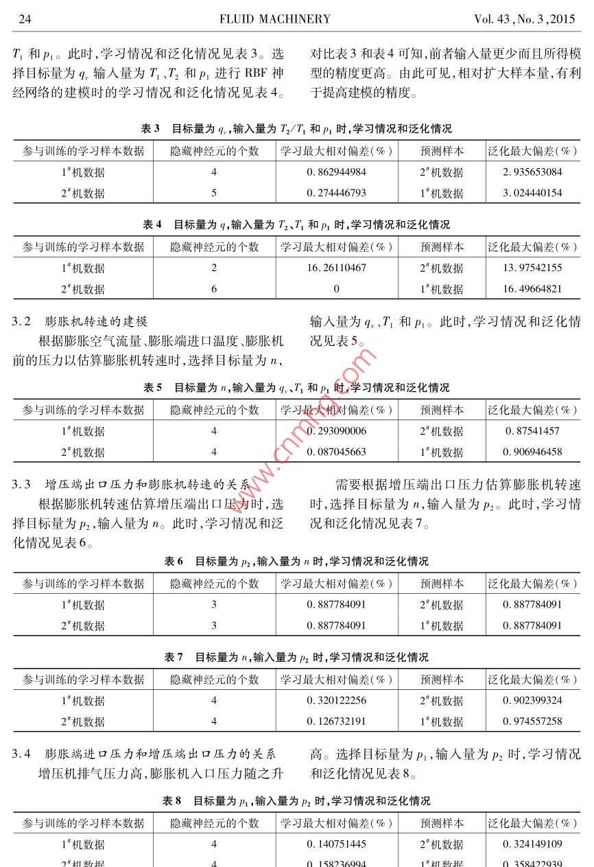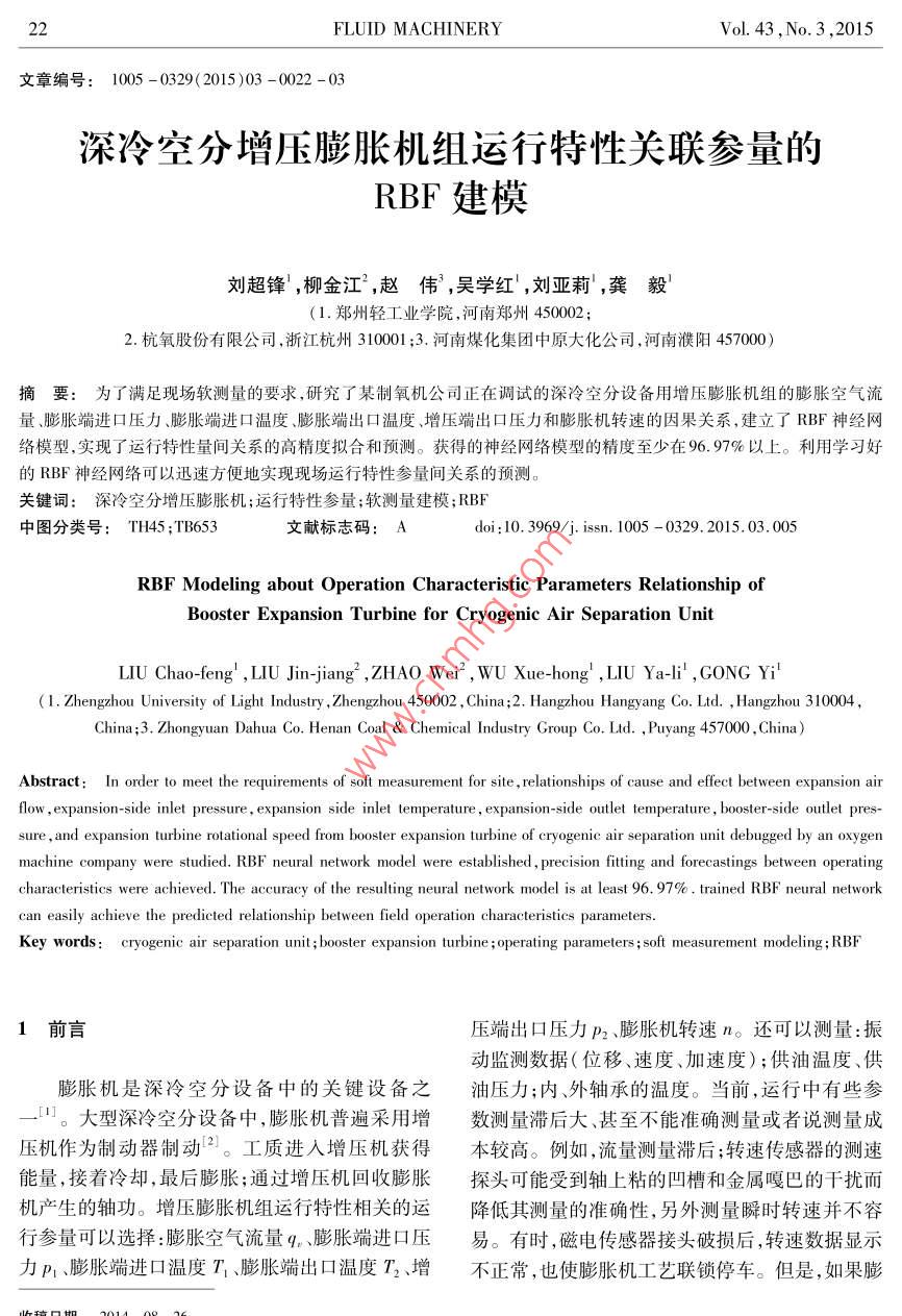 FLUID MACHINERYVol.43,No.3,2015文章編號(hào):1005-0329(2015)03-0022-03深冷空分增壓膨脹機(jī)組運(yùn)行特性關(guān)聯(lián)參量的RBF建模劉超鋒,柳金江2,趙偉,吳學(xué)紅,劉亞莉,龔毅(1.鄭州輕工業(yè)學(xué)院,河南鄭州450002;2.杭氧股份有限公司,浙江杭州310001;3.河南煤化集團(tuán)中原大化公司,河南濮陽457000摘要:為了滿足現(xiàn)場(chǎng)軟測(cè)量的要求,研究了某制氧機(jī)公司正在調(diào)試的深冷空分設(shè)備用增壓膨脹機(jī)組的膨脹空氣流量、膨脹端進(jìn)口壓力、膨脹端進(jìn)口溫度、膨脹端出口溫度、增壓端出口壓力和膨脹機(jī)轉(zhuǎn)速的因果關(guān)系,建立了RBF神經(jīng)網(wǎng)絡(luò)模型,實(shí)現(xiàn)了運(yùn)行特性量間關(guān)系的高精度擬合和預(yù)測(cè)。獲得的神經(jīng)網(wǎng)絡(luò)模型的精度至少在96.97%以上。利用學(xué)習(xí)好的RBF神經(jīng)網(wǎng)絡(luò)可以迅速方便地實(shí)現(xiàn)現(xiàn)場(chǎng)運(yùn)行特性參量間關(guān)系的預(yù)測(cè)。關(guān)鍵詞:深冷空分增壓膨脹機(jī);運(yùn)行特性參量;軟測(cè)量建模;RBF中圖分類號(hào):TH45;TB653文獻(xiàn)標(biāo)志碼:Adoi:10.3969/j.issn.1005-0329.2015.03.005RBF Modeling about Operation Characteristic Parameters Relationship ofBooster Expansion Turbine for Cryogenic Air Separation UnitLIU Chao-feng, LIU Jin-jiang, ZHAO Wei, WU Xue-hong, LIU Ya-li,GONG Yi( I. Zhengzhou University of Light Industry, Zhengzhou 450002, China; 2. Hangzhou Hangyang Co. Ltd., Hangzhou 310004China; 3. Zhongyuan Dahua Co. Henan Coal Chemical Industry Group Co Ltd, Puyang 457000, ChinaAbstract: In order to meet the requirements of soft measurement for site, relationships of cause and effect between expansion airflow, expansion-side inlet pressure, expansion side inlet temperature, expansion-side outlet temperature, booster-side outlet pres-sure,and expansion turbine rotational speed from booster expansion turbine of cdebugged by an oxygenstudied. RBF neural network model were established, precision fitting and forecastings between oparacteristics were achieved. The accuracy of the resulting neural network model is at least 96. 97%0 trained RBF neural networkcan easily achieve the predicted relationship between field operation characteristies parametersKey words: cryogenic air separation unit; booster expansion turbine; operating parameters; soft measurement modeling; RBF1前言壓端出口壓力P2、膨脹機(jī)轉(zhuǎn)速n。還可以測(cè)量:振動(dòng)監(jiān)測(cè)數(shù)據(jù)(位移、速度、加速度);供油溫度、供膨脹機(jī)是深冷空分設(shè)備中的關(guān)鍵設(shè)備之油壓力;內(nèi)、外軸承的溫度。當(dāng)前,運(yùn)行中有些參。大型深冷空分設(shè)備中,膨脹機(jī)普遍采用增數(shù)測(cè)量滯后大、甚至不能準(zhǔn)確測(cè)量或者說測(cè)量成壓機(jī)作為制動(dòng)器制動(dòng)2。工質(zhì)進(jìn)入增壓機(jī)獲得本較高。例如,流量測(cè)量滯后;轉(zhuǎn)速傳感器的測(cè)速能量,接著冷卻,最后膨脹;通過增壓機(jī)回收膨脹探頭可能受到軸上粘的凹槽和金屬嘎巴的干擾而機(jī)產(chǎn)生的軸功。增壓膨脹機(jī)組運(yùn)行特性相關(guān)的運(yùn)降低其測(cè)量的準(zhǔn)確性,另外測(cè)量瞬時(shí)轉(zhuǎn)速并不容行參量可以選擇:膨脹空氣流量q、膨脹端進(jìn)口壓易。有時(shí),磁電傳感器接頭破損后,轉(zhuǎn)速數(shù)據(jù)顯示力P、膨脹端進(jìn)口溫度T、膨脹端出口溫度T2、增不正常,也使膨脹機(jī)工藝聯(lián)鎖停車。但是,如果膨2015年第43卷第3期流體機(jī)械脹機(jī)聯(lián)鎖停車,存在安全隱患,加大工人的勞動(dòng)強(qiáng)經(jīng)網(wǎng)絡(luò)模型的擬合精度和泛化精度。如果擬合精度。控制不及時(shí),滯后時(shí)間過長,還影響液體產(chǎn)量度和泛化精度中的任何一個(gè)達(dá)不到所要求的精和生產(chǎn)穩(wěn)定。因此,希望能夠給出滿足生產(chǎn)要求度,則維持隱藏神經(jīng)元的重疊因子不變、改變隱藏精度的數(shù)學(xué)模型用于預(yù)測(cè)。本文針對(duì)某制氧機(jī)公神經(jīng)元的個(gè)數(shù),直到精度足夠。建模前,學(xué)習(xí)樣本司正在調(diào)試的1*增壓膨脹機(jī)組(簡稱1“機(jī))、2“增和測(cè)試樣本的數(shù)據(jù)均被歸一化處理,計(jì)算精度時(shí)壓膨脹機(jī)組(簡稱2“機(jī))運(yùn)行時(shí)的每間隔Ih采集再對(duì)預(yù)測(cè)結(jié)果進(jìn)行反歸一化處理。具體實(shí)施時(shí),到的數(shù)據(jù),進(jìn)行空分增壓膨脹機(jī)組運(yùn)行特性的軟以擬合相對(duì)偏差和泛化相對(duì)偏差的最大值作為評(píng)測(cè)量建模方法研究3。價(jià)神經(jīng)網(wǎng)絡(luò)模型精度好壞的標(biāo)準(zhǔn)。相對(duì)偏差的計(jì)算方法是:神經(jīng)網(wǎng)絡(luò)模型的估算值減去實(shí)測(cè)值后,2建模方案的選擇除以實(shí)測(cè)值,取絕對(duì)值后,最后再乘以100%。精度最高的神經(jīng)網(wǎng)絡(luò),作為最終建立的神經(jīng)網(wǎng)絡(luò)模神經(jīng)網(wǎng)絡(luò)建模屬于非線性建模方法。神經(jīng)網(wǎng)型。一旦得到最終的神經(jīng)網(wǎng)絡(luò)模型,在模型中輸絡(luò)建模雖然得到的是隱式的數(shù)學(xué)模型,但是精度入輸入量的實(shí)時(shí)值就可以預(yù)測(cè)相應(yīng)的目標(biāo)量的較高。其中,RBF神經(jīng)網(wǎng)絡(luò)建模具有學(xué)習(xí)速度值,從而達(dá)到軟測(cè)量的目的??臁W(xué)