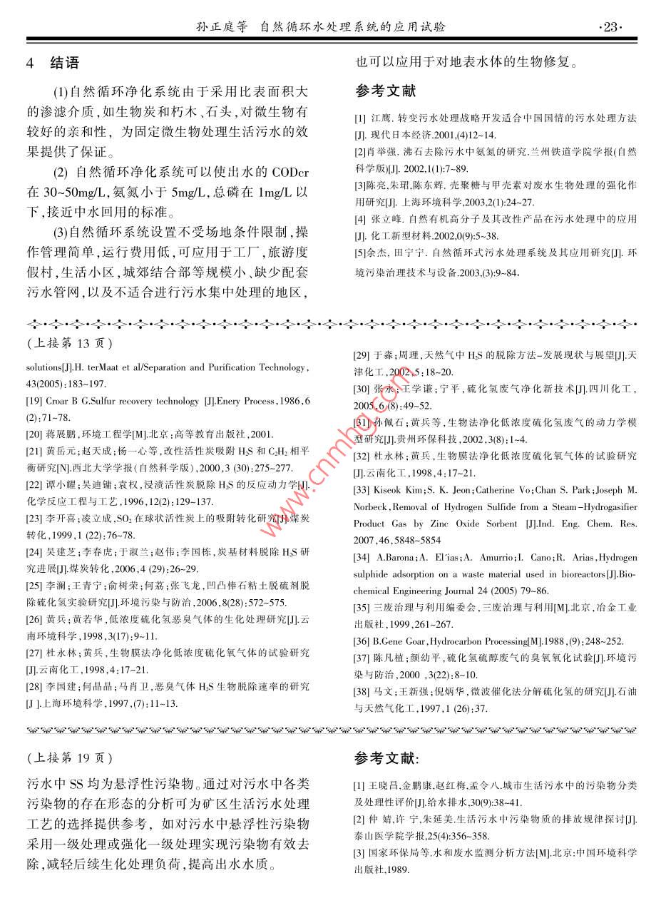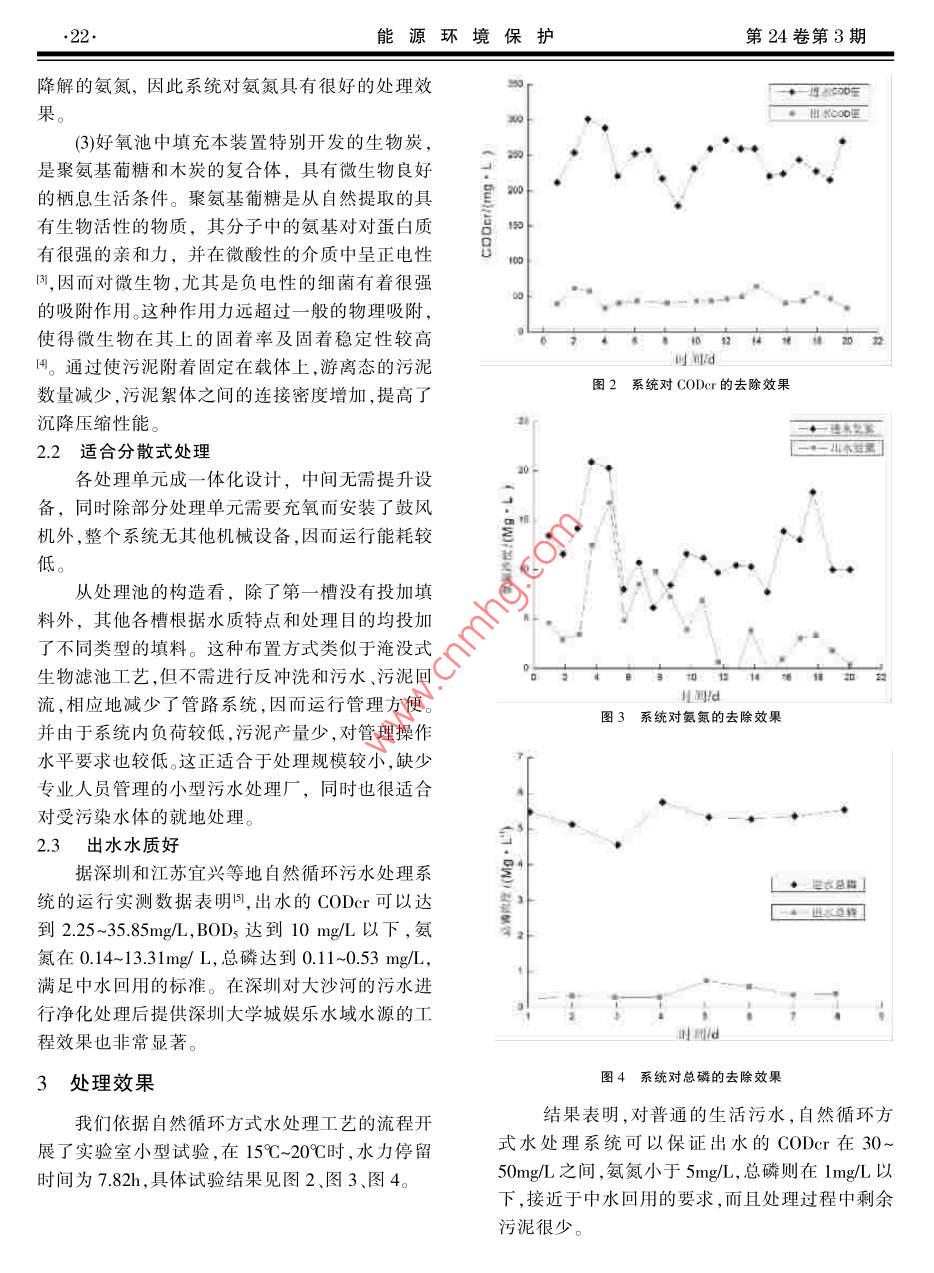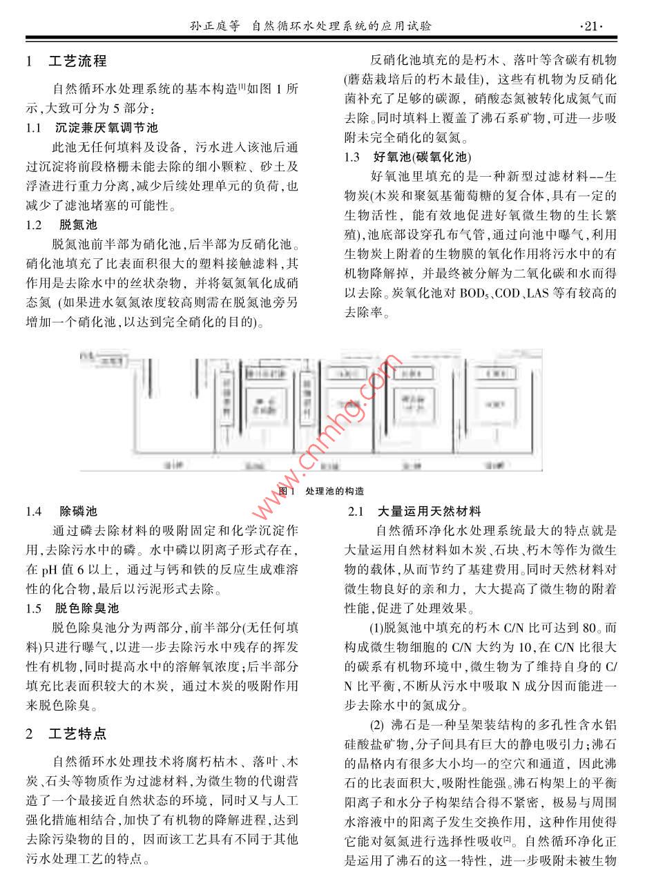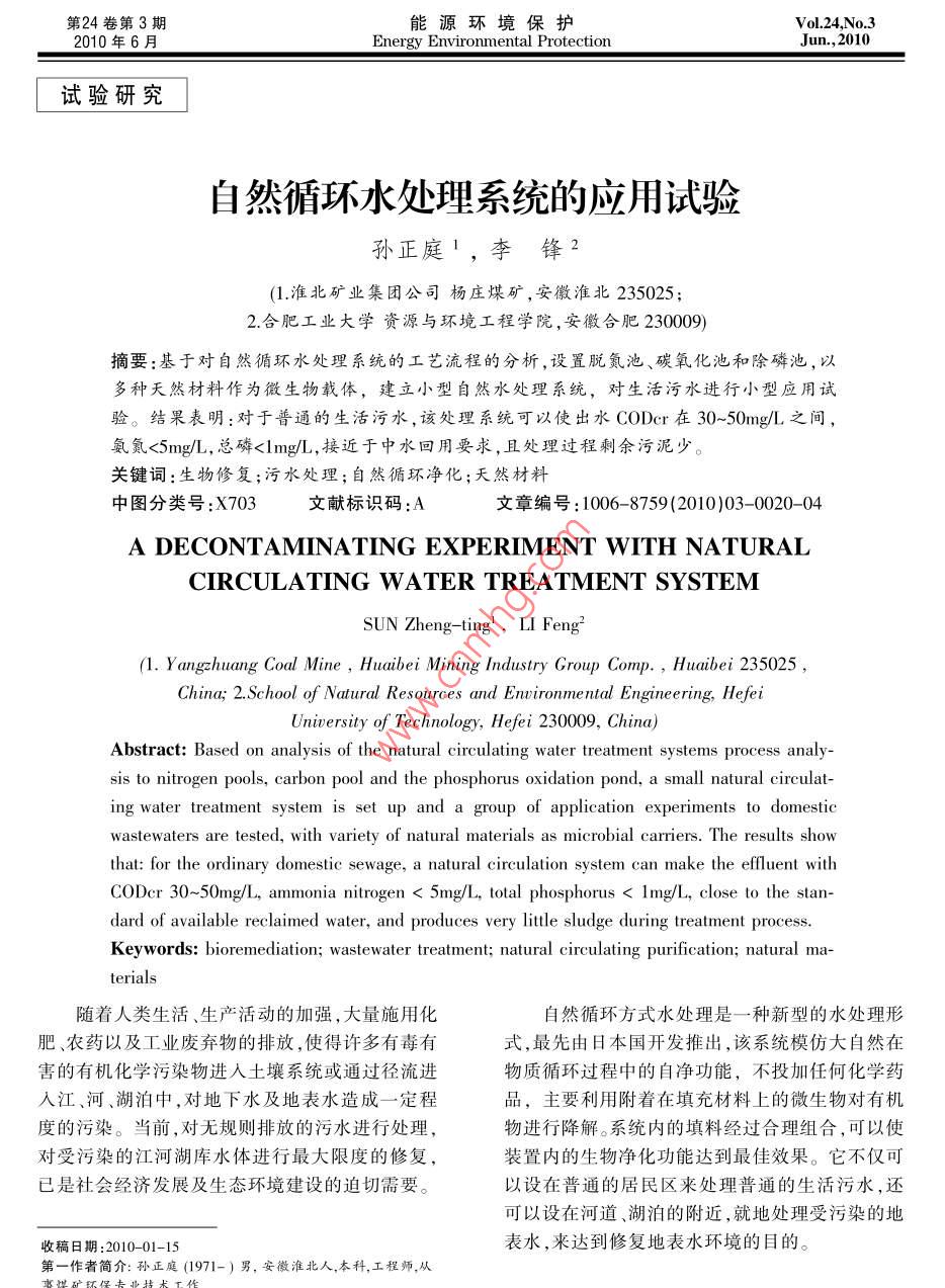 第24卷第3期能源環(huán)境保護Vol24. No. 32010年6月Energy Environmental ProtectionJun.,210試驗研究自然循環(huán)水處理系統(tǒng)的應(yīng)用試驗孫正庭1,李鋒2(1.淮北礦業(yè)集團公司楊莊煤礦,安徽淮北235025;2合肥工業(yè)大學(xué)資源與環(huán)境工程學(xué)院,安徽合肥230009摘要:基于對自然循環(huán)水處理系統(tǒng)的工藝流程的分析,設(shè)置脫氮池、碳氧化池和除磷池,以多種天然材料作為微生物載體,建立小型自然水處理系統(tǒng),對生活污水進行小型應(yīng)用試驗。結(jié)果表明:對于普通的生活污水,該處理系統(tǒng)可以使出水 CODer在30-50mg/L之間氨氮<5mg/,總磷