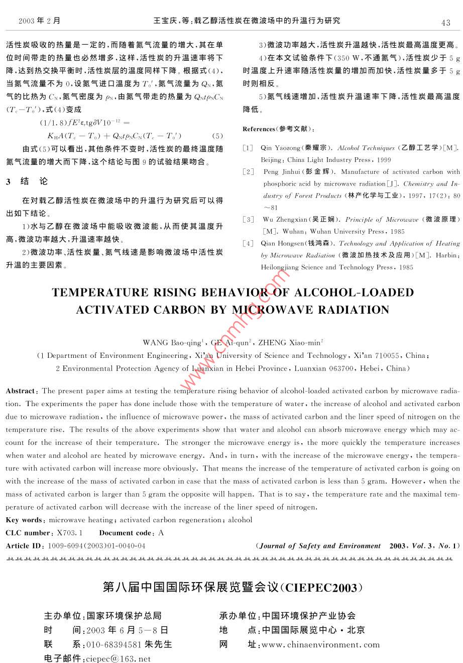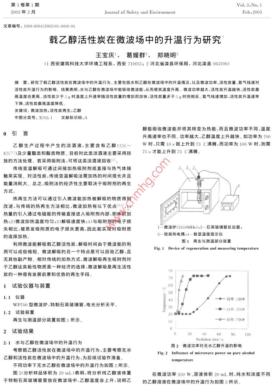 第3卷第1期Vol. 3. No. I2003年2月Journal of Safety and EnvironmentFeb,2003文章編號(hào):1009-6094(2003)01-0040-04載乙醇活性炭在微波場(chǎng)中的升溫行為研究王寶慶1,葛嬡群2,鄭曉明2(1西安建筑科技大學(xué)環(huán)境工程系,西安710055:2河北省灤縣環(huán)保局,河北灤縣063700)摘要:研究了載乙醇活性炭在微波場(chǎng)中的升溫行為。主要包括水和乙醇在微波場(chǎng)中的升溫情況,以及微波功率、活性炭量、氮?dú)饩€速對(duì)活性炭升溫行為的影。結(jié)果表明水與乙醇在微波場(chǎng)中能吸收微波能,從而使其溫度升高。微波功率越大,活性炭升溫越快,活性炭最高溫度也更高?;钚蕴可儆?g時(shí)溫度上升速率隨活性炭量的增加而加快,活性炭量多于5g時(shí)則相反。氬氣線速增加.活性炭升溫速率下降,活性炭最高溫度降低關(guān)鍵詞:微波加熱;活性炭再生;乙醇中圖分類號(hào):X703.1獻(xiàn)標(biāo)識(shí)碼:A醇能吸收微波能并將其轉(zhuǎn)變?yōu)闊崮?而且微波功率不同,溫度引言升高速率也不同。功率越大,乙醇溫度上升越快。如功率為700乙醇生產(chǎn)過程中產(chǎn)生的淡酒液,主要含有乙醇(5%~W時(shí),只需10s就上升到73C沸騰而功率為100W時(shí),則需8%1)及少量酯類和酸類物質(zhì)。目前對(duì)此類淡酒液主要采用排75才能上升到73C沸騰放的方法處理。若采用吸附法,可將這類淡酒液回收山傳統(tǒng)變溫解吸可通過間接加熱吸附劑或直接與熱氣體接觸來實(shí)現(xiàn)。對(duì)活性炭,傳統(tǒng)變溫解吸法需加熱的時(shí)間很長(zhǎng)并且能量消耗大。總之,吸附法的經(jīng)濟(jì)性主要取決于吸附劑的再生方式熱再生方法可以通過引入微波能加熱被解吸的物質(zhì)得到改進(jìn),與傳統(tǒng)的熱再生方法相比,微波加熱有以下優(yōu)點(diǎn)2:1)熱量的引入通過電磁能的傳輸直接進(jìn)入吸附劑內(nèi)部,即體積加熱;2)微波加熱溫度均勻;3)解吸速度快:4)與吸附劑的電子損失相比,被蒸發(fā)吸附質(zhì)的電子損失更高,因此能實(shí)現(xiàn)對(duì)吸附質(zhì)1—微波爐(2450MHz);2—石英玻璃管反應(yīng)器的選擇加熱3一鎧裝熱電偶:4—數(shù)顯溫度指示儀利用微波能解吸載乙醇活性炭,解吸時(shí)間由于微波能的利圖1再生與測(cè)溫部分裝置用可以成倍縮短。微波解吸的另一個(gè)特點(diǎn)是可以回收乙醇,且Fig. 1 Device of reger無其他副產(chǎn)物。相對(duì)傳統(tǒng)的加熱方式,微波解吸再生吸附劑對(duì)于乙醇這類極性物質(zhì)是一種經(jīng)濟(jì)的選擇,微波解吸是再生活性炭的一種很有發(fā)展前景和優(yōu)勢(shì)的再生手段1試驗(yàn)儀器與裝置EO1.1儀器一功率:1009rPτ00型微波爐,特制石英玻璃管,電光分析天平1.2試驗(yàn)裝00一與書:350w再生與測(cè)溫部分裝置如圖1所示。合一功率:7002試驗(yàn)結(jié)果2.1水與乙醇在微波場(chǎng)中的升溫行為Radiation time圖2微波功率對(duì)無水乙醇升溫的影響考察載乙醇活性炭在微波場(chǎng)中的升溫行為,主要考察無水Fig. 2 Influence of microwave power on pure alcohol乙醇和活性炭在微波場(chǎng)中的升溫行為,為后續(xù)試驗(yàn)作準(zhǔn)備temperature不同功率下無水乙醇在微波場(chǎng)中的升溫行為如圖2所示。圖2(分析樣品體積為20mL)表明,將分析純乙醇液體置在微波功率350W、溶液體積20mL時(shí),純水和濃度不同于特制石英玻璃管里放在微波場(chǎng)中,乙醇溫度會(huì)上升,說明乙的乙醇溶液在微波場(chǎng)中的升溫行為如圖3所示2003年2月王寶慶,等:載乙醇活性炭在微波場(chǎng)中的升溫行為研究41從圖3可以看出,無水乙醇溫度升到73C沸騰,而純水溫由圖4可知,其他條件相同時(shí)微波功率對(duì)活性炭的升溫行度升到⑨4℃沸騰、所測(cè)定的已知濃度的乙醇溶液溫度也是升為旳影響主要體現(xiàn)為隨著微波功率増大,活性炭最終能達(dá)到的到Ω4℃沸騰。由乙醇一水溶液的沸點(diǎn)組成圖可以得岀,乙醇在溫度增高,增加功率可縮短加熱時(shí)間,加快升溫速率。從試驗(yàn)所液相中的含量等于1%時(shí),乙醇溶液的沸點(diǎn)為93.10C,所以所使用的2種功率來看,當(dāng)微波功率為350W時(shí),活性炭溫度最測(cè)的2種濃度的乙醇溶液的沸點(diǎn)與純水的沸點(diǎn)基本一致。多只能升高到680C;當(dāng)微波功率為700W時(shí),活性炭最高溫度可以達(dá)到1050C微波功率與活性炭最高溫度的關(guān)系見圖5。微波功率與活性炭最高溫度呈線性關(guān)系,由此可見在這樣的溫度條件下,再生過程中如果要改變活性炭能達(dá)到的最高溫度可以通過調(diào)節(jié)微波功率來實(shí)現(xiàn);改變微波功率可以改變活性炭的升溫速率-無水乙醉一一乙醇:1580mg/L200乙醇:158mg/L000一純水Radiation time/s600圖3乙醇濃度對(duì)乙醇升溫的影響Fig. 3 Influence of alcohol concentration on temperature根據(jù)純乙醇和純水在10132.5Pa下的沸點(diǎn)分別為78.3C和100C,而昆明所處的當(dāng)?shù)卮髿鈮簭?qiáng)為8079.3Pa,可以算出純乙醇和純水的沸點(diǎn)分別為73C和94C,這與所測(cè)得的Microwave power P/w圖5微波功率對(duì)活性炭最高溫度關(guān)系乙醇和水的沸騰溫度相吻合2.2活性炭在微波場(chǎng)中的升溫行為temperature of activated carbon將載乙醇的活性炭或新鮮活性炭放在微波爐中也能很快被加熱,但是由于本試驗(yàn)主要研究活性炭對(duì)乙醇的吸附及其在場(chǎng)中的解吸行