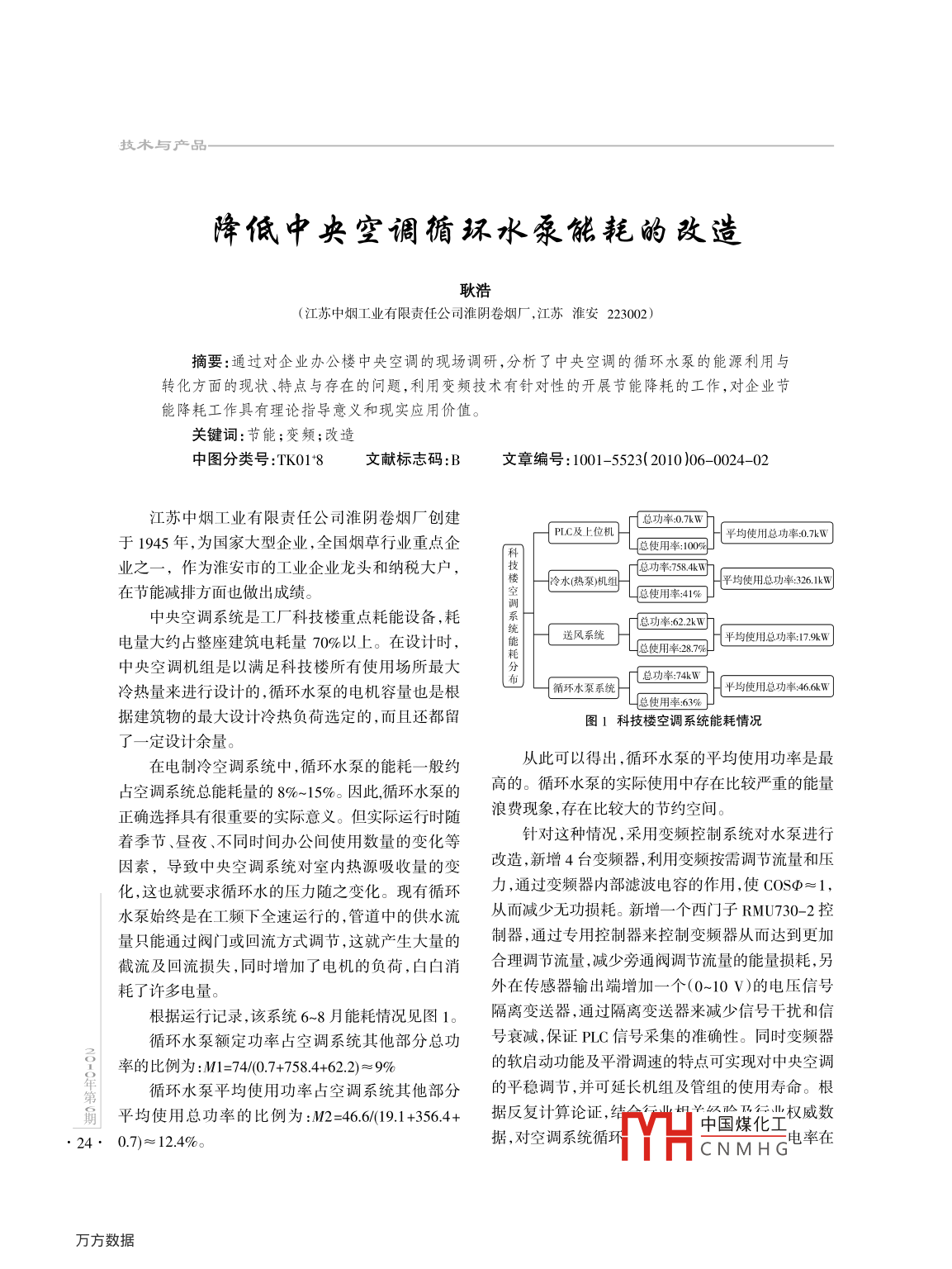 技術(shù)與產(chǎn)品-降低中央空調(diào)循環(huán)水泵能耗的改造(江蘇中煙工業(yè)有限責(zé)任公司淮陰卷煙廠,江蘇淮安223002)摘要:通過對(duì)企業(yè)辦公樓中央空調(diào)的現(xiàn)場(chǎng)調(diào)研,分析了中央空調(diào)的循環(huán)水泵的能源利用與轉(zhuǎn)化方面的現(xiàn)狀、特點(diǎn)與存在的問題,利用變頻技術(shù)有針對(duì)性的開展節(jié)能降耗的工作,對(duì)企業(yè)節(jié)能降耗工作具有理論指導(dǎo)意義和現(xiàn)實(shí)應(yīng)用價(jià)值。關(guān)鍵詞:節(jié)能;變頻;改造中圖分類號(hào):TK01+8文獻(xiàn)標(biāo)志碼:B文章編號(hào):1001-5523( 2010 )06- -0024-02江蘇中煙工業(yè)有限責(zé)任公司淮陰卷煙廠創(chuàng)建f PIC及上位機(jī)總功率:0.7kWF[平均使用總功率0.7kW于1945年,為國(guó)家大型企業(yè),全國(guó)煙草行業(yè)重點(diǎn)企-總使用率:100業(yè)之一,作為淮安市的工業(yè)企業(yè)龍頭和納稅大戶,r總功率:758.4kw在節(jié)能減排方面也做出成績(jī)。樓|一冷水(熱泵機(jī)組L總使用率:41% }平均使用總功率:326.1kWy中央空調(diào)系統(tǒng)是工廠科技樓重點(diǎn)耗能設(shè)備,耗「總功率:62.2kW]電量大約占整座建筑電耗量70%以上。在設(shè)計(jì)時(shí),送風(fēng)系統(tǒng). 總使用率28.793]|平均使用總功率:179kW中央空調(diào)機(jī)組是以滿足科技樓所有使用場(chǎng)所最大冷熱量來進(jìn)行設(shè)計(jì)的,循環(huán)水泵的電機(jī)容量也是根{循環(huán)水泵系統(tǒng)}f總功率:74kWt平均使用總功率:46.6kW一總使用率:63%]據(jù)建筑物的最大設(shè)計(jì)冷熱負(fù)荷選定的,而且還都留圖1科技樓空調(diào)系統(tǒng)能耗情況了一定設(shè)計(jì)余量。在電制冷空調(diào)系統(tǒng)中,循環(huán)水泵的能耗一般約從此可以得出,循環(huán)水泵的平均使用功率是最占空調(diào)系統(tǒng)總能耗量的8%~15%。因此,循環(huán)水泵的高的。循環(huán)水泵的實(shí)際使用中存在比較嚴(yán)重的能量正確選擇具有很重要的實(shí)際意義。但實(shí)際運(yùn)行時(shí)隨浪費(fèi)現(xiàn)象,存在比較大的節(jié)約空間。著季節(jié)、晝夜、不同時(shí)間辦公間使用數(shù)量的變化等針對(duì)這種情況,采用變頻控制系統(tǒng)對(duì)水泵進(jìn)行因素,導(dǎo)致中央空調(diào)系統(tǒng)對(duì)室內(nèi)熱源吸收量的變改造,新增4臺(tái)變頻器,利用變頻按需調(diào)節(jié)流量和壓化,這也就要求循環(huán)水的壓力隨之變化?,F(xiàn)有循環(huán)力,通過變頻器內(nèi)部濾波電容的作用,使COSφ≈1,水泵始終是在工頻下全速運(yùn)行的,管道中的供水流從而減少無功損耗。新增-個(gè)西門子RMU730-2控量只能通過閥廣]或回流方式調(diào)節(jié),這就產(chǎn)生大量的制器,通過專用控制器來控制變頻器從而達(dá)到更加截流及回流損失,同時(shí)增加了電機(jī)的負(fù)荷,白白消合理調(diào)節(jié)流量,減少旁通閥調(diào)節(jié)流量的能量損耗,另耗了許多電量。外在傳感器輸出端增加一個(gè)(0~10V)的電壓信號(hào)根據(jù)運(yùn)行記錄,該系統(tǒng)6~8月能耗情況見圖1。隔離變送器,通過隔離變送器來減少信號(hào)干擾和信循環(huán)水泵額定功率占空調(diào)系統(tǒng)其他部分總功號(hào)衰減,保證PLC信號(hào)采集的準(zhǔn)確性。同時(shí)變頻器率的比例為:M1-74/0.7+758.4+62.2)>-9%的軟啟動(dòng)功能及平滑調(diào)速的特點(diǎn)可實(shí)現(xiàn)對(duì)中央空調(diào)循環(huán)水泵平均使用功率占空調(diào)系統(tǒng)其他部分的平穩(wěn)調(diào)節(jié),并可延長(zhǎng)機(jī)組及管組的使用壽命。根平均使用總功率的比例為:M2=46.6(19.1+356.4+據(jù)反復(fù)計(jì)算論證,結(jié)合行如¥5驗(yàn)刀元業(yè)權(quán)威數(shù)中國(guó)煤化工. 24. 0.7)≈12.4%。據(jù),對(duì)空調(diào)系統(tǒng)循環(huán)MYHCNMH G電率在耿浩,降低中央空調(diào)循環(huán)水泵能耗的改造-技術(shù)與產(chǎn)品表1改造后電量統(tǒng)計(jì)數(shù)kW.h6月份電量7月份電量8月份電量平均電量空調(diào)系統(tǒng)(除循環(huán)水泵外)41 36498 584.2107 546.482 498.2循環(huán)水泵2 895.58 875.39 313.57028.130%以上。8.5%。經(jīng)過改造,實(shí)際使用中循環(huán)水泵能耗占空調(diào)為檢查實(shí)際水泵改造后的節(jié)能效果,作者在改系統(tǒng)其他總能耗的比例從改造前的12.4%減到改造造完成后3個(gè)月內(nèi)對(duì)整個(gè)空調(diào)系統(tǒng)和4臺(tái)循環(huán)水泵后的8.5% ,效果明顯。進(jìn)行電能計(jì)量。具體統(tǒng)計(jì)數(shù)據(jù)見表1。實(shí)際使用中循環(huán)水泵能耗占空調(diào)系統(tǒng)其它能耗收稿 日期:2010-05-13比為:7 028.1/82 498.2-8.5%,即使用功率比為<<<<<<<<<<<<<<<<<<<<<<<<<<<<<+<<<<<<<<<<<<<<<<+<<