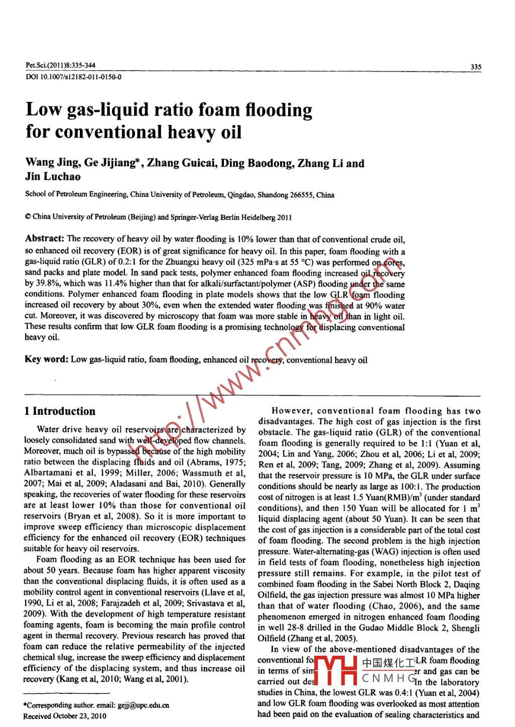 Pet. Sci.(2011)8:335-344335Dol10.1007/s12182-011-0150-0Low gas-liquid ratio foam floodingfor conventional heavy oilWang Jing, Ge Jijiang", Zhang Guicai, Ding Baodong, Zhang Li andJin luchaoSchool of Petroleum Engineering, China University of Petroleum, Qingdao, Shandong 266555, ChinaC China University of Petroleum( Beijing) and Springer-Verlag Berlin Heidelberg 2011Abstract: The recovery of heavy oil by water flooding is 10% lower than that of conventional crude oilso enhanced oil recovery(EOR) is of great significance for heavy oil. In this paper, foam flooding with agas-liquid ratio(GLR) of 0. 2: 1 for the Zhuangxi heavy oil(325 mPas at 55C)was performed on corescand packs and plate model In sand pack tests, polymer enhanced foam flooding increased oil recoveryby 39.8%, which was 11.4% higher than that for alkali/surfactant/polymer(ASP)flooding under the sameconditions. Polymer enhanced foam flooding in plate models shows that the low GLR foam floodingincreased oil recovery by about 30%, even when the extended water flooding was finished at 90%watercut. Moreover, it was discovered by microscopy that foam was more stable in heavy oil than in light oilThese results confirm that low GLR foam flooding is a promising technology for displacing conventionalheavy oilKey word: Low gas-liquid ratio, foam flooding, enhanced oil recovery, conventional heavy oil1 IntroductionHowever, conventional foam flooding has twodisadvantages. The high cost of gas injection is the firstWater drive heavy oil reservoirs are characterized by obstacle. The gas-liquid ratio(GLR) of the conventionalloosely consolidated sand with well-developed flow channels. foam flooding is generally required to be 1: 1(Yuan et al,Moreover, much oil is bypassed because of the high mobility 2004; Lin and Yang, 2006; Zhou et al, 2006; Li et al, 2009:ratio between the displacing fluids and oil(Abrams, 1975; Ren et al, 2009; Tang, 2009; Zhang et al, 2009). AssumingAlbartamani et al, 1999; Miller, 2006; Wassmuth et al, that the reservoir pressure is 10 MPa, the GLR under surface2007: Mai et al, 2009; Aladasani and Bai, 2010 ). Generally conditions should be nearly as large as 100: 1. The productionspeaking, the recoveries of water flooding for these reservoirs cost of nitrogen is at least 1.5 Yuan(RMB)m(under standardare at least lower 10% than those for conventional oil conditions), and then 150 Yuan will be allocated for Im'reservoirs( Bryan et al, 2008). So it is more important to liquid displacing agent(about 50 Yuan). It can be seen thatimprove sweep efficiency than microscopic displacement the cost of gas injection is a considerable part of the total costefficiency for the enhanced oil recovery(EOR) techniques of foam flooding. The second problem is the high injectionsuitable for heavy oil reservoirspressure. Water-alternating-gas(WAG)injection is often usedFoam flooding as an EOR technique has been used for in field tests of foam flooding, nonetheless high injectionabout 50 years. Because foam has higher apparent viscosity pressure still remains. For example, in the pilot test ofthan the conventional displacing fluids, it is often used as a combined foam flooding in the Sabei North Block 2, Daqingmobility control agent in conventional reservoirs( Llave et al, Oilfield, the gas injection pressure was almost 10 MPa higher1990, Li et al, 2008; Farajzadeh et al, 2009; Srivastava et al, than that of water flooding( Chao, 2006), and the same2009). With the development of high temperature resistant phenomenon emerged in nitrogen enhanced foam floodingfoaming agents, foam is becoming the main profile control in well 28-8 drilled in the Gudao Middle Block 2, Shengliagent in thermal recovery. Previous research has proved that Oilfield( Zhang et al, 2005)foam can reduce the relative permeability of the injectedIn view of the above-mentioned disadvantages of thechemical slug, increase the sweep efficiency and displacement conventional foefficiency of the displacing system, and thus increase oil in terms of siH中國煤化工 LR foam floodingcer and gas can berecovery(Kang et al, 2010; Wang et al, 2001).carried out desCN\oD the laboratorystudies in China, the lowest GLR was 0. 4: 1(Yuan et al, 2004).Correspondingauthor.email:gej@upc.edu.cnand low Glr foam flooding was overlooked as most attentionReceived October 23, 2010had been paid on the evaluation of sealing characteristics andPet. Sci(2011)8:335-344oil displacement performance of high GLR foam. However, first consisted of 0. 2wt%DS and 0.5wt% Na, CO, the otherthe results of foam flooding field test in the Daqing Oilfield was composed of 0. 2wt%DS, 0.5wt% Na,CO,, and 0. Iwt%showed that though the real GLR was only 0.34: 1 (designed HPAM. The foam generated by the first foaming system isGLR is 1: 1 ), the oil recovery due to foam flood was still 25% called ordinary foam and the foam generated by the secondhigher than that due to water injection(Chao, 2006). This foaming system is named polymer enhanced foamresult confirms the feasibility of low GLR foam flooding in The basic parameters of cores and sand packs used inoilfieldsdisplacement tests are given in Table 3. Ten core samples,There is an amount of residual oil that is left in the each 15 cm long and 2.5 cm in diameter, were obtainedervoir after a water flooding program due to characteristics from the Geological Scientific Research Institute of Shengliof heavy oil reservoirs. Whether the residual oil can affect Oilfield. Three sand packs were prepared in linear sand packthe stability of foam or not is the key factor to successfully cells(30 cm long and 2.5 cm in diameter)using 80-100 meshimplement foam flooding in heavy oil reservoirs. Previous quartz sand. In the process of packing the cells, the quartzworks proved that oil had a strong destabilizing effect on sand was added in several increments. deionized water wasfoam. Some research(Suffridge et al, 1989; Schramm and used to moisten the sand and the cells were gently vibratedNovos