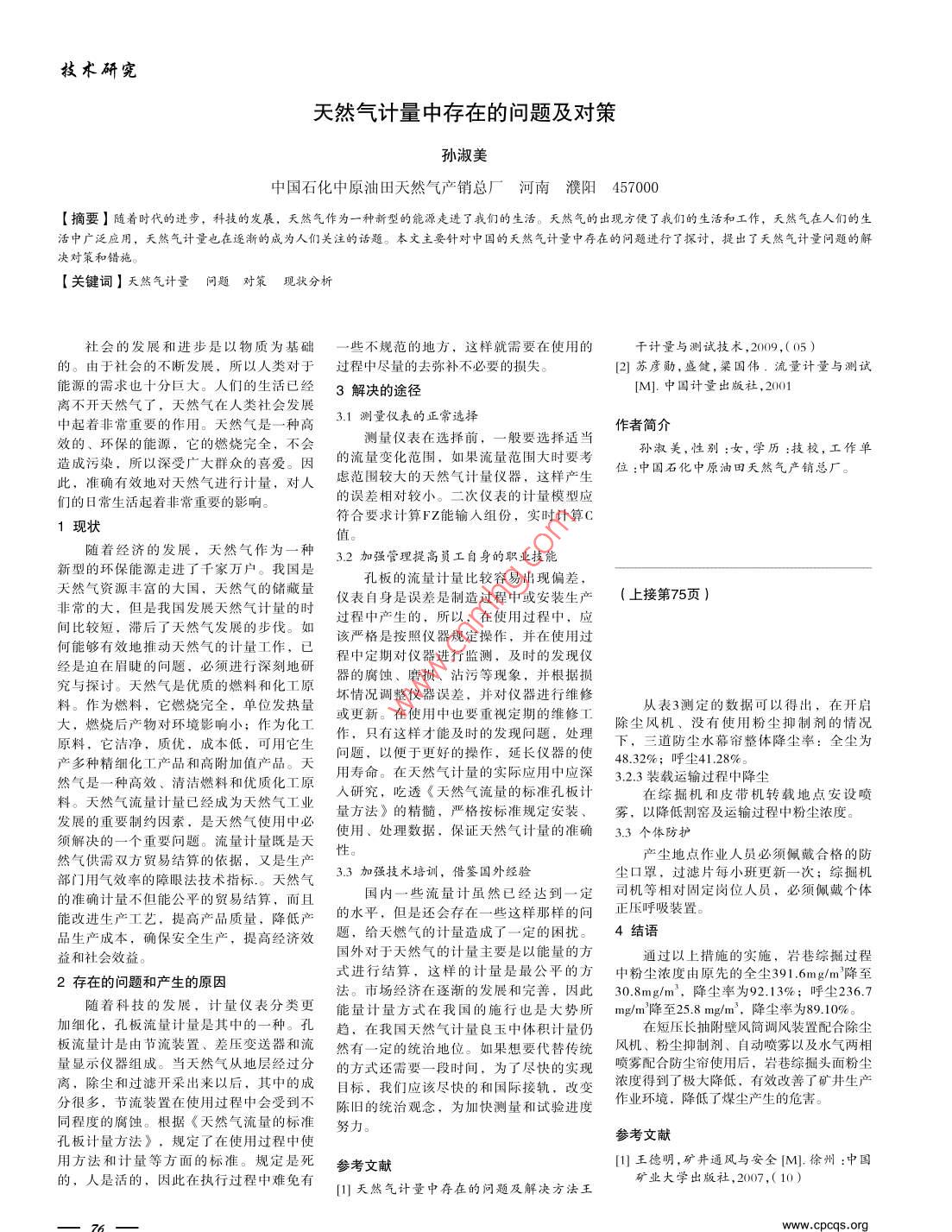 技術(shù)酐憲天然氣計(jì)量中存在的問題及對策孫淑美中國石化中原油田天然氣產(chǎn)銷總廠河南濮陽457000【摘要】隨著時(shí)代的進(jìn)步,科技的發(fā)展,天然氣作為一種新型的能源走進(jìn)了我們的生活。天然氣的出現(xiàn)方便了我們的生活和工作,天然氣在人們的生活中廣泛應(yīng)用,天然氣計(jì)量也在逐漸的成為人們關(guān)注的話題。本文主要針對中國的夭然氣計(jì)量中存在的問題進(jìn)行了探討,提出了天然氣計(jì)量問題的解決對策和錯(cuò)施?!娟P(guān)鍵詞】天然氣計(jì)量問題對策現(xiàn)狀分析社會(huì)的發(fā)展和進(jìn)步是以物質(zhì)為基礎(chǔ)一些不規(guī)范的地方,這樣就需要在使用的干計(jì)量與測試技術(shù),2009,(05的。由于社會(huì)的不斷發(fā)展,所以人類對于過程中盡量的去彌補(bǔ)不必要的損失。2]蘇彥勛,盛健,梁國偉.流量計(jì)量與測試能源的需求也十分巨大。人們的生活已經(jīng)3解決的途徑[M].中國計(jì)量出版社,2001中起著非常重要的作用。天然氣是一種高31測量儀表的正常選擇作者簡介效的、環(huán)保的能源,它的燃燒完全,不會(huì)測量儀表在選擇前,一般要選擇適當(dāng)造成污染,所以深受廣大群眾的喜愛的流量變化范圍,如果流量范圍大時(shí)要考孫淑美,性別:女,學(xué)歷:技校,工作單此,準(zhǔn)確有效地對天然氣慮范圍較大的天然氣計(jì)量儀器,這樣產(chǎn)生位:中國石化中原油田天然氣產(chǎn)銷總廠們的日常生活起著非常重要的影響的誤差相對較小。二次儀表的計(jì)量模型應(yīng)1現(xiàn)狀符合要求計(jì)算FZ能輸入組份,實(shí)時(shí)計(jì)算C隨著經(jīng)濟(jì)的發(fā)展,天然氣作為一種新型的環(huán)保能源走進(jìn)了千家萬戶。我國是3.2加強(qiáng)管理提高員工自身的職業(yè)技能天然氣資源豐富的大國,天然氣的儲(chǔ)藏量孔板的流量計(jì)量比較容易出現(xiàn)偏差非常的大,但是我國發(fā)展天然氣計(jì)量的時(shí)儀表自身是誤差是制造過程中或安裝生產(chǎn)(上接第75頁過程中產(chǎn)生的,所以,在使用過程中,應(yīng)何能夠有效地推動(dòng)天然氣的計(jì)量工作,已該嚴(yán)格是按照儀器規(guī)定操作,并在使用過經(jīng)是迫在眉睫的問題,必須進(jìn)行深刻地研器的腐蝕、磨損、沾污等現(xiàn)象,并根據(jù)損究與探討。天然氣是優(yōu)質(zhì)的燃料和化工原壞情況調(diào)整儀器誤差,并對儀器進(jìn)行維修料。作為燃料,它燃燒完全,單位發(fā)熱量或更新。在使用中也要重視定期的維修工從表3測定的數(shù)據(jù)可以得出,在開啟大,燃燒后產(chǎn)物對環(huán)境影響小;作為化工作,只有這樣才能及時(shí)的發(fā)現(xiàn)問題,處理除塵風(fēng)機(jī),沒有使用粉生抑制劑的惜況原料,它潔凈,質(zhì)優(yōu),成本低,可用它生問題,以便于更好的操作,延長儀器的使48.32%;呼塵4128%產(chǎn)多種精細(xì)化工產(chǎn)品和高附加值產(chǎn)品。天然氣是一種高效、清潔燃料和優(yōu)質(zhì)化工原用壽命。在天然氣計(jì)量的實(shí)際應(yīng)用中應(yīng)深32.3裝載運(yùn)輸過程中降塵料。天然氣流量計(jì)量已經(jīng)成為天然氣工業(yè)入研究,吃透《天然氣流量的標(biāo)準(zhǔn)孔板計(jì)在綜掘機(jī)和皮帶機(jī)轉(zhuǎn)載地點(diǎn)安設(shè)量方法》的精髓,嚴(yán)格按標(biāo)準(zhǔn)規(guī)定安裝、霧,以降低割窯及運(yùn)輸過程中粉塵濃度。發(fā)展的重要制約因素,是天然氣使用中必須解決的一個(gè)重要問題。流量計(jì)量既是天使用、處理數(shù)據(jù),保證天然氣計(jì)量的準(zhǔn)確3個(gè)體防護(hù)然氣供需雙方貿(mào)易結(jié)算的依據(jù),又是生產(chǎn)產(chǎn)塵地點(diǎn)作業(yè)人員必須佩戴合格的防部門用氣效率的障眼法技術(shù)指標(biāo)。天然氣33加強(qiáng)技術(shù)培訓(xùn),借鑒國外經(jīng)驗(yàn)塵口罩,過濾片每小班更新一次;綜掘機(jī)的準(zhǔn)確計(jì)量不但能公平的貿(mào)易結(jié)算,而且國內(nèi)一些流量計(jì)雖然已經(jīng)達(dá)到一定司機(jī)等相對固定崗位人員,必須佩戴個(gè)體能改進(jìn)生產(chǎn)工藝,提高產(chǎn)品質(zhì)量,降低產(chǎn)的水平,但是還會(huì)存在一些這樣那樣的問正壓呼吸裝置品生產(chǎn)成本,確保安全生產(chǎn),提高經(jīng)濟(jì)效題,給天燃?xì)獾挠?jì)量造成了一定的困擾4結(jié)語益和社會(huì)效益。國外對于天然氣的計(jì)量主要是以能量的方通過以上措施的實(shí)施,巖巷綜掘過程2存在的問題和產(chǎn)生的原因式進(jìn)行結(jié)算,這樣的計(jì)量是最公平的方中粉塵濃度由原先的全塵391.6mg/m降至隨著科技的發(fā)展,計(jì)量儀表分類更能量計(jì)量方式在我國的施行也是大勢所mm降至258mgⅧm3,降塵率為89.10%。加細(xì)化,孔板流量計(jì)量是其中的一種。孔趨,在我國天然氣計(jì)量良玉中體積計(jì)量仍在短壓長抽附壁風(fēng)筒調(diào)風(fēng)裝置配合除塵板流量計(jì)是由節(jié)流裝置、差壓變送器和流然有一定的統(tǒng)治地位。如果想要代替?zhèn)鹘y(tǒng)風(fēng)機(jī)、粉塵抑制劑、自動(dòng)噴霧以及水氣兩相量顯示儀器組成。當(dāng)天然氣從地層經(jīng)過分的方式還需要一段時(shí)間,為了盡快的實(shí)現(xiàn)噴霧配合防塵簾使用后,巖巷綜掘頭面粉塵離,除塵和過濾開采出來