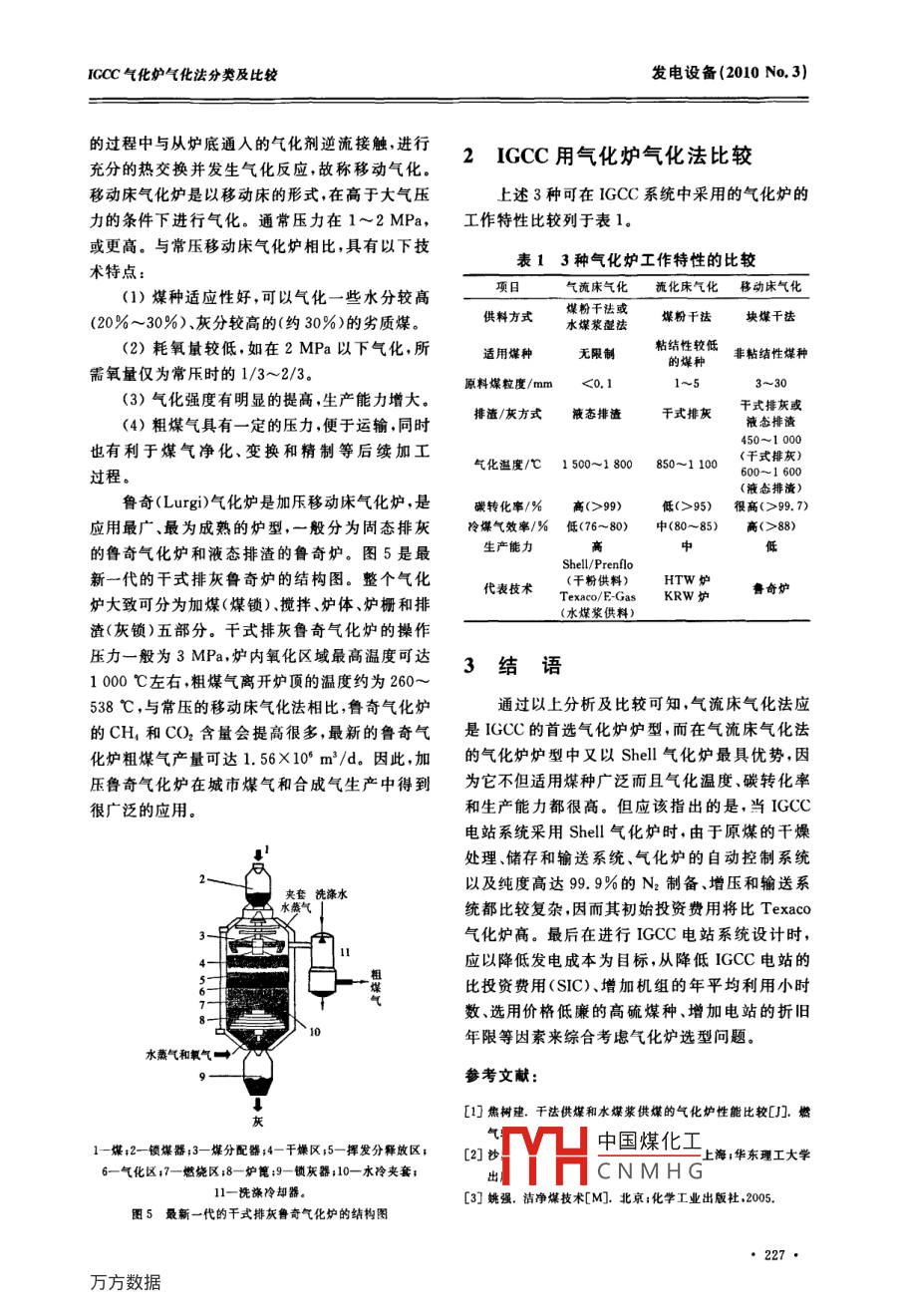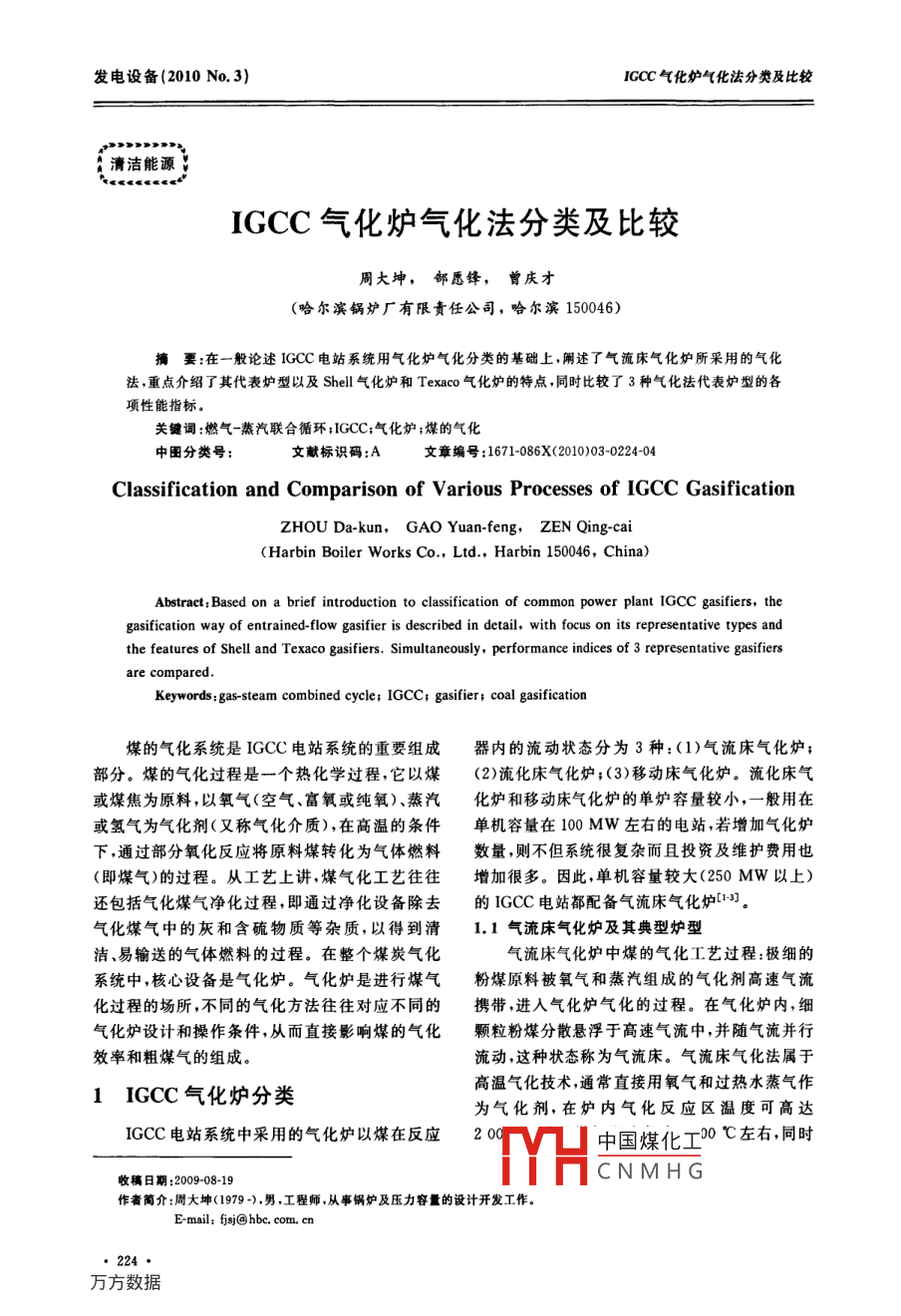 發(fā)電設(shè)備(2010N0.3)IGOC氣化爐氣化法分類及比較A清潔能源!《《省IGCC氣化爐氣化法分類及比較周大坤,邵愿鋒,曾慶才(哈爾濱鍋爐廠有限責(zé)任公司,哈爾濱150046)摘要:在一般論述IGCC電站系統(tǒng)用氣化爐氣化分類的基礎(chǔ)上,闡述了氣流床氣化爐所采用的氣化法,重點(diǎn)介紹了其代表爐型以及She化爐和 Texaco氣化爐的特點(diǎn),同時(shí)比較了3種氣化法代表爐型的各項(xiàng)性能指標(biāo)。關(guān)鍵詞:燃?xì)?蒸汽聯(lián)合循環(huán);IGCC;氣化爐;煤的氣化中圖分類號(hào)文獻(xiàn)標(biāo)識(shí)碼:A文章編號(hào):1671-086X(2010)03-0224-04Classification and Comparison of various Processes of IGCC GasificationZHOU Da-kun, GAO Yuan- feng, ZEN Qing-caiHarbin Boiler Works Co, Ltd. Harbin 150046, China)Abstract: Based on a brief introduction to classification of common power plant IGCC gasifiers, thegasification way of entrained-flow gasifier is described in detail, with focus on its representative types andhe features of Shell and Texaco gasifiers. Simultaneously, performance indices of 3 representative gasifiersare comparedKeywords: gas-steam combined cycle: IGCC; gasifier; coal gasification煤的氣化系統(tǒng)是IGCC電站系統(tǒng)的重要組成器內(nèi)的流動(dòng)狀態(tài)分為3種:(1)氣流床氣化爐部分。煤的氣化過程是一個(gè)熱化學(xué)過程,它以煤(2)流化床氣化爐;(3)移動(dòng)床氣化爐。流化床氣或煤焦為原料,以氧氣(空氣、富氧或純氧)蒸汽化爐和移動(dòng)床氣化爐的單爐容量較小,一般用在或氫氣為氣化劑(又稱氣化介質(zhì)),在高溫的條件單機(jī)容量在100MW左右的電站,若增加氣化爐下,通過部分氧化反應(yīng)將原料煤轉(zhuǎn)化為氣體燃料數(shù)量,則不但系統(tǒng)很復(fù)雜而且投資及維護(hù)費(fèi)用也即煤氣)的過程。從工藝上講,煤氣化工藝往往增加很多。因此,單機(jī)容量較大(250MW以上)還包括氣化煤氣凈化過程,即通過凈化設(shè)備除去的lGCC電站都配備氣流床氣化爐1。氣化煤氣中的灰和含硫物質(zhì)等雜質(zhì),以得到清1.1氣流床氣化爐及其典型爐型潔、易輸送的氣體燃料的過程。在整個(gè)煤炭氣化氣流床氣化爐中煤的氣化工藝過程:極細(xì)的系統(tǒng)中,核心設(shè)備是氣化爐。氣化爐是進(jìn)行煤氣粉煤原料被氧氣和蒸汽組成的氣化劑高速氣流化過程的場(chǎng)所,不同的氣化方法往往對(duì)應(yīng)不同的攜帶,進(jìn)入氣化爐氣化的過程。在氣化爐內(nèi),細(xì)氣化爐設(shè)計(jì)和操作條件,從而直接影響煤的氣化顆粒粉煤分散懸浮于高速氣流中,并隨氣流并行效率和粗煤氣的組成。流動(dòng)這種狀態(tài)稱為氣流床。氣流床氣化法屬于1IGCC氣化爐分類高溫氣化技術(shù),通常直接用氧氣和過熱水蒸氣作為氣化劑,在爐內(nèi)氣化反應(yīng)區(qū)溫度可高達(dá)IGCC電站系統(tǒng)中采用的氣化爐以煤在反應(yīng)20中國(guó)煤化工0℃左右,同時(shí)收稿日期:200908-19HCNMHG作者簡(jiǎn)介:周大坤(1979-)男,工程師,從事鍋爐及壓力容量的設(shè)計(jì)開發(fā)工作。E-mail:fjsj@hbe.com.cn224IGCC氣化爐氣化法分類及比較發(fā)電設(shè)備(2010No.3)由于煤被磨得很細(xì),具有很大的比表面積,又處生部分氧化反應(yīng),煤氣爐爐壁為膜式水冷壁結(jié)于加壓條件下,因此氣化反應(yīng)速度極快,氣化強(qiáng)構(gòu),并采用掛渣措施保護(hù)氣化爐壁。由氣化爐輸度和單路氣化能力比其他兩類氣化技術(shù)都高。出的約1500℃的高溫煤氣,經(jīng)除塵和冷卻至900目前已商業(yè)化的氣化爐,每天可氣化2000~℃左右后進(jìn)入干法除塵和濕法洗滌系統(tǒng)其中合2600t煤。由于高速氣流和以純氧為氧化劑,使成氣冷卻器產(chǎn)生的高(中)壓蒸汽和氣化爐水冷得氣流床氣化法的耗能和耗氧量都很大。氣流壁副產(chǎn)品(中壓蒸汽)均可有效使用。床氣化技術(shù)因其出色的生產(chǎn)能力和氣化效率,在從工業(yè)運(yùn)行的表現(xiàn)來看,She!氣化爐具有如世界范圍內(nèi)得到了廣泛的應(yīng)用,尤其是在煤氣化下特點(diǎn)燃?xì)庹羝?lián)合循環(huán)系統(tǒng)中。目前絕大多數(shù)(1)煤種適應(yīng)性廣,可使用煙煤、褐煤和石油IGCC電站所選用的都是氣流床氣化爐,其主要焦等原料。對(duì)原料的灰熔融性適應(yīng)范圍寬,也可爐型有 Texaco、 Shell, E-Gas(原 Detec)以及氣化高灰分、高水分、高含硫量的煤種Prenflo等。氣流床氣化工藝中,給料方式有:(1)(2)碳轉(zhuǎn)化高,一般達(dá)99%冷煤氣效率干法供料,將煤粉直接氣力輸送至噴嘴,如 Shell、80%~85%,熱煤氣效率超過95%Prenflo等;(2)濕法水煤漿供料,是先將煤粉和水(3)單臺(tái)生產(chǎn)能力大,目前已投入運(yùn)行的氣混合成為水煤漿,泵送至噴嘴,如 Texaco、EGas化爐,在氣化壓力3MPa下,日處理煤量達(dá)等。兩種方法各有特點(diǎn),水煤漿形式容易加壓泵2000t,更大規(guī)模的裝置正在工業(yè)化送,可解決干法供料的鎖煤裝置在加壓條件下的(4)殼牌氣化爐的環(huán)保性能好,采用干法除問題,但會(huì)影響氣化爐的總體熱效率和氣化強(qiáng)塵,灰水量小,處理簡(jiǎn)單,合成氣中CO2含量少度;干法供料則很適合活性高的煤和低質(zhì)煤,且酸性氣體處理費(fèi)用少。具有較好的氣化特性。1.1.2 Texaco氣化爐1.1.1Shel氣化爐Texaco氣化爐(見圖2,下部采用激冷形式)Shell氣化爐(見圖1)是荷蘭Shel公司開發(fā)是最典型的水煤漿進(jìn)料的加壓