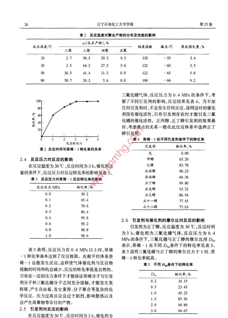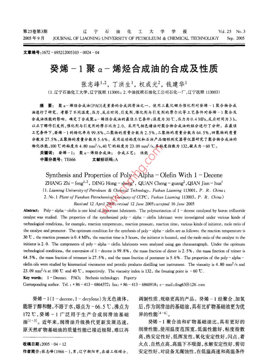 第25卷第3期遼寧石油化工大學(xué)學(xué)報(bào)Vol.25 No.32005年9月JOURNAL. OF LIAONING UNIVERSITY OF PETROLEUM & CHEMICAL TECHNOLOGYSep.2005文章編號(hào):1672 - 6952(2005)03 - 0024 - 04癸烯-1聚a一烯烴合成油的合成及性質(zhì)張志峰1.2,丁洪生',權(quán)成光”,錢(qián)建華1(1.遼寧石油化工大學(xué),遼寧撫順113001; 2.中油撫順石油化工公司石化一廠,遼寧撫順113003)摘要:聚a-烯烴合成油(PAO)是重要的合成潤(rùn)滑油之一。使用三氟化硼為催化劑對(duì)癸烯-1聚合物合成油進(jìn)行了研究。考察了不同溫度、壓力、反應(yīng)時(shí)間、引發(fā)劑、催化劑與引發(fā)劑的摩爾比等工藝條件對(duì)癸烯-1聚合及合成油性能的影響。確定了合成聚a-烯烴合成油的最佳工藝條件:溫度為30C ,壓力為0.4 MPa,反應(yīng)時(shí)間為3h,以正丁醇作引發(fā)劑,催化劑與引發(fā)劑的摩爾比為2.0。采用氣相色譜法對(duì)聚合物合成油的組分進(jìn)行了分析。在最佳工藝條件下,癸烯-1的轉(zhuǎn)化率為99.8%,二聚物的質(zhì)量分?jǐn)?shù)為2.5%,三聚物的質(zhì)量分?jǐn)?shù)為64.5% ,四聚物的質(zhì)量分?jǐn)?shù)為27.5%,五聚物的質(zhì)量分?jǐn)?shù)為5.6%。采用運(yùn)動(dòng)粘度儀和石油產(chǎn)品餾程測(cè)定器等儀器研究了聚合物合成油的物化性能,100 C的粘度為4. 80 mm2/s,40 C的粘度為23. 09 mm2/s,其粘度指數(shù)為132,凝點(diǎn)為-60 C。.關(guān)鍵詞:癸烯-1; 聚a- 烯烴合成油;合成工藝;性能中圖分類號(hào): TE666文獻(xiàn)標(biāo)識(shí)碼:ASynthesis and Properties of Poly - Alpha - Olefin With 1 - DeceneZHANG Zhi - fengl:2,DING Hong - sheng' , QUAN Cheng - guang ,QIAN Jjan - hua(1. Liaoning Unirversity of Petroleum & Chemical Technology, Fushun Liaoning 113001, P. R. China;2. No.1 Plant of Funshun Petrochemical Company of CCPC, Fushun Liaoming 113003, P. R. China)Received 12 April 2005;revised 12 June 2005 ;accepted 16 June 2005Abstract: Poly - alpha - olefin is one kind of important lubricants. The polymerization of 1 - decene catalyzed by boron trifluoridecatalyst was studied. The properties of the synthesized poly - alpha - olefin lubricant were investigated under various kinds oftechnological conditions, for example, reaction temperature, reaction pressure, reaction time, various kinds of initiator, mole ratio ofthe catalyst and promoter. The optimum condition for the synthesis of poly - alpha - olefin are as ollows: the reaction temperature is30 C , the reaction pressure is 0. 4 MPa, the reaction time is 3 hours, the initiator is butanol, and the mole ratio of the catalyst to theinitiator is 2.0. The components of poly - alpha - olefin lubricants were analyzed using gas chromatograph. Under the optimumtechnological conditions, the conversionof 1 - decene is 99. 8%,the mass fraction of dimer is 2.5%,the mass fraction of trimer is64.5%,the mass fraction of tetramer is 27.5%,and the mass fraction of pentamer is 5. 6%. The properties of the poly - alpha-olefin oils were studied by kinematical vicometer and petrolic products dstllig test instrument. The viscosity is 4. 80 mm?/s and23.09 mm2/sat 100 C and 40 C , respectively. The viscosity index is 132, the freing pointis -60 C .Key words: 1 - Decene; PAO; Snthesis technology; PopertyCorresponding author. Tel.: + 86 -413 - 6864372; fax: + 86 -413 - 6860918; e - mil:ding63@126. com癸烯-1(1 - decene, 1 - decylene)為無(wú)色液體,調(diào)制性質(zhì)、規(guī)格更高的產(chǎn)品。癸烯- 1經(jīng)聚合、加氫能溶于醇和醚,不溶于水,熔點(diǎn)為- 66.5C,沸點(diǎn)為后,作為潤(rùn)滑油的基礎(chǔ)油,具有比礦物基礎(chǔ)油更為優(yōu)172 C,癸烯-1廣泛用于生產(chǎn)合成潤(rùn)滑油基礎(chǔ)異的性能[4-6]。油[1-3]。近年來(lái),潤(rùn)滑油升級(jí)換代更新發(fā)展迅速,癸烯-1聚合油和礦物基礎(chǔ)油比,具有更好的原天然礦物基礎(chǔ)油的質(zhì)量性能已接近極限,難以再潤(rùn)滑性能,使用溫度范圍寬,低溫性能好,粘度指數(shù)高,熱安定性好,低揮發(fā)性,氧化安定性好,閃點(diǎn)、著收稿日期:2005 -04-12 .火點(diǎn)、自然點(diǎn)高,高溫下不吸濕,水解安定性好,剪切作者簡(jiǎn)介:張志峰(1966- ),男,遼寧朝陽(yáng)市,在讀工程碩士。安定性好,對(duì)設(shè)備無(wú)腐蝕性,在低溫高速和高溫條件第3期張志峰等.癸烯-1聚a-烯烴合成油的合成及性質(zhì)25下,對(duì)引擎摩損小,與礦物基礎(chǔ)油常用的添加劑相溶堿洗后直接進(jìn)行色譜分析,見(jiàn)圖1。從圖1上可以性好、無(wú)毒、積炭少、可生物降解,而且使用壽命長(zhǎng),看出只有二聚物,三聚物、四聚物和五聚物,沒(méi)有六效率高。癸烯-1聚合潤(rùn)滑油因其優(yōu)異的特性在機(jī)聚以上的產(chǎn)物。產(chǎn)品的組成分布見(jiàn)表1。說(shuō)明癸烯械行業(yè)倍受重視,自1970年以來(lái),已廣泛用于航空、- 1在此條件下的轉(zhuǎn)化率大于99% ,二聚物很少,潤(rùn)軍工、汽車(chē)等尖端行業(yè),而且增長(zhǎng)迅速7-11。我國(guó)滑油的理想組分大于95%。癸烯-1需要大量進(jìn)口,對(duì)癸烯- 1聚合潤(rùn)滑油的合三聚物成及性能的系統(tǒng)研究報(bào)道也很少。本文采用三氟化硼催化劑對(duì)癸烯-1聚a-烯烴合成油進(jìn)行了系統(tǒng)研究,考察了溫度、壓力、反應(yīng)時(shí)間、引發(fā)劑種類及催化劑與引發(fā)劑的摩爾比對(duì)聚a-烯烴合成油的性能二聚物四聚物的影響,評(píng)價(jià)了合成油的物化性能。癸烯-五聚物1實(shí)驗(yàn)部分567891011121314151617t/min1.1主要試劑和儀器圖1癸烯-1聚合產(chǎn)物的氣相色