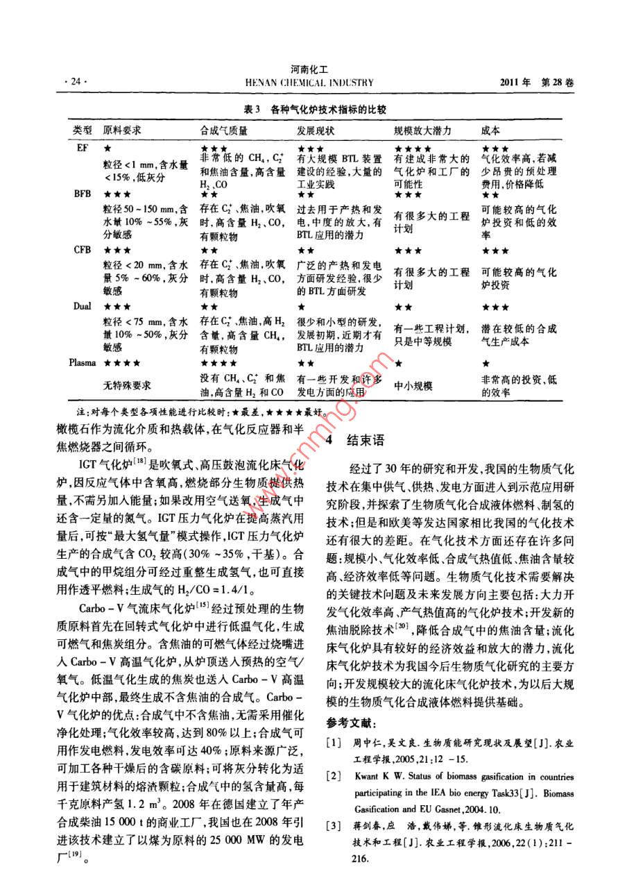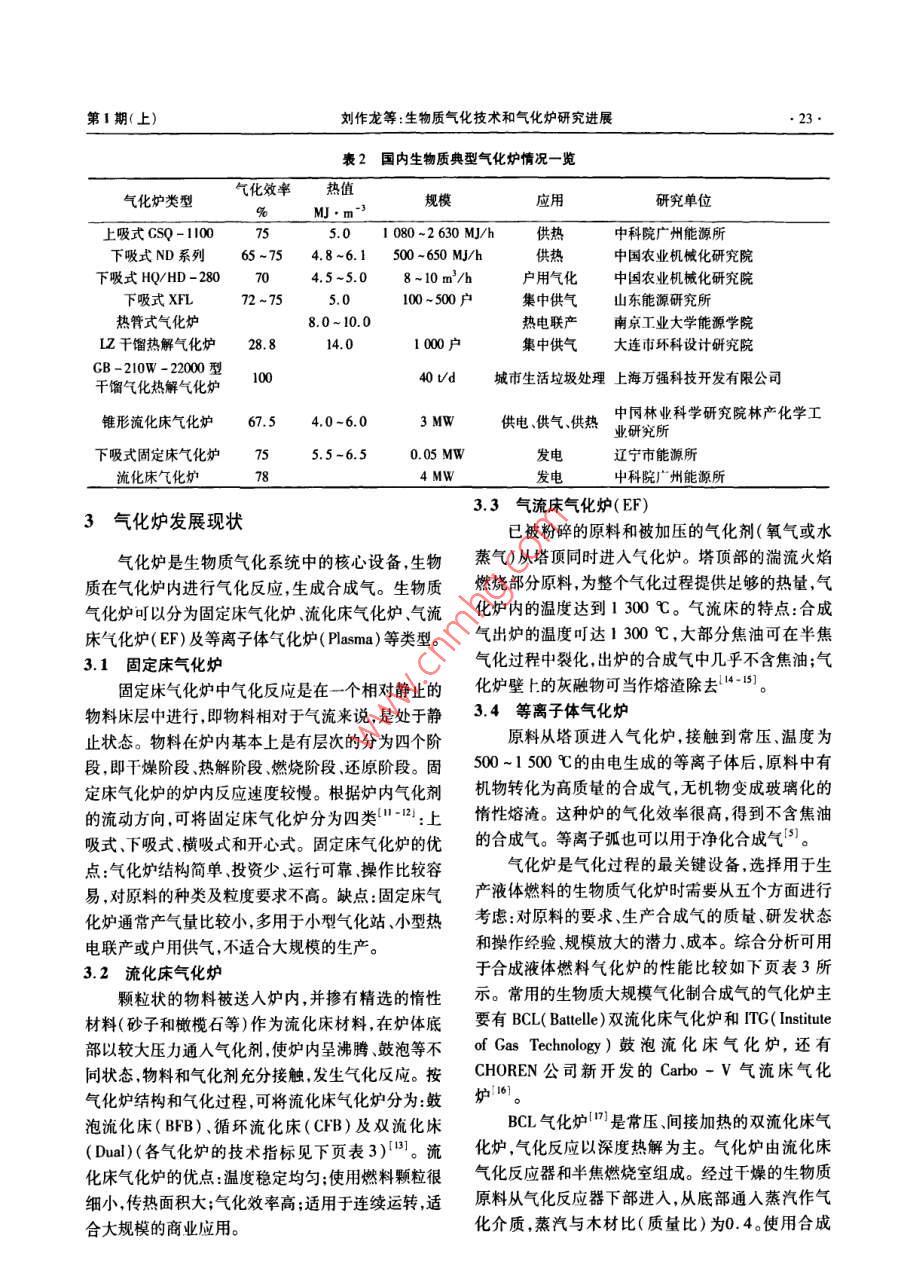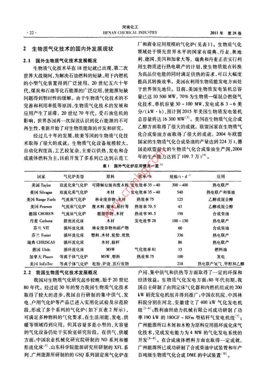 第1期(上)劉作龍等:生物質(zhì)氣化技術和氣化爐研究進展.21.●綜述與述評●生物質(zhì)氣化技術和氣化爐研究進展劉作龍,孫培勤,孫紹暉,陳俊武(鄭州大學化工與能源學院,河南鄭州450001)摘要:簡單介紹了 生物質(zhì)氣化的基本原理及生物質(zhì)氣化爐的分類,闡述了不同類型氣化爐的特點及技術指標。介紹了國內(nèi)外生物質(zhì)氣化技術在集中供氣、供熱和發(fā)電方面的發(fā)展現(xiàn)狀和應用情況,重點介紹了適用于大規(guī)模生物質(zhì)氣化合成液體燃料的氣化爐;指出了生物質(zhì)氣化技術需要解決的問題,提出了我國在生物質(zhì)氣化領域的重點研究方向。關鍵詞:生物質(zhì);氣化爐;氣化;綜迷中團分類號:TK6文獻標識碼:A文章編號:1003 - 3467(2011)01 -0021 -04Present Research Status and Development of Biomass GasificationTechnologies and GasifiersLIU Zuo- long , SUN Pei -qin , SUN Shao- hui,CHEN Jun - wu( School of Chemical Engineering and Energy , Zhengzhou Univrsity 450001 ,China)Abstract: The basic principles and lassifcation of biomass gasification are introduced , the characteristicsand technical indicators of different types of gasifiers are described. The technology research and applica-tion of biomas gasification in gas supply, heating supply, power generation domestie and overseas is ilus-trated. This paper focuses on the gasifier that can be used to large - scale biomass gasification syntheticliquid fuels. The problems that the biomass gasifcation technology needs to solve and the research direc-tion which the biomass gasification field at are pointed out.Key words:biomass ; gasifier ; gasification ; review能源是人類賴以生存和發(fā)展的基礎,隨著社會全燃燒,使生物質(zhì)裂解,變成小分子量的CO、H2、經(jīng)濟的快速發(fā)展,人類對能源的需求也越來越大。CH。等可燃性氣體,在轉(zhuǎn)換過程中要加入氣化劑.大量的開采和使用化石能源會污染環(huán)境和破壞生態(tài)(空氣、氧氣或水蒸氣)。由于生物質(zhì)的特殊性質(zhì),平衡,開發(fā)和利用清潔的可再生能源已經(jīng)迫在眉睫,在氣化前還需要經(jīng)過干燥、破碎和切片等預處理過生物質(zhì)是呵以轉(zhuǎn)化為液體燃料的環(huán)境友好的可再生程。經(jīng)預處理的生物質(zhì)在氣化爐中,約于600 C下能源,是僅次于煤炭、石油和天然氣而居于世界能源發(fā)生熱解反應,生成的氣體中包括解離氣體、氣化的消費總量第四位的能源"。生物質(zhì)氣化技術是清揮發(fā)分、H2、CO、CO2、焦油和水蒸氣。由于生物質(zhì)潔高效利用生物質(zhì)能的有效途徑之- ,生物質(zhì)氣化中的揮發(fā)分含量(70% ~ 80%,干基)遠高于煤炭技術除了可以用于發(fā)電、供氣、供熱等方面外,還可(30%),所以生物質(zhì)氣化的熱解反應比煤炭更為重以用于將各種生物質(zhì)能轉(zhuǎn)化成為高品位的液體燃要。揮發(fā)分在氣相中的熱裂化反應可降低焦油量,料。熱解反應的副產(chǎn)物是生成不揮發(fā)的焦炭和灰分。在氣化爐中的第二反應為焦炭與氧氣、蒸汽反應,生成.1生 物質(zhì)氣化原理H2、CO、CO2等氣體,未轉(zhuǎn)化的焦炭燃燒為熱解反應生物質(zhì)氣化是指將固體生物質(zhì)加熱,進行不完提供所需的熱量”。收稿日期:2010-11-16作者簡介:劉作龍(1984- ),男,碩士研究生;通訊作者:孫培動( 1963 - ),女,教授,電話:(0371)67781755河南化工●22●IIFNAN CHEMICAL INDLSTRY2011年第28卷2生物質(zhì)氣化技術的國內(nèi)外發(fā)展現(xiàn)狀廠和商業(yè)應用規(guī)模的氣化爐(見表1)。生物質(zhì)氣化領域處于領先世界水平的國家有瑞典、丹麥、奧地2.1國外生物質(zhì) 氣化技術發(fā)展概況利、德國、美國和加拿大等。瑞典和丹麥正在實行利生物質(zhì)氣化技術早在18世紀就已出現(xiàn),第二次用生物質(zhì)進行熱電聯(lián)產(chǎn)的計劃,使生物質(zhì)能在轉(zhuǎn)換世界大戰(zhàn)期間,為解決石油燃料的短缺,用于內(nèi)燃機為高品位電能的同時滿足供熱的需求,可以大幅度的小型氣化裝置得到廣泛使用。20世紀五六十年提高其轉(zhuǎn)換效率。美國在利用生物質(zhì)能發(fā)電方面處代,煤炭和石油等化石能源的廣泛應用,使能源短缺于世界領先地位。目前,美國生物質(zhì)發(fā)電裝機總容問題得到暫時性的緩解。由于生物質(zhì)氣化技術的不量已達10 500 MW, 70%為生物質(zhì)-媒混合燃燒氣完善和利用率低等原因,生物質(zhì)氣化技術的發(fā)展和化技術,單機容量30~ 100 MW.發(fā)電成本3-6美應用產(chǎn)生了延滯。20世紀70年代,受石油危機的分/(kW.h),預計到2015年美國生物質(zhì)發(fā)電裝機影響,世界各國再-次深該認識到化石能源的不可總容量將達16 300 MWil。美國在生物質(zhì)氣化合成再生性,重新開始了對生物質(zhì)能源的開發(fā)和研究。乙醇方面取得了很大的成就。歐盟國家在生物質(zhì)氣經(jīng)過幾十年的發(fā)展,歐美等國的生物質(zhì)氣化技化合成柴油方面取得了很大的成就。2004年歐盟術取得了很大的成就。生物質(zhì)氣化設備規(guī)模較大,國家的生物質(zhì)氣化合成柴油的產(chǎn)量達到224萬t,德自動化程度高,工藝較復雜,主要以供熱、發(fā)電和合國是歐盟最大的生物質(zhì)氣化合成柴油生產(chǎn)國,2004成液體燃料為主,目前開發(fā)了多系列已達到示范I年的生產(chǎn)能力達到了109.7 萬中。表1國外氣化爐應用情況一 覽^$)國家氣化爐類型原料效率/%規(guī)模/t.d-'應用美國Tay