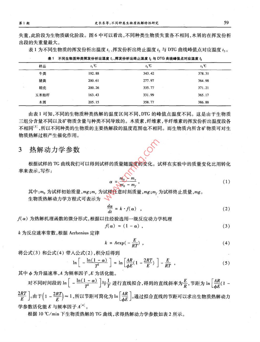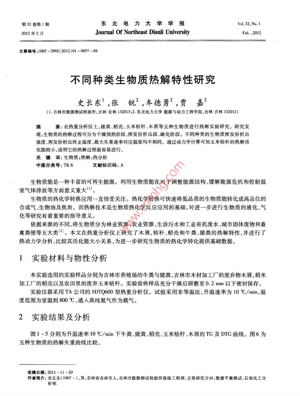 第32卷第1期東北電力大學(xué)學(xué)報Vol 32. No. 12012年2月Journal Of Northeast Dianli UniversityFeb.,2012文章編號:1005-2992(2012)01-0057-04不同種類生物質(zhì)熱解特性研究史長東,張銳2,車德勇2,賈嘉2(1.吉林市能源測試檢驗所,吉林吉林132013;2.東北電力大學(xué)能源與動力工程學(xué)院,吉林吉林132012)摘要:在熱重分析儀上,豬糞、稻殼、玉米秸稈、木屑等五種生物質(zhì)進行熱解實驗研究。研究發(fā)現(xiàn),生物質(zhì)的熱解過程可分為干燥預(yù)熱階段、揮發(fā)份析出段、碳化階段。不同種類的生物質(zhì)揮發(fā)份析出溫度、揮發(fā)份析出終止溫度、最大失重速率對應(yīng)溫度均不相同。通過動力學(xué)計算可知玉米秸稈的熱解活化能較小,說明它的熱解過程最容易進行。關(guān)鍵詞:生物質(zhì);熱解;熱分析中圖分類號:TK6文獻標識碼:A生物質(zhì)能是一種豐富的可再生能源。利用生物質(zhì)能在對于調(diào)整能源結(jié)構(gòu)、緩解能源危機和控制溫室氣體排放等方面意義重大生物質(zhì)的熱化學(xué)轉(zhuǎn)換應(yīng)用一直倍受關(guān)注。熱化學(xué)轉(zhuǎn)換可快速將低品質(zhì)的生物質(zhì)能轉(zhuǎn)化成高品位的合成氣、生物油及焦炭。而熱解技術(shù)是生物質(zhì)熱化學(xué)反應(yīng)應(yīng)用的基礎(chǔ),對進一步進行生物質(zhì)的液化、氣化等研究有著重要的指導(dǎo)意義。依據(jù)來源的不同,將生物質(zhì)分為林業(yè)資源、農(nóng)業(yè)資源、生活污水和工業(yè)有機廢水、城市固體廢物和畜禽糞便等五大類2。本文在熱重分析儀上研究了木屑,秸稈、稻殼和牛糞豬糞的熱解特性,并進行了熱動力學(xué)分析,比較其活化能大小關(guān)系,為進一步研究生物質(zhì)的熱化學(xué)轉(zhuǎn)化提供基礎(chǔ)數(shù)據(jù)。1實驗材料與物性分析本實驗選用的實驗樣品分別為吉林市養(yǎng)殖場的牛糞與豬糞,吉林市木材加工廠的廢棄物木屑,稻米加工廠的稻殼以及農(nóng)田里的廢棄玉米秸稈。實驗前將樣品充分干燥后研磨至0.2mm以下密封保存。實驗儀器采用TA公司的SDTQ600型熱重分析儀。試驗采用非等溫法,升溫速率為10℃/min,溫度范圍為室溫到800℃,通人高純氮氣作為載氣。2實驗結(jié)果及分析圖1-5分別為升溫速率10℃/min下牛糞、豬糞、稻殼、玉米秸稈、木屑的TG及DTG曲線。圖6為五種生物質(zhì)的熱解失重曲線比較。收稿日期:2011-11-20作者簡介:史長東(196-),男,吉林省吉林市人,吉林市能源測試檢驗所高級工程師,主要研究方向:能量平衡測試、石油化工分析等東北電力大學(xué)學(xué)報第32卷110706030圖1牛糞在升溫速率10℃/min的熱解曲線2豬糞在升溫速率10℃/min的熱解曲線I100.110000506010020030040050060070080090000,100200300400500600700800900圖3稻殼在升溫速率10℃/min的熱解曲線圖4玉米秸稈在升溫速率10℃/min的熱解曲線豬糞稻殼0.2玉米秸利60040.600400500600700800圖5木屑在升溫速率10℃/min的熱解曲線圖6五種生物質(zhì)在升溫速率10℃/mn下熱解曲線比較由生物質(zhì)熱解曲線可知,熱解主要分為三個階段:干燥預(yù)熱階段、揮發(fā)份析出段碳化階段。隨著加熱的進行,生物質(zhì)中的水分析出,在100℃-120℃左右,干燥基本完成。當?shù)竭_揮發(fā)份析出溫度時,試樣質(zhì)量再次出現(xiàn)下降,DTG曲線開始快速下降,并出現(xiàn)峰值。這時,物料中的纖維素、半纖維素、木質(zhì)素吸收了大量的熱量發(fā)生化學(xué)反應(yīng)并析出揮發(fā)份。當揮發(fā)份析出段結(jié)束,DTG曲線恢復(fù)平穩(wěn),物料緩慢第1期史長東等:不同種類生物質(zhì)熱解特性研究失重,此階段為生物質(zhì)碳化階段。圖6中可以看出,不同種類生物質(zhì)失重各不相同,木屑的在揮發(fā)份析出段的失重量最大。表1為不同生物質(zhì)的揮發(fā)份析出溫度t1、揮發(fā)份析出終止溫度2與DTG曲線峰值點對應(yīng)溫度t3。表1不同生物質(zhì)種類揮發(fā)份析出溫度與、揮發(fā)份析出終止溫度與DTG曲線峰值點對應(yīng)溫度與樣品℃℃牛糞343.42378.31豬糞稻殼200.26335.7371.21玉米秸稈l63.43365.17木屑205.15358.77386.8由表1可知,不同的生物質(zhì)種類熱解的溫度區(qū)間不同,DTG的峰值點溫度不同。這是由于生物質(zhì)三組分含量不同以及礦物質(zhì)含量與種類不同導(dǎo)致的。木質(zhì)素,纖維素,半纖維素的揮發(fā)份析出溫度段各不相同3,所以不同種類的生物質(zhì)的主要熱解段的溫度范圍也不相同。而生物質(zhì)內(nèi)所含礦物質(zhì)可對生物質(zhì)熱解過程產(chǎn)生催化作用。3熱解動力學(xué)參數(shù)根據(jù)試樣的TG曲線我們可以得到試樣的質(zhì)量隨溫度的變化。試樣在實驗中的質(zhì)量變化比用轉(zhuǎn)化率來表示,寫作:(1)其中:mo為試樣初始質(zhì)量,mg;m,為試樣任意時刻質(zhì)量,mg;m為試樣終止質(zhì)量,mg。生物質(zhì)熱解動力學(xué)方程式可表示為k·f(a)f(a)為熱解機理函數(shù)的微分形式,根據(jù)以往經(jīng)驗選用一級反應(yīng)動力學(xué)機理fk為反應(yīng)速率常數(shù),根據(jù) Arrhenius定律Ek Aexp( rt(4)將公式(3)和公式(4)帶人公式(2),積分后得到In(1-a)ARn5(12RT)E(5)其中φ為升溫速率,A為頻率因子,E為活化能。對不同時間段的ln10)]9進行直線擬合得到的直線斜率為是節(jié)距為lAC2RTARE由于(1-281)-1,所以節(jié)距可簡化為1B過擬合直線的節(jié)距可以求出生物質(zhì)