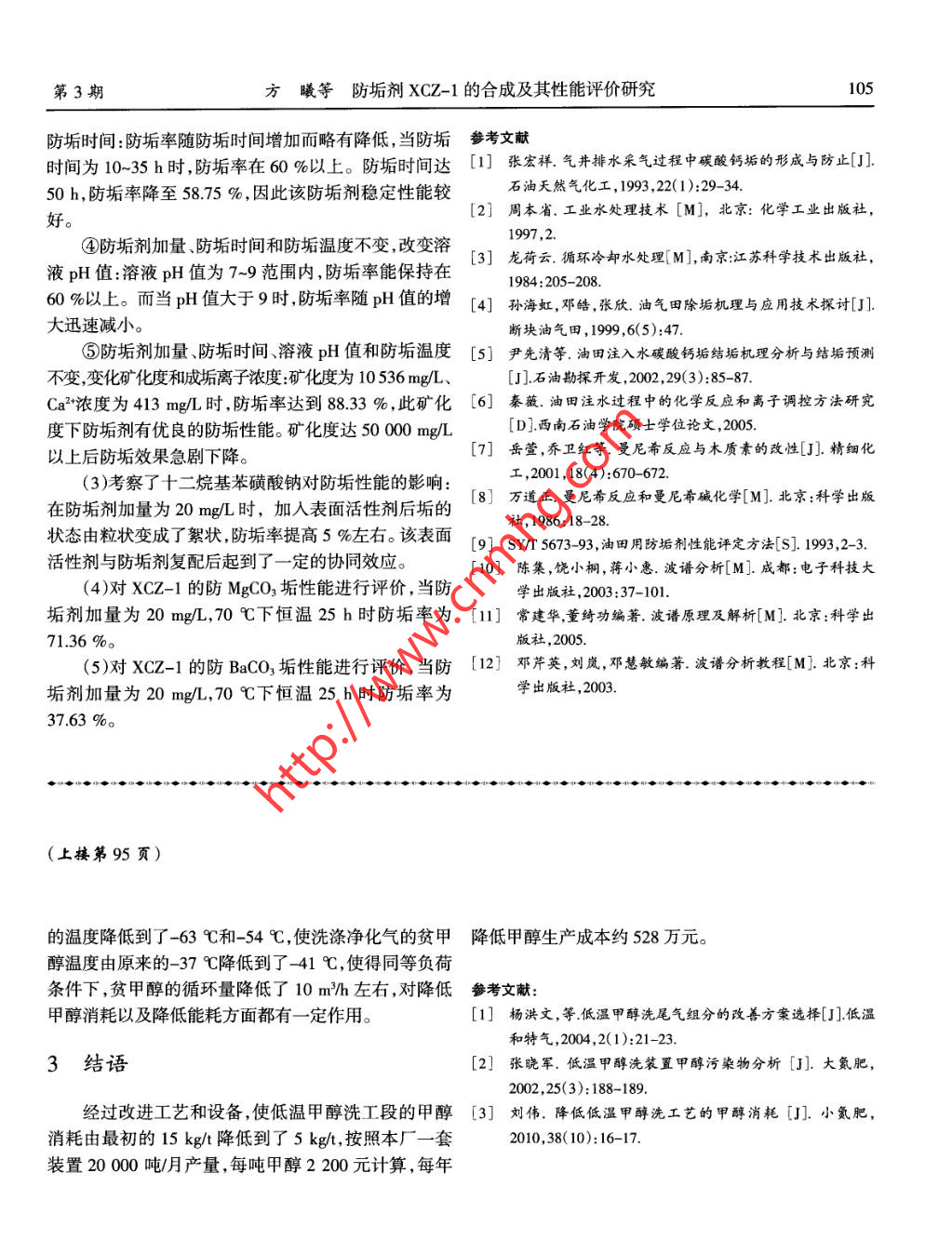 第31卷第3期石油化工應(yīng)用Vol.31 No.32012年3月PETROCHEMICAL INDUSTRY APPLICATIONMar. 2012降低低溫甲醇洗工藝甲醇消耗技術(shù)改造可鵬,李榮,馬永賢(神華寧夏煤業(yè)集團(tuán)煤炭化學(xué)工業(yè)分公司甲醇廠,寧夏銀川750411)摘要:針對本廠低溫甲醇洗裝置甲醇消耗高的問題進(jìn)行了分析研究,并分別制定了相應(yīng)的處理措施。關(guān)鍵詞:低溫甲醇洗;甲醇消耗;原因;措施中圖分類號:TQ223.121文獻(xiàn)標(biāo)識碼:A文章編號:1673- -5285(2012 )03- 0094 -03本廠低溫甲醇洗工藝是由化學(xué)工業(yè)第二設(shè)計(jì)院設(shè)1.2 對酸性氣體夾帶 甲醇的分析計(jì)的七塔工藝流程,通過接收德士古氣化爐反應(yīng)產(chǎn)生滿負(fù)荷下酸性氣體流量為500 m/h,出系統(tǒng)前經(jīng)過的粗煤氣,經(jīng)過3.5 MPa.-38 C的低溫甲醇的洗滌,- 個氣液分離器D- -0603,溫度為-30~-10 C,壓力為分步將H2S、COS、CO2等氣體吸收之后,把HS≤0.1108 kPa左右,從飽和蒸汽壓的數(shù)據(jù)分析,此處未產(chǎn)生m/m2'的凈化氣送至合成工段合成甲醇。該工藝運(yùn)行蒸發(fā)浪費(fèi)。 再經(jīng)過幾個月的數(shù)據(jù)分析,酸性氣體中甲醇幾年來,對HS的洗滌效果比較理想,但始終存在著甲含 量低于50 mg/m',證明不存在蒸發(fā)浪費(fèi)。醇消耗量偏高,最高時達(dá)到15 kg/t, 遠(yuǎn)遠(yuǎn)高于設(shè)計(jì)1.3對凈化氣體夾帶甲醇的分析7 kg/t 的標(biāo)準(zhǔn)。滿負(fù)荷下凈化氣流量為60 000 m2/h, 壓力高達(dá)3.3MPa左右,溫度為20C左右,且塔頂除沫器完好,1原因分析通過幾個月的分析,甲醇含量均低于50mg/m',因此此處也不存在浪費(fèi)甲醇的可能性。在生產(chǎn)過程中,根據(jù)裝置運(yùn)行的各項(xiàng)參數(shù),對造成1.4 對甲醇水精餾塔的分析甲醇消耗高的原因進(jìn)行了分析論證,結(jié)果如下:該塔的進(jìn)料換熱器E -0613自2009年9月開始內(nèi).1 對CO2尾氣夾帶甲醇的分析漏,塔底廢水中甲醇含量達(dá)到2 %左右,10月檢修拆滿負(fù)荷下CO2尾氣流量為30 000 m2/h 左右,用冷開封頭 發(fā)現(xiàn)列管內(nèi)漏,堵漏后投人運(yùn)行,但從2009年卻后40 C低壓鍋爐給水洗滌,尾氣進(jìn)口溫度設(shè)計(jì)值為12 月至2010年3月先后出現(xiàn)了四次泄漏,經(jīng)過反復(fù)40 C,尾氣出口甲醇含量設(shè)計(jì)值為190 mg/m',但是通堵漏后 ,堵住的列管數(shù)量超過了全部的20 % ,不得不過幾次取樣分析發(fā)現(xiàn),甲醇含量都在800 mg/m3左右,更換該換熱器。 針對泄漏的原因分析認(rèn)為進(jìn)料的甲醇遠(yuǎn)遠(yuǎn)大于設(shè)計(jì)值。而后對尾氣洗滌塔的各項(xiàng)參數(shù)進(jìn)行水溶液中含有回收的噴淋甲醇,吸收原料氣中的H2S,分析,發(fā)現(xiàn)塔底溫度過高是主要原因,根據(jù)安托因公式當(dāng)甲 醇和水混合后,H2S對碳鋼材質(zhì)的E -0613產(chǎn)生強(qiáng)計(jì)算(P=exp[16.5723- 36.5/// -4.29)),甲醇的溫度烈腐蝕 ,因此在以后的選材中,對E- 0613選用不銹鋼和飽和蒸汽壓的關(guān)系(見表1)。材質(zhì)。表1甲醇的溫 度和飽和蒸汽壓的關(guān)系在設(shè)備問題處理完之后,塔項(xiàng)甲醇蒸汽中水含量溫度/C0..510152025303540以及塔底廢水中甲醇含量依然存在不合格的情況,在飽和蒸汽壓/kPa 3.95 5.40 7.30 9.76 12.9 16.8 21.8 27.9 35.4對該塔的各項(xiàng)參數(shù)進(jìn)行分析后,對該工藝進(jìn)行了重新優(yōu)化調(diào)節(jié),將三段進(jìn)料改到下部18層塔板進(jìn)料,其余通常尾氣洗滌塔的壓力為30~ 40 kPa,溫度為20~參數(shù)( 見圖1)。30 C,從表1中數(shù)據(jù)看出洗滌塔溫度過高會造成甲醇1.5 對系統(tǒng)溫度偏高、循環(huán)量偏大的分析的蒸發(fā)浪費(fèi),是造成尾氣中甲醇超標(biāo)的主要原因。低溫甲醇洗系統(tǒng)冷量的四個來源為冷凍站、閃蒸*收稿日期:2012-01-09第3期何鵬降低低溫甲醇洗工藝甲醇消耗技術(shù)改造9T10638 84C可以看出主要原因是塔底溫度過高導(dǎo)致的,只要降低甲醇蒸氣0溫度就行,但過低的溫度影響設(shè)備壽命,另外對后續(xù)甲甲醇3m2醇水塔的進(jìn)料溫度也有影響,還會加大能耗。因此需從兩方面著手,- -方面適當(dāng)加大塔頂洗滌水量,另- -方面T-060726需要適當(dāng)降低塔底溫度才行。(直22針對加大洗滌水做以下調(diào)節(jié),以下為2010年7月E-0613TI0637 85C18調(diào)整后報表數(shù)據(jù)統(tǒng)計(jì)(見圖2)。.甲醇、水9m'8一一洗滌水(m'/n)6十一: =排放氣甲醇一(x100mg/m")水8m’TI0642 124CP10609 170kPa日1 低溫甲醇洗工藝改造流程圖35791113151719212325 27 29 .(氣提)、冷卻水和節(jié)流,其中最主要的冷量是由冷凍站圖2洗滌水調(diào)節(jié)示意圖和閃蒸提供的。如果系統(tǒng)冷量不足,溫度上升,為了保從圖2中可以看出,洗滌水控制在7~8 m3左右對證凈化氣的合格,不得不通過加大甲醇循環(huán)量來保證,指 標(biāo)控制比較合適。而甲醇循環(huán)量的加大則會造成溫度的進(jìn)一步升高 ,形其次針對塔底溫度做以下調(diào)節(jié),以下為2010年8成惡性循環(huán),導(dǎo)致甲醇的浪費(fèi)。月份調(diào)整后報表數(shù)據(jù)統(tǒng)計(jì)(見圖3)。2009年裝置運(yùn)行過程中,發(fā)現(xiàn)氨冷器各出口溫度逐漸由原來的- -30 C上升到了-25 C,經(jīng)檢查發(fā)現(xiàn)氨冷3(器有內(nèi)漏現(xiàn)象,導(dǎo)致甲醇和氨的換熱效果不良,利用大25=塔底溫度心-排放氣甲醇檢修對氨冷器進(jìn)行了處理,