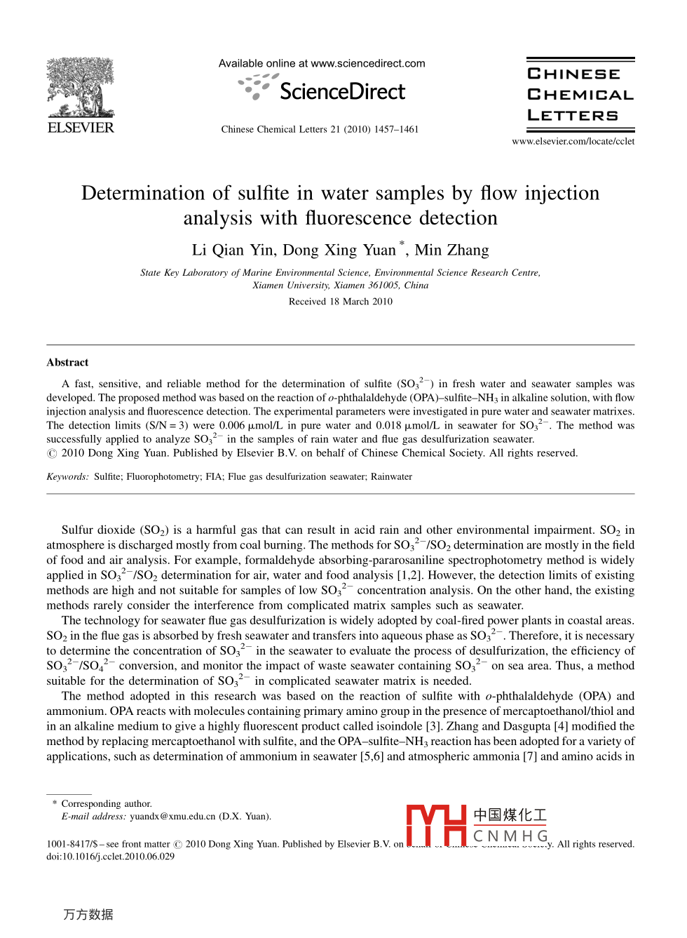 Available online at www.sciencedirect.comCHINESEScienceDirectC HEMICALL .ETTERSELSEVIERChinese Chemical Letters 21 (2010) 1457-1461www.elsevier.com/locate/ccletDetermination of sulfite in water samples by flow injectionanalysis with fluorescence detectionLi Qian Yin, Dong Xing Yuan , Min ZhangState Key Laboratory of Marine Environmental Science, Environmental Science Research Centre,Xiamen University, Xiamen 361005, ChinaReceived 18 March 2010AbstractA fast, sensitive, and reliable method for the determination of sulfite (SO3- ) in fresh water and seawater samples wasdeveloped. The proposed method was based on the reaction of o-phthalaldehyde (OPA)- sulfite-NH3 in alkaline solution, with flowinjection analysis and fluorescence detection. The experimental parameters were investigated in pure water and seawater matrixes.The detection limits (S/N = 3) were 0.006 μmol/L in pure water and 0.018 μmol/L in seawater for SO32- . The method wassuccessfully applied to analyze SO3- in the samples of rain water and fue gas desulfurization seawater.C 2010 Dong Xing Yuan. Published by Elsevier B.V. on behalf of Chinese Chemical Society. All rights reserved.Kerwords: Sufite; Fluorophotometry; FIA; Flue gas desulfurization seawater; RainwaterSulfur dioxide (SO2) is a harmful gas that can result in acid rain and other environmental impairment. SO2 inatmosphere is discharged mostly from coal burning. The methods for SO3- /SO2 determination are mostly in the fieldof food and air analysis. For example, formaldehyde absorbing-pararosaniline spectrophotometry method is widelyapplied in SO3- /SO2 determination for air, water and food analysis [1,2]. However, the detection limits of existingmethods are high and not suitable for samples of low SO3- concentration analysis. On the other hand, the existingmethods rarely consider the interference from complicated matrix samples such as seawater.The technology for seawater fue gas desulfurization is widely adopted by coal-fired power plants in coastal areas.SO2 in the flue gas is absorbed by fresh seawater and transfers into aqueous phase as SO32- . Therefore, it is necessaryto determine the concentration of SO3'- in the seawater to evaluate the process of desulfurization, the efficiency ofSO32- /SO4- conversion, and monitor the impact of waste seawater containing SO3on sea area. Thus, a methodsuitable for the determination of SO32- in complicated seawater matrix is needed.The method adopted in this research was based on the reaction of sulfite with o-phthalaldehyde (OPA) andammonium. OPA reacts with molecules containing primary amino group in the presence of mercaptoethanol/thiol andin an alkaline medium to give a highly fluorescent product called isoindole [3]. Zhang and Dasgupta [4] modified themethod by replacing mercaptoethanol with sulfite, and the OPA- sulfite -NH3 reaction has been adopted for a variety ofapplications, such as determination of ammonium in seawater [5,6] and atmospheric ammonia [7] and amino acids inCorresponding author.E-mail address: yuandx @ xmu.edu.cn (D.X. Yuan).中國煤化工1001-8417/$ - see front matter◎2010 Dong Xing Yuan. Published by EIsevier B.V. onCHCNMHGAll rights reserved.doi: 10.1016/.cclet.2010.06.0291458L.Q. Yin et al./Chinese Chemical Letters 21 (2010) 1457 -1461clinical samples [8]. The isoindole derived from OPA- -sulite- -NH3 reaction can be determined at ^ex = 362.5 nm andλem= 423.0 nm with a fuorescence detector [5]. However, studies of sulfite determination on the basis of OPA -sulfite- NH3 reaction are few. Tzanavaras et al. [9] determined total sulfite in wines based on the reaction of OPA andNH4Cl in basic medium with sequential injection technique.In this work, the reaction of OPA- -sulite- NH3 in alkaline solution was applied to determine SO32-:in watersamples. The reagents and instrumental parameters were investigated to suit the analyses of fresh water and seawater,respectively. .1. ExperimentalI.I. ReagentsOPA, NH4Cl, ethanol, Na2SO3, HCHO, Na2HPO4, borax and NaOH were purchased from Sinopharm ChemicalReagent Co., China. Pure water(18.2 MA cm) was obtained from a Milli-Q water purification system (Millipore Co.,USA). Reagent 1 (R1), containing 10 mmol/L of OPA, was made by dissolving 1.34 g OPA in 75 mL ethanol anddiluting to 1 L with pure water. Reagent 2 (R2), containing 2.5 mmol/L of NH4Cl, was made by dissolving 0.134gNH4Cl in 1 L pure water, Na2HPO4 was used as buffer at a concentration of 34.4 mmol/L, pH was adjusted withNaOH solution. R2 was used for freshwater measurement. Reagent 3 (R3), containing 2.5 mmol/L of NH4Cl, boraxwas used as buffer at a concentration of 13.5 g/L, pH was adjusted with NaOH solution. R3 was used for seawatermeasurement.1.2. StandardsA 10 mmol/L SO3- stock solution was made daily by dissolving sodium sulfite solid (its purity was determinedbefore use) in 100 mL of 10 mmol/L HCHO solution.1.3. SamplingThe rain water sample was collected in Xiamen University campus, November 12, 2009. The seawater sampleswere obtained from the aeration tank of flue gas desulfurization waste seawater inside a power plant and sea area nearto waste seawater discharging outlets. Samples were added with HCHO right after collection to reach a concentrationof 1 mmol/L HCHO in samples, and filtrated through a filter membrane of 0.45 μm pore diameter before analyzing.Samples with high SO3- concentration should be diluted before analysis.1.4. Analytical equipmentsHH-1 water bath device (Shunhua Instrument Inc., Jintan, China), a 4-channel LEAD-1 peristaltic pump (LongerPrecision Pump Inc., Baoding, China), a 6-way Vici valve (Valco Co, USA), and a flow-through RF-10A XLfluorescence detector (Shimadzu Co., Japan).The flow injection analysis (FIA) schematic diagram is shown in Fig. 1. Samples or standard solutions werepumped into sampling loop at flled position. Pure water or seawater was used as a carrier at injection position to putthe sample zone forward. R1 merged with R2 in the connecting tube at 